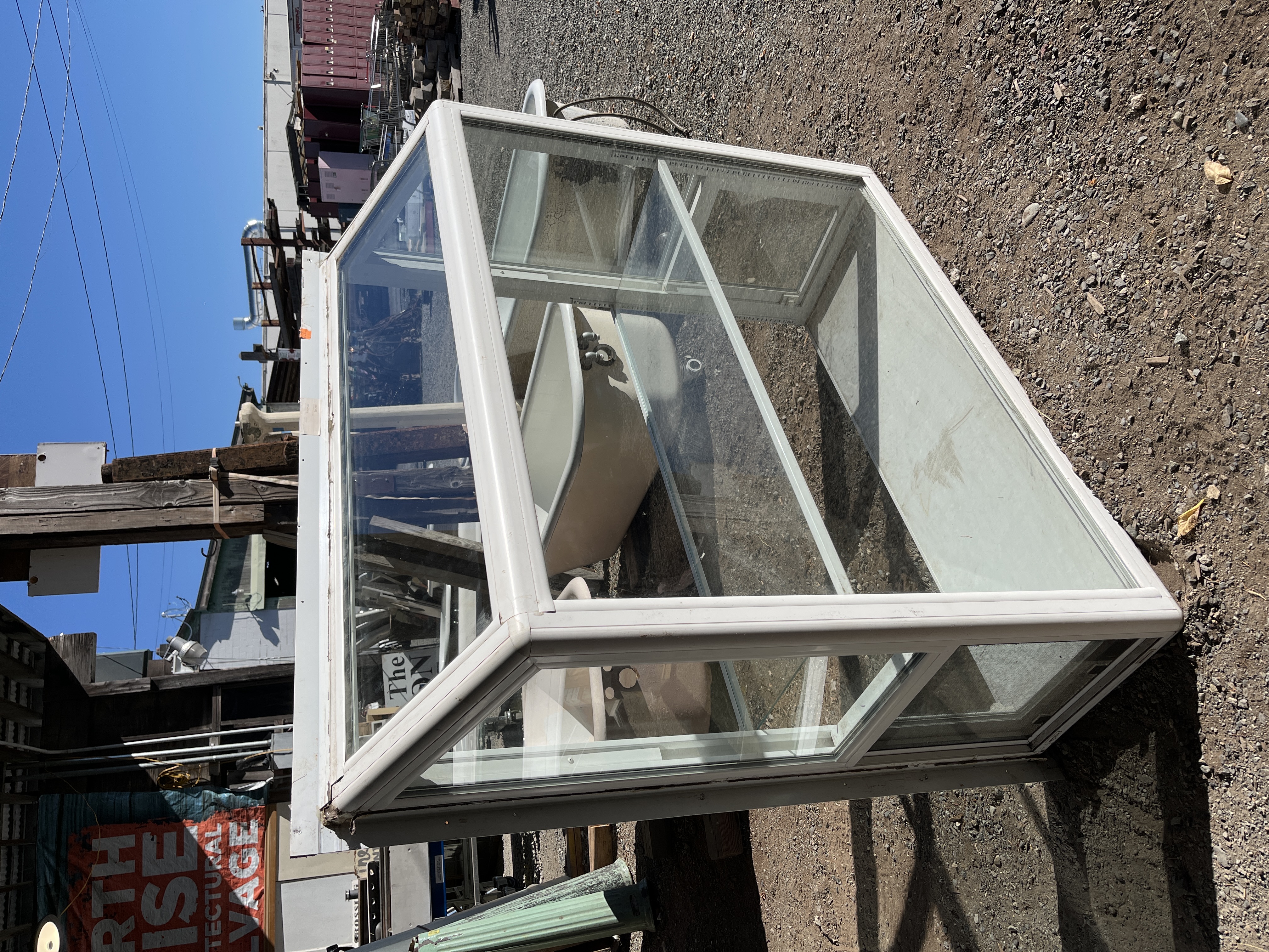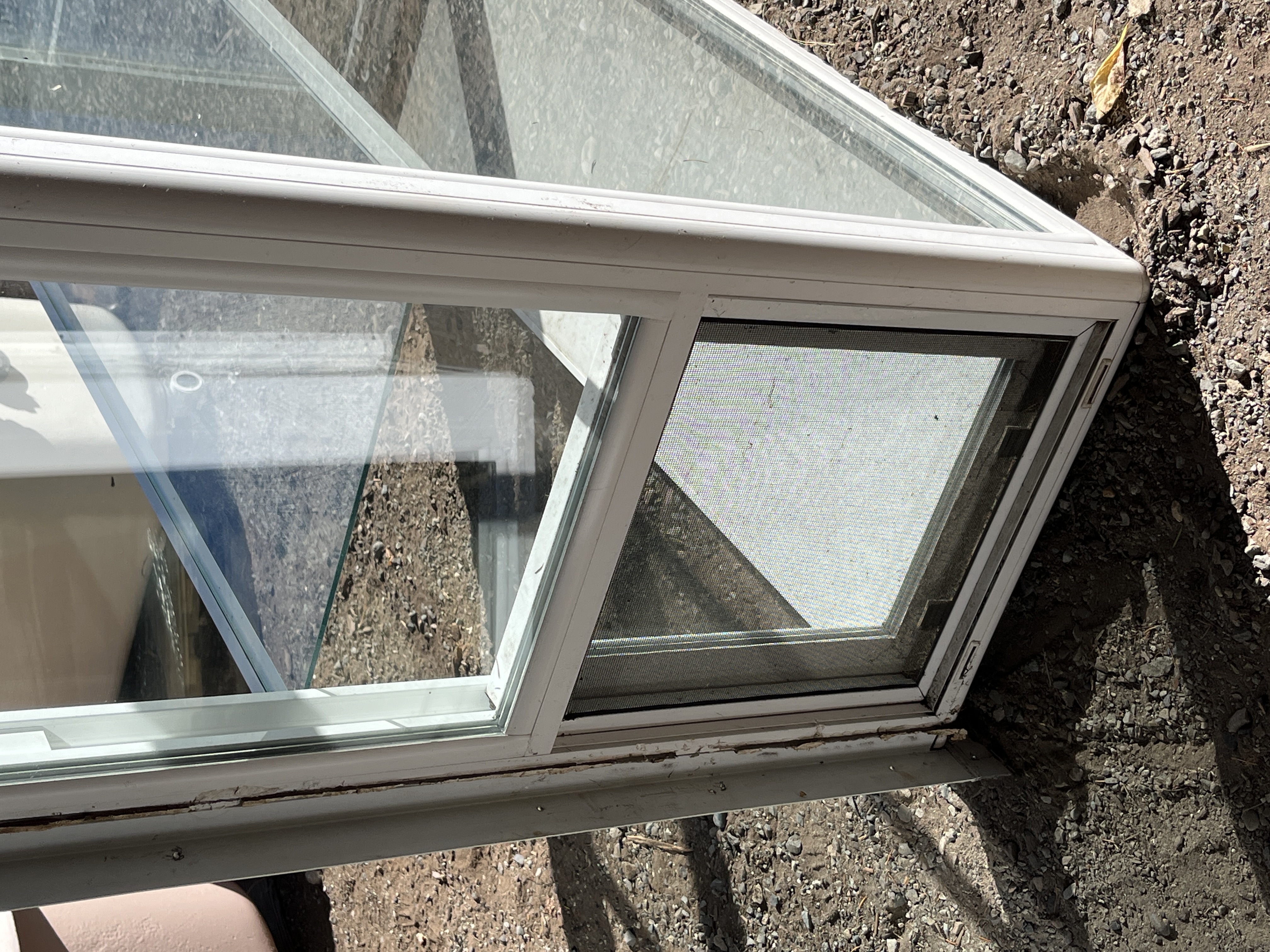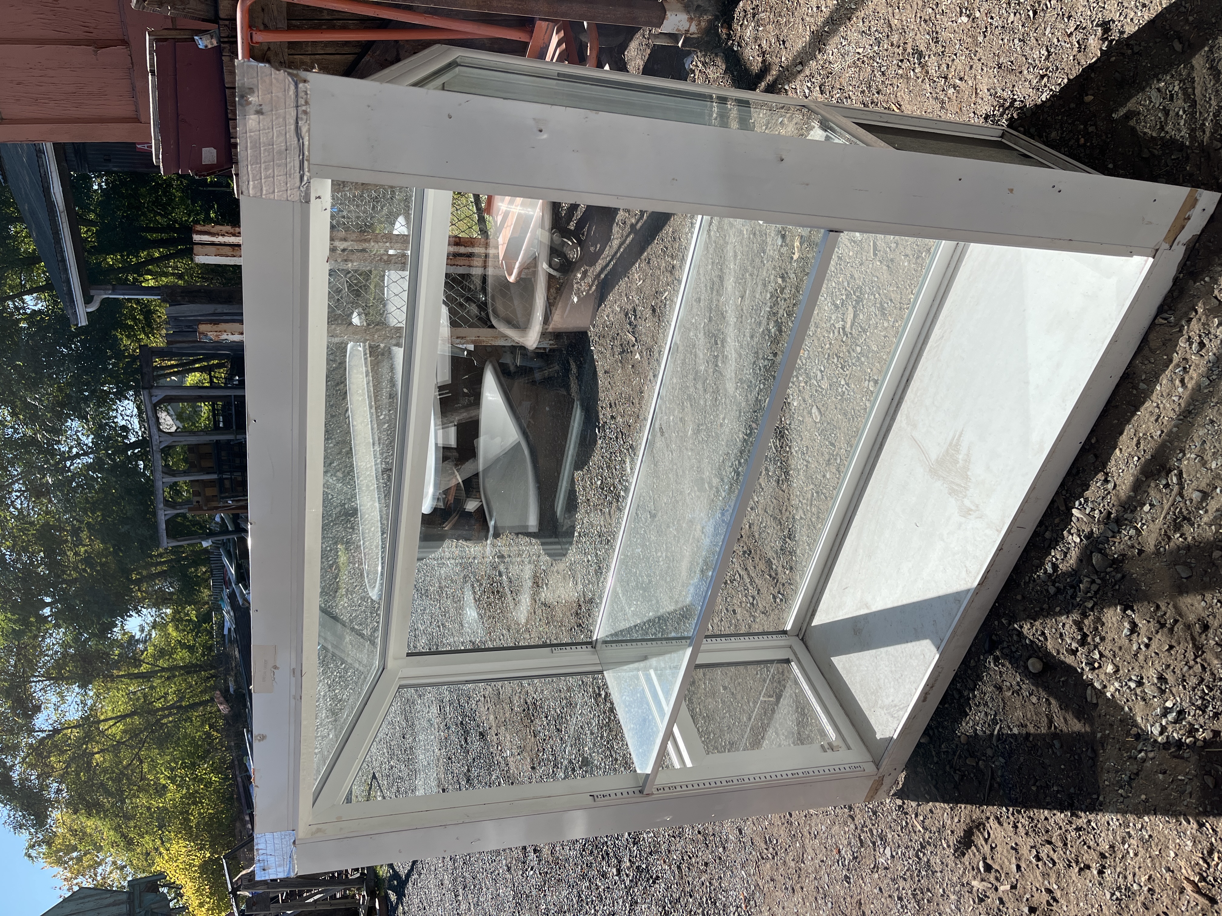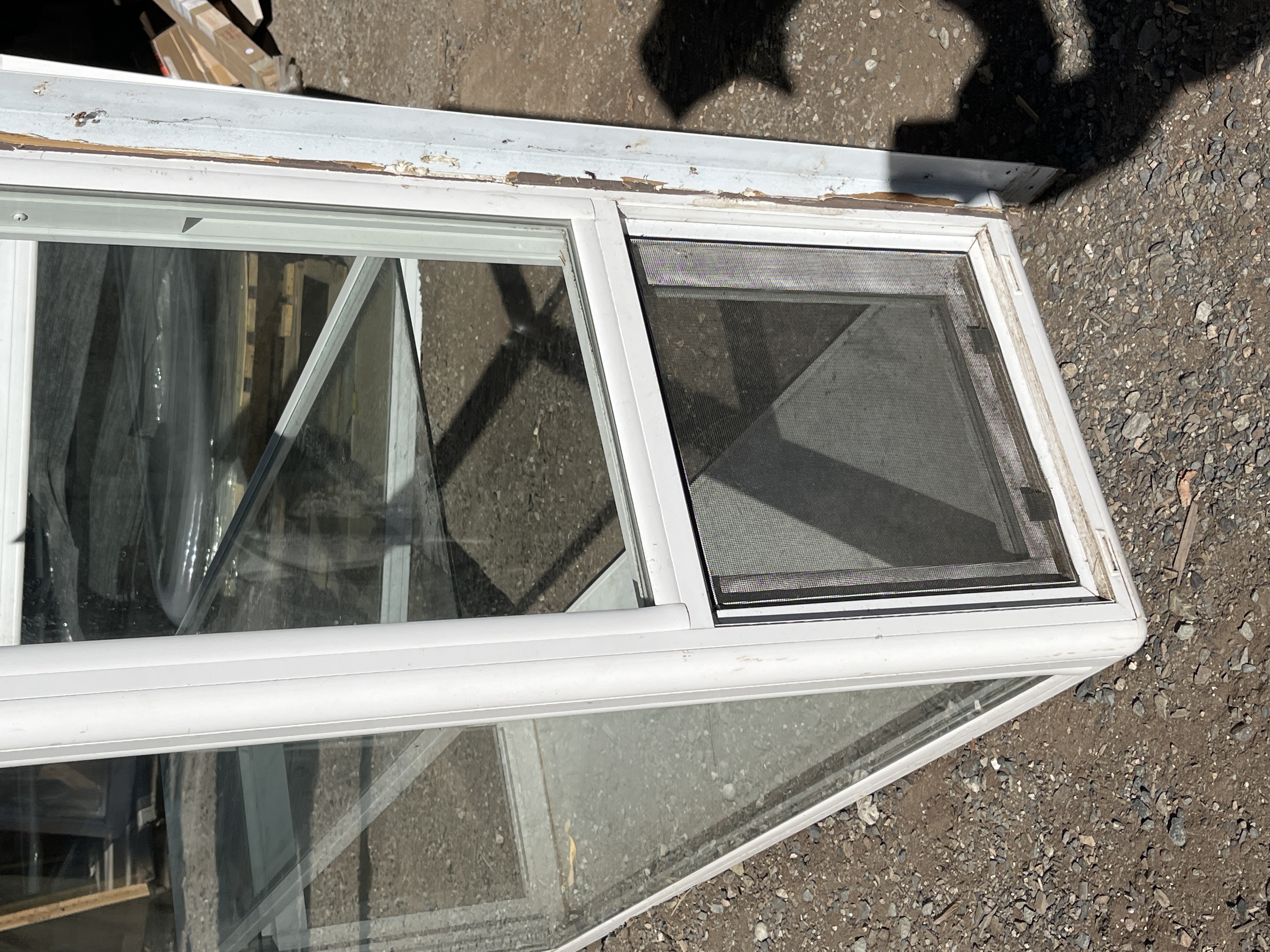 A nice big 2007 vinyl garden window with two operable side windows with good screens! This window is in great shape and complete with the glass shelf on the inside! All of the fins surrounding the window are in good shape still. There is some wear from previous installation and some caulking still around the perimeter. Measures 52 x 49.25 x 17.5 Inches.