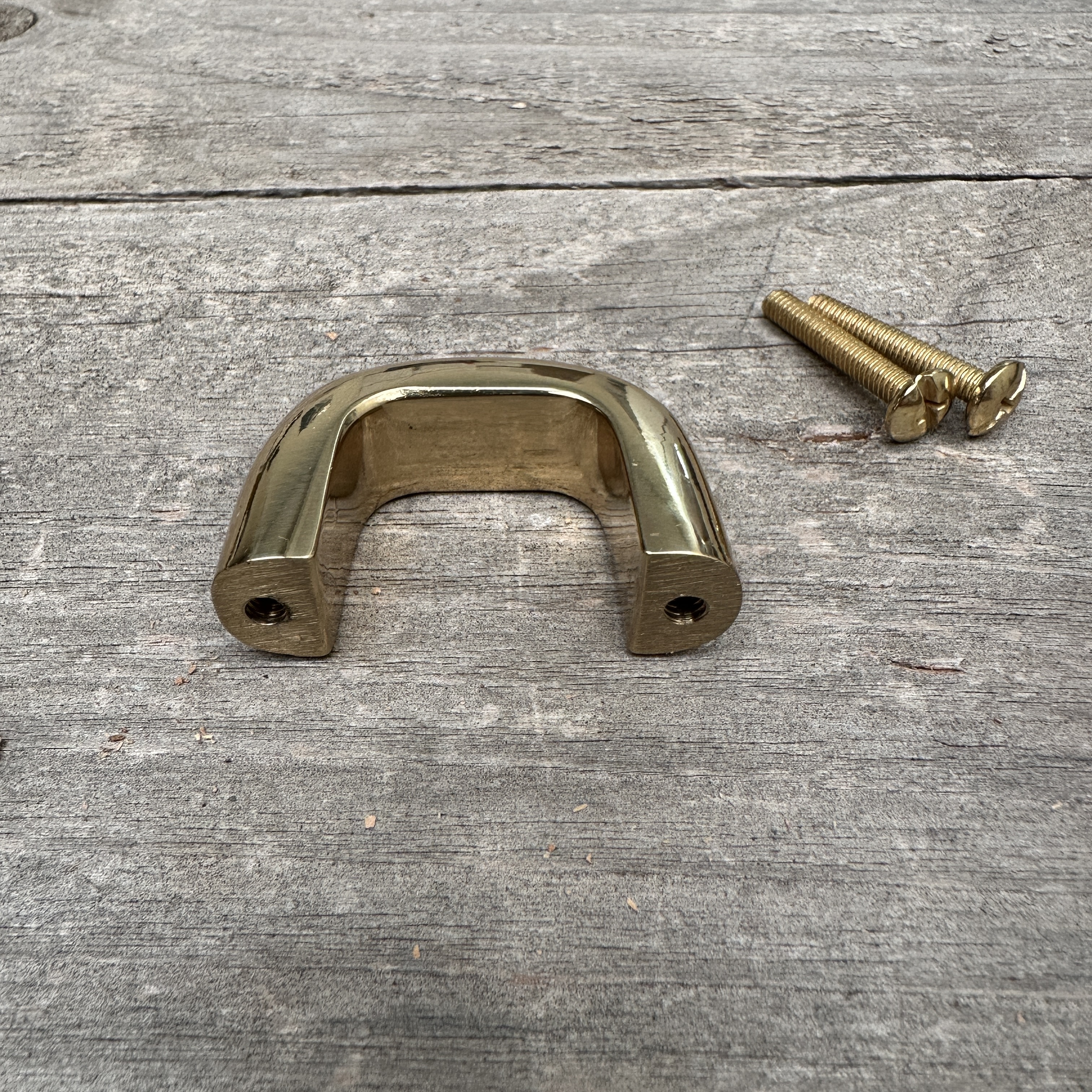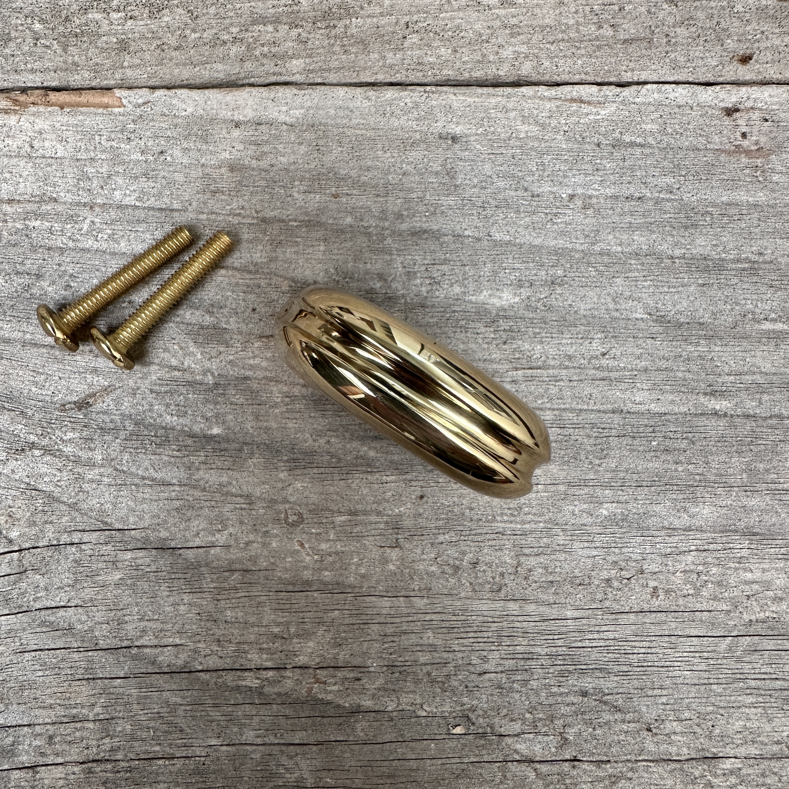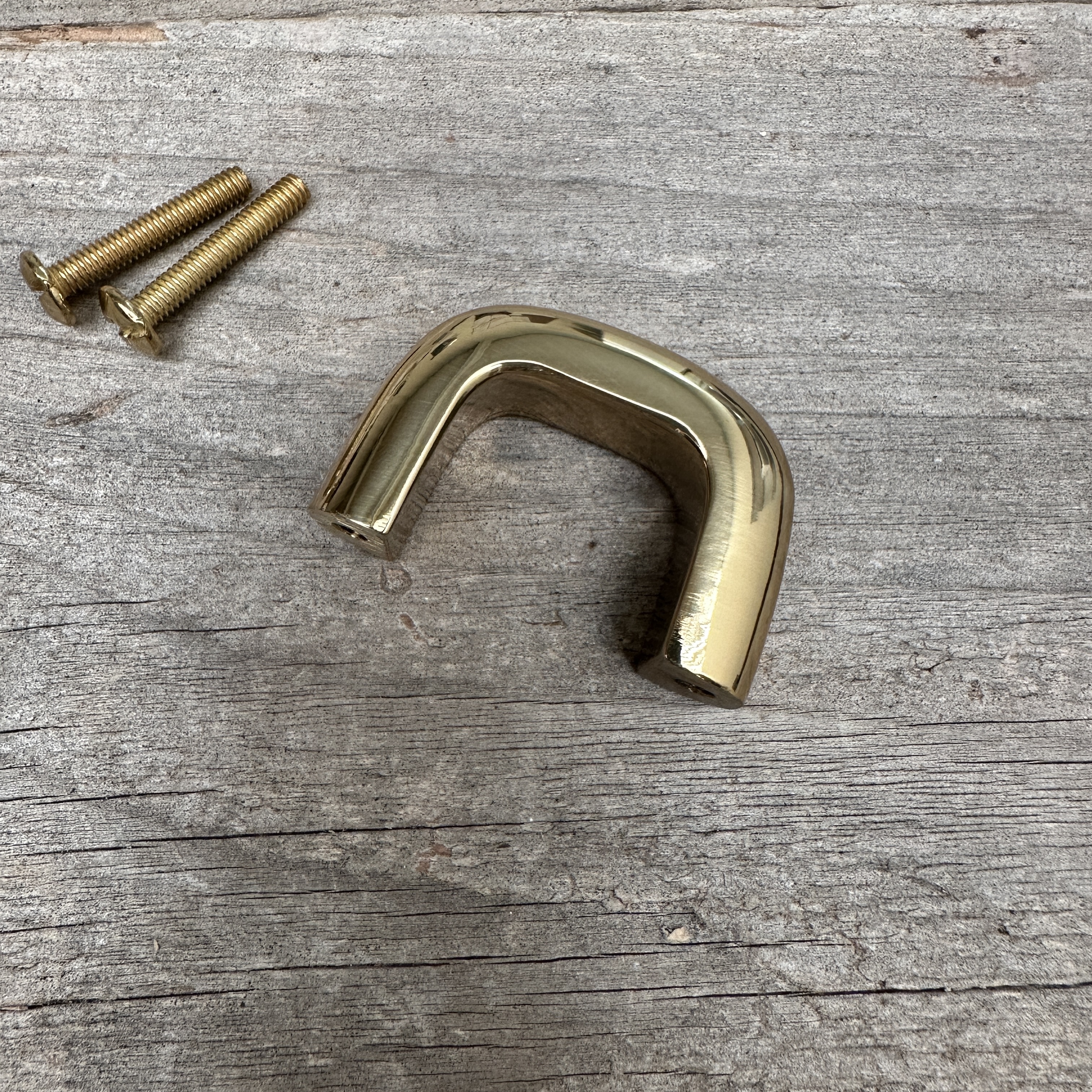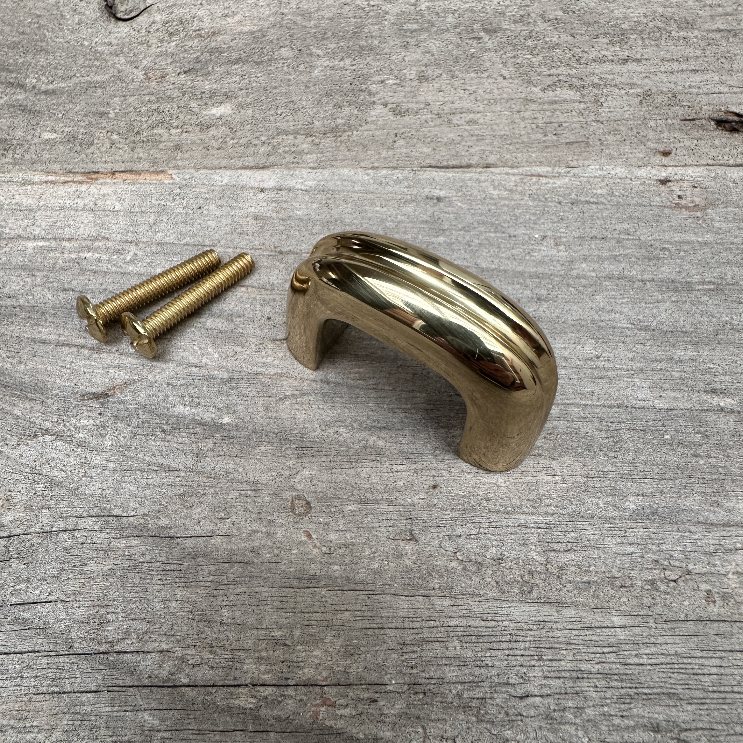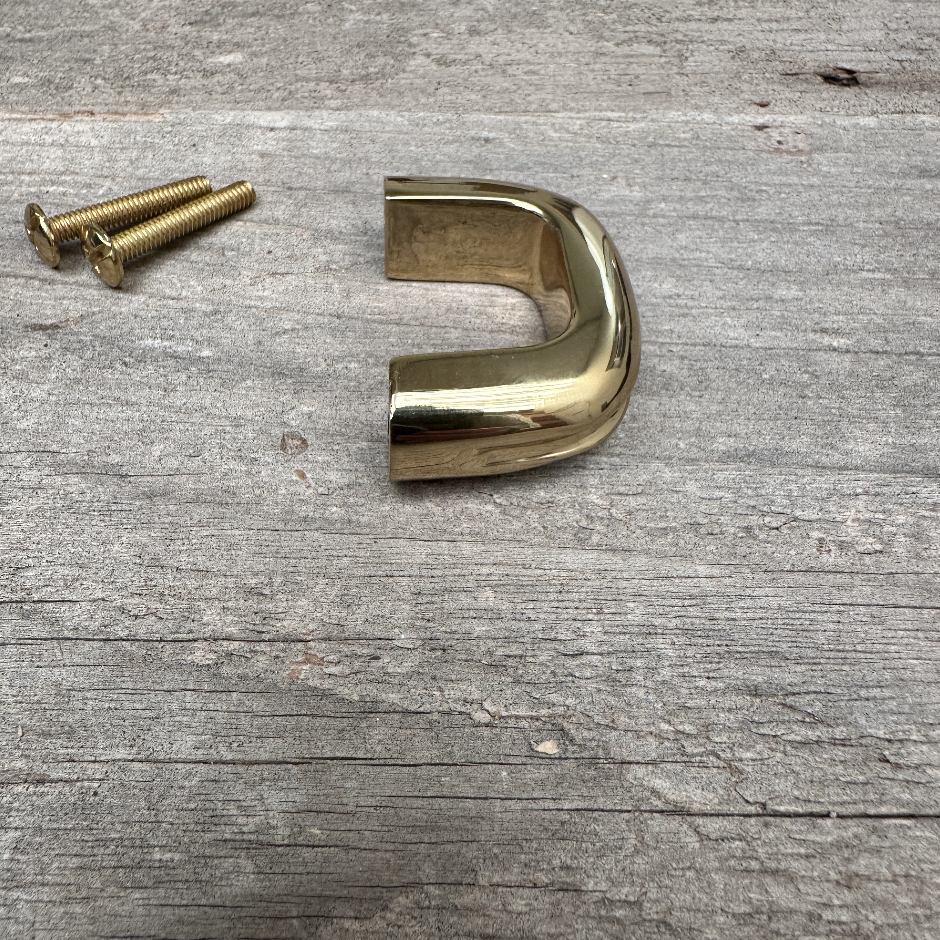 New old stock Amerock Advantage arch cabinet / drawer pull in a shiny bright brass. Has a small decorative ridge along the top for extra flair.