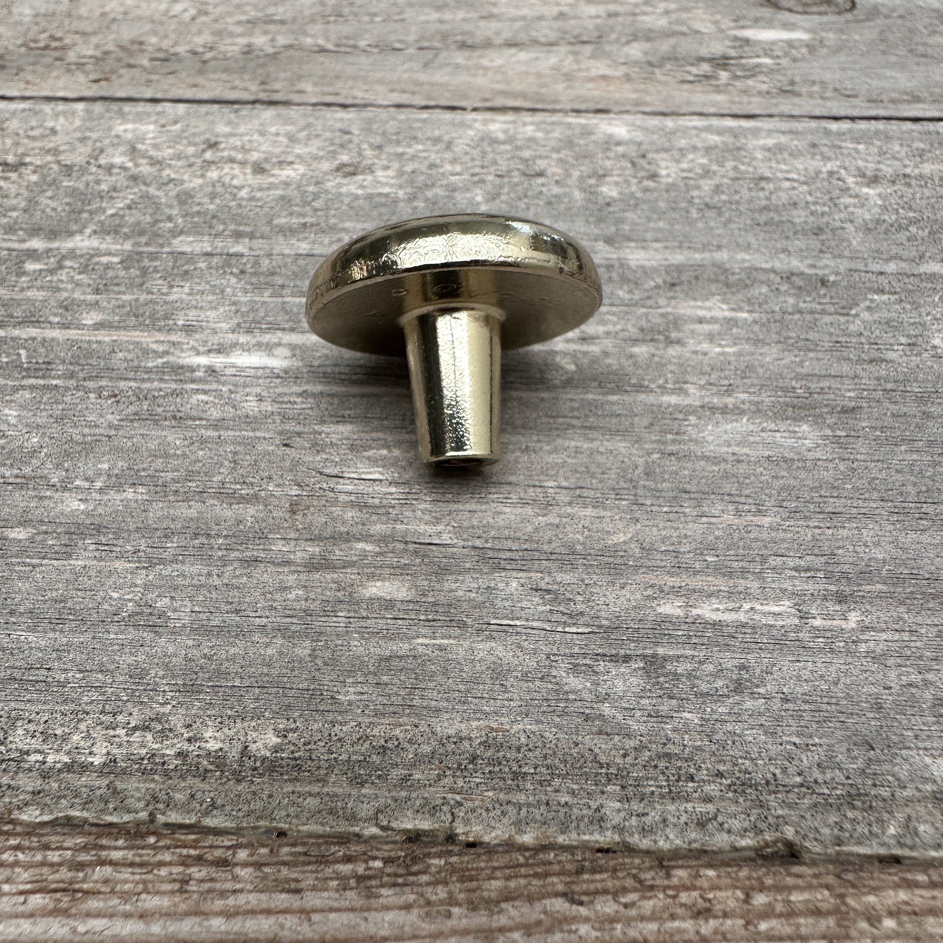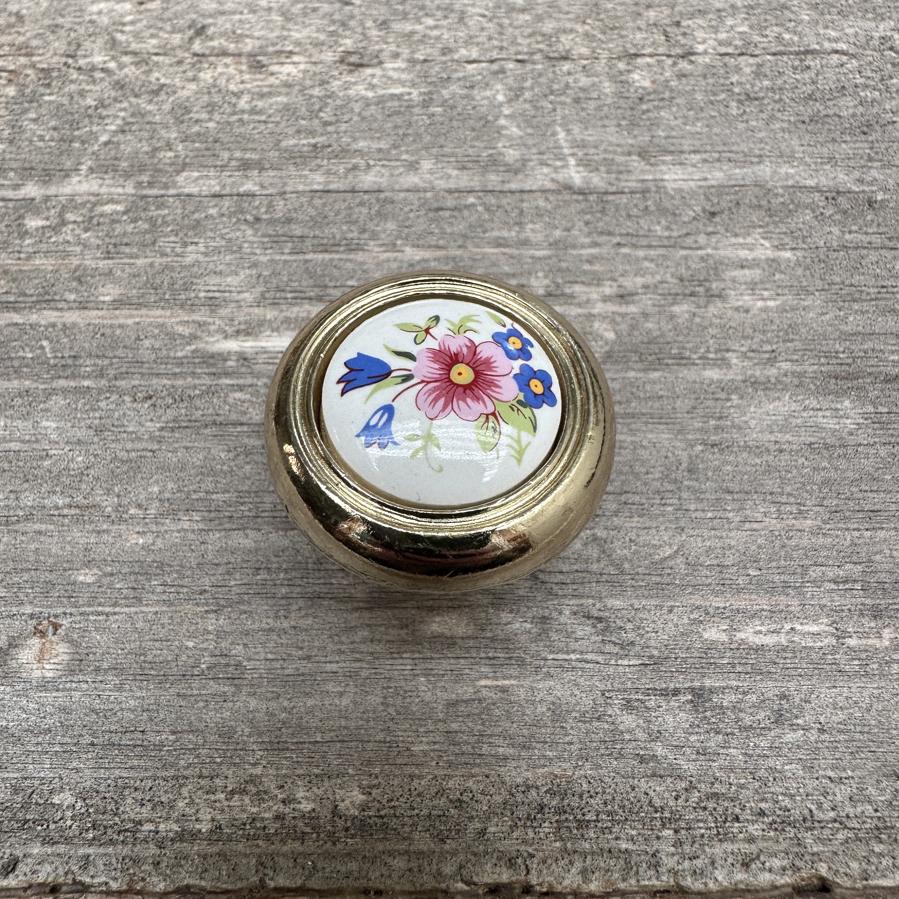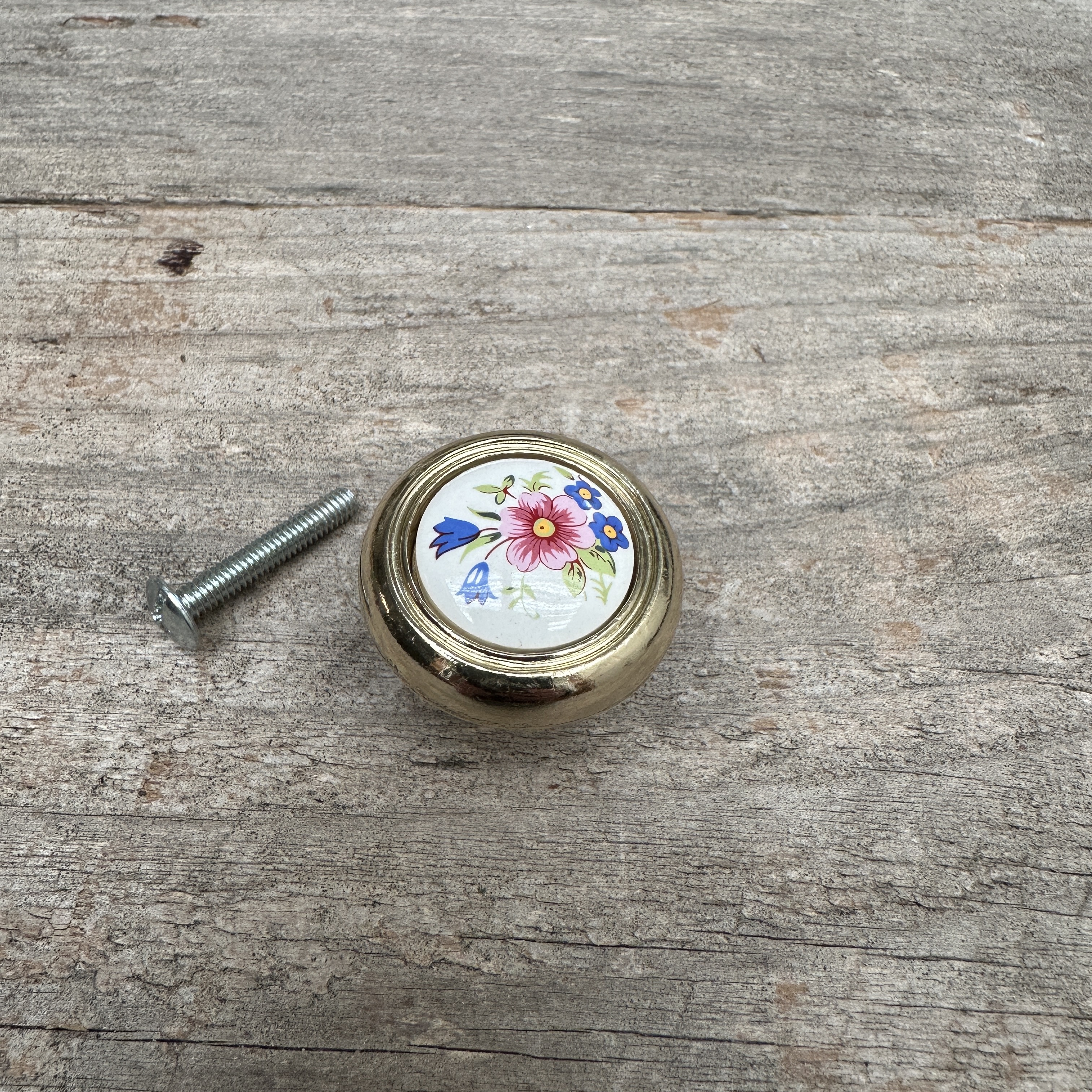 New Amerock cabinet knob in polished brass. Center has a floral print with white background. Mounting screw included. Multiple in stock. Images may be representational.