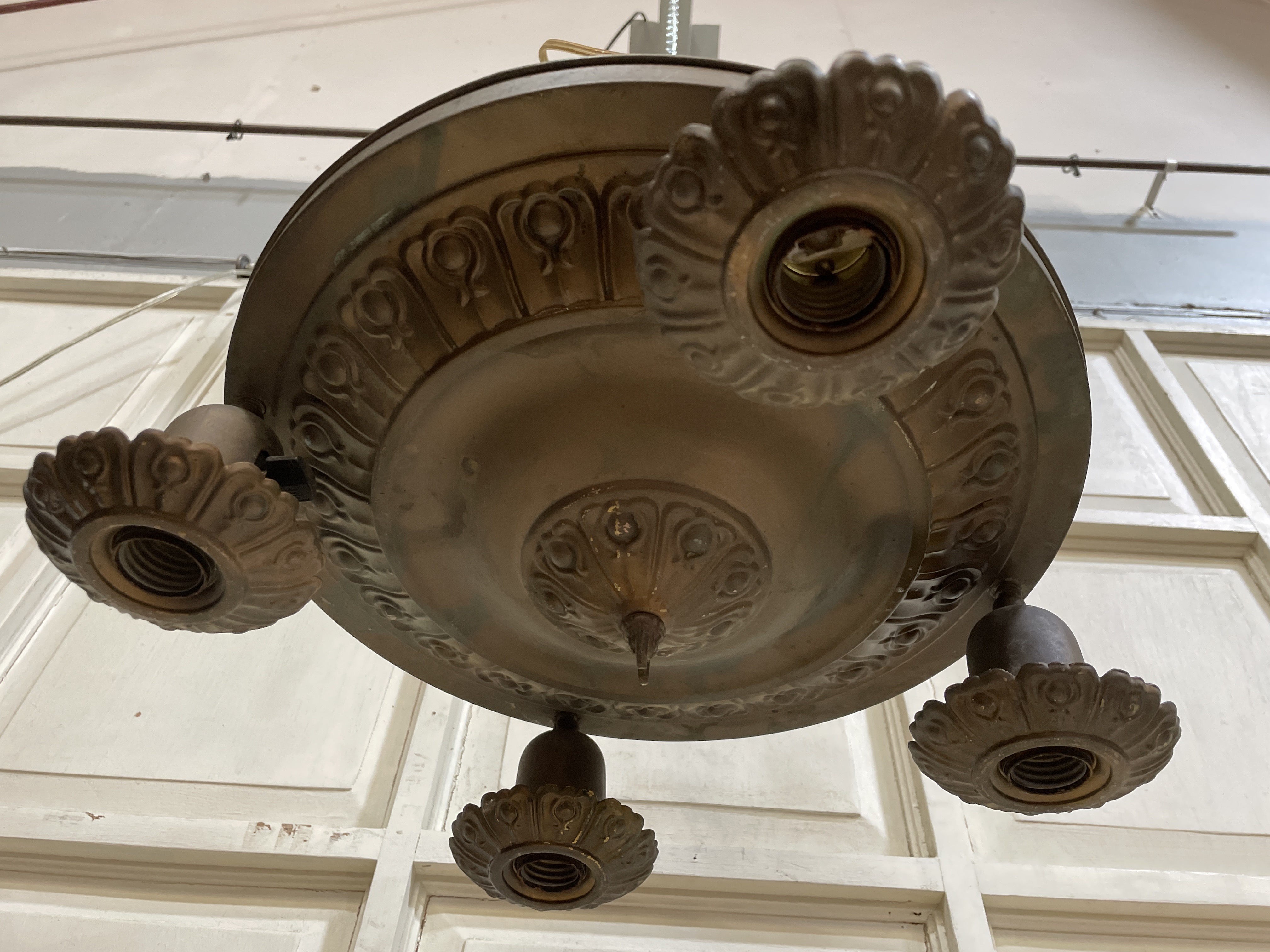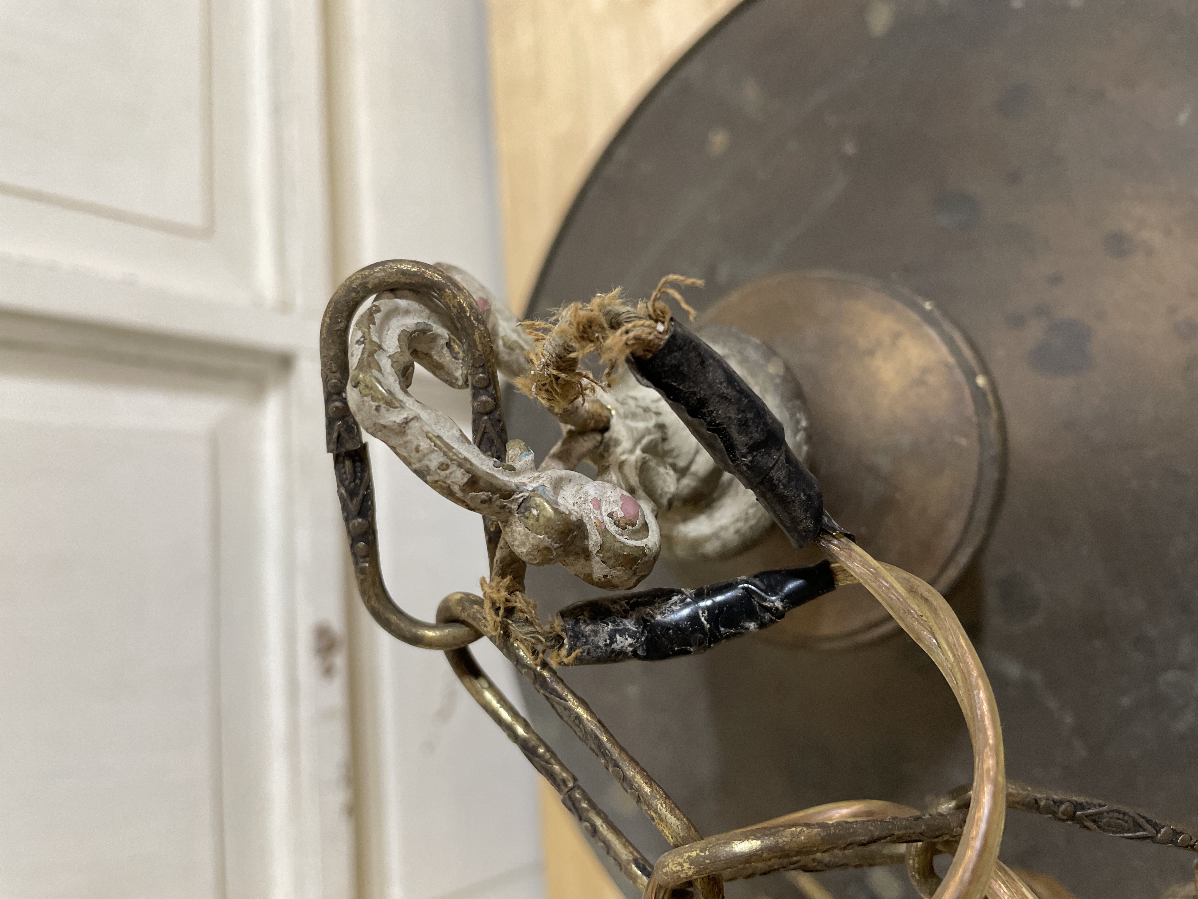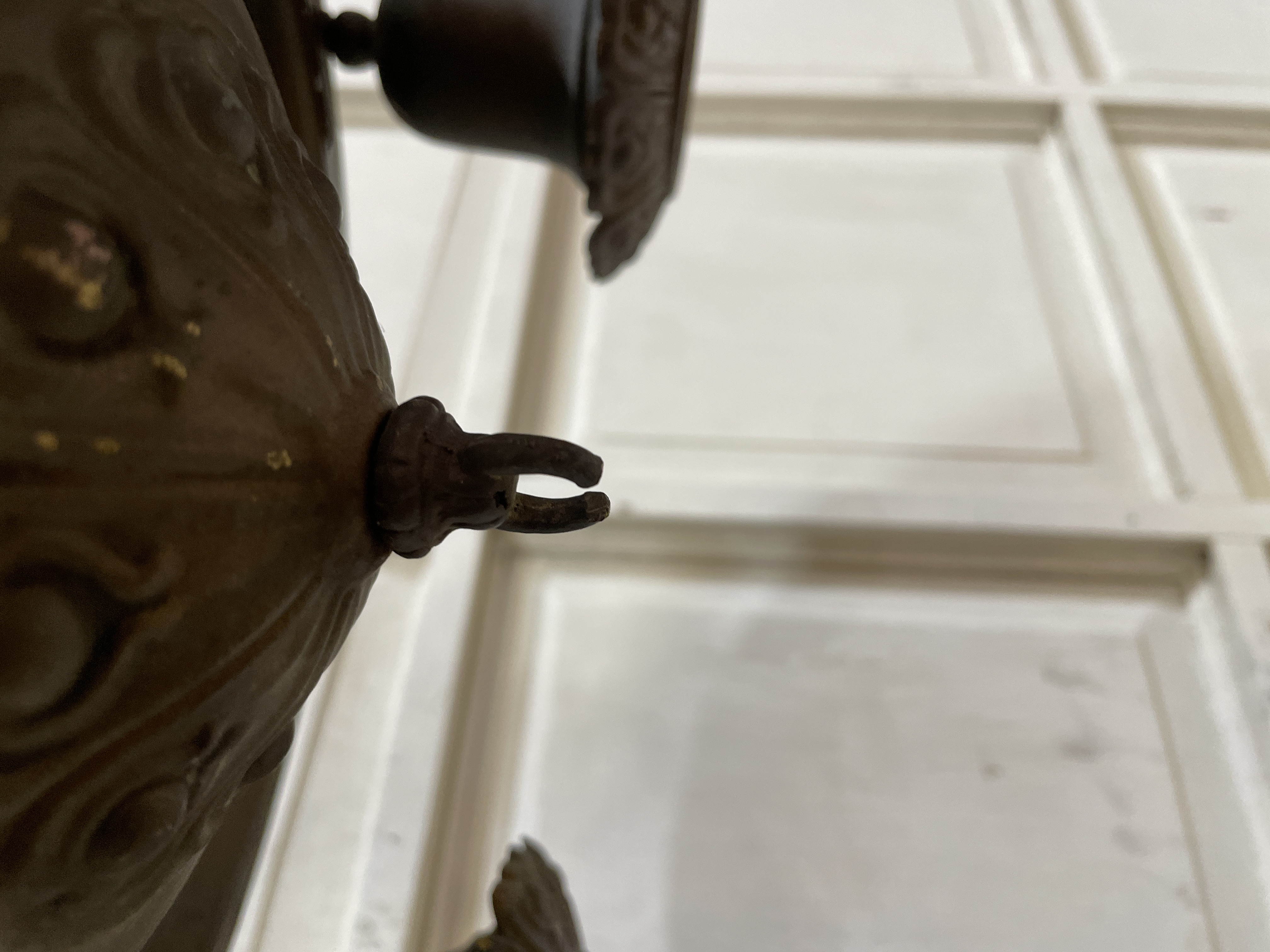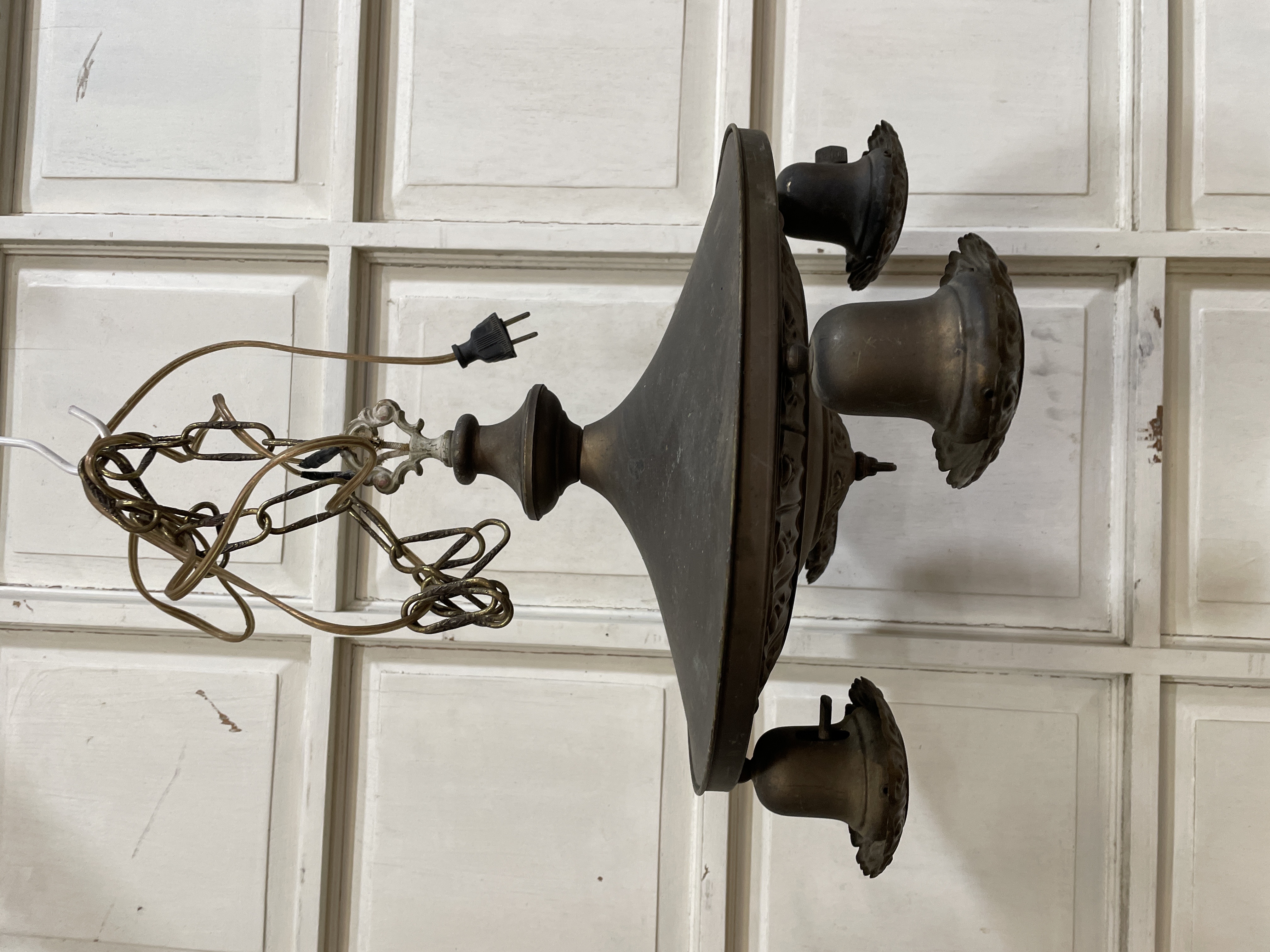 Brass with a bronze colored patina. Classic design. Missing finial and needs to be rewired.