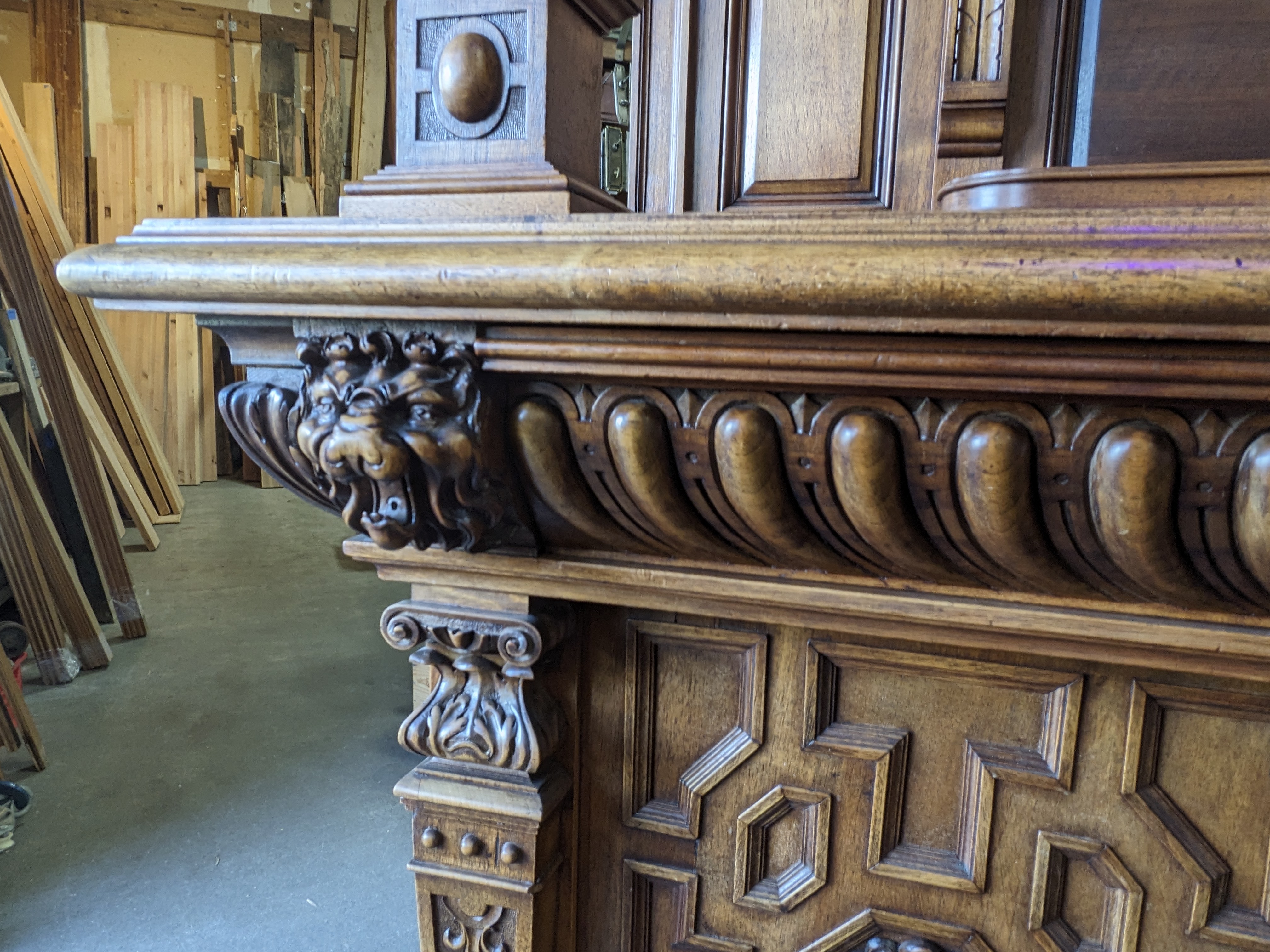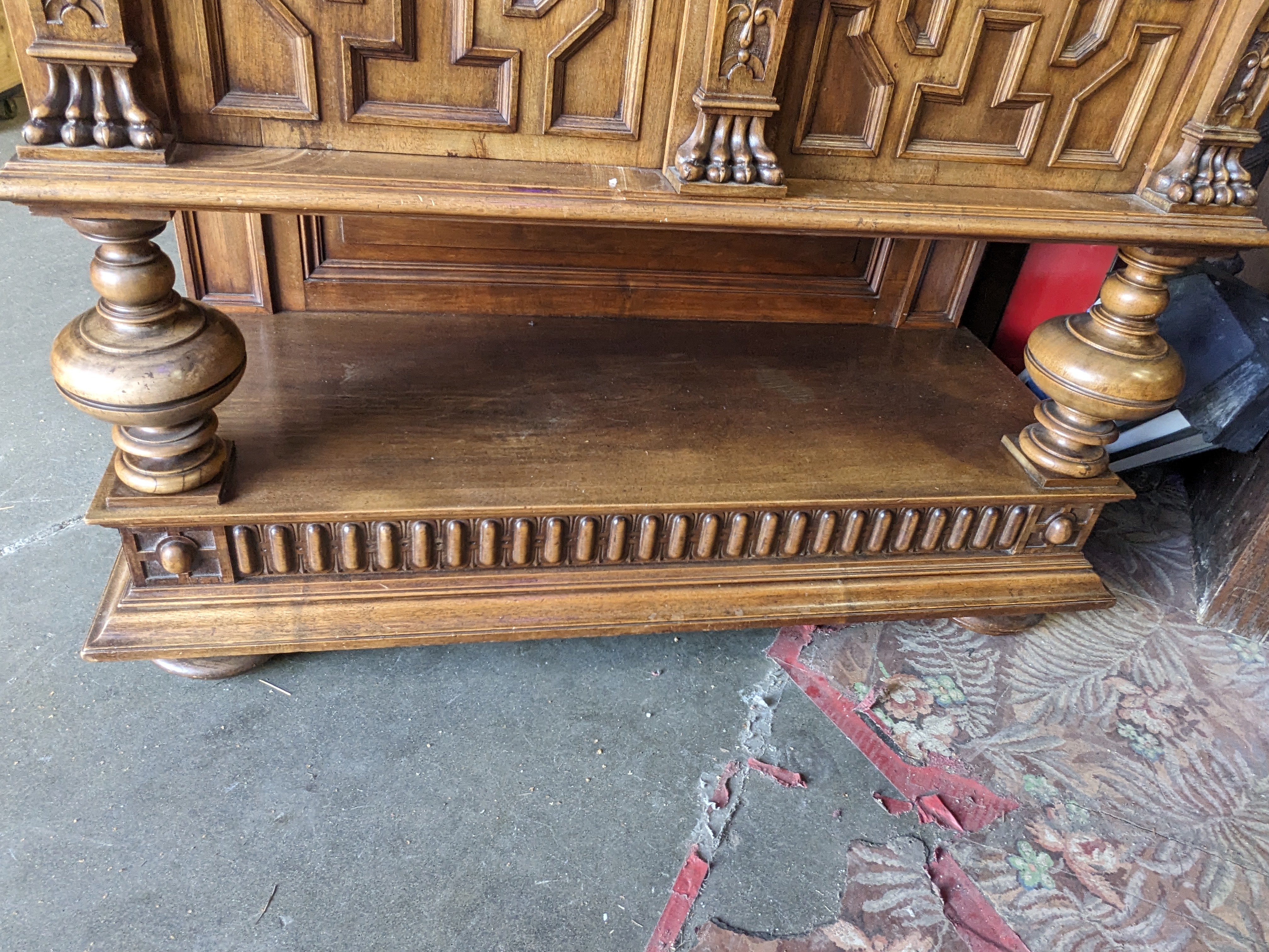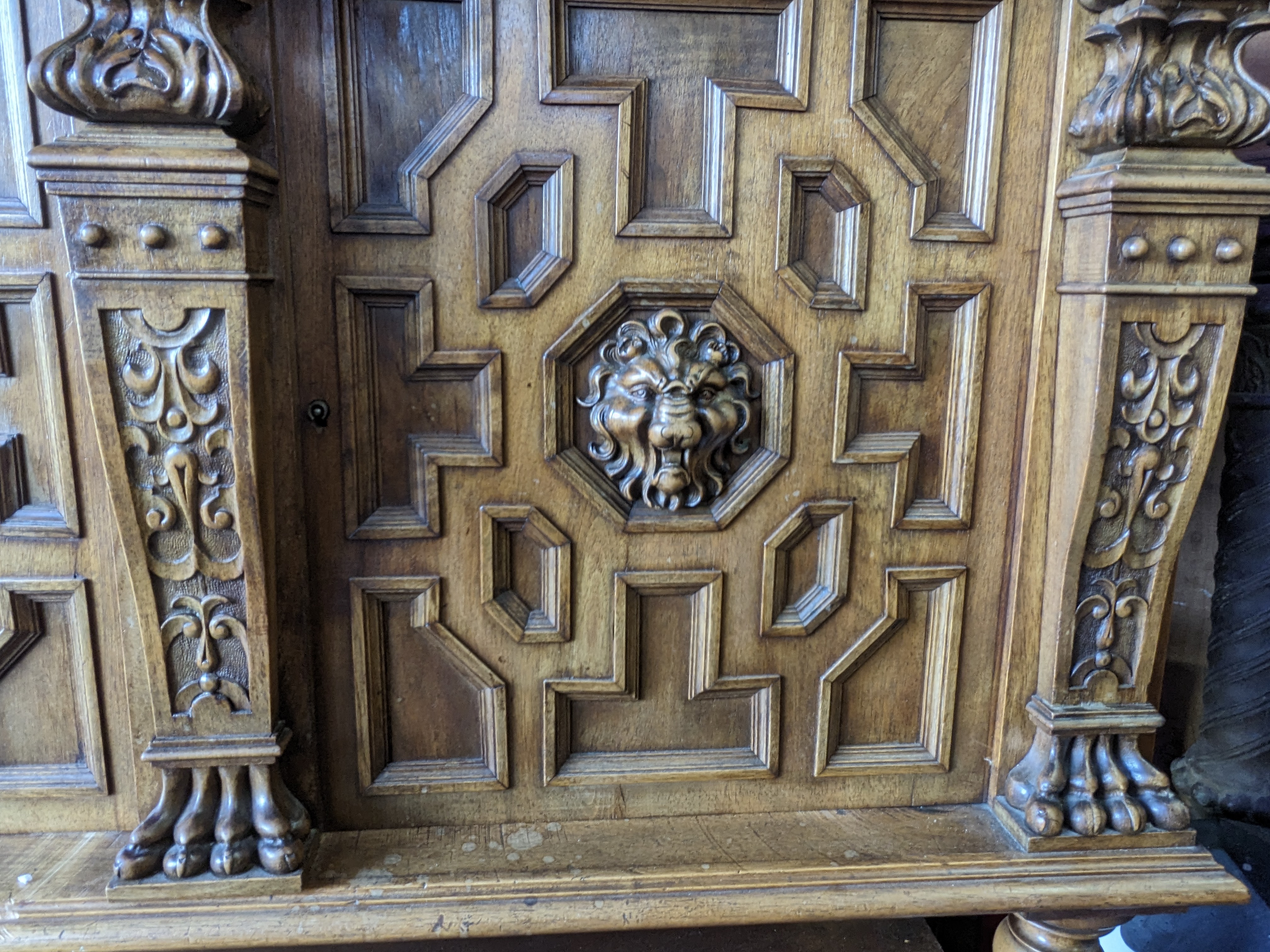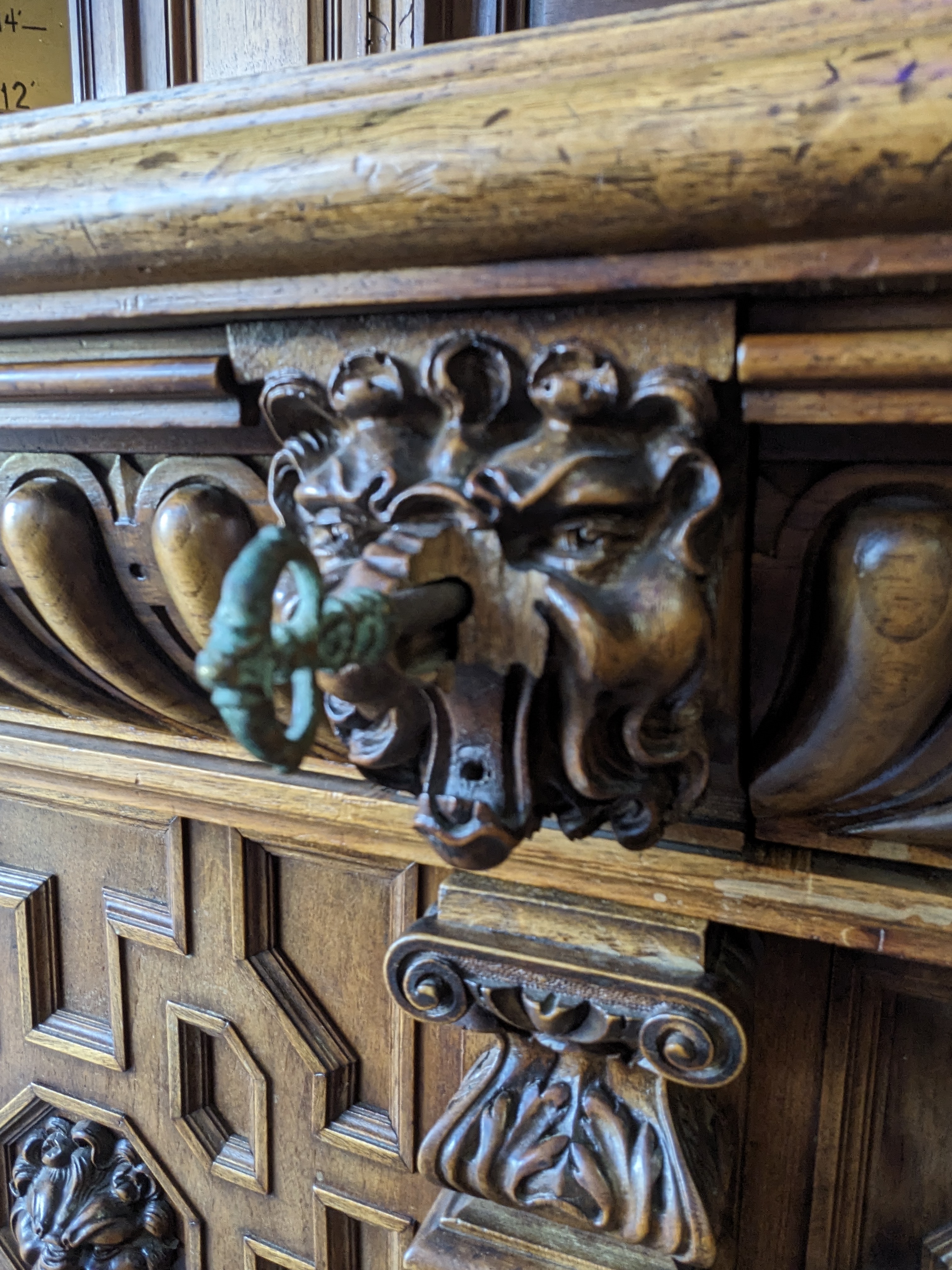 This gorgeous English walnut piece shows an immense level of craftsmanship in every detail. The evidence of its age lives in the well worn surfaces. This was made in Paris, France, likely in the late 1800s. There are some small imperfections in the veneer and a chip has come off of the carved head keyhole (shown in pictures).