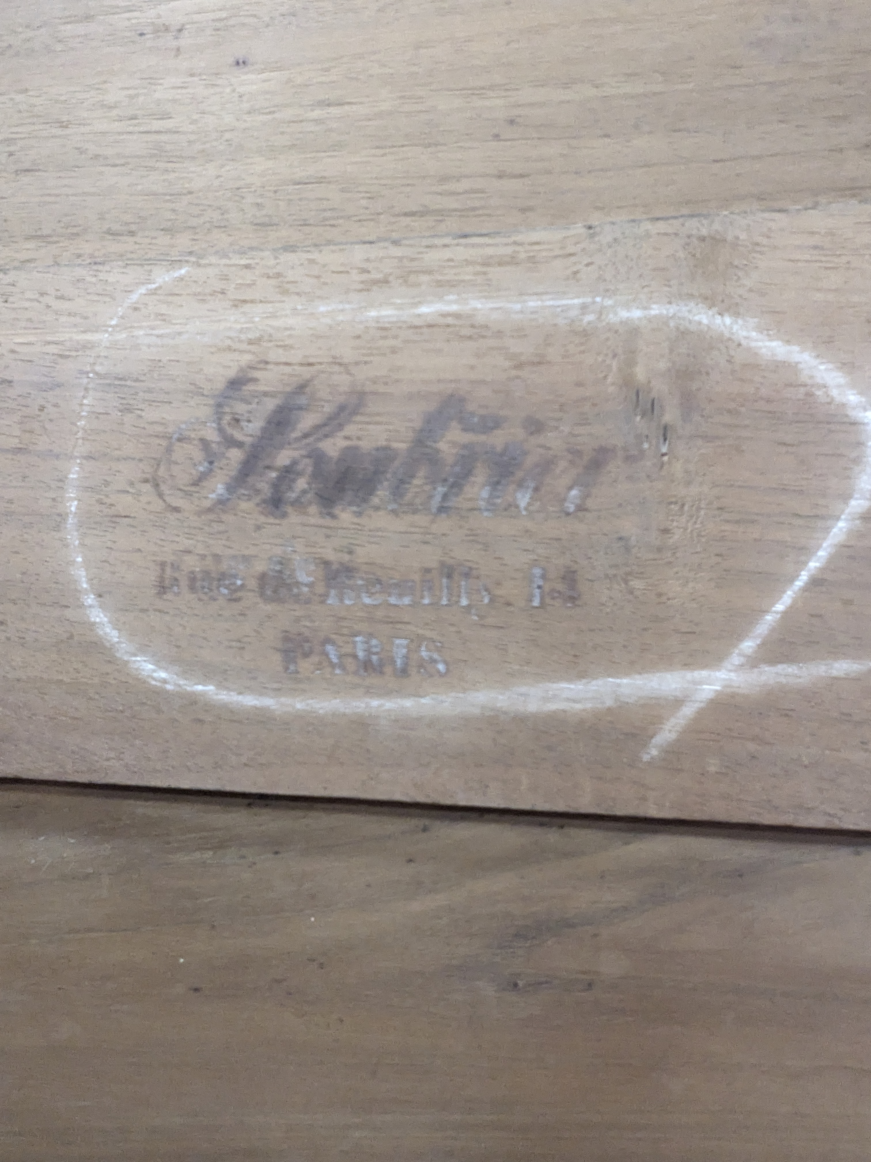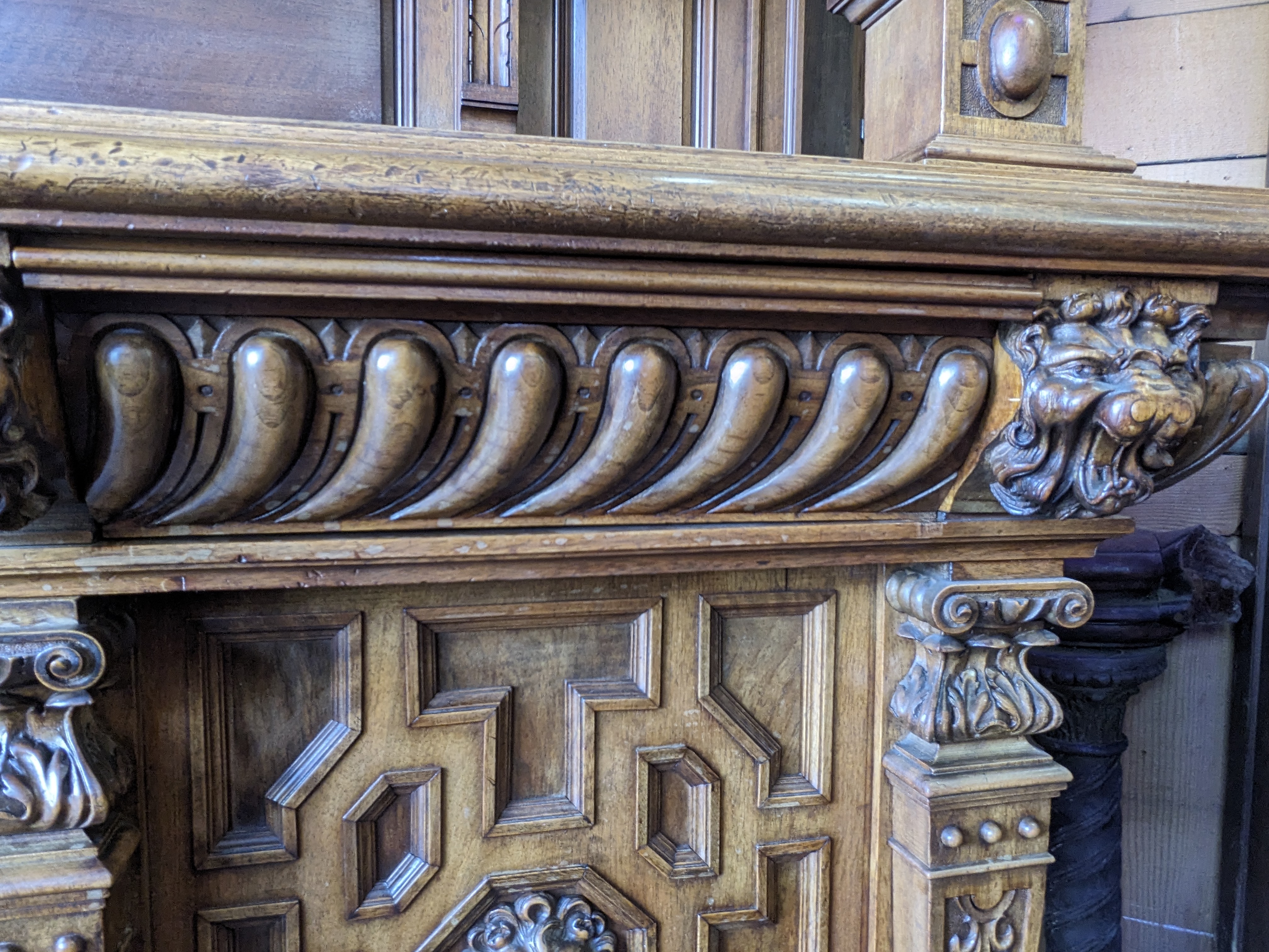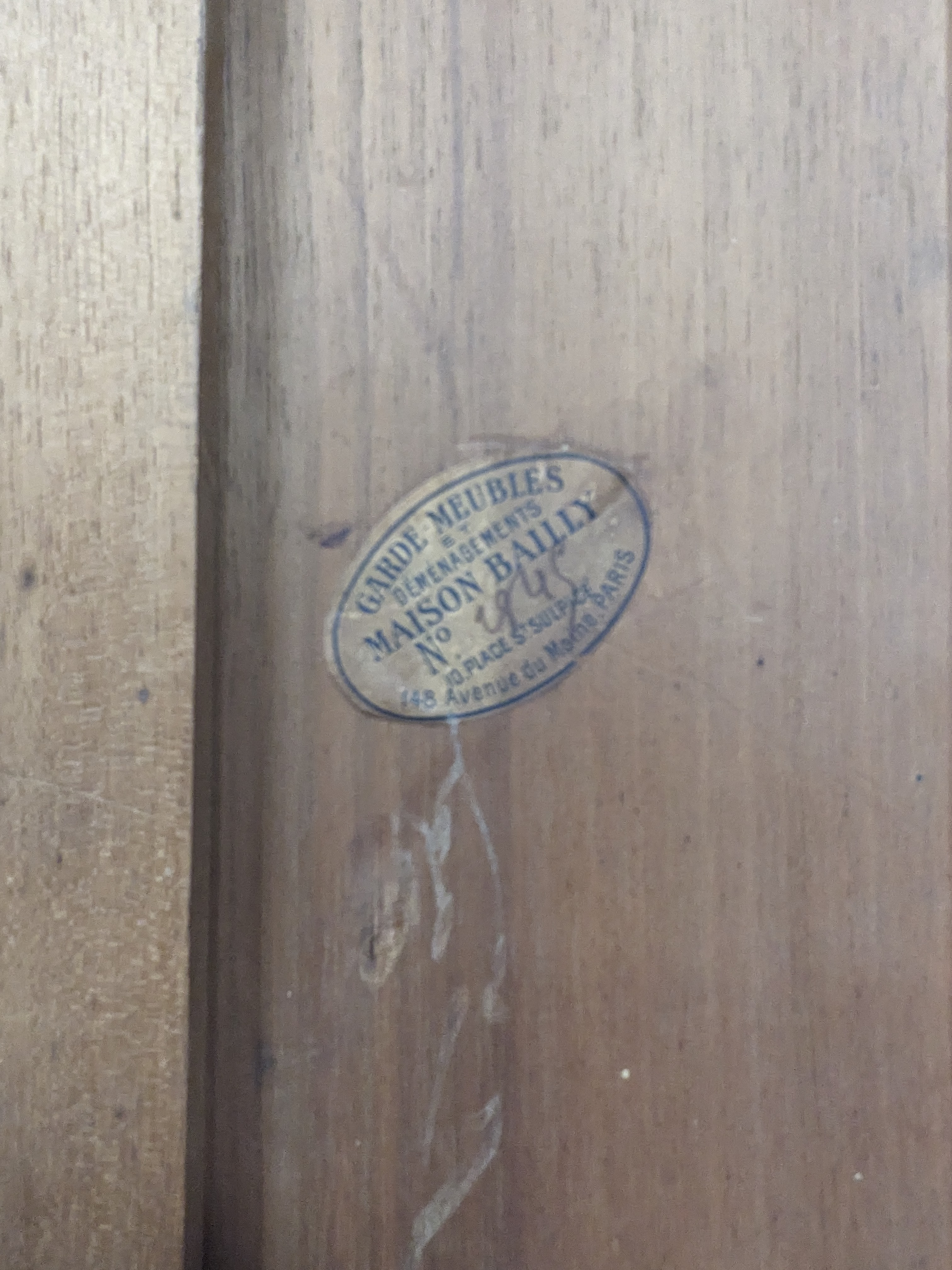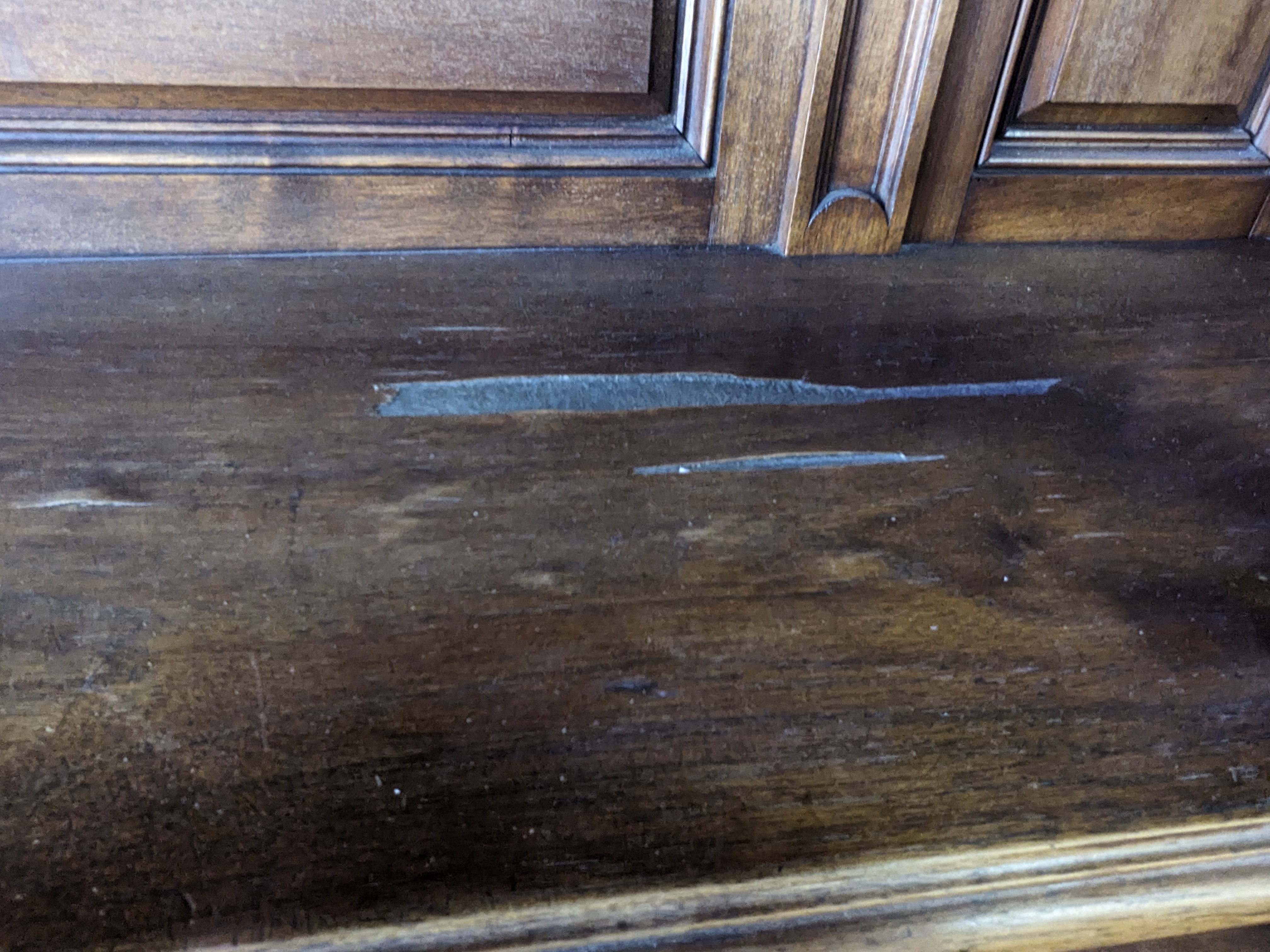 This gorgeous English walnut piece shows an immense level of craftsmanship in every detail. The evidence of its age lives in the well worn surfaces. This was made in Paris, France, likely in the late 1800s. There are some small imperfections in the veneer and a chip has come off of the carved head keyhole (shown in pictures).