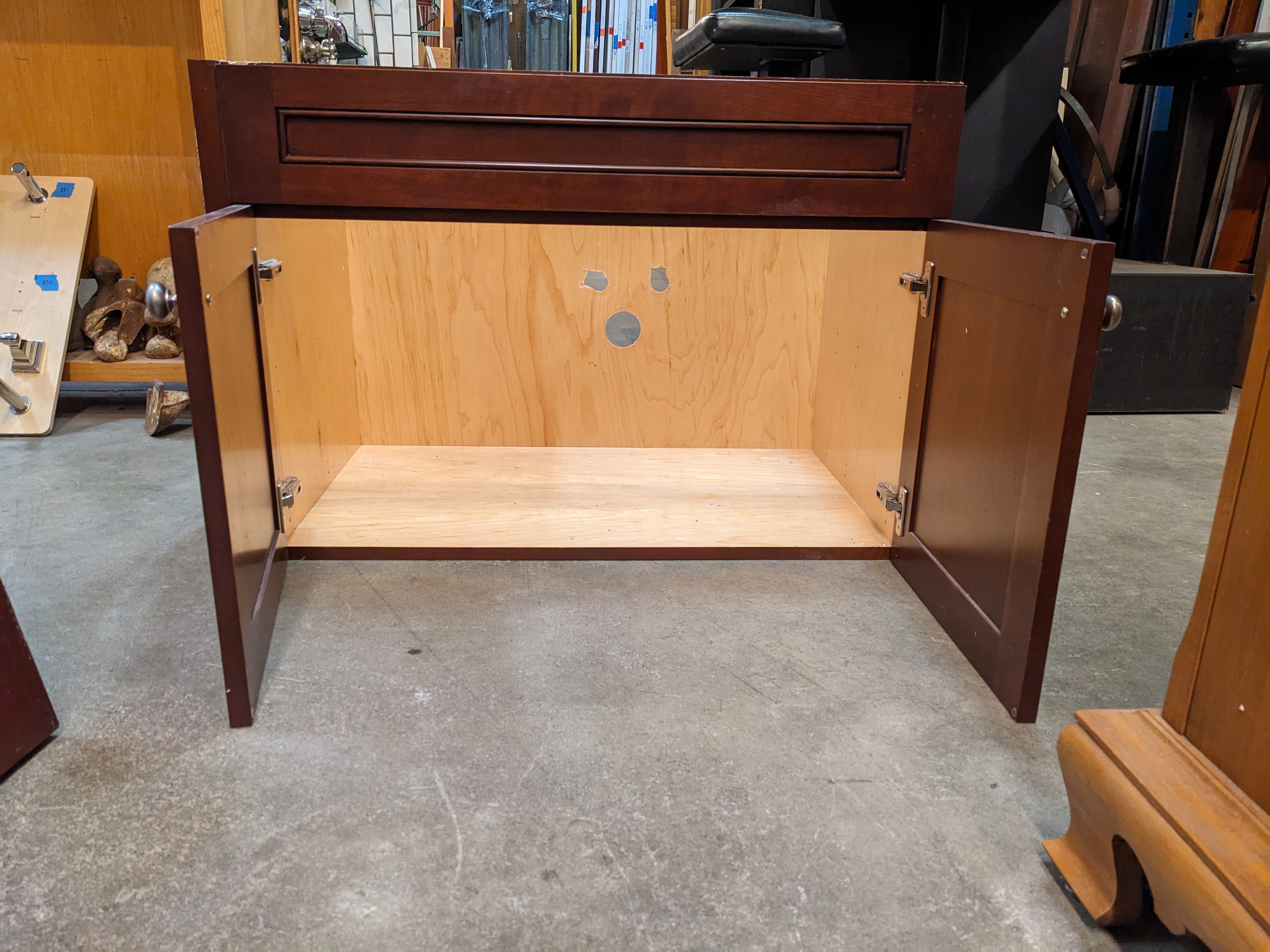 Rich, dark wood with a false top drawer and large open cavity with no pesky support board in the middle! There is a matching shelf you may add in with pegs, if you desire.