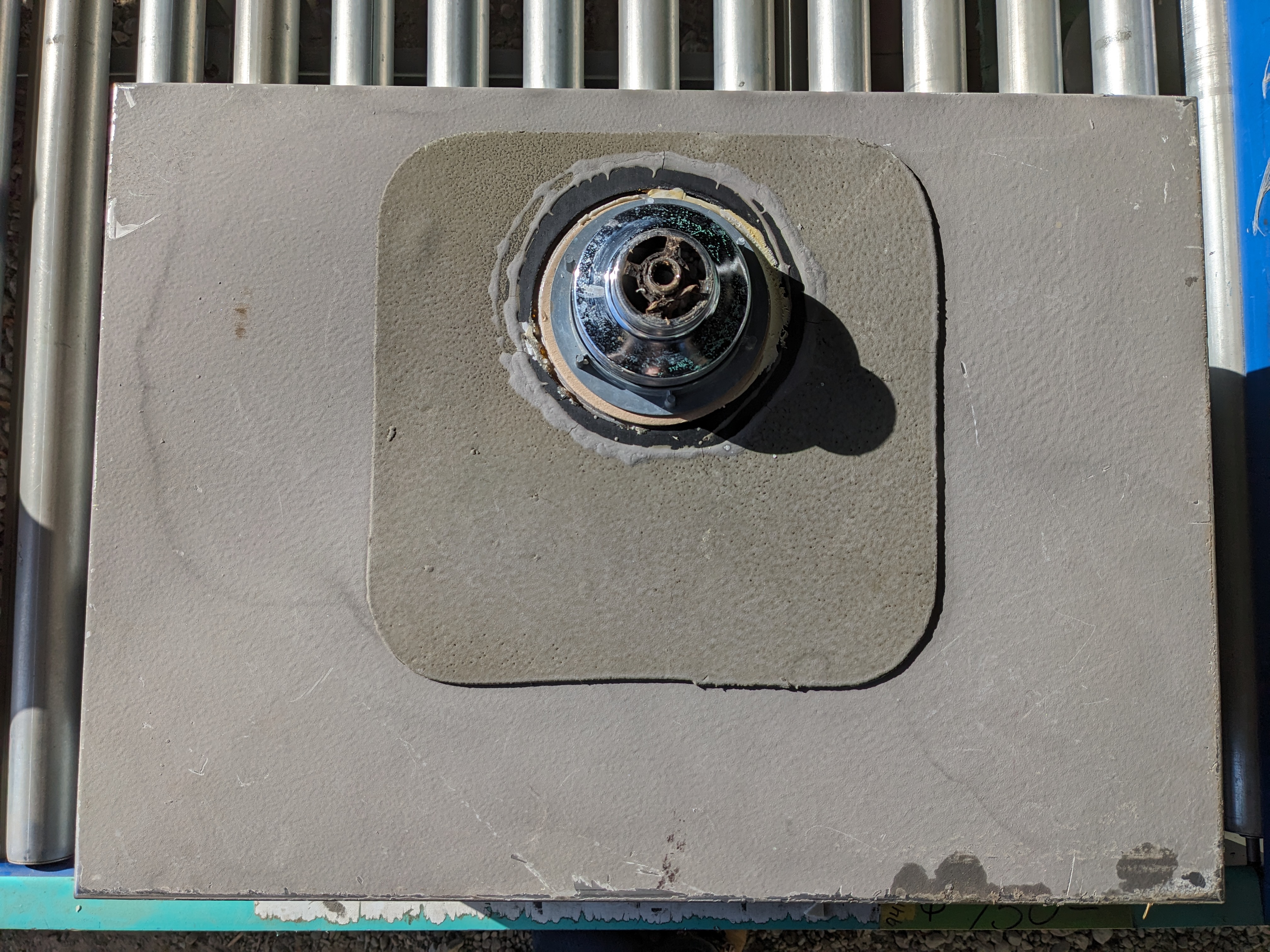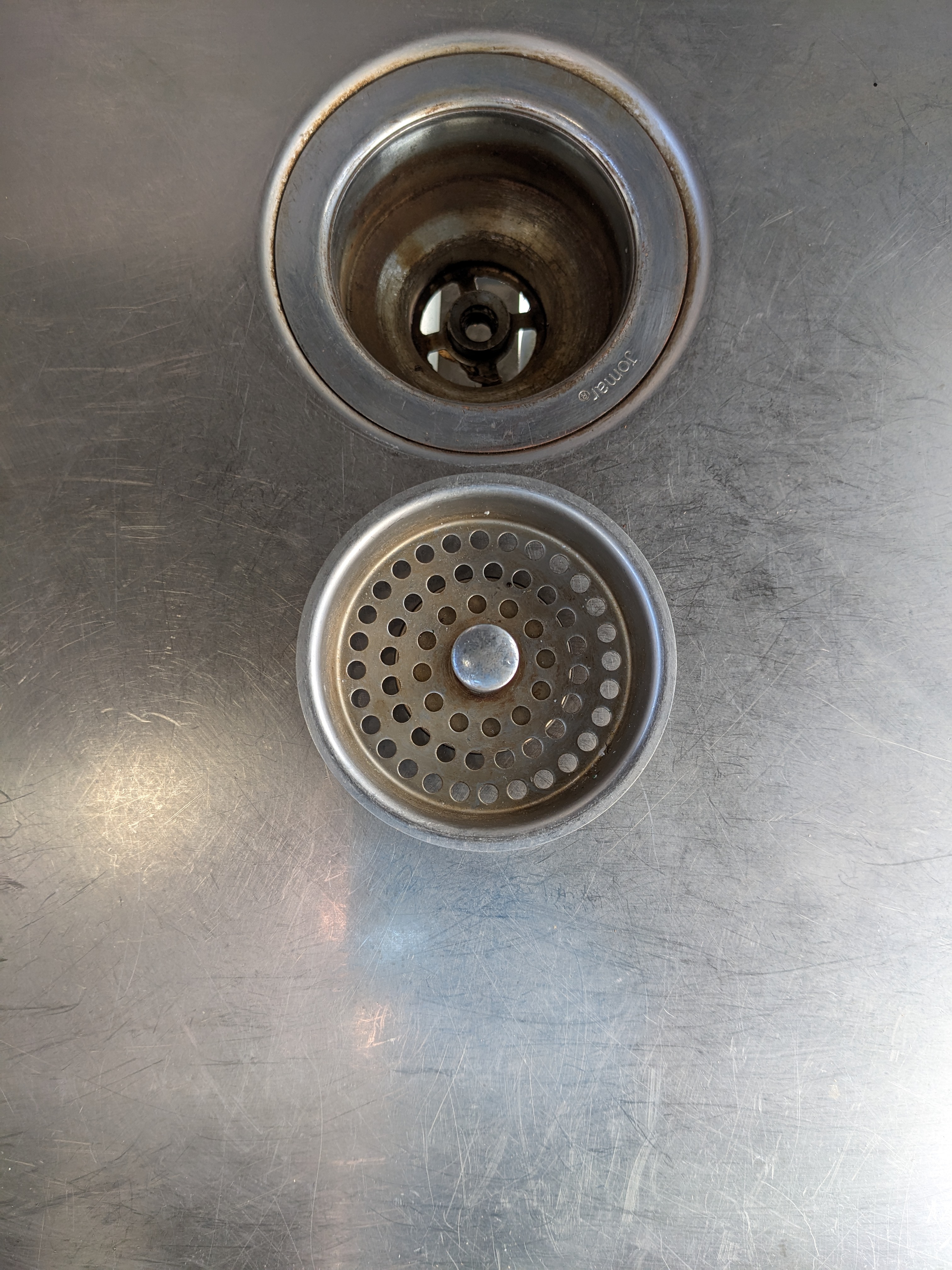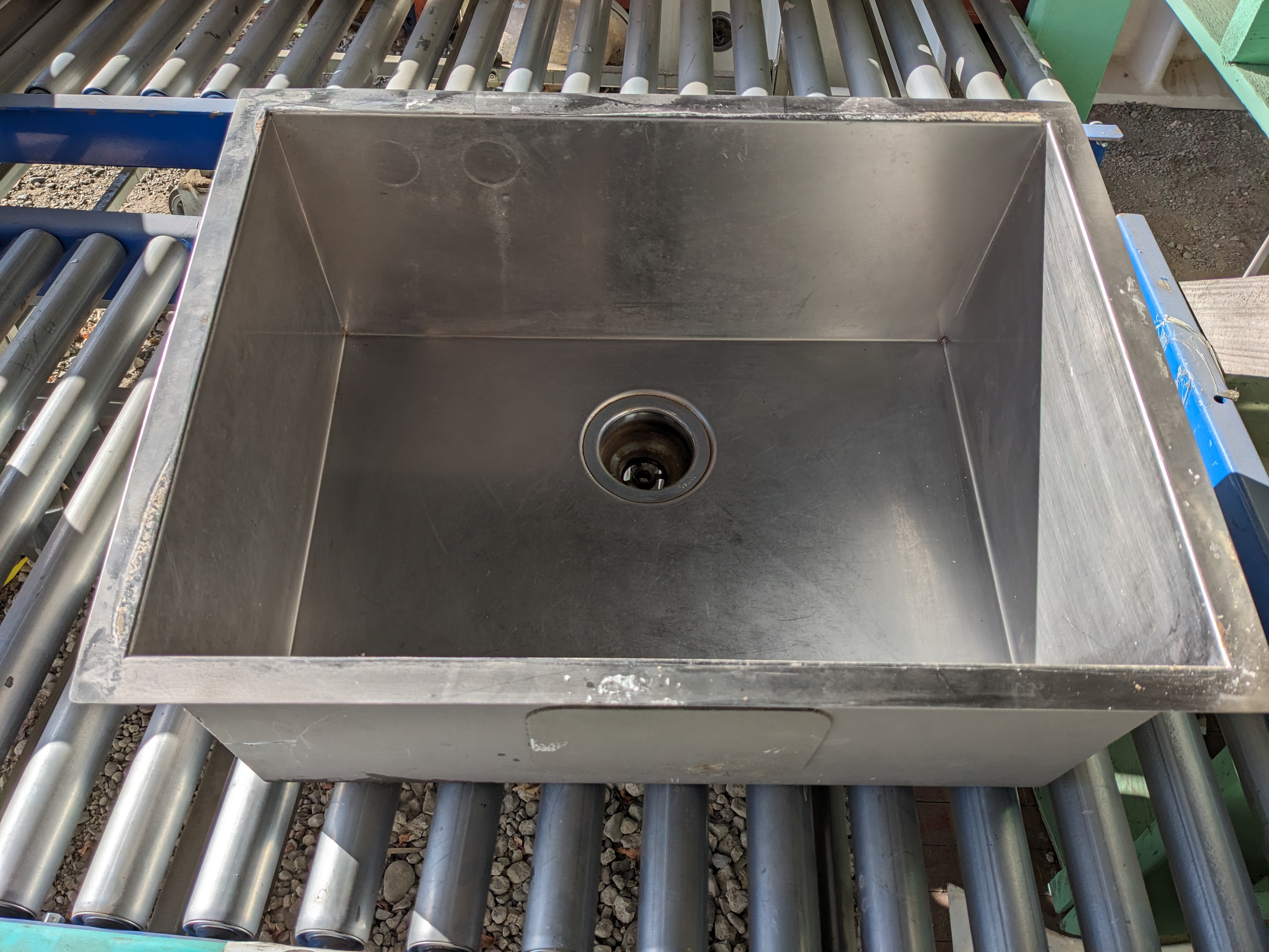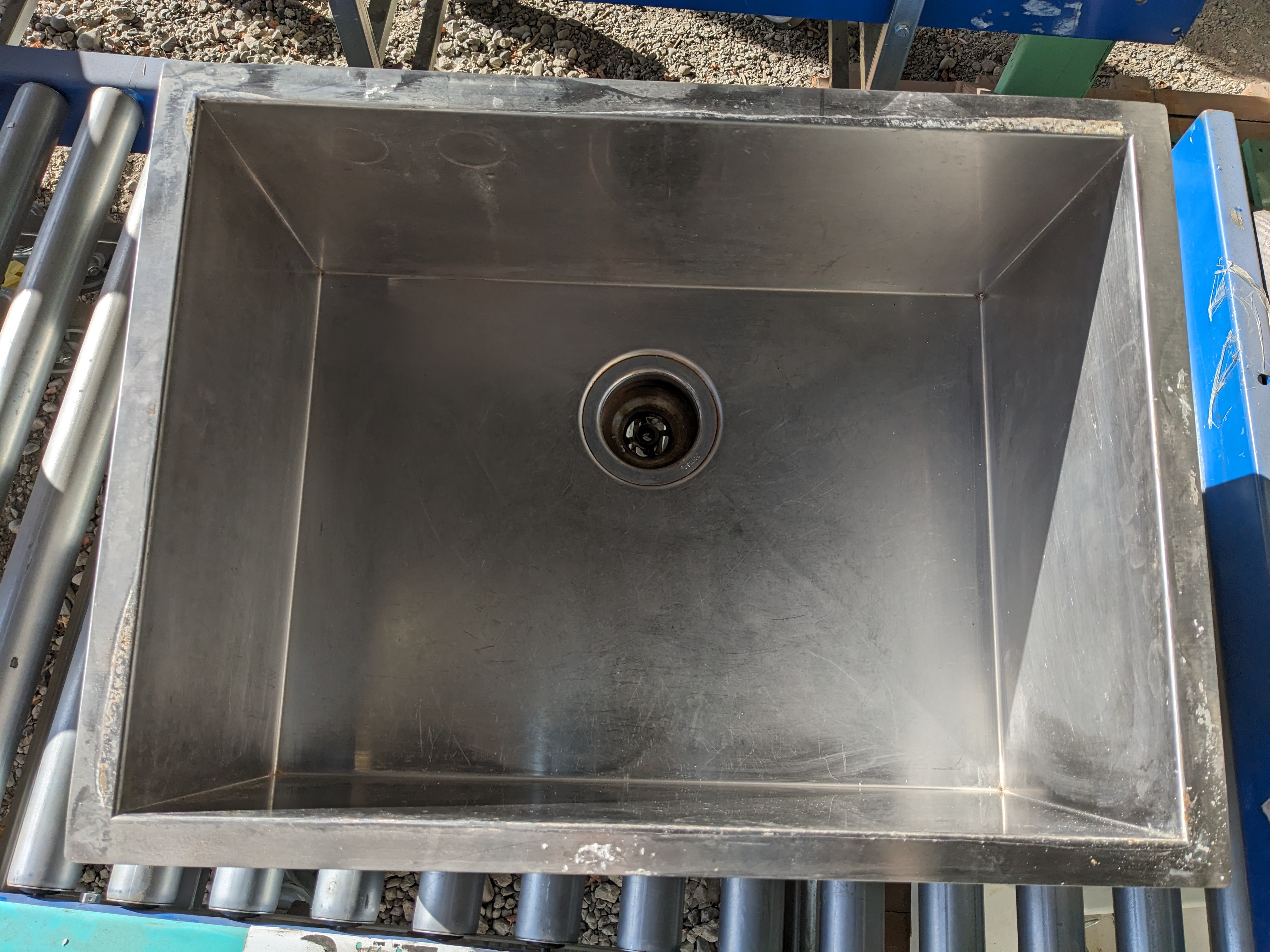 A simple single basin stainless steel sink. This sink is in great condition, though the coating on the underside is a bit worn. This sink comes with a drain cover/food catch, and measures 24 x 10 x 18 inches.