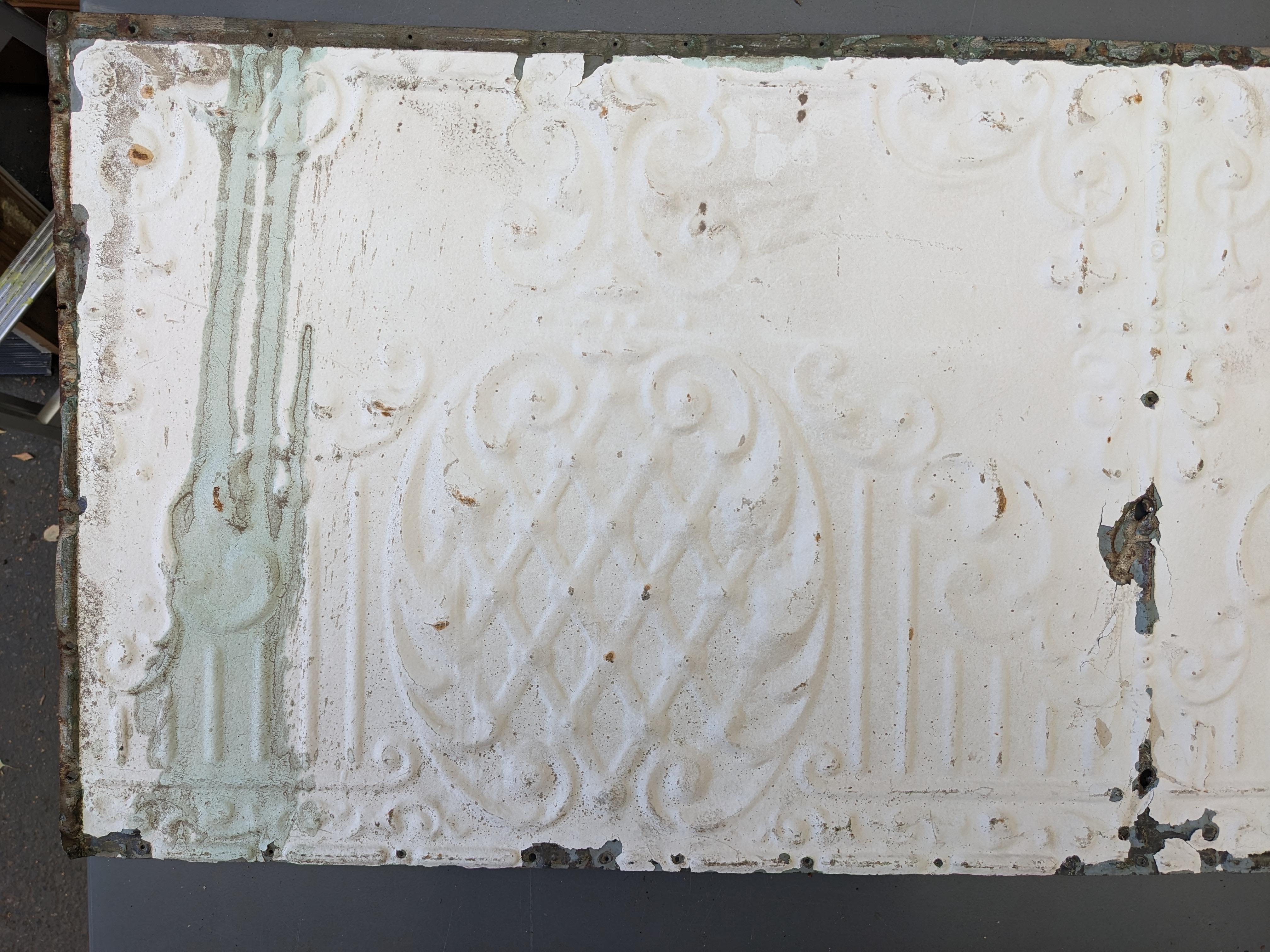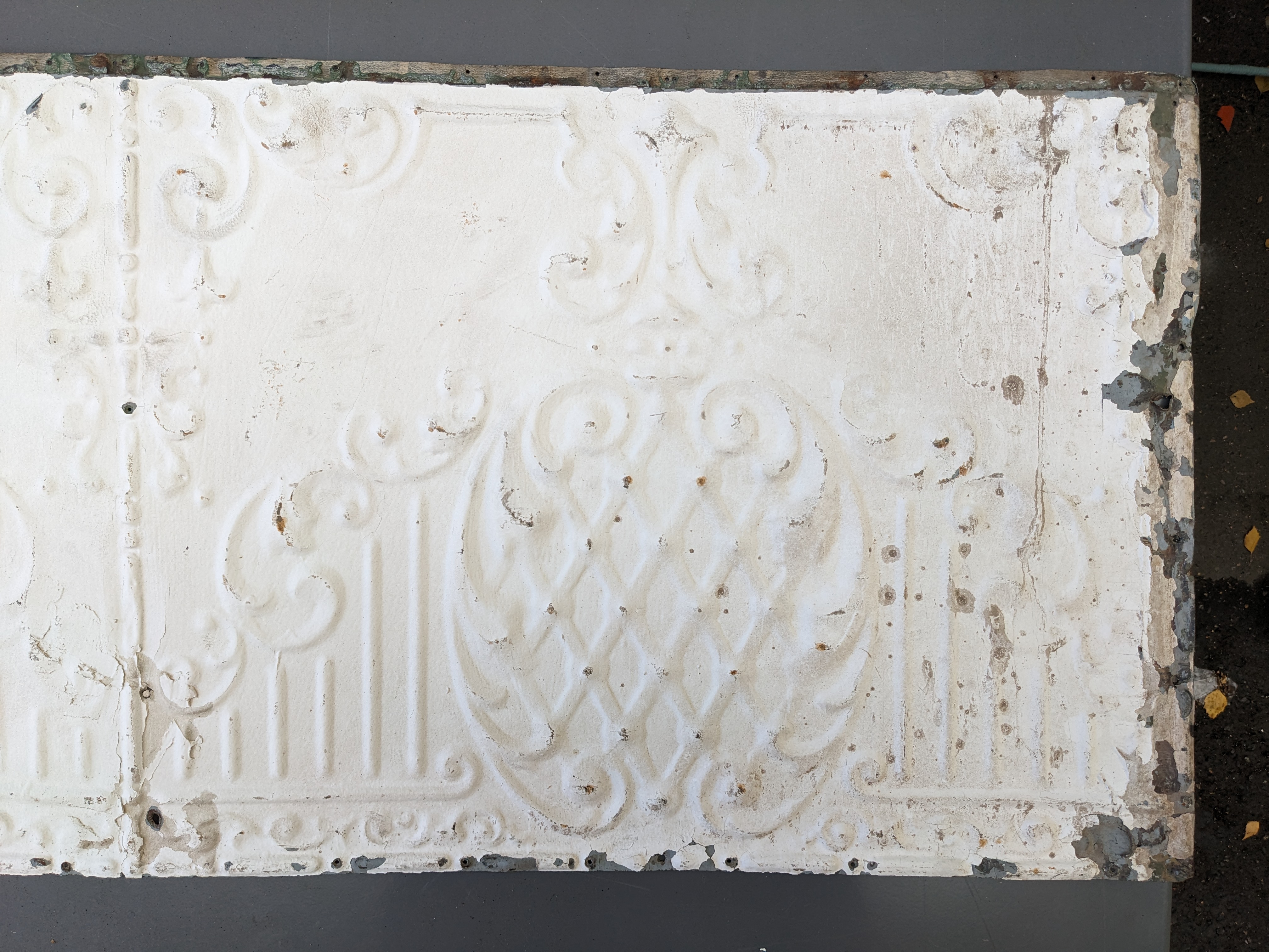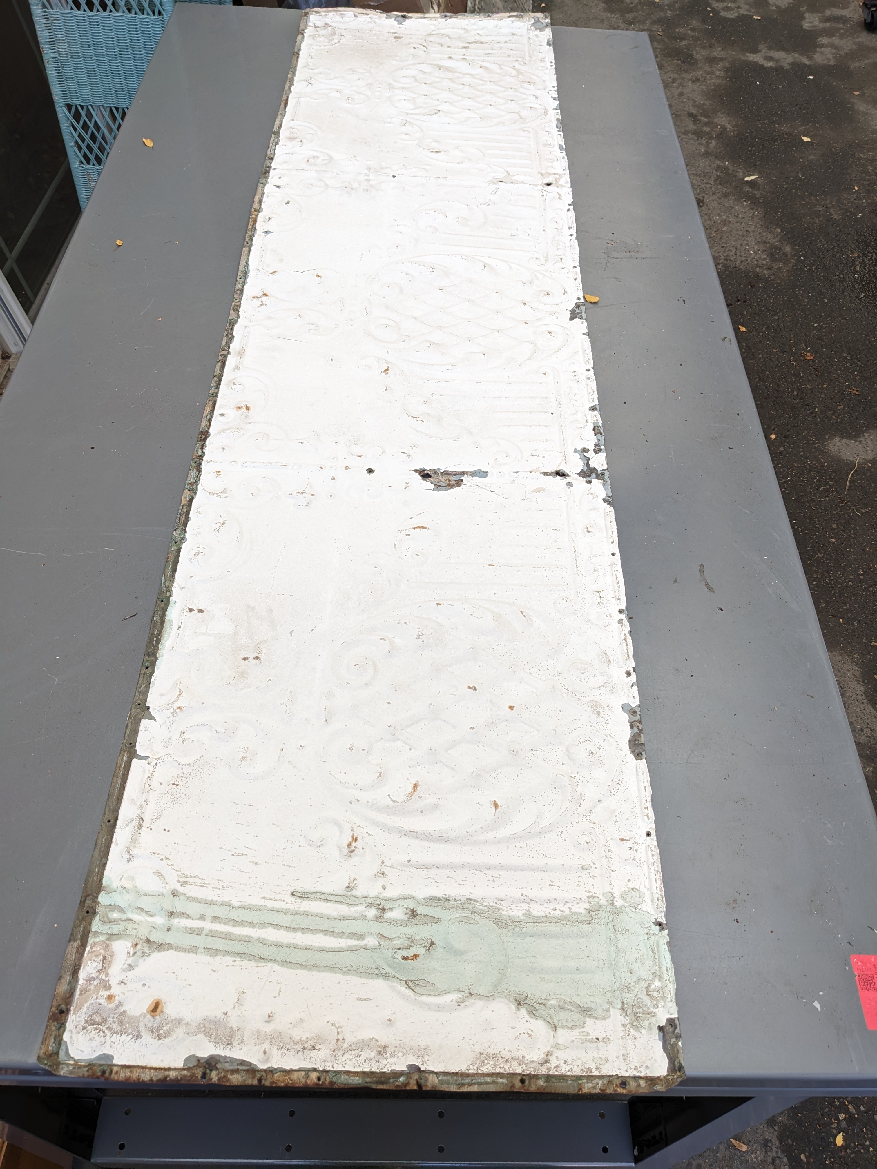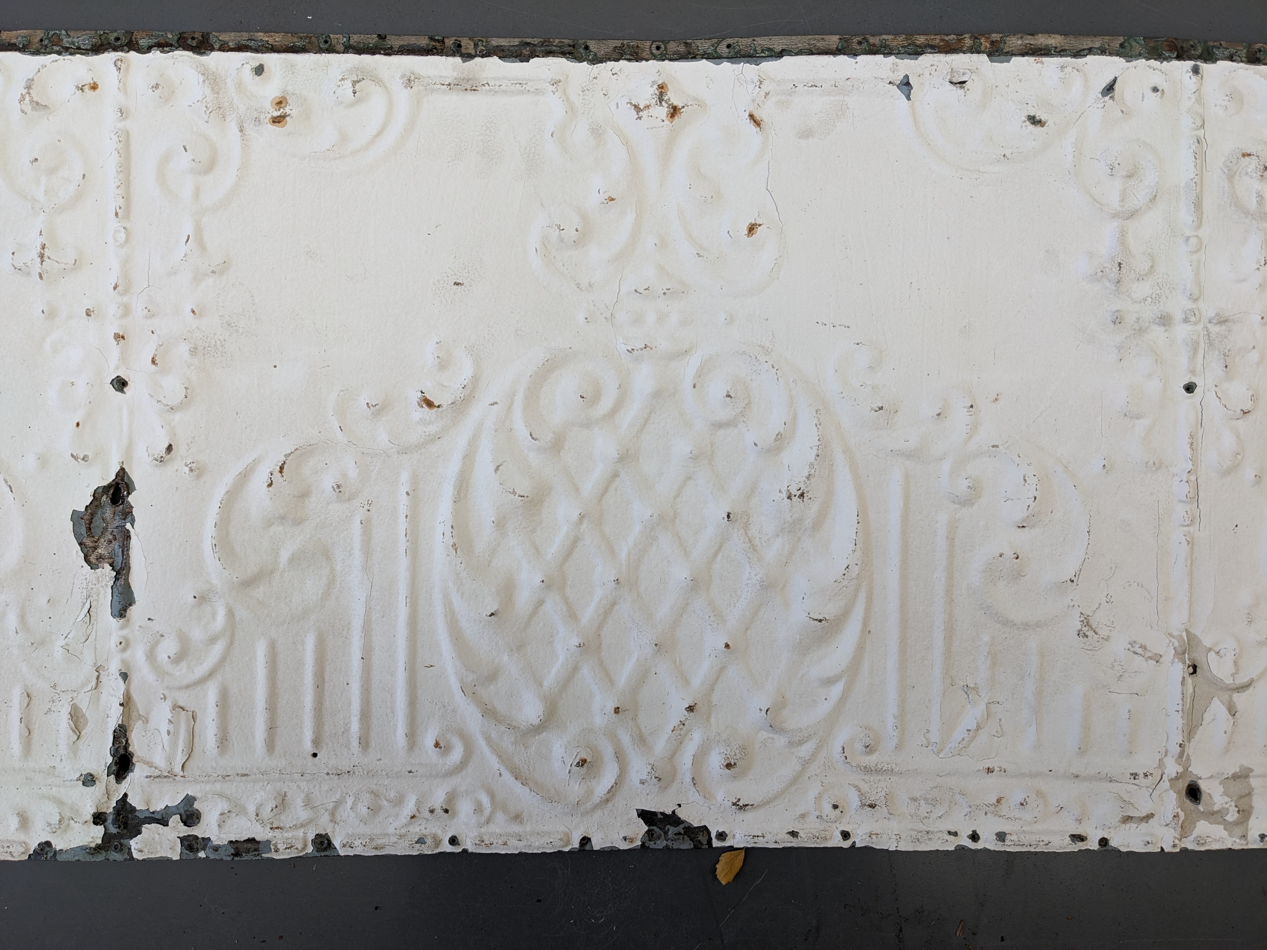 This tin ceiling tile measures 72.5 x 18.5. It is painted white with a small section of light green. with an ornate floral Victorian plate design. It has wear from age and previous installation and some small holes are present.
