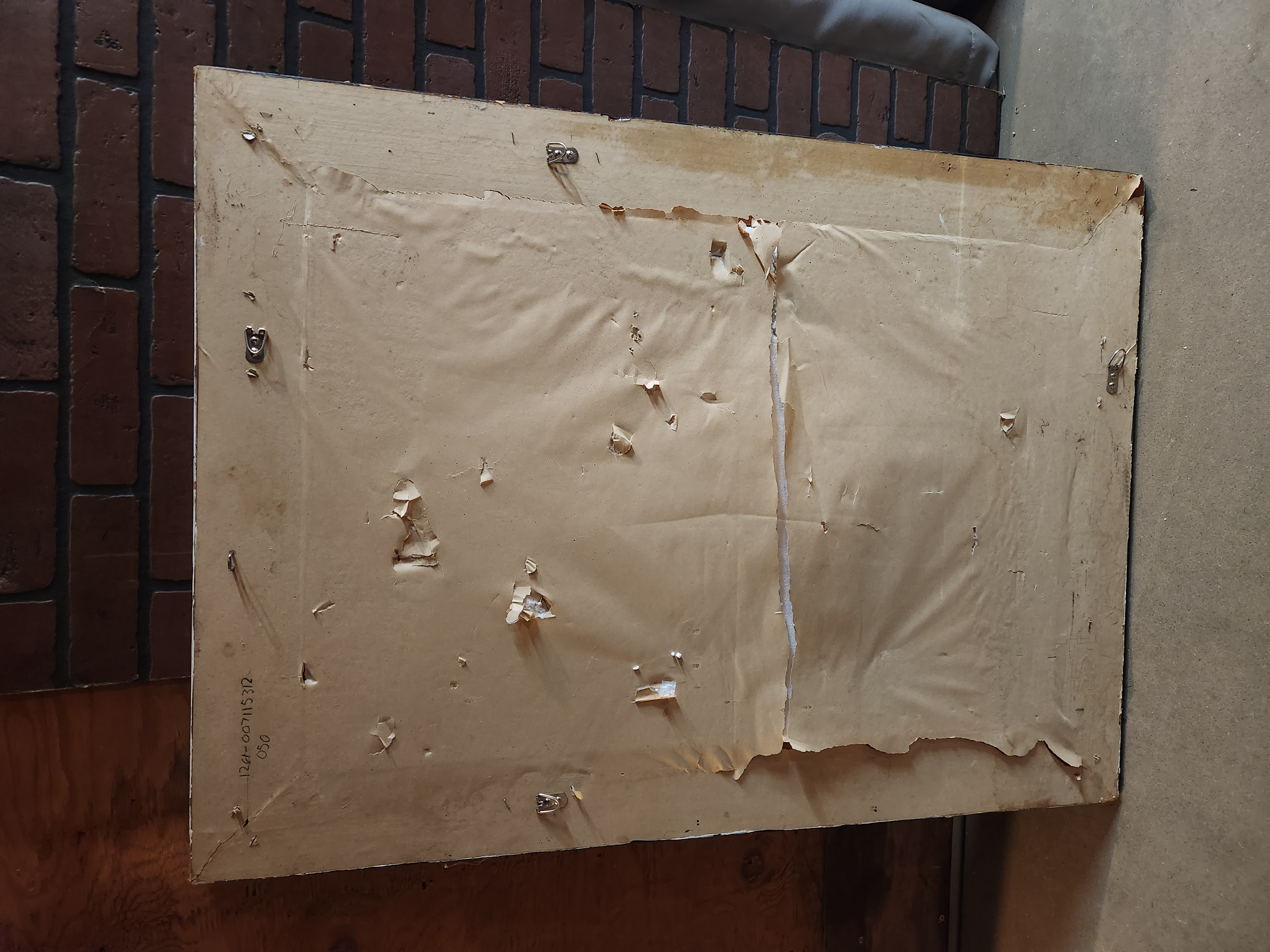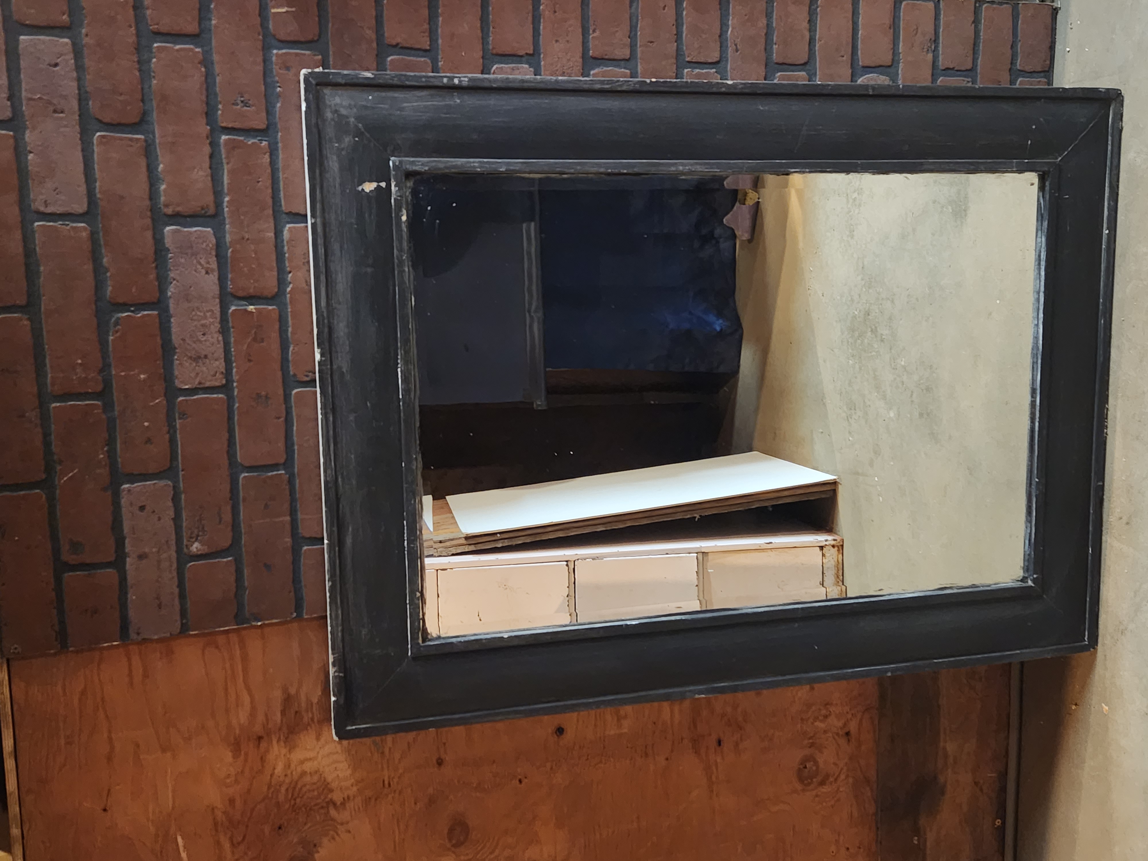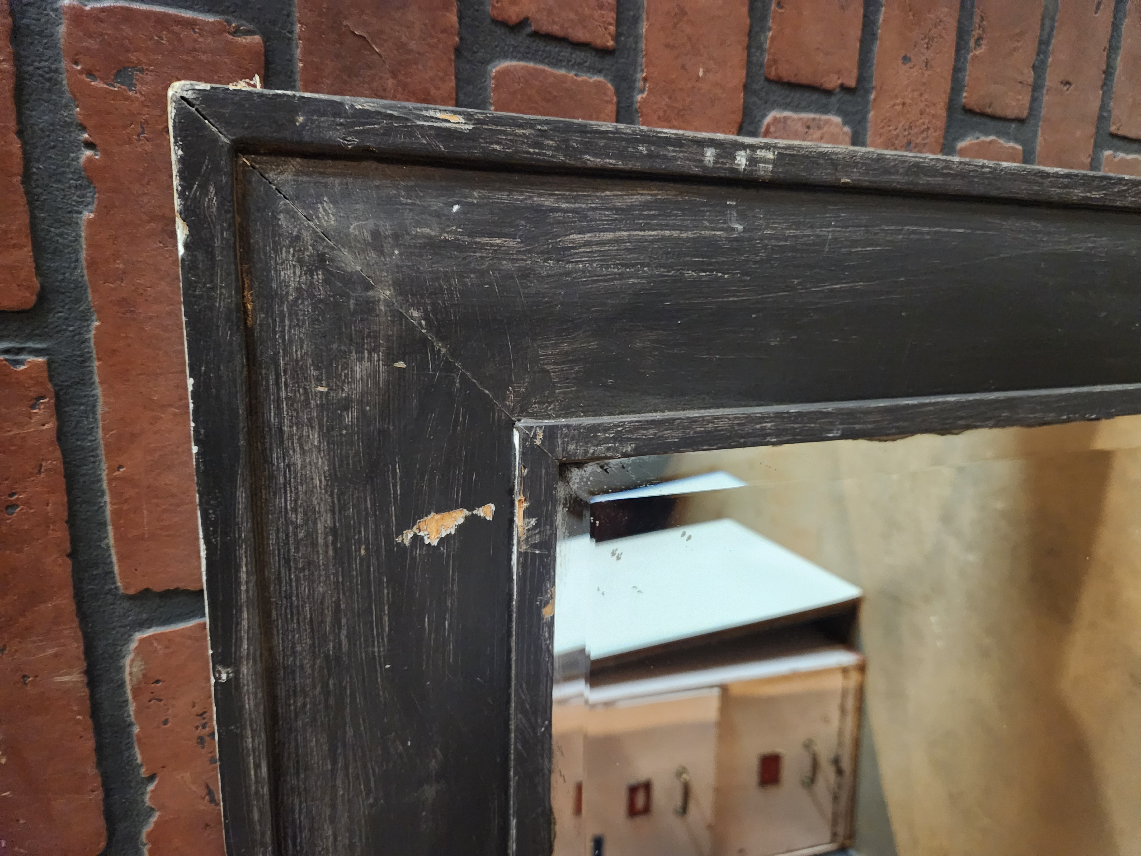 Large beveled mirror with a poor paint job. The face of the frame appears to be wood with a styrofoam backing. It has a couple dings in the frame.