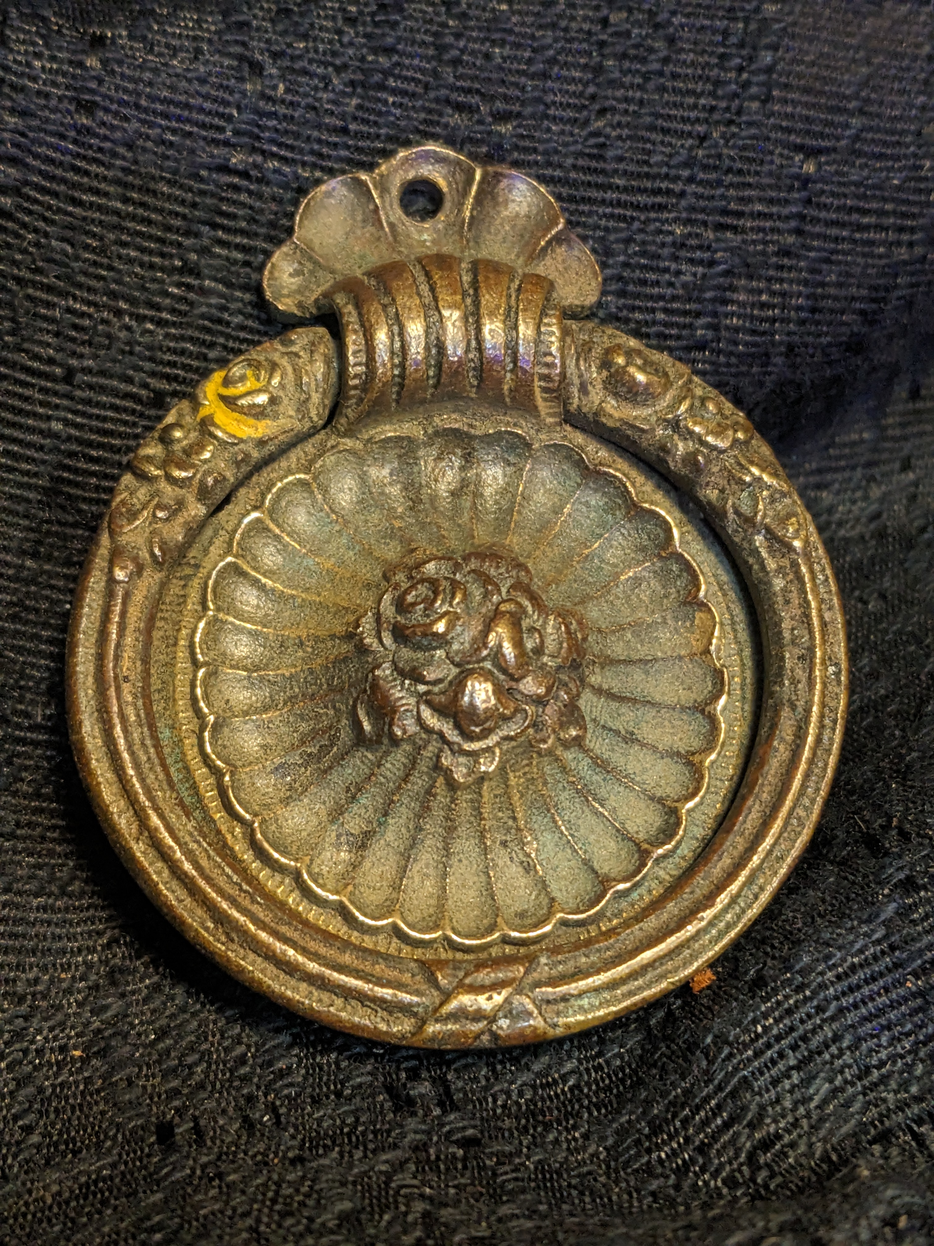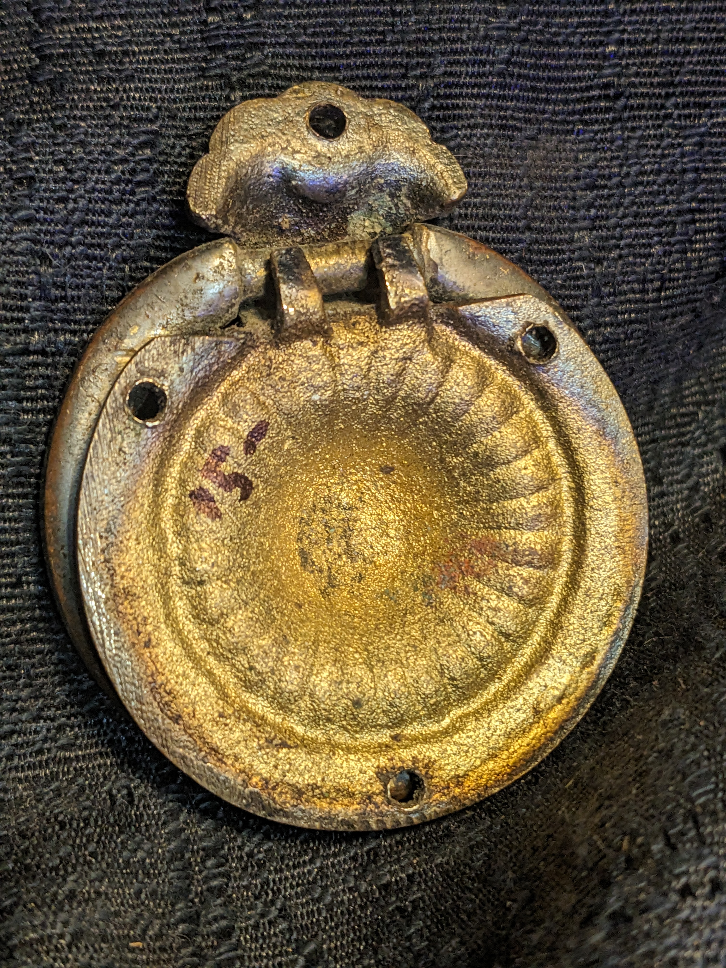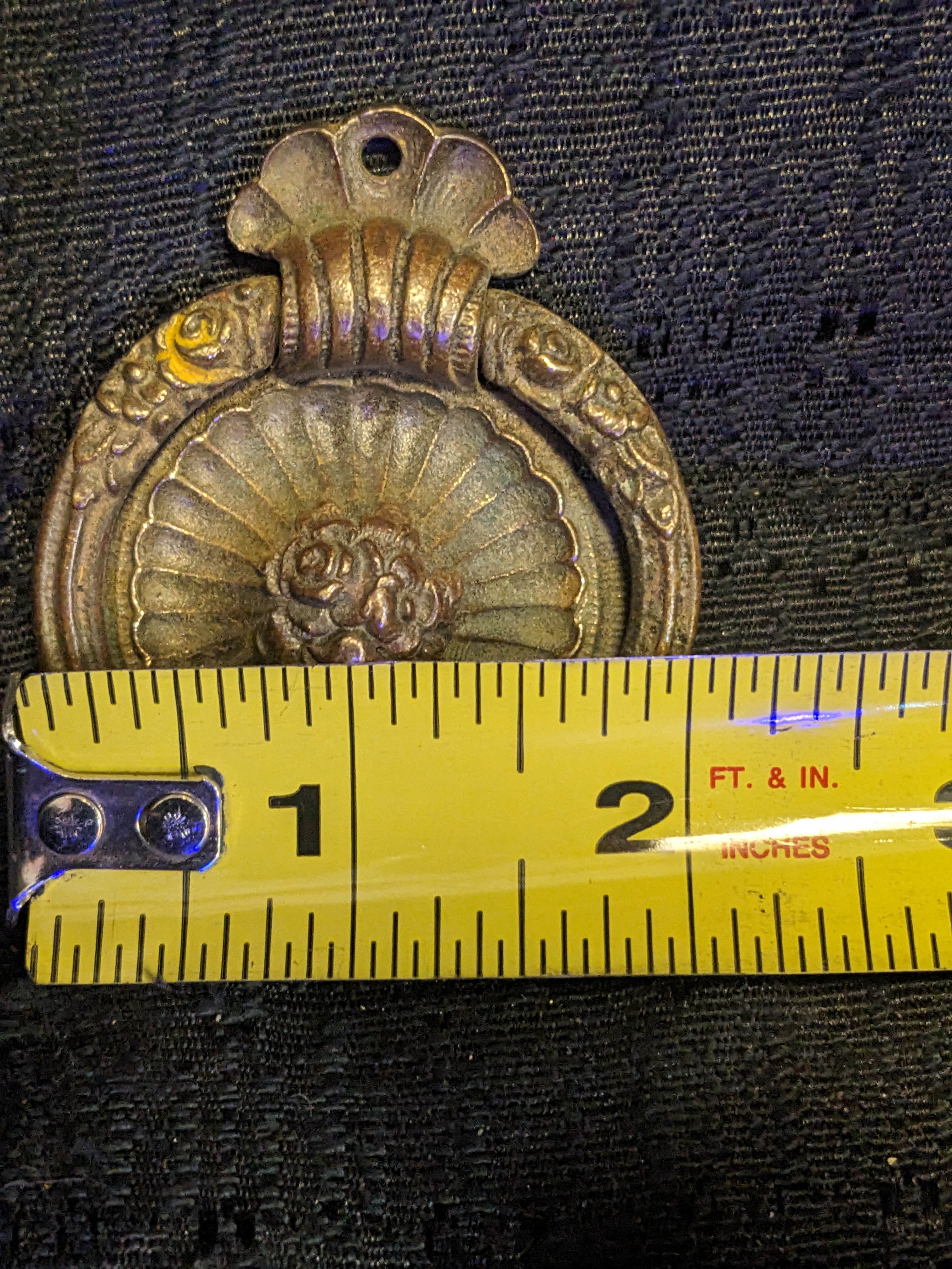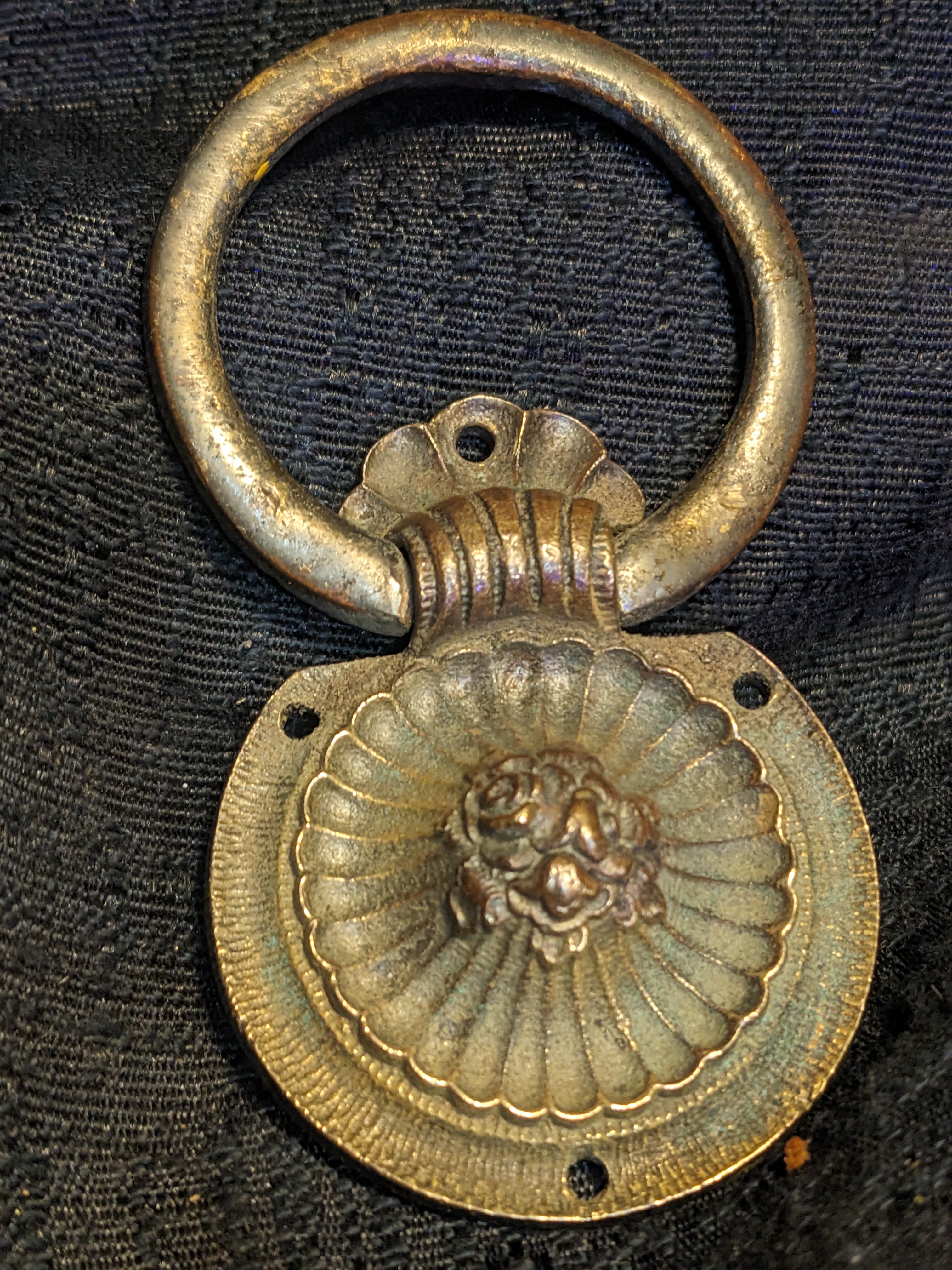 2" decorative cast Brass Ring pull. Circa 1900, this guy is attached by 4 brass nails/tacks or tiny screws. Does not go through the drawer face like most hardware does.