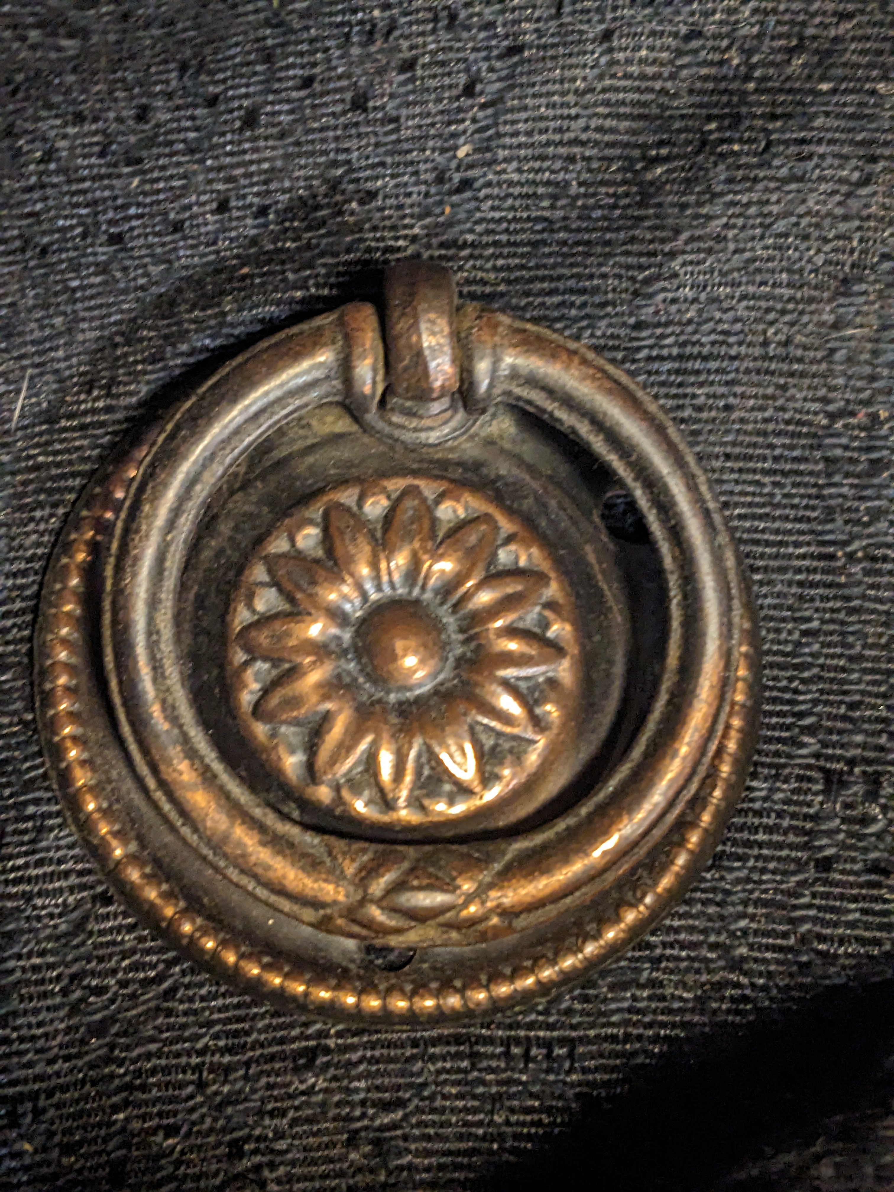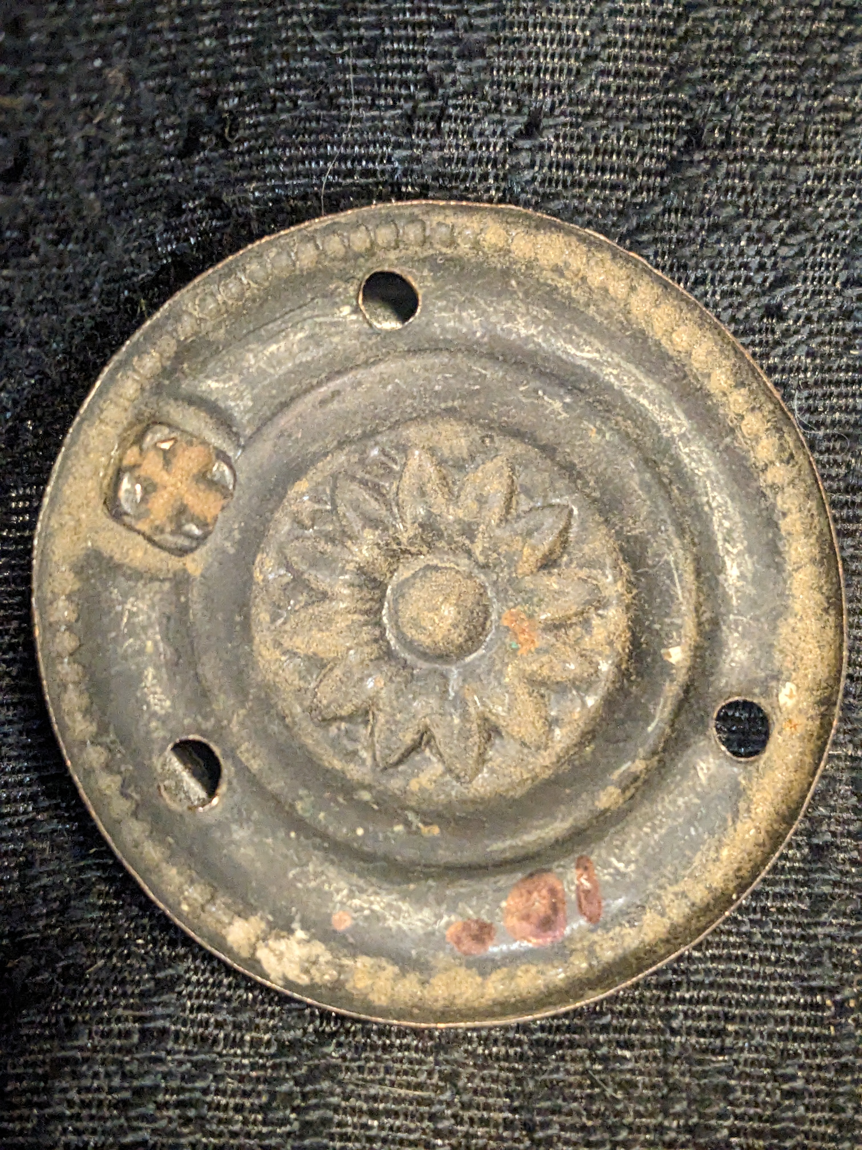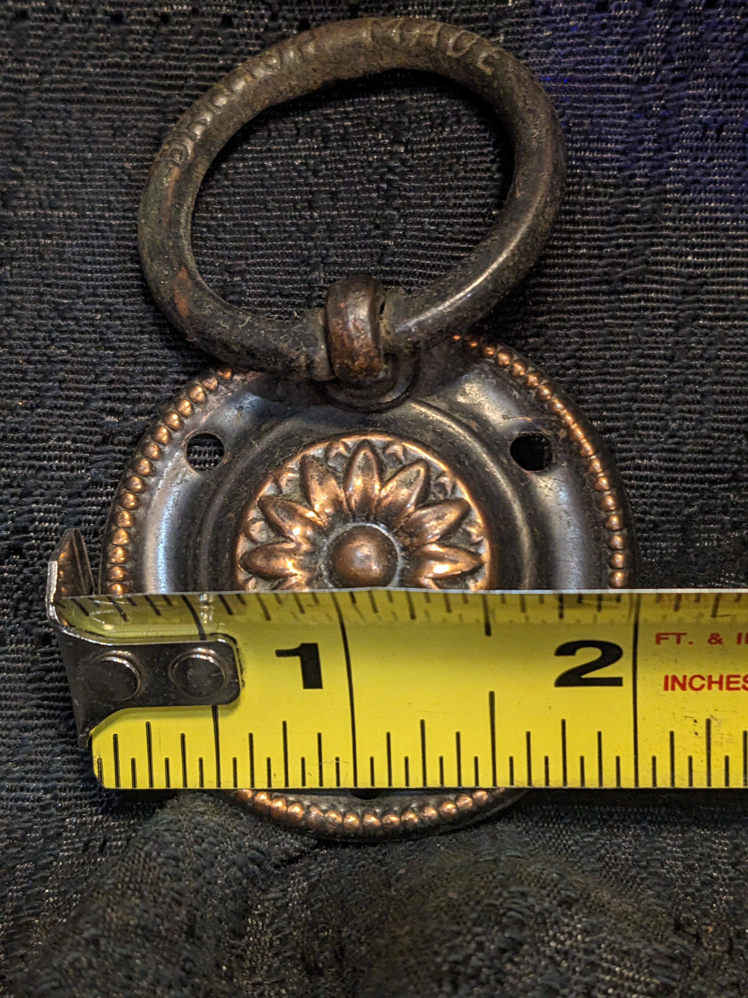 1" pressed steel with Japan finish (antiqued copper). Install by 3 small nails or screws.