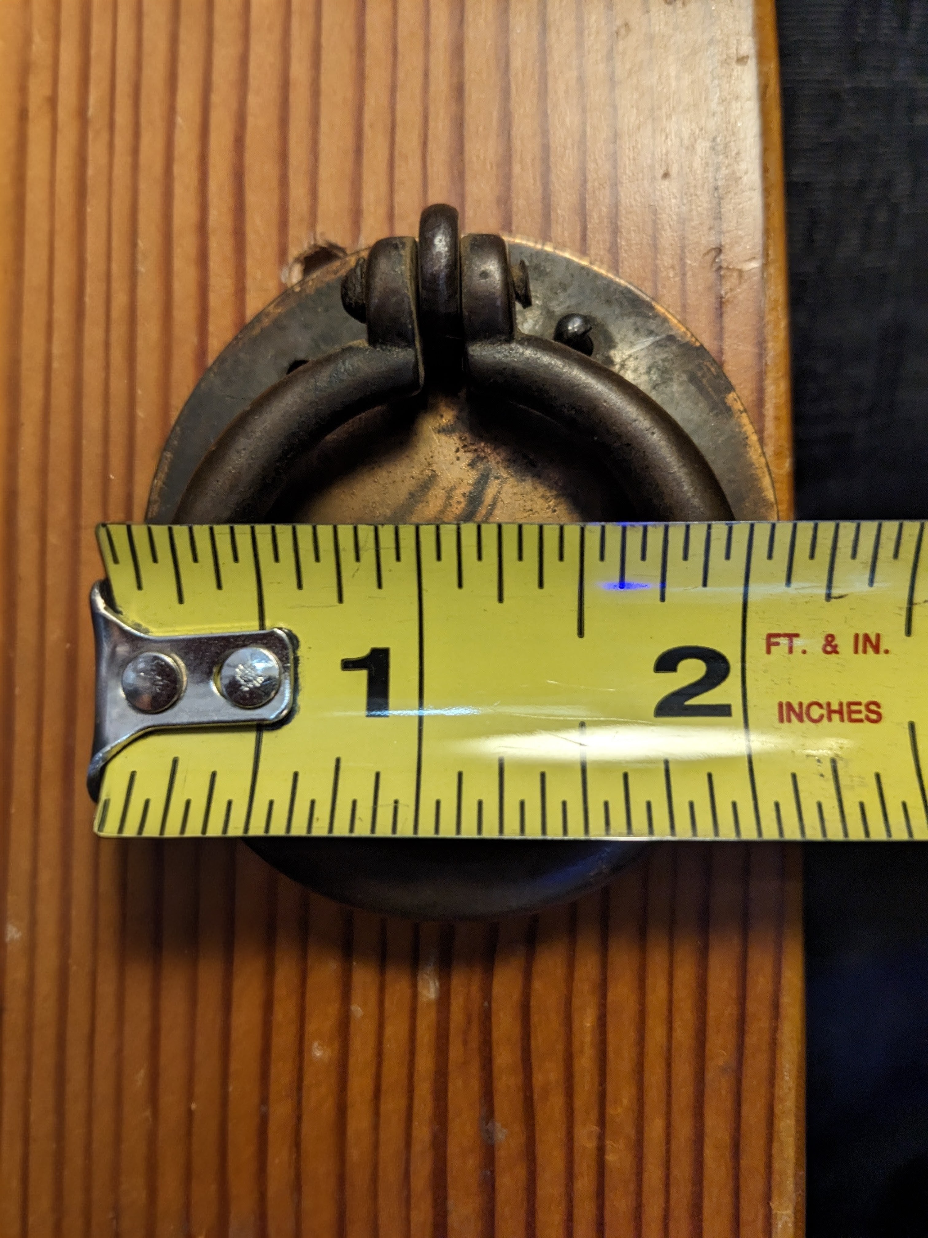 2-1/8" made of steel. The back plate is a pressed metal and the ring is solid cast. With a little bit of the antique copper finish barely visible still. These pulls attach with very small nails or screws on the surface of the drawer.