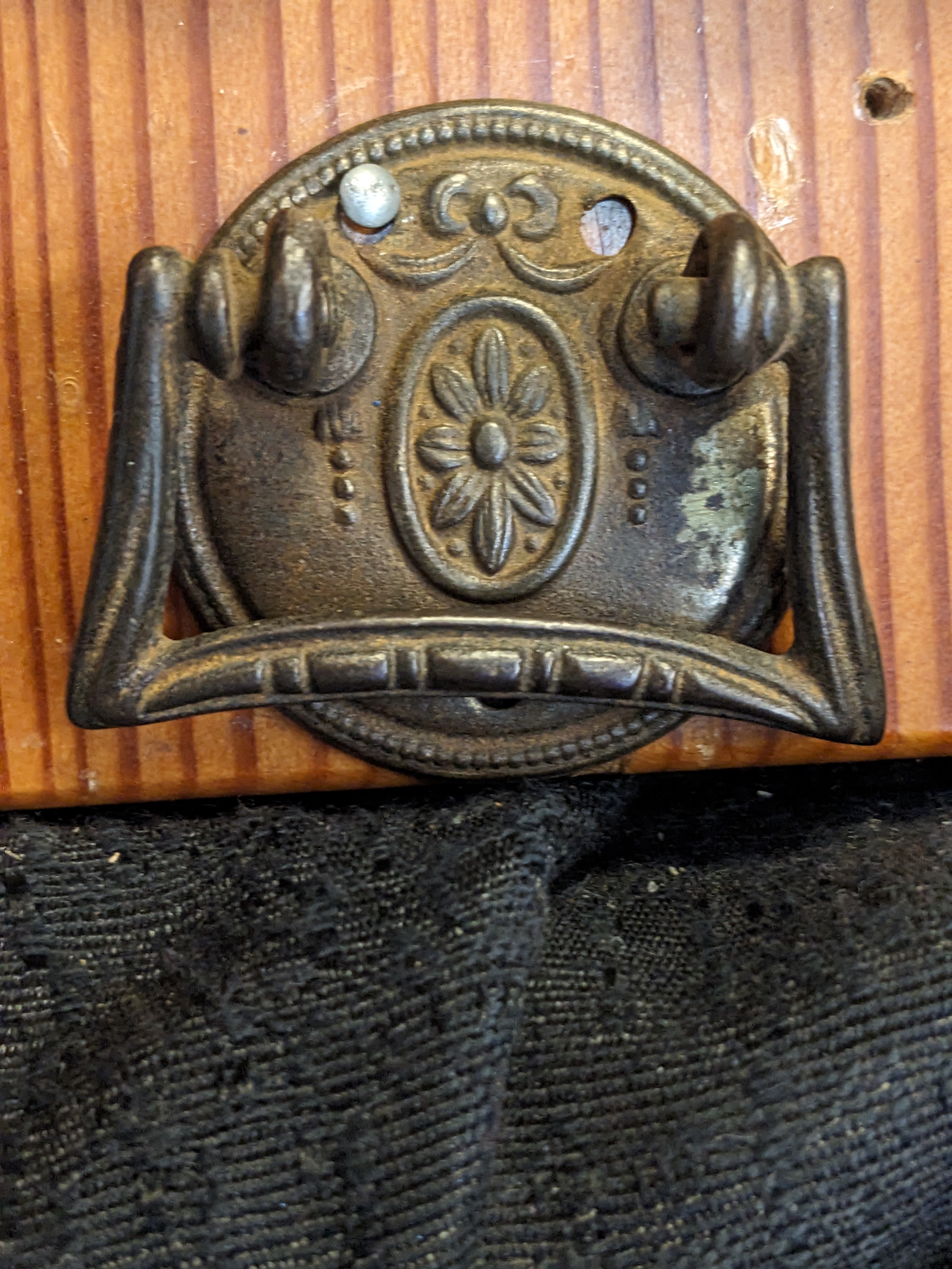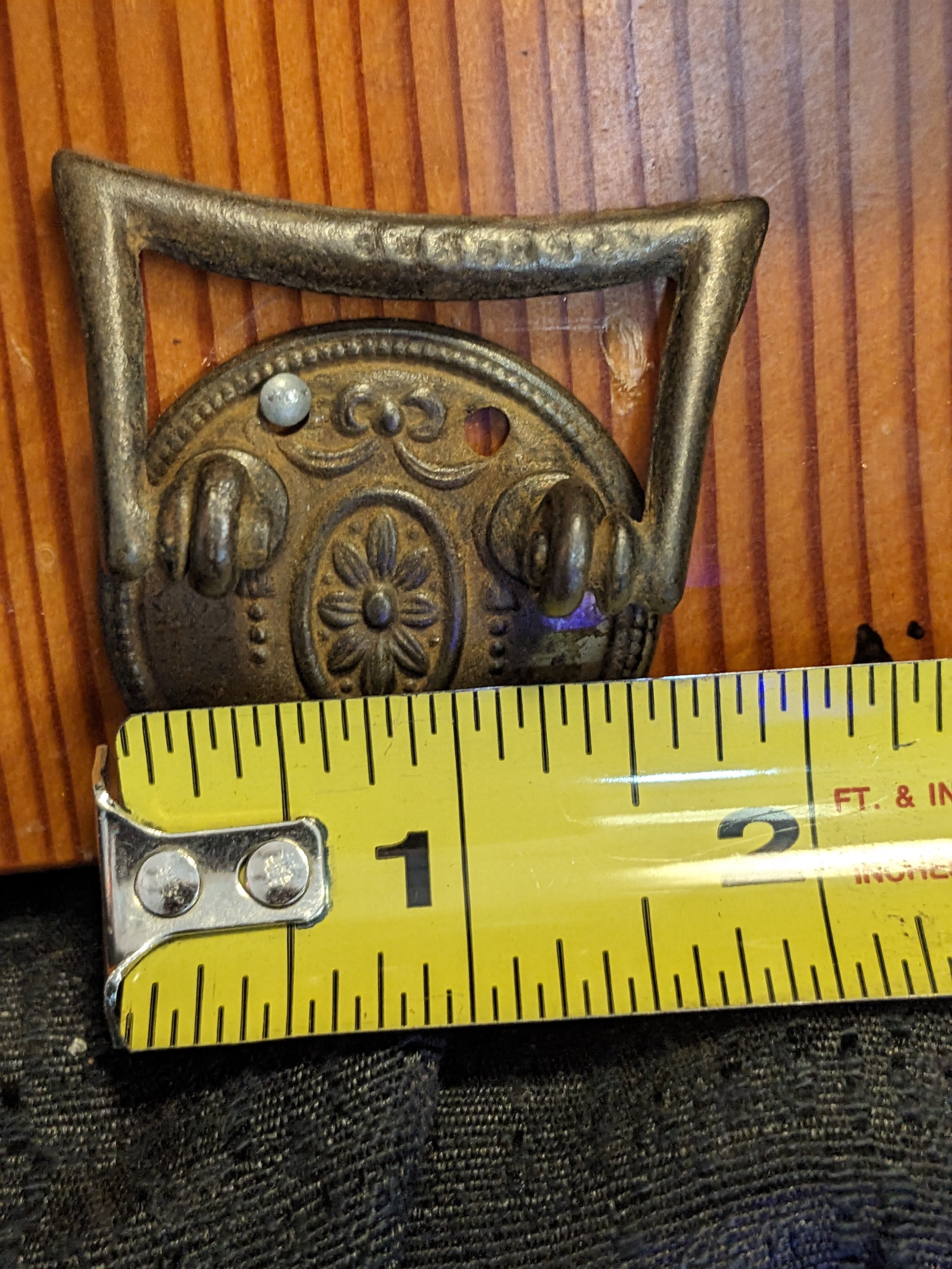 1-1/2" made of steel, back plate is pressed metal and the ring is cast solid. Attached to the drawer face with 3 small nails\tacks or screws.