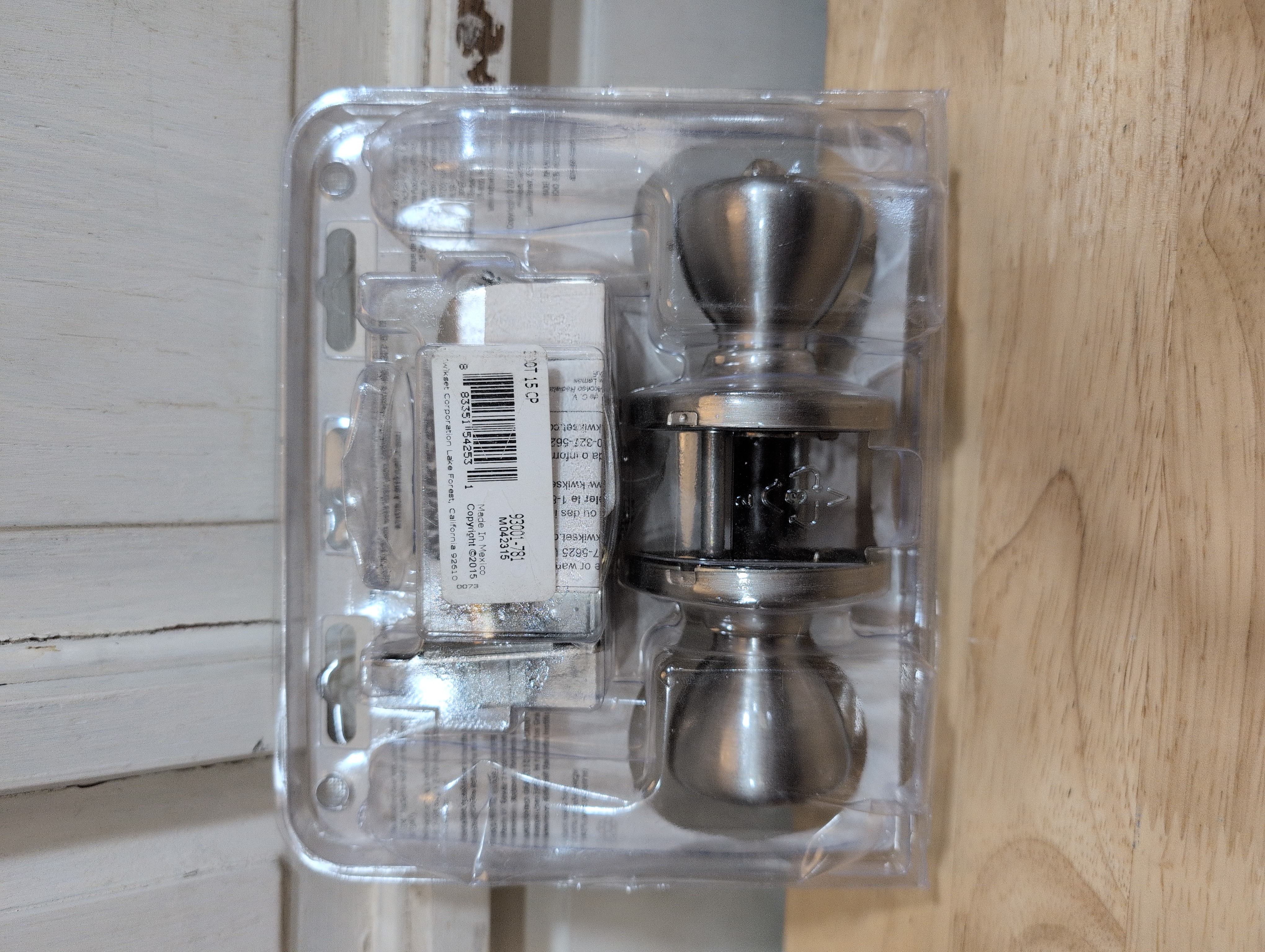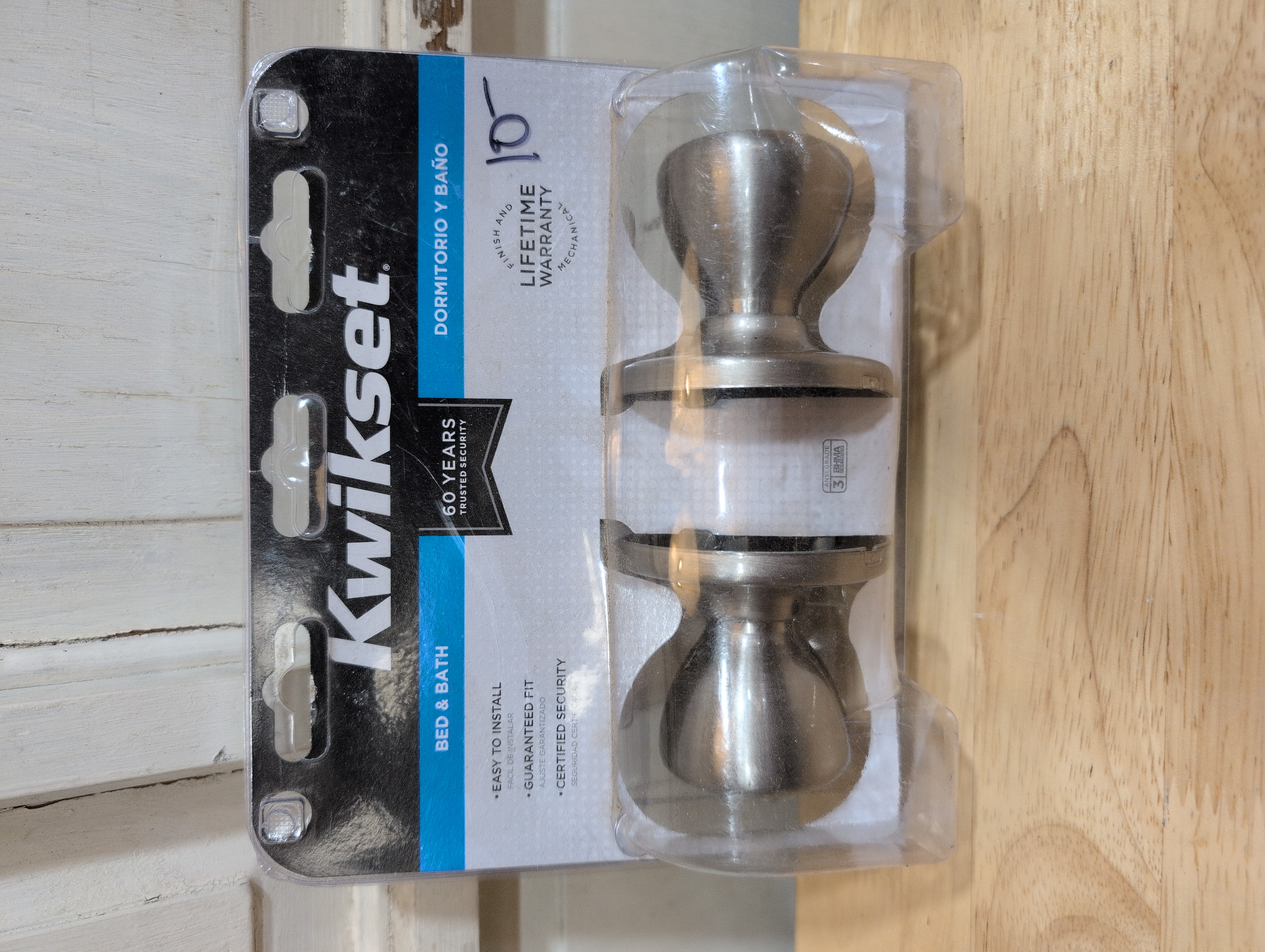Never installed/opened bed or bath door knob set with one way lock from Kwikset.