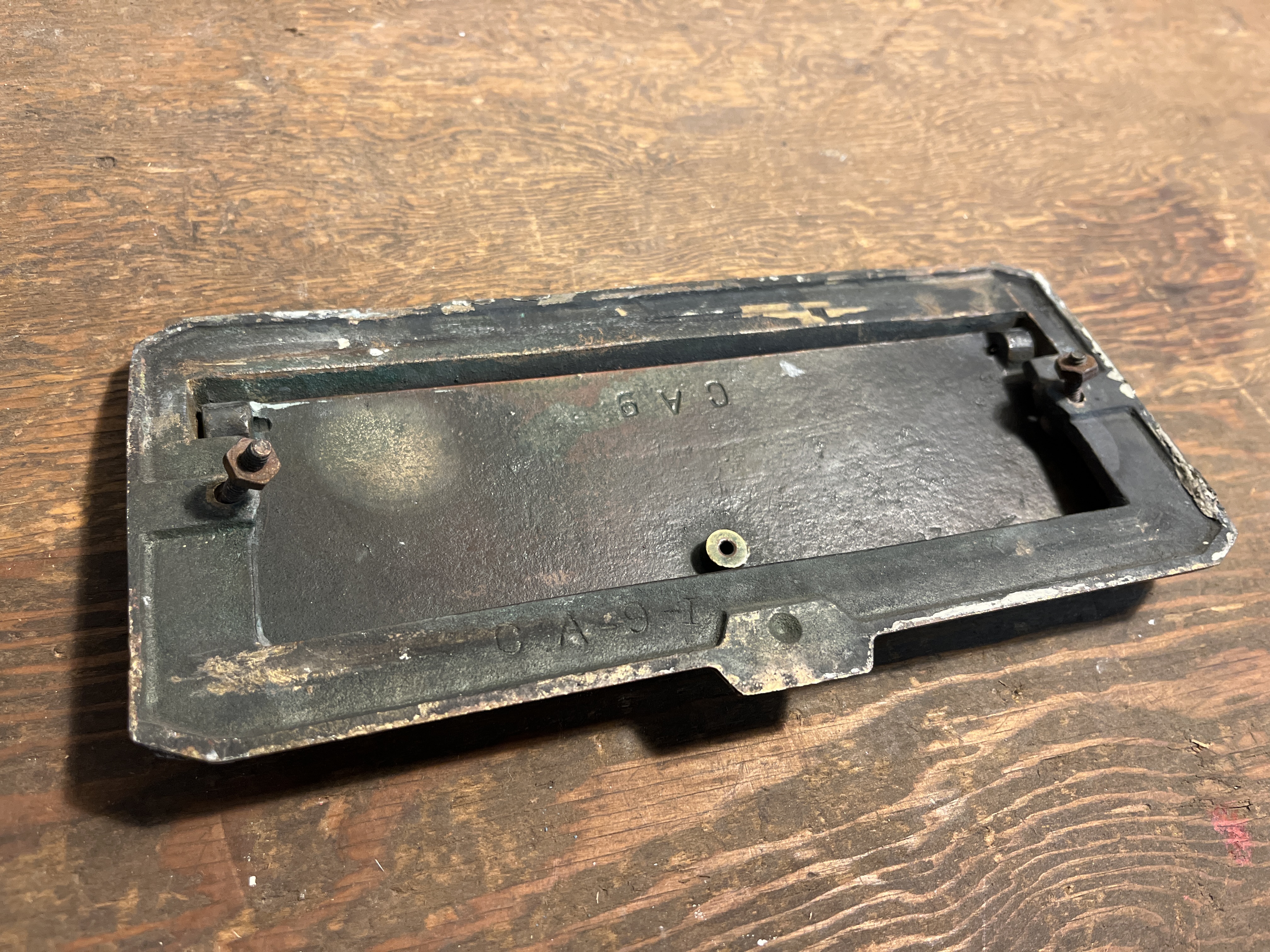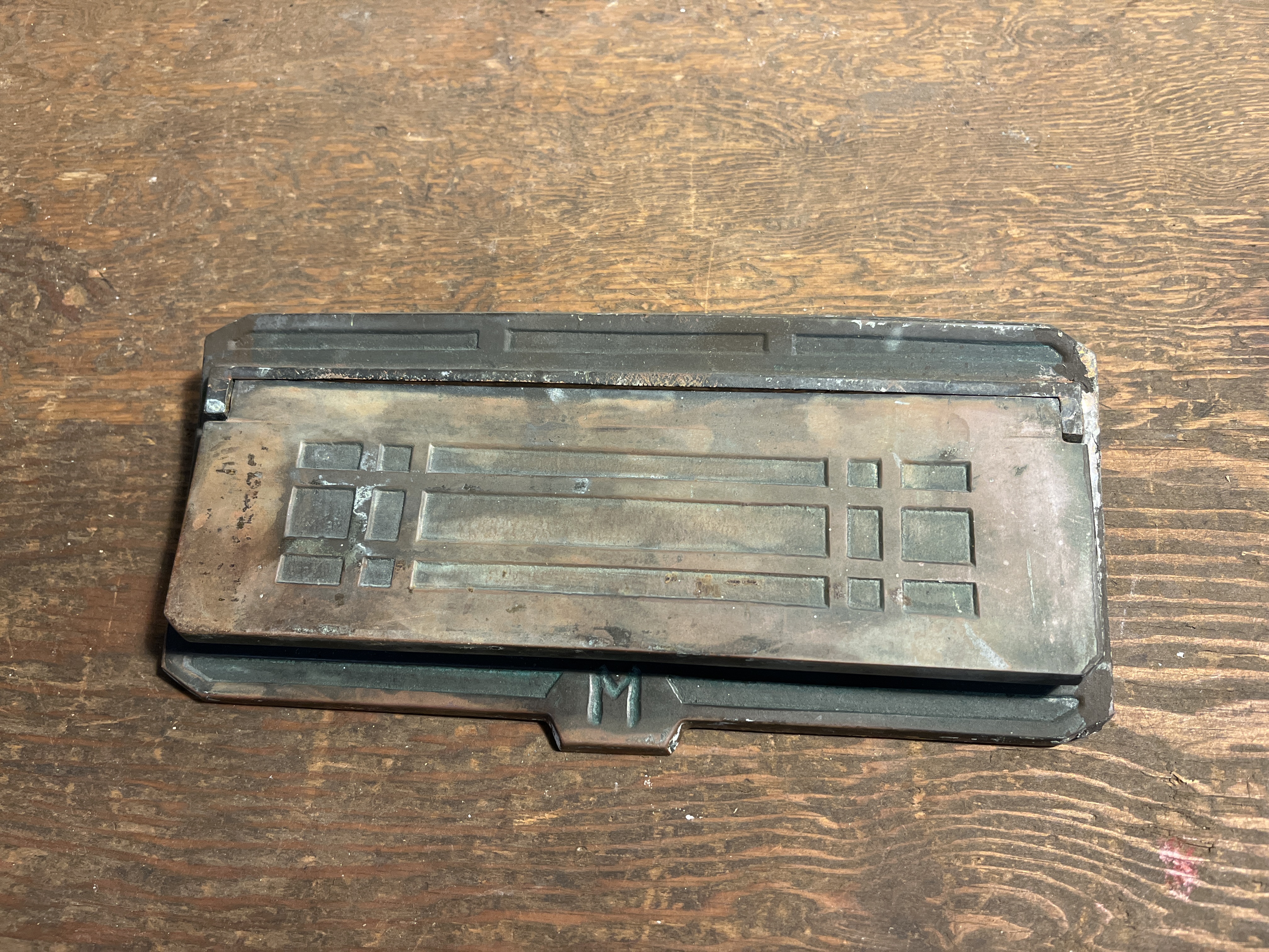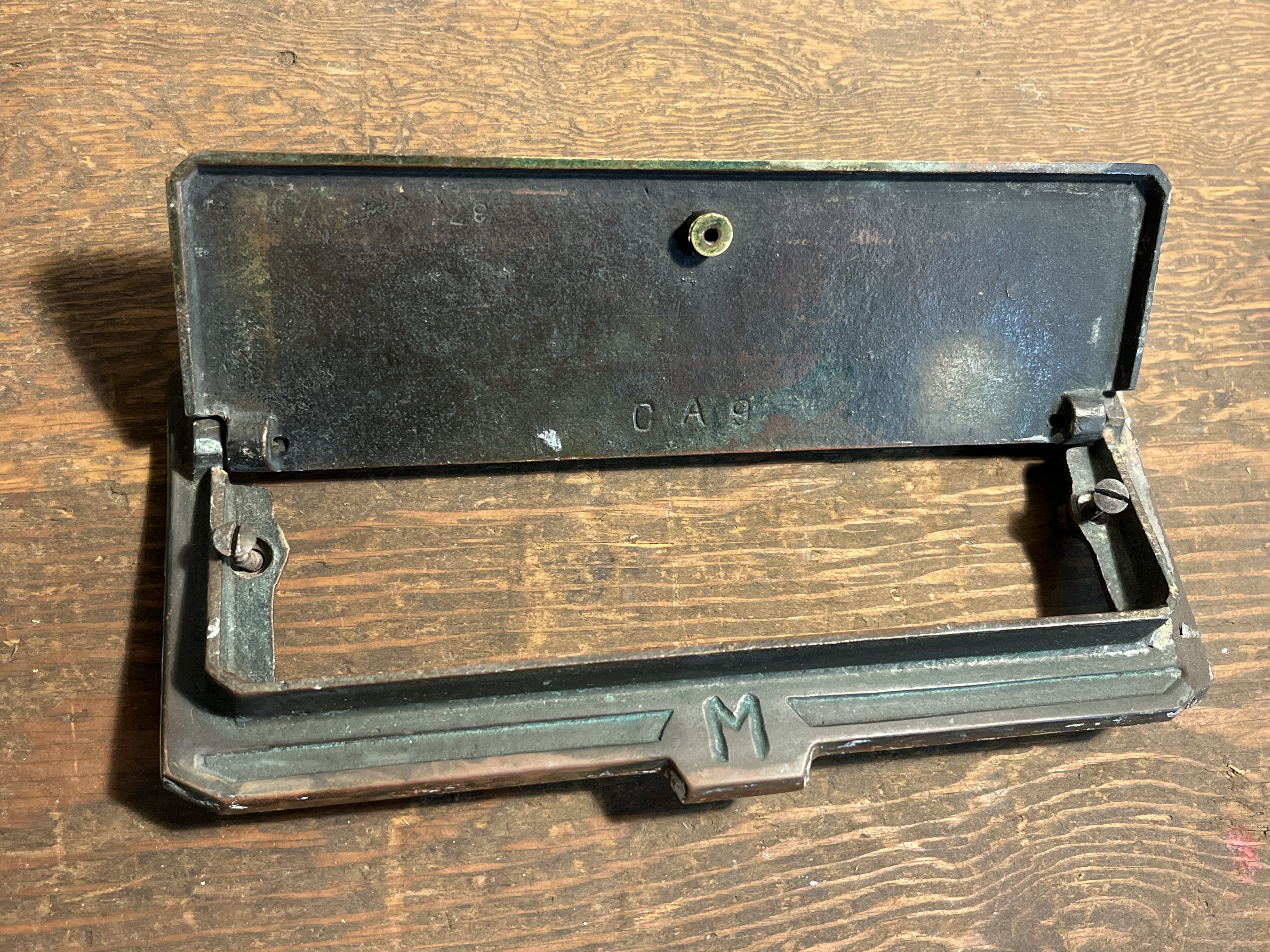 A sweet vintage mail slot cast from a non magnetic metal, could be bronze. The styling is a mission style, with an M cast into the bottom. Looks great as is, just needs a pin to swivel on for one side. Measures 8.875 x 3.875 x 0.75 inches.
