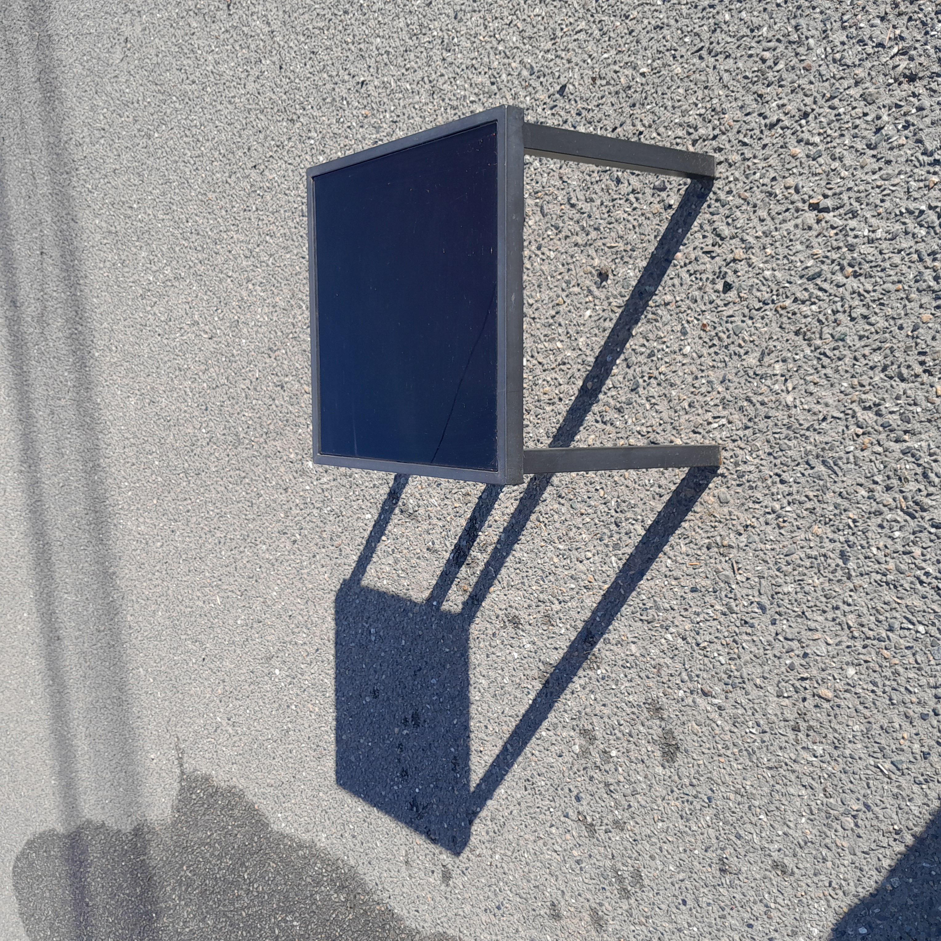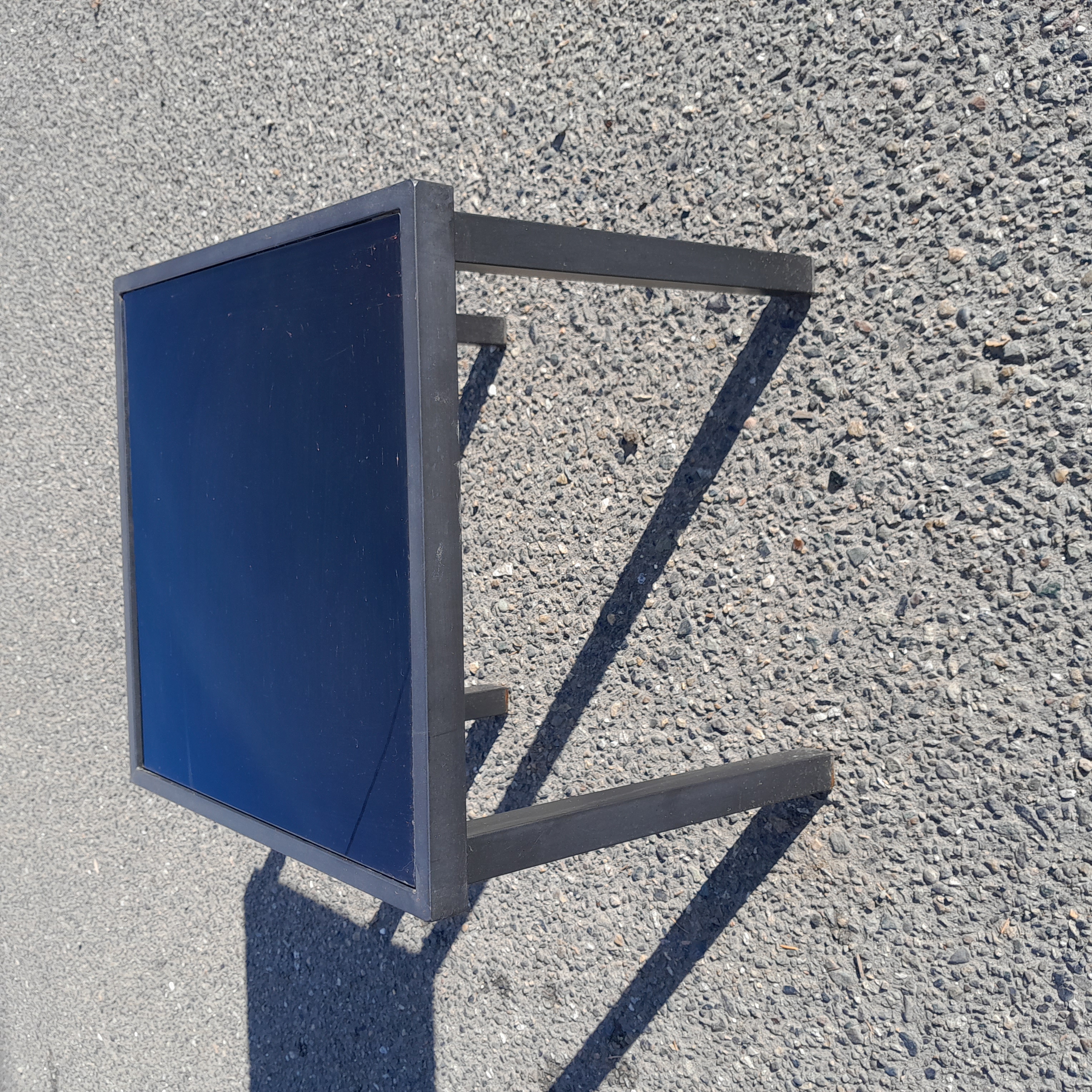 Small black square patio table 17.5 x 16 x 17.5. Sturdy steel frame with a black tinted glass top secured to the frame with suction cups.