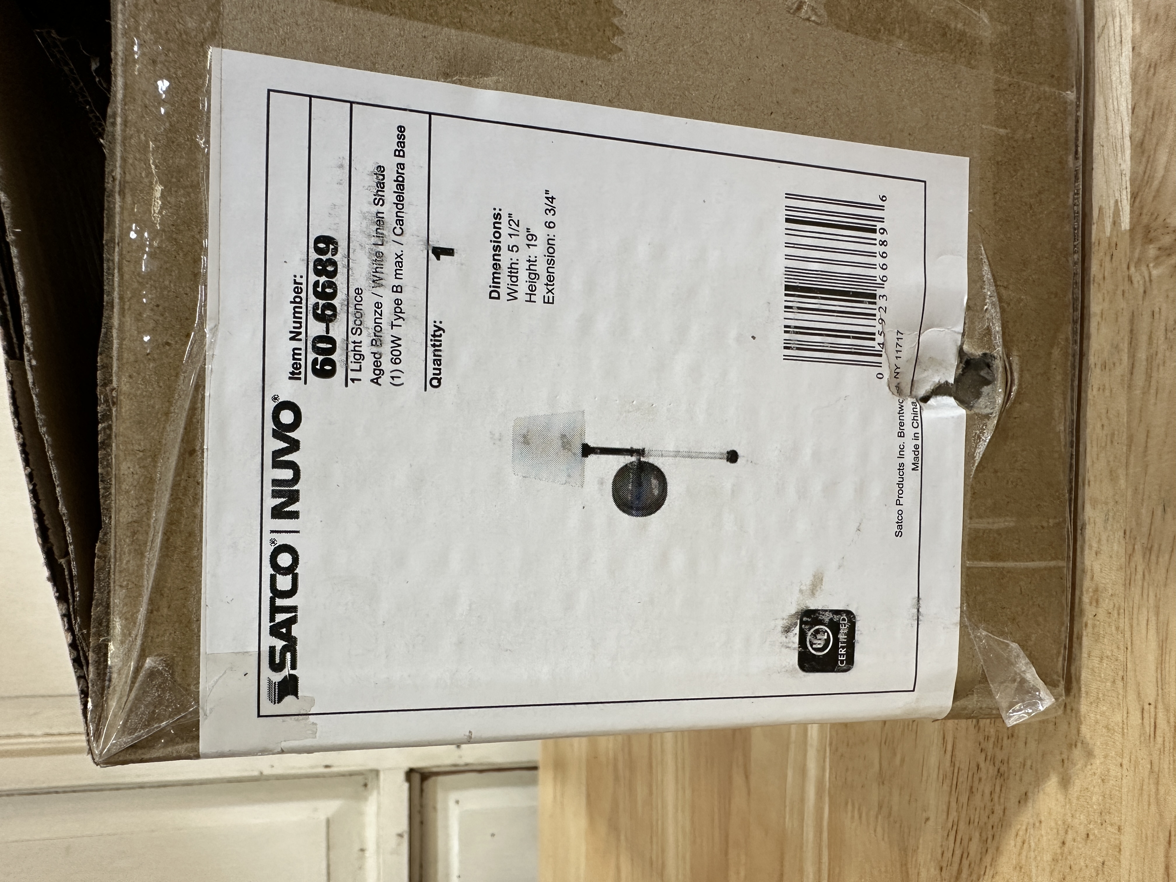 New in the box Satco Olmsted acrylic and aged bronze sconce with white linen shade.