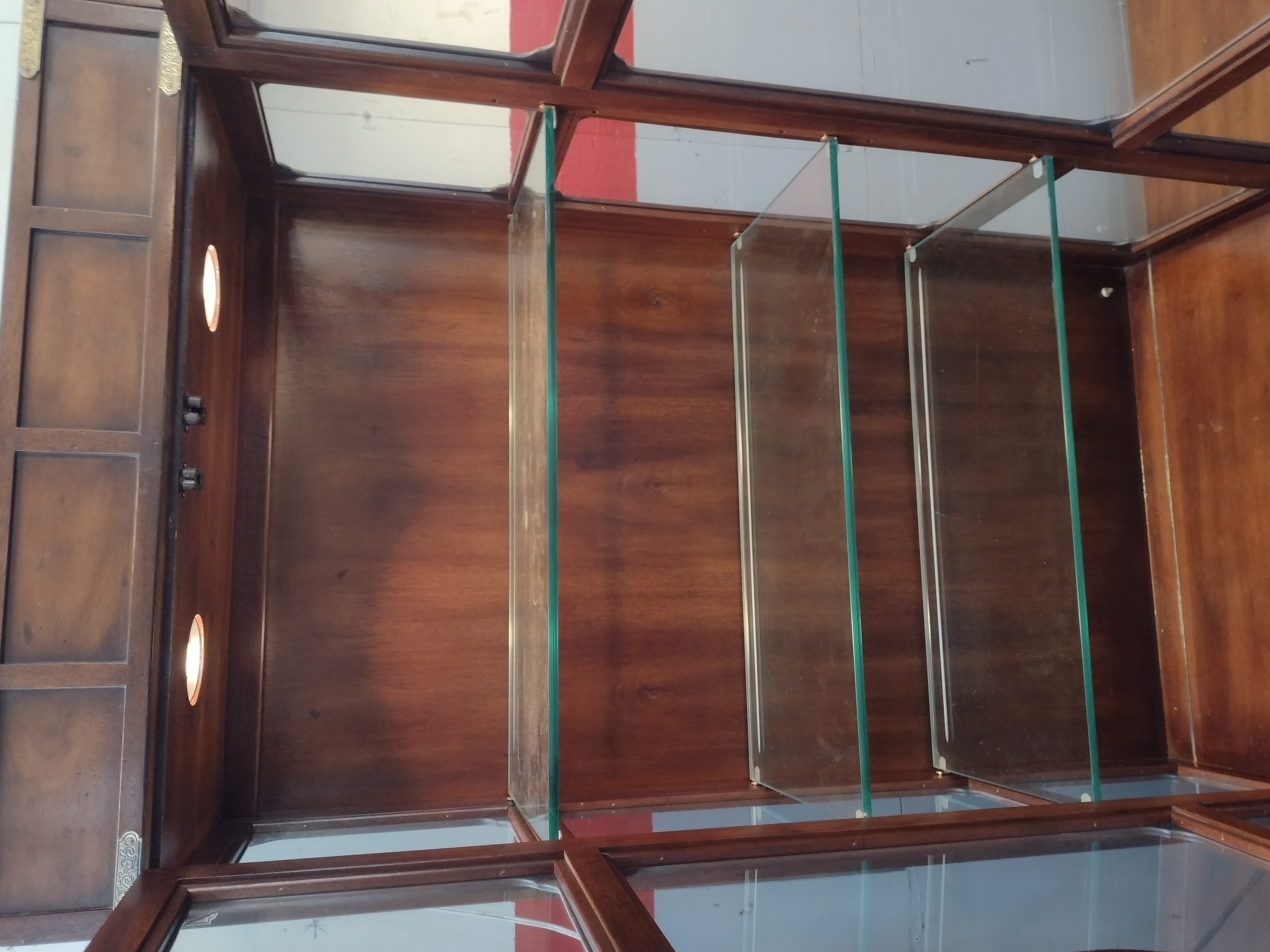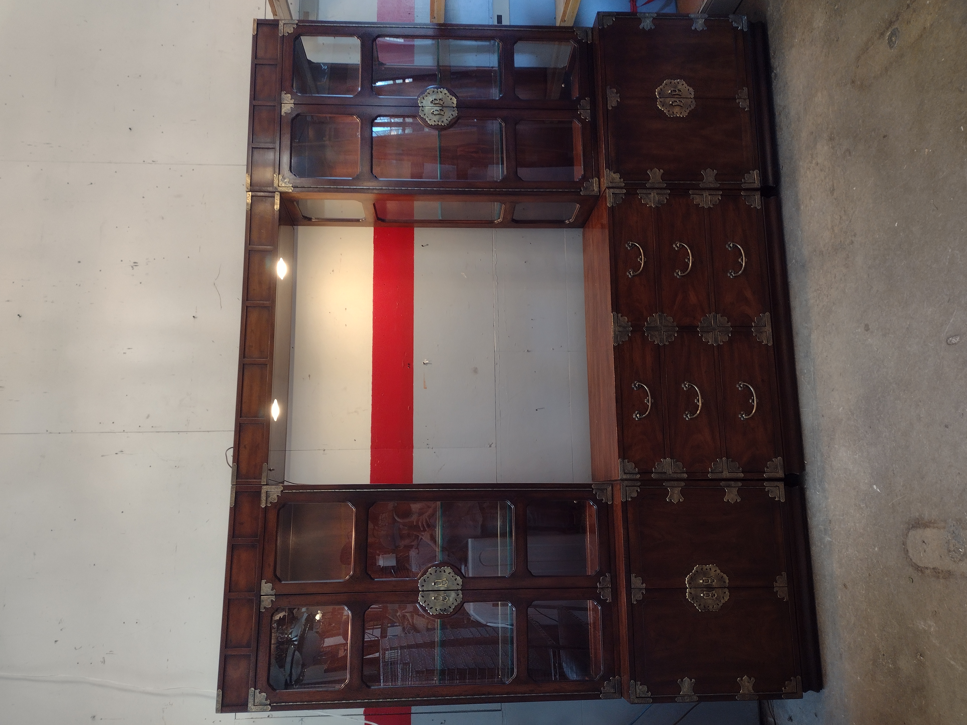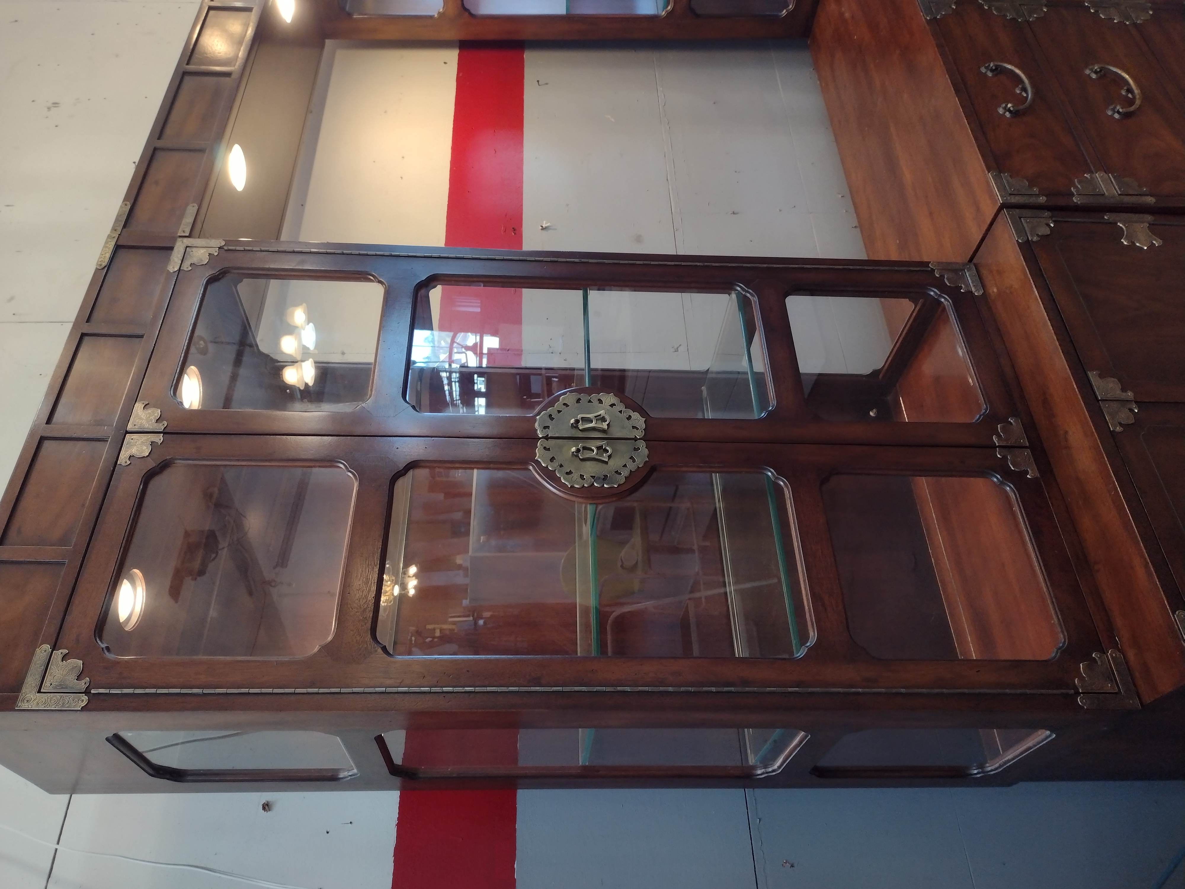 One center dresser and two door cabinets on the lower sides, with two full glass faced display cabinets joined in the center with spotlight header.