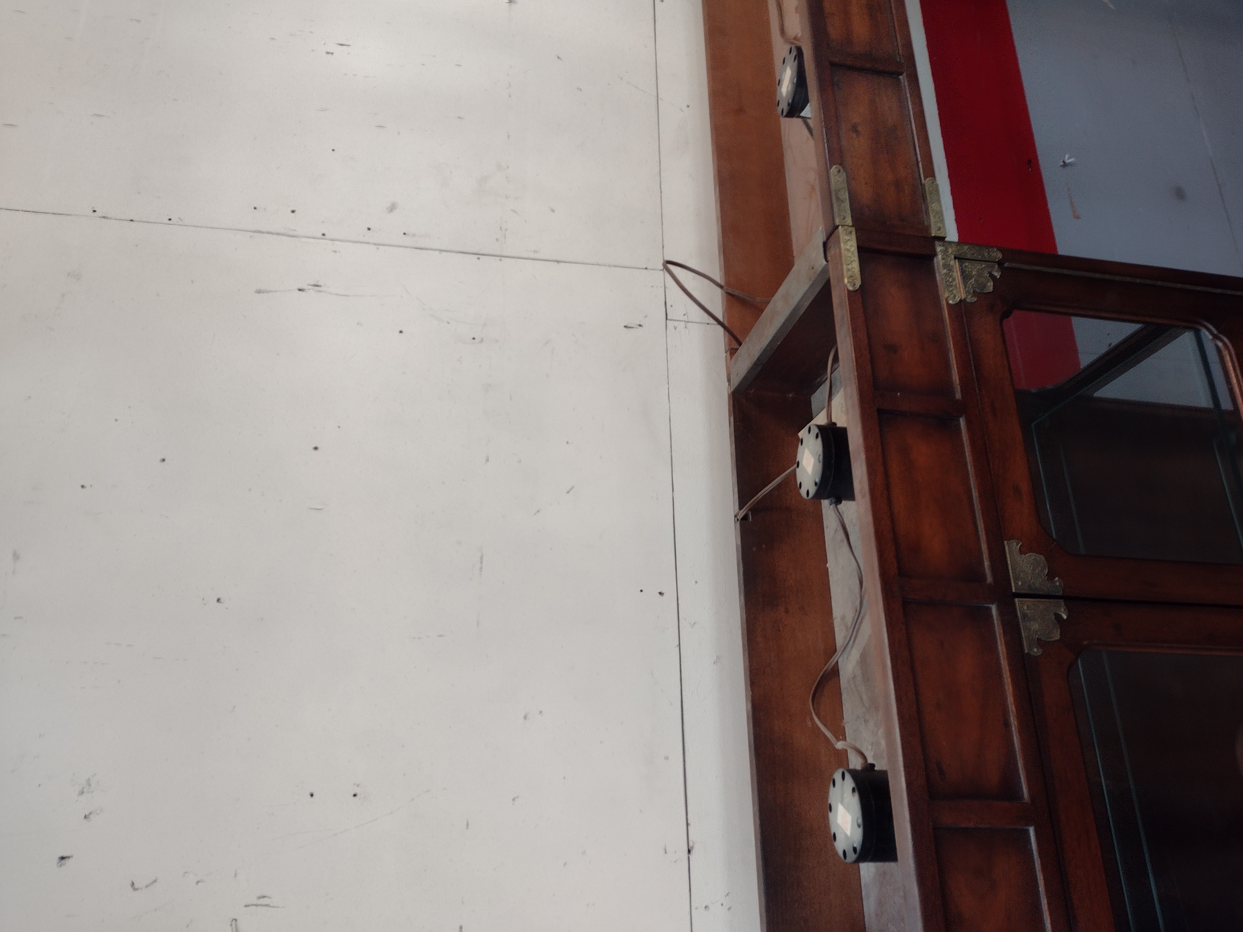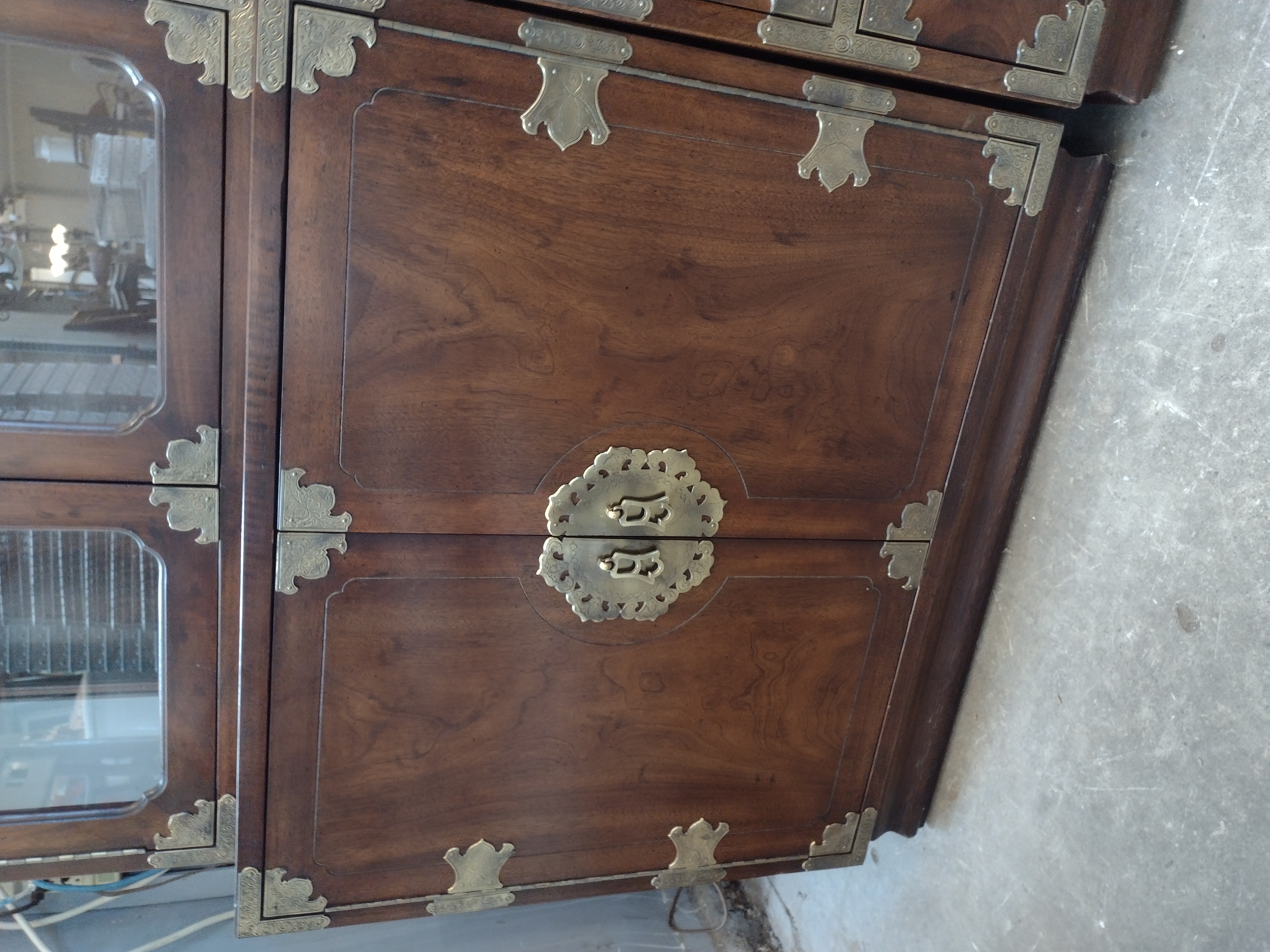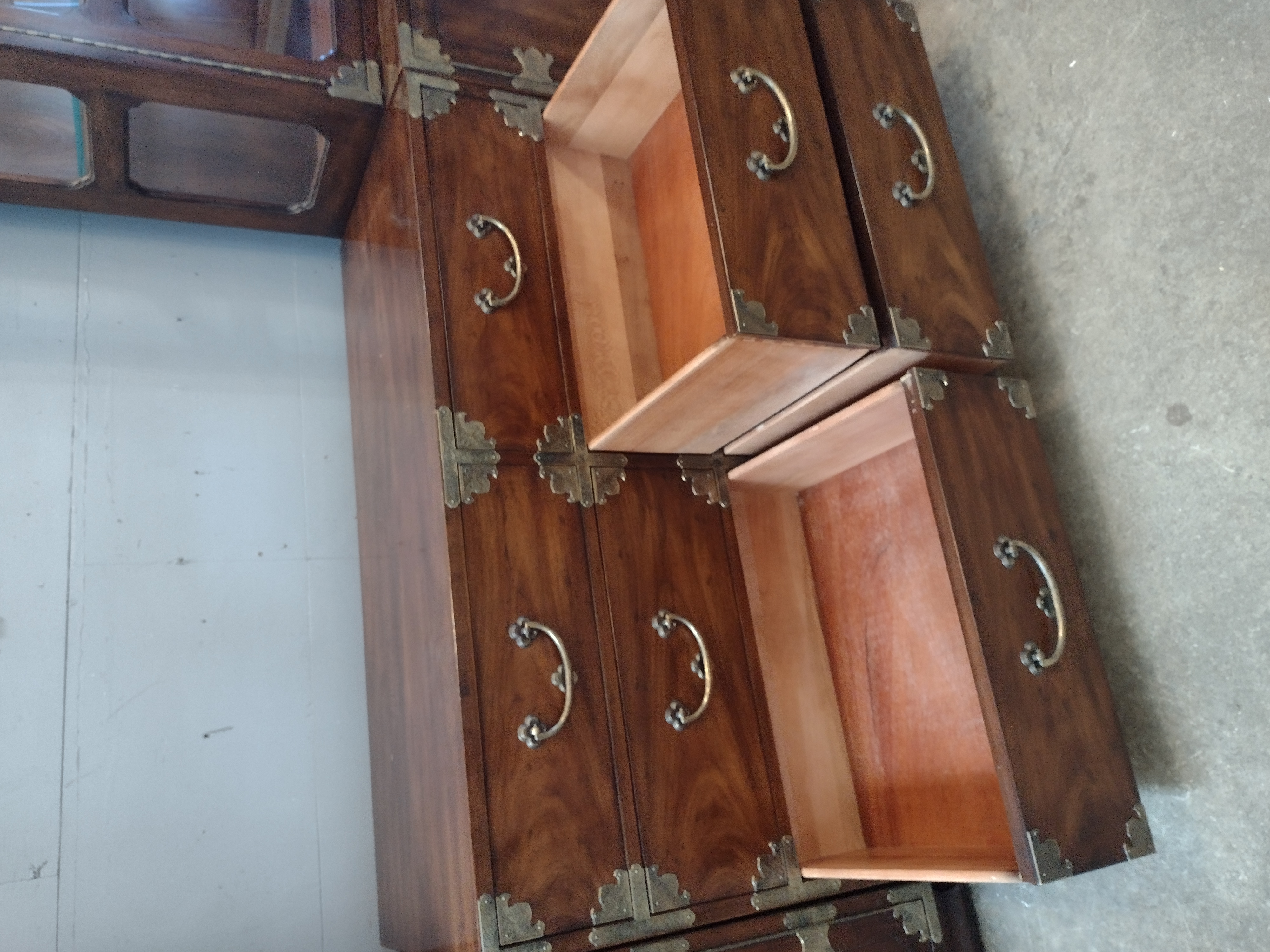One center dresser and two door cabinets on the lower sides, with two full glass faced display cabinets joined in the center with spotlight header.