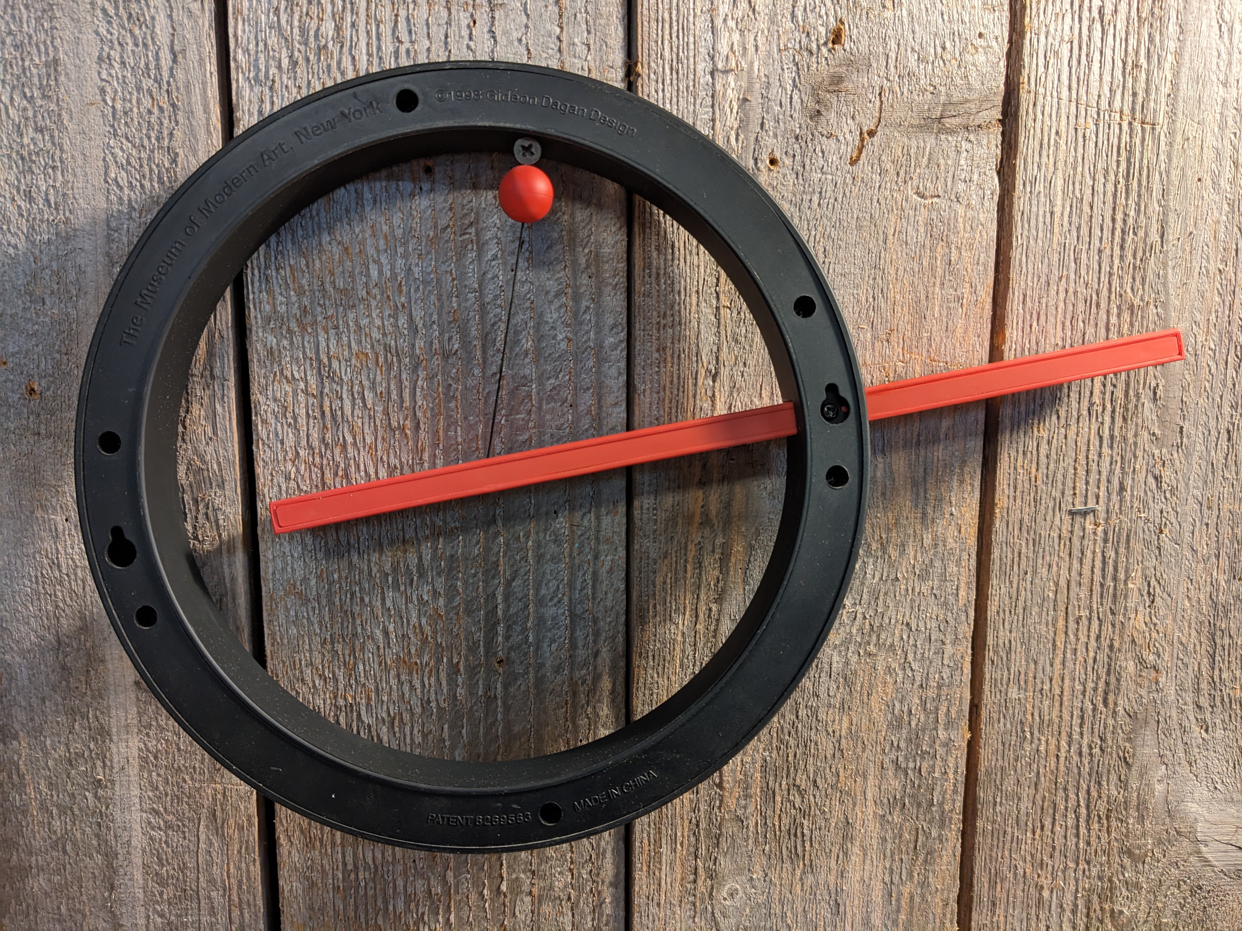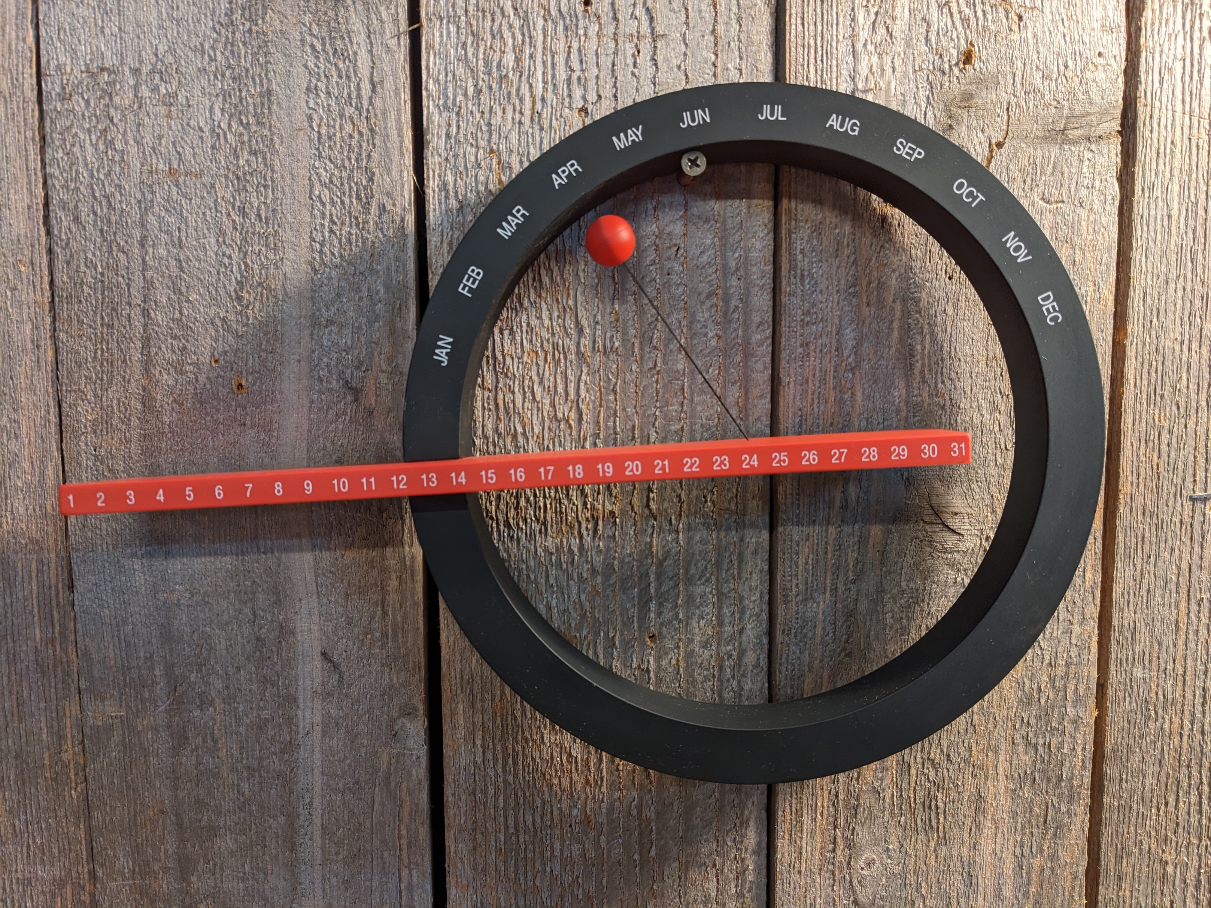 A sleek red and black magnetic calender. This stylish piece is in fantastic condition, though it's missing the small magnet to mark the days of the month. It measures 13 x 9 x 1.625 inches.