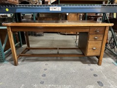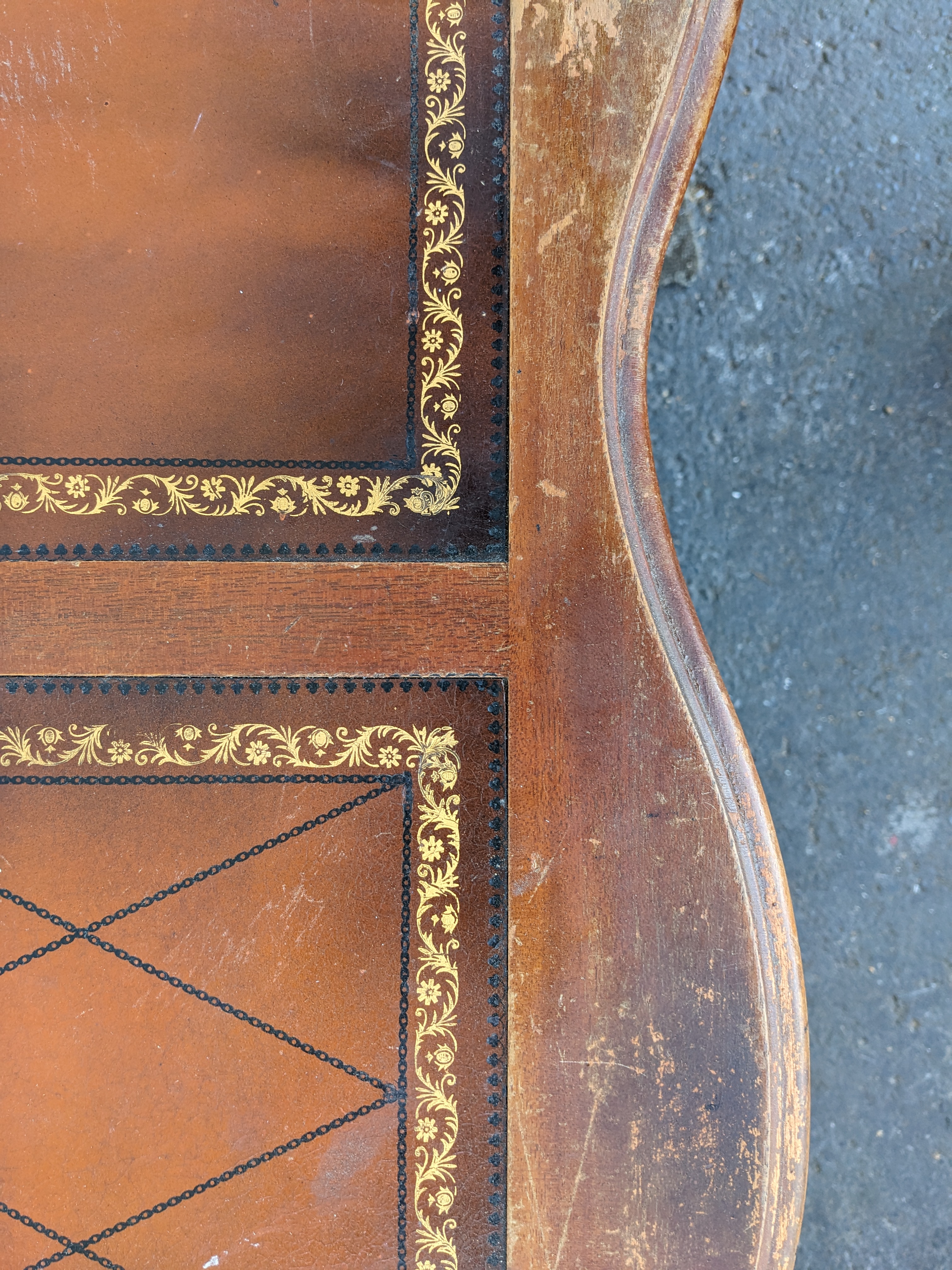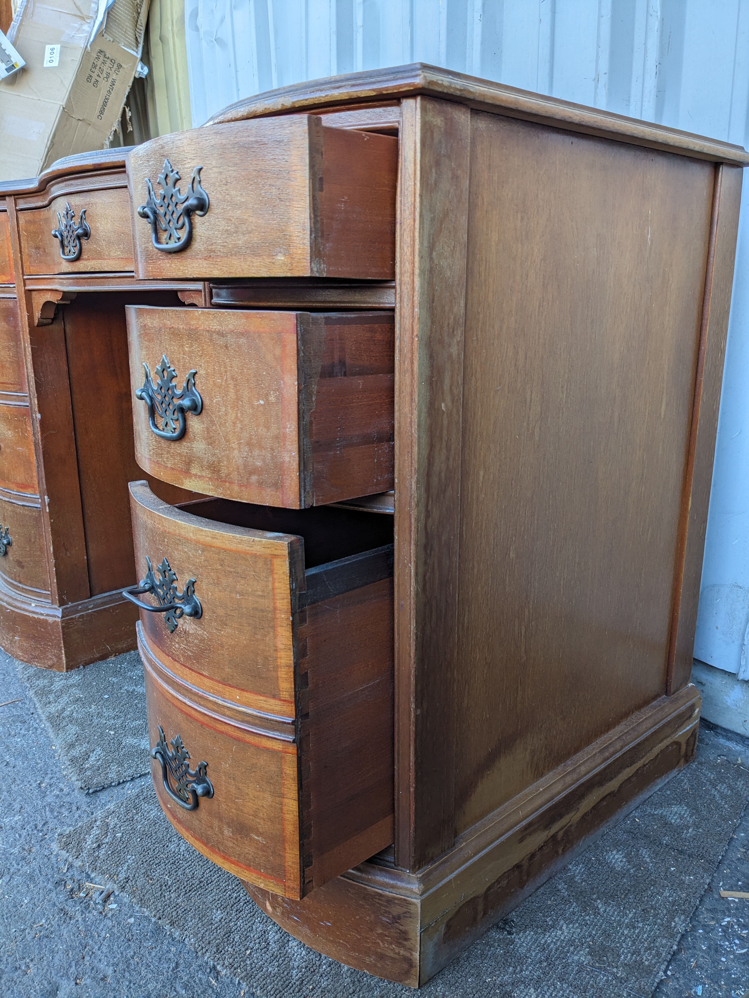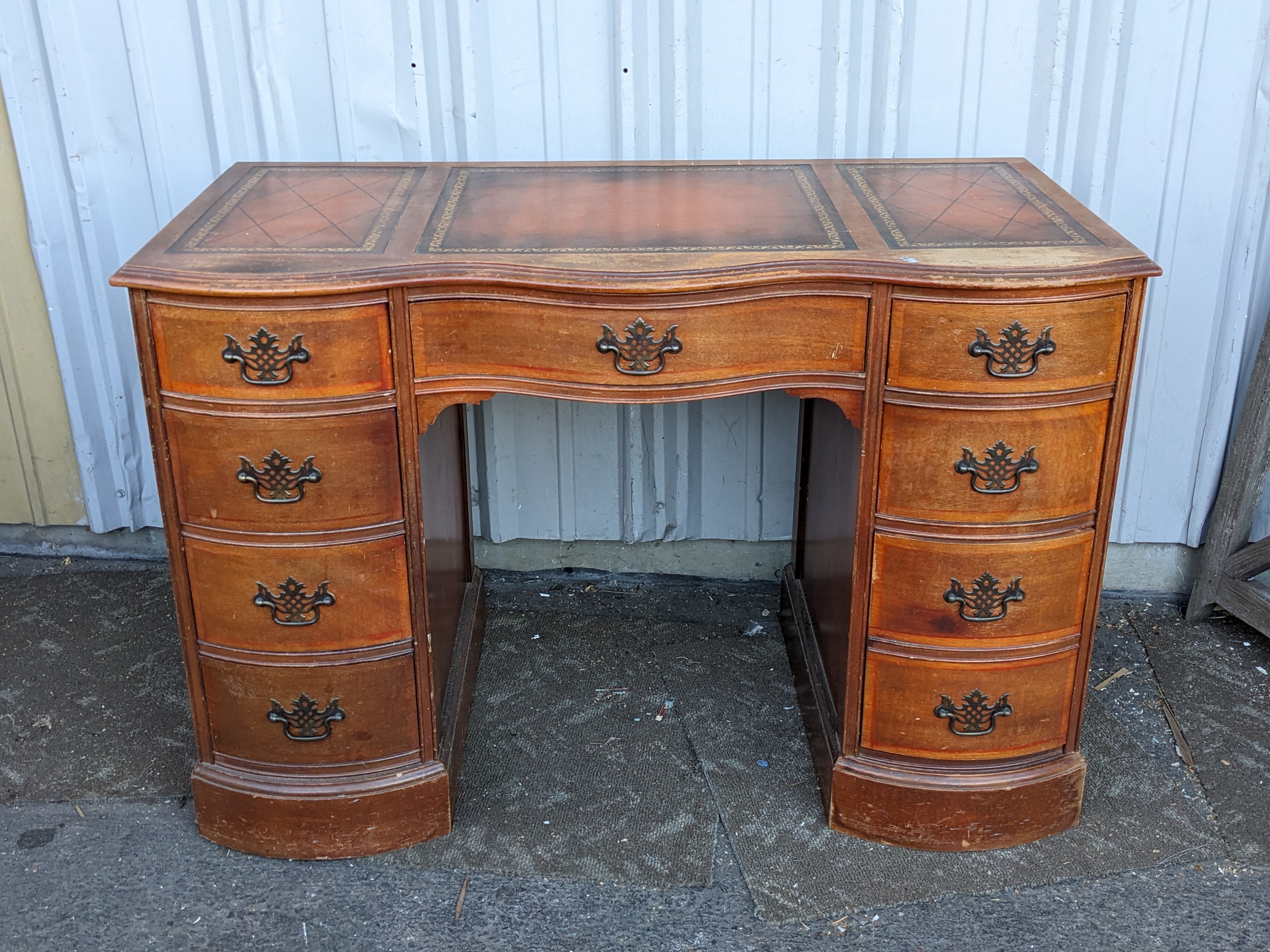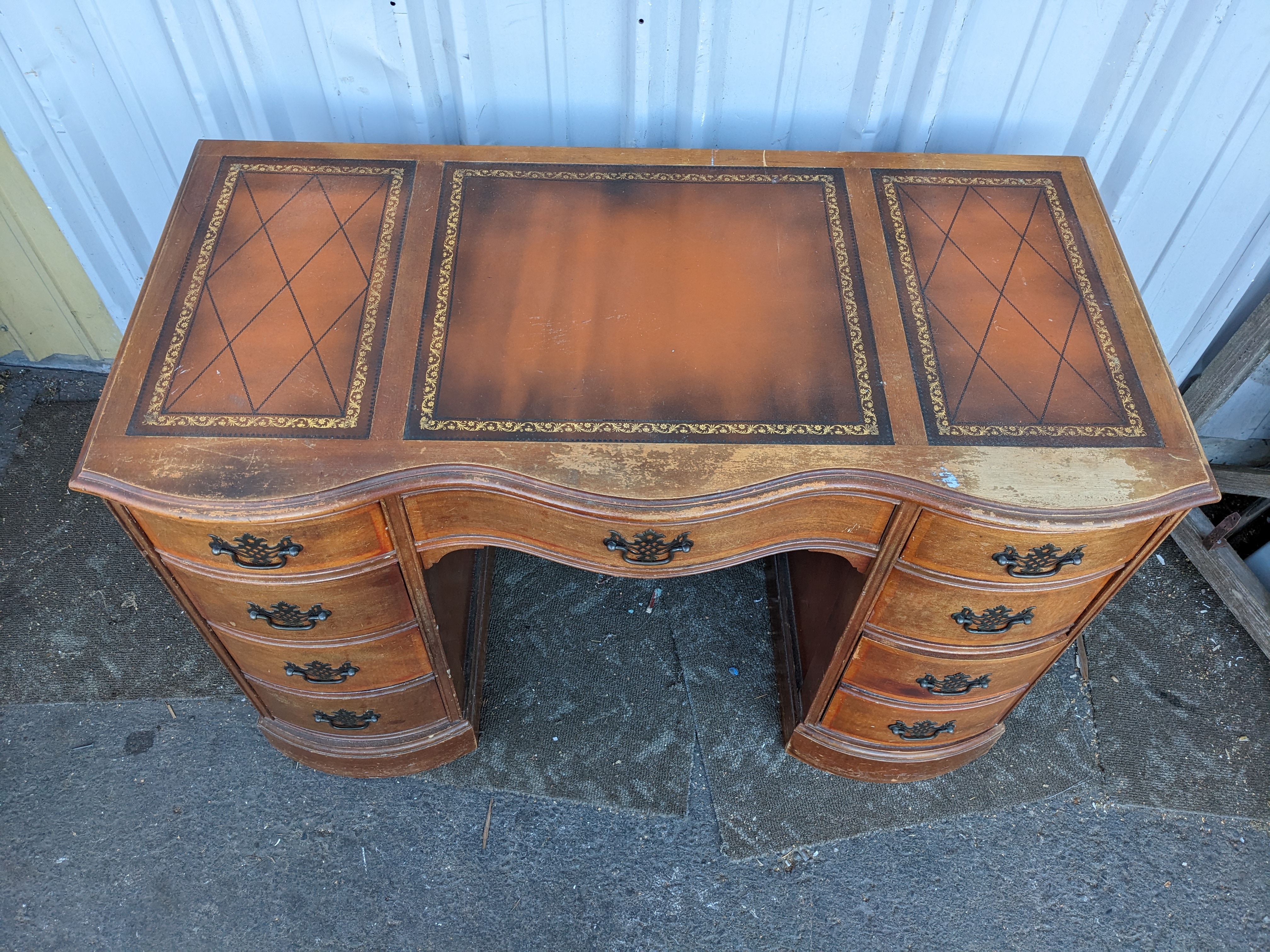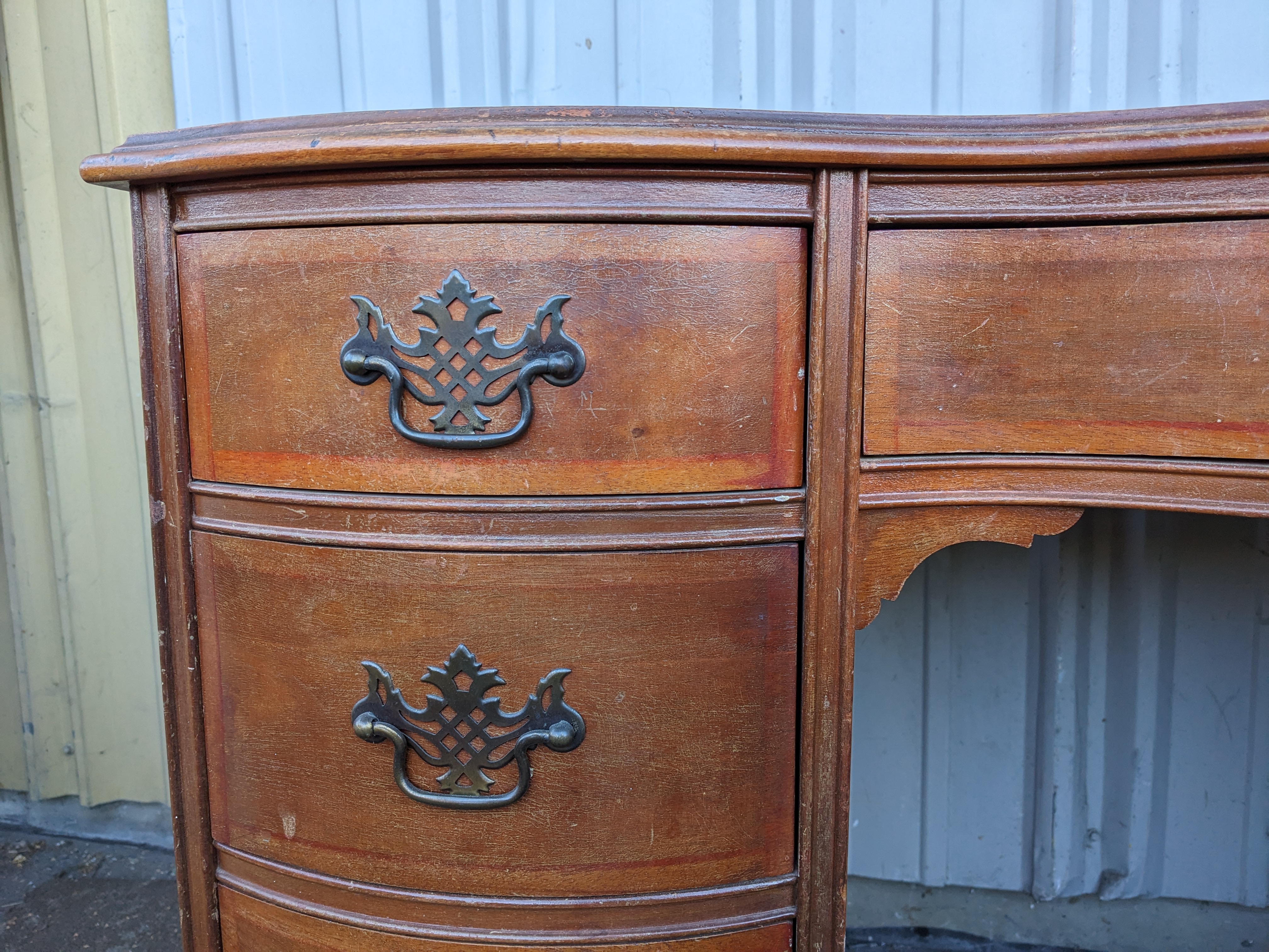 This cute desk has tons of lovely little details including embossed leather on the top, brass cabinet pulls, and dovetailed drawers. The finish it worn and chipped in some places, but the desk is still sturdy and solid. There are eight drawers, as the two bottom drawer faces on the right are a single deep drawer.