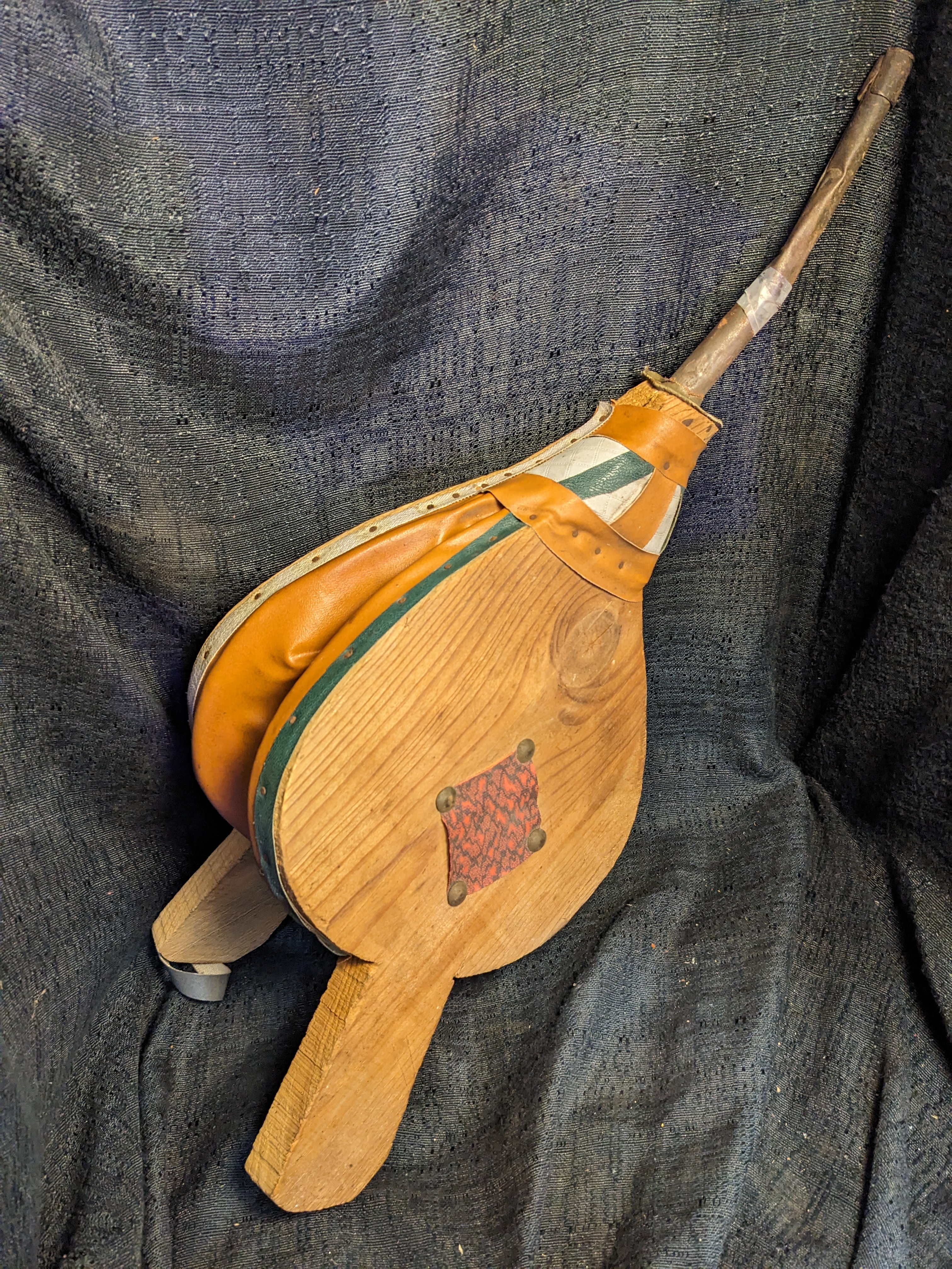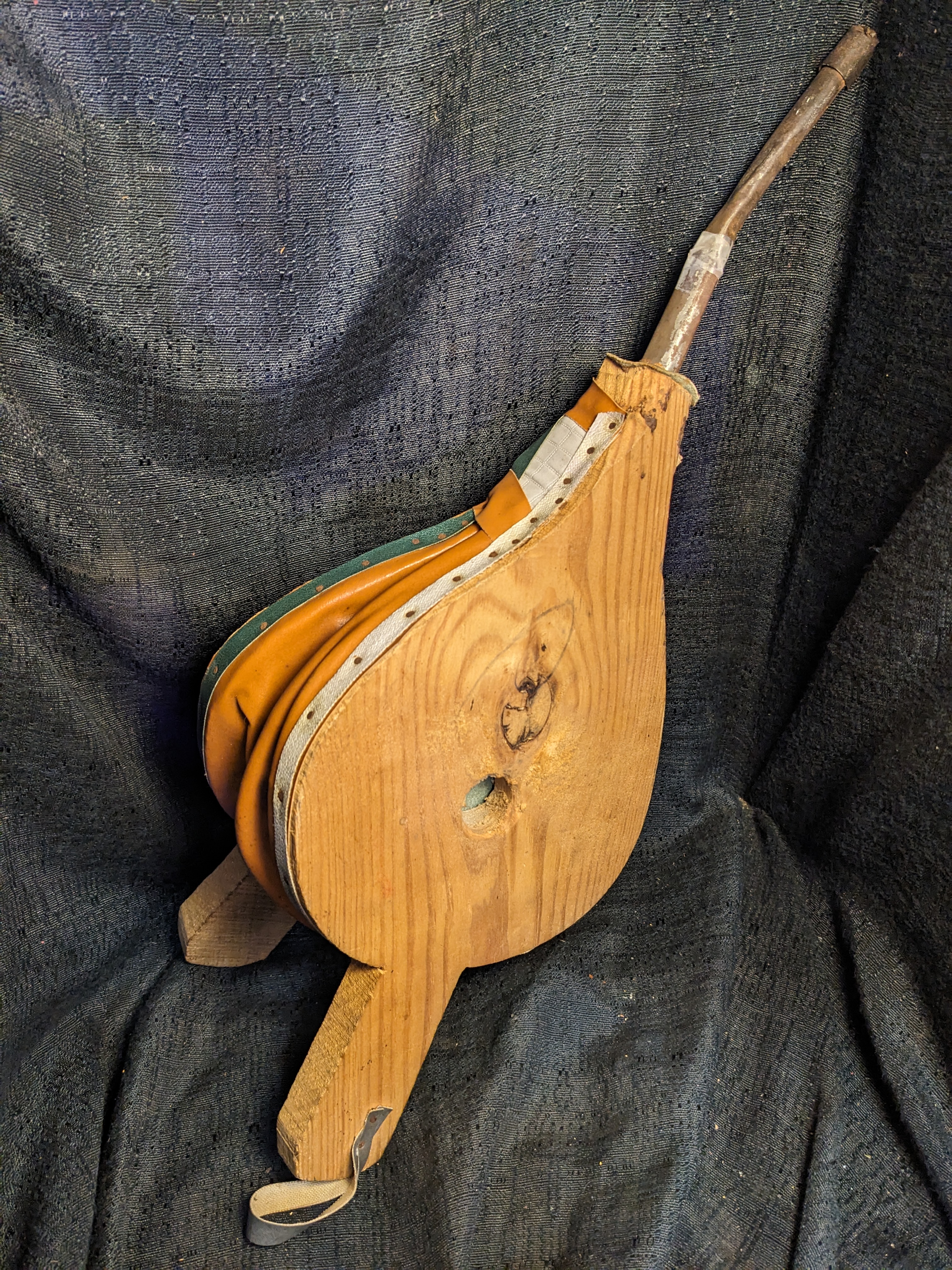 This bellows appears to be hand made. It has a metal spout, orange colored leather and can be used to feed a home fireplace or as a unique wall display item.
