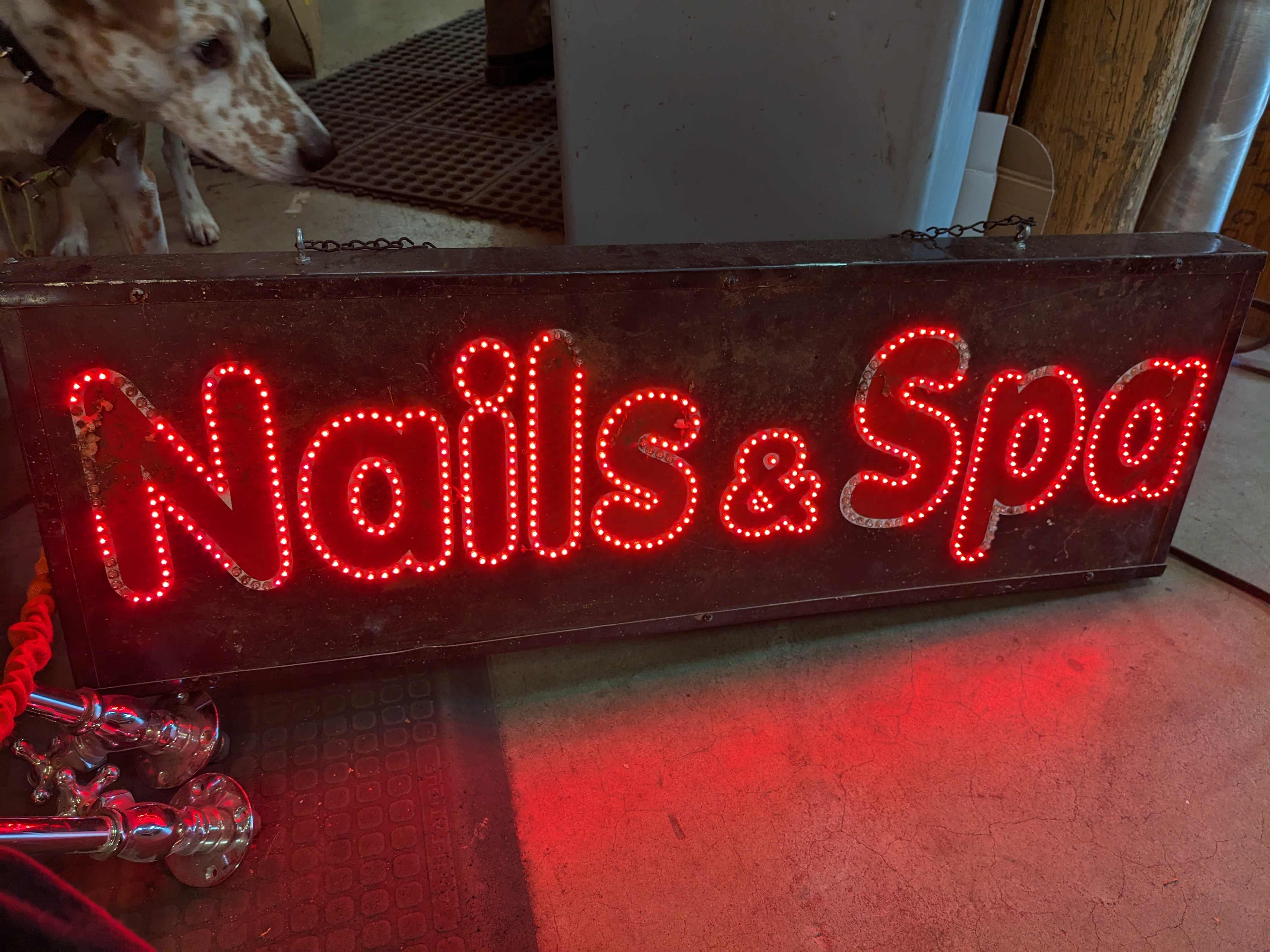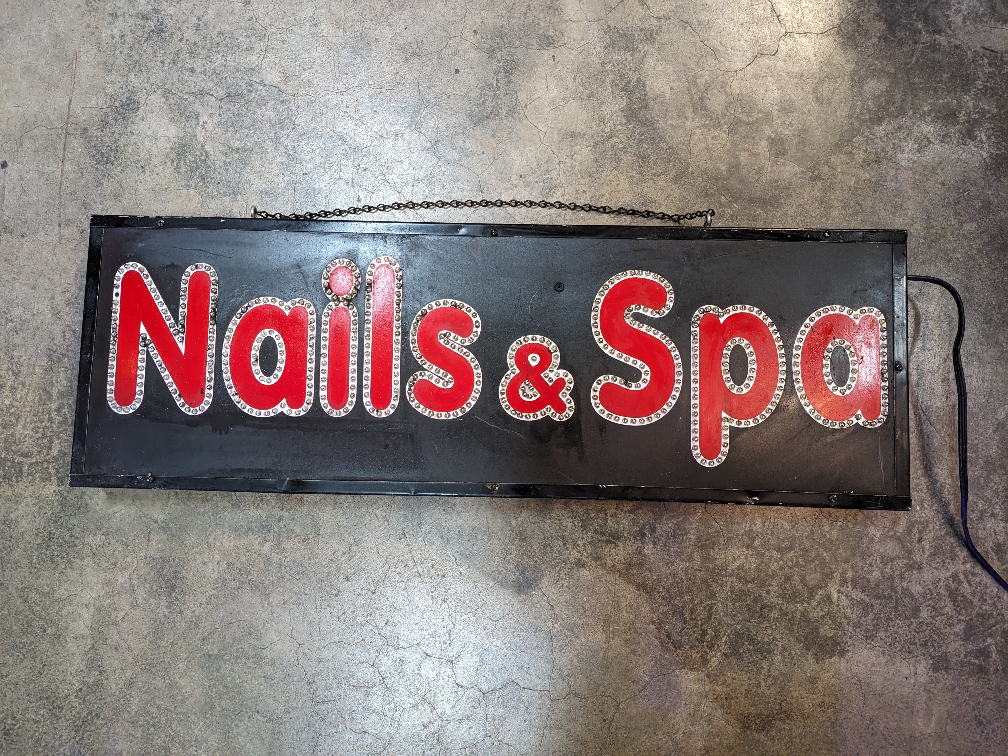 This LED sign says "Nails and Spa" and would be perfect for your nail and spa business! The wiring is good but some of the bulbs need to be replaced. It comes with a pre-installed chain and is ready to be hung up.