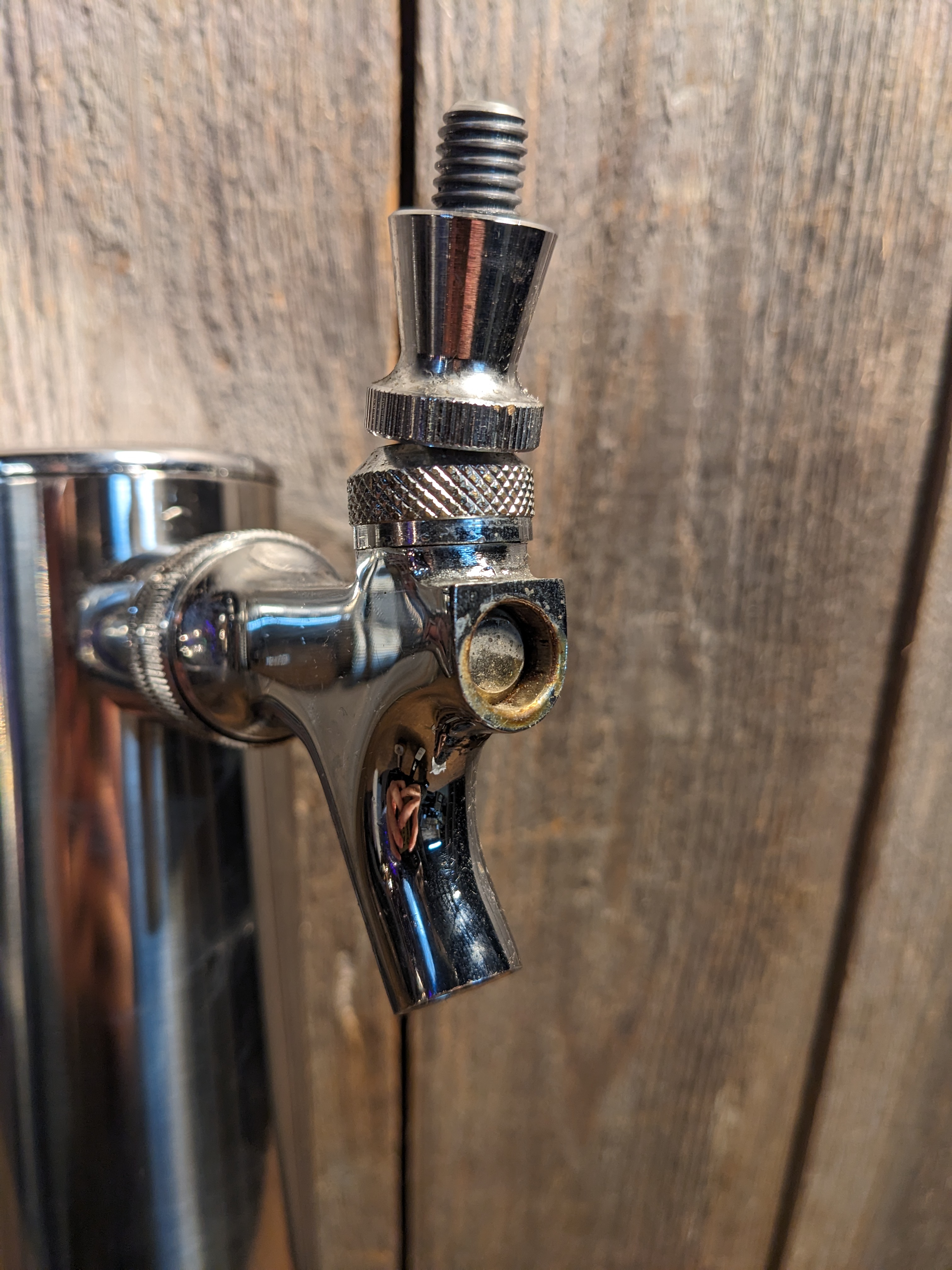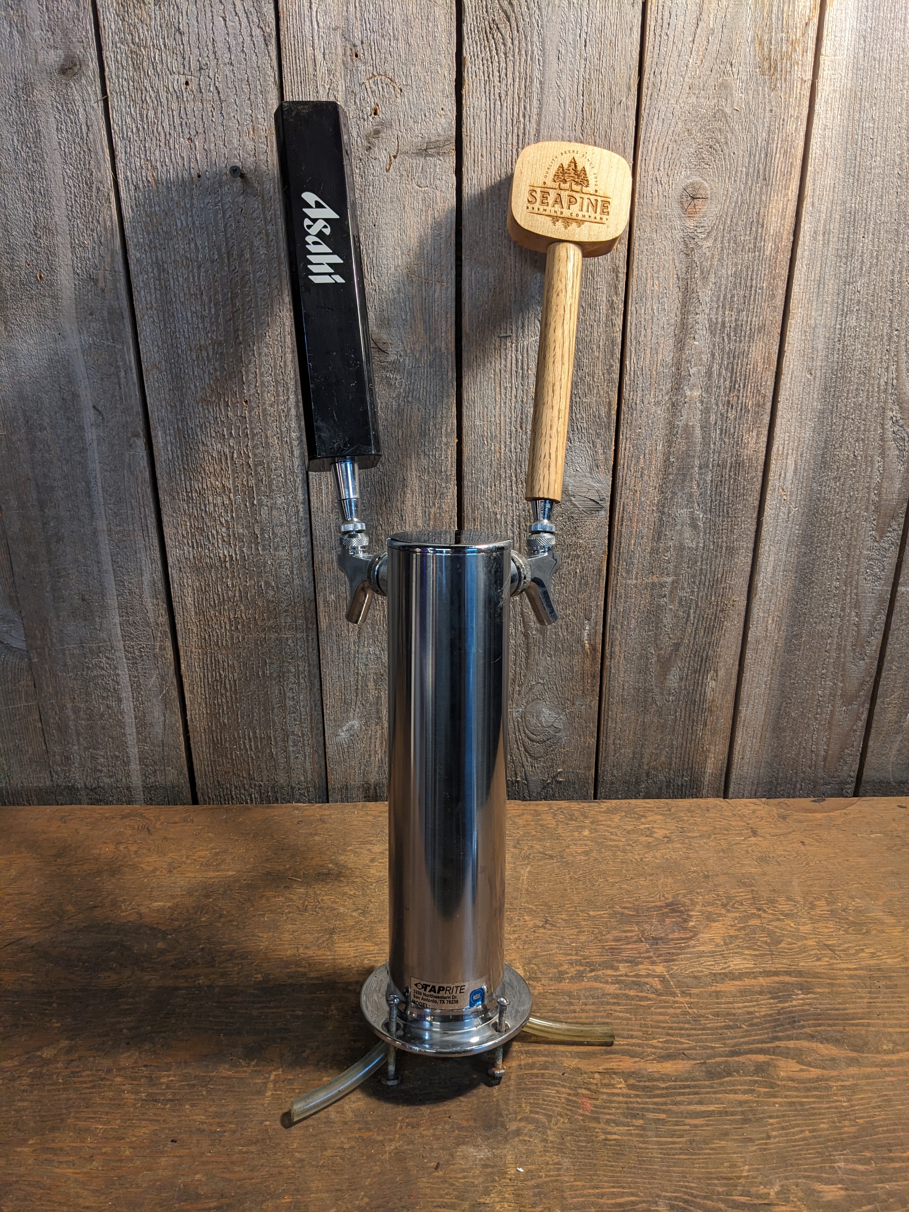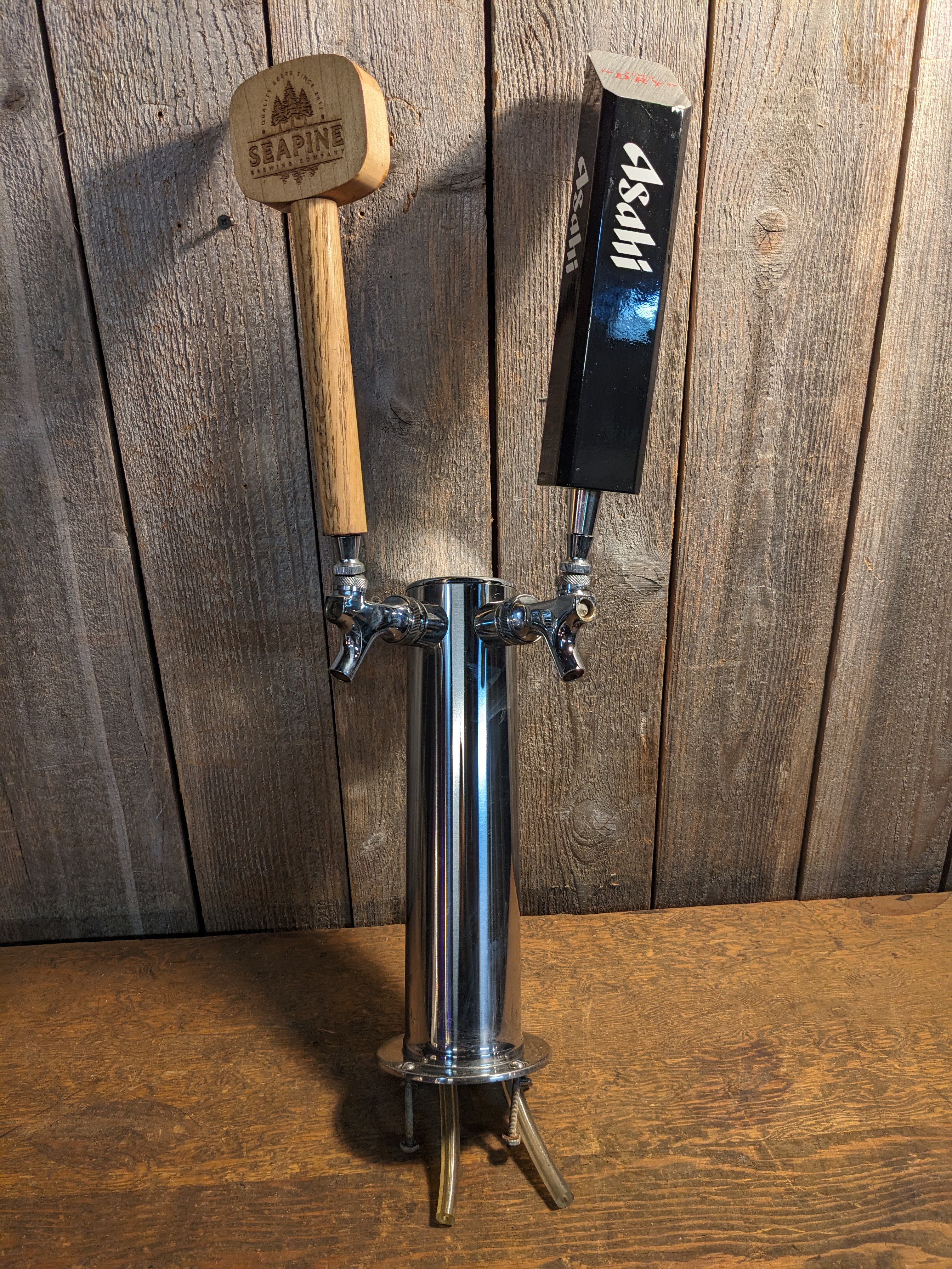 A chrome plated draft beer tower with two taps and handles. This tower seems to be in working order, though it may need some fresh tubing. Its got just a bit of wear and some small scratches. It measures roughly 8.5 x 23.5 x 7 inches.