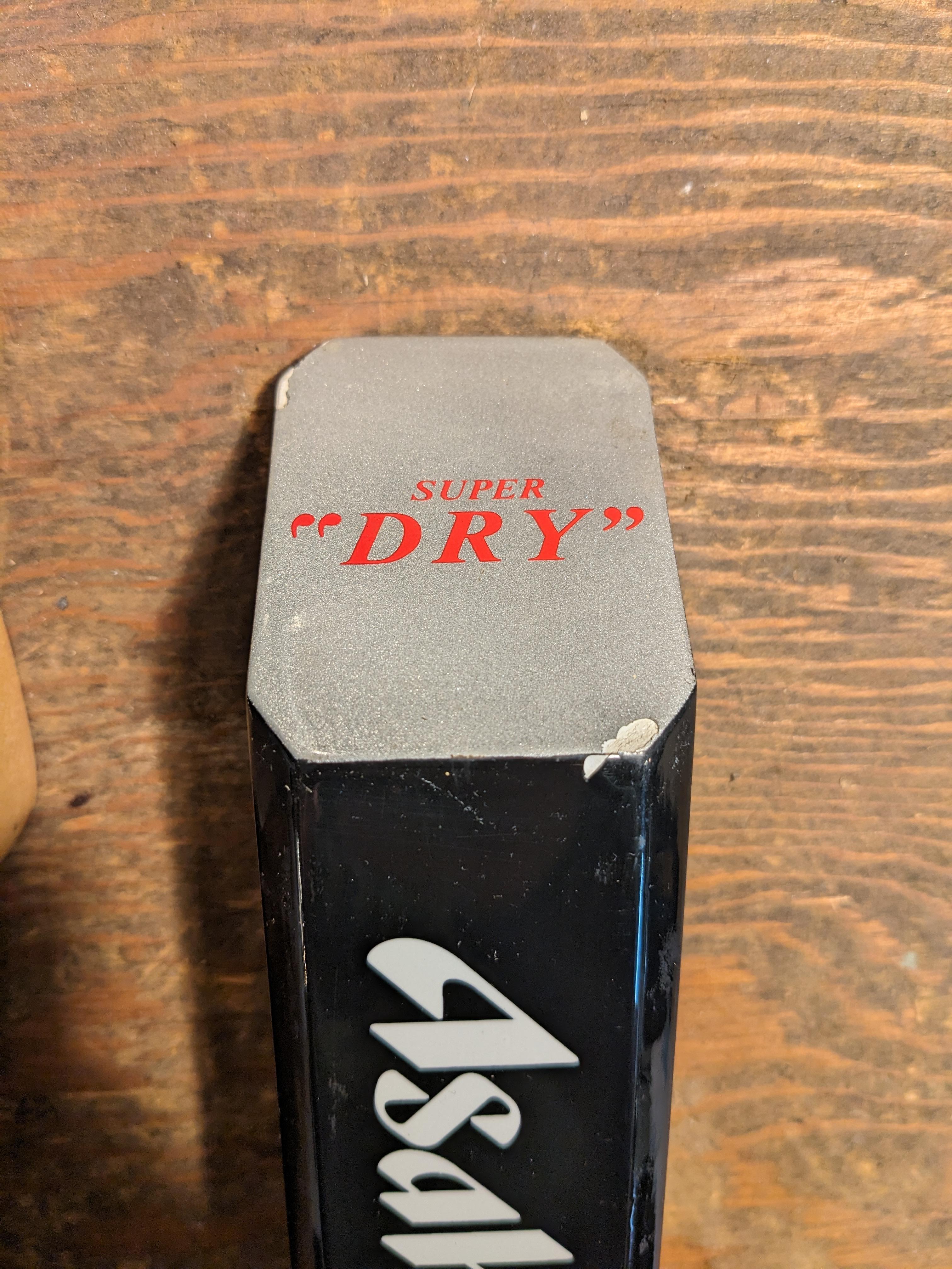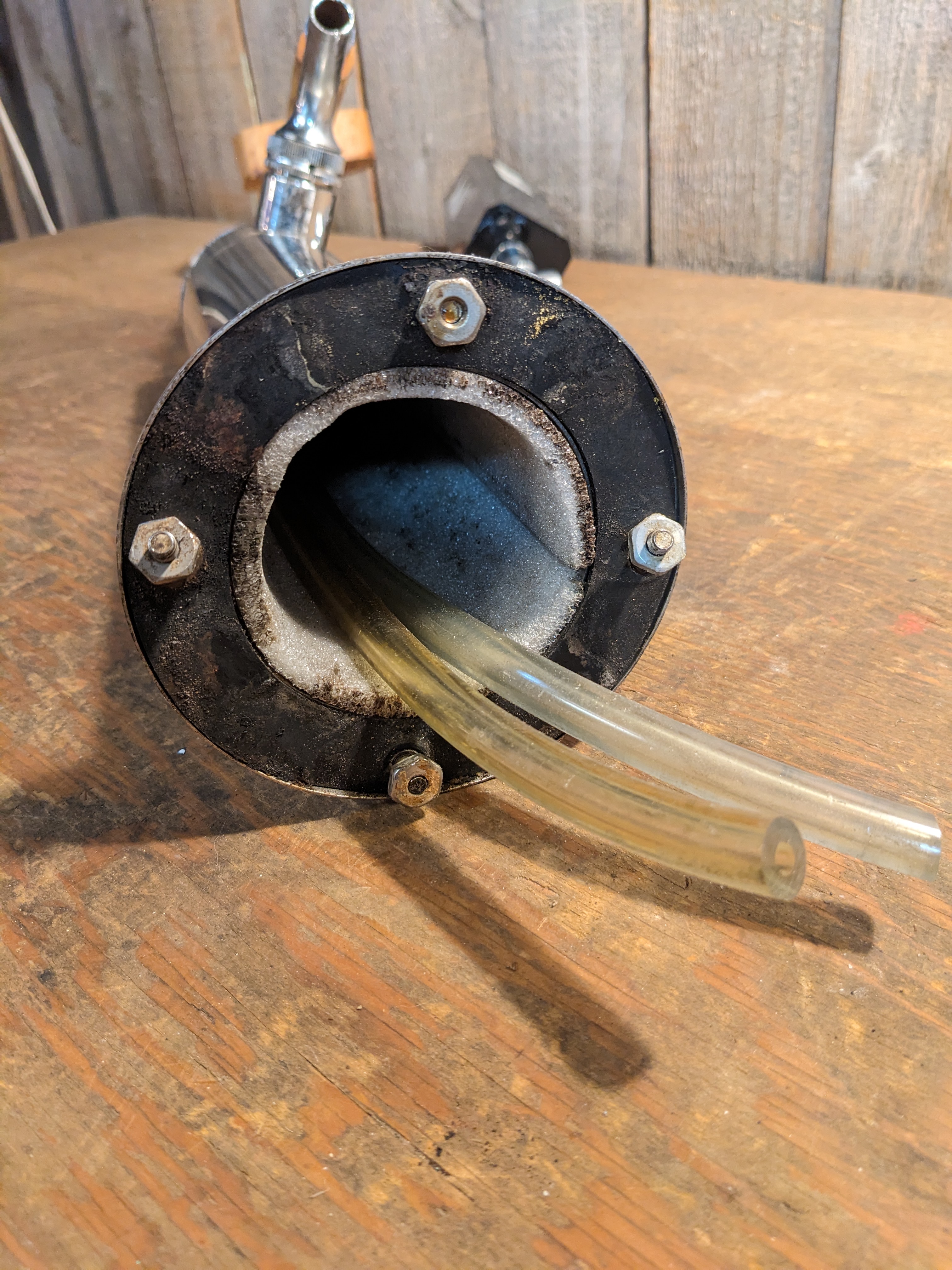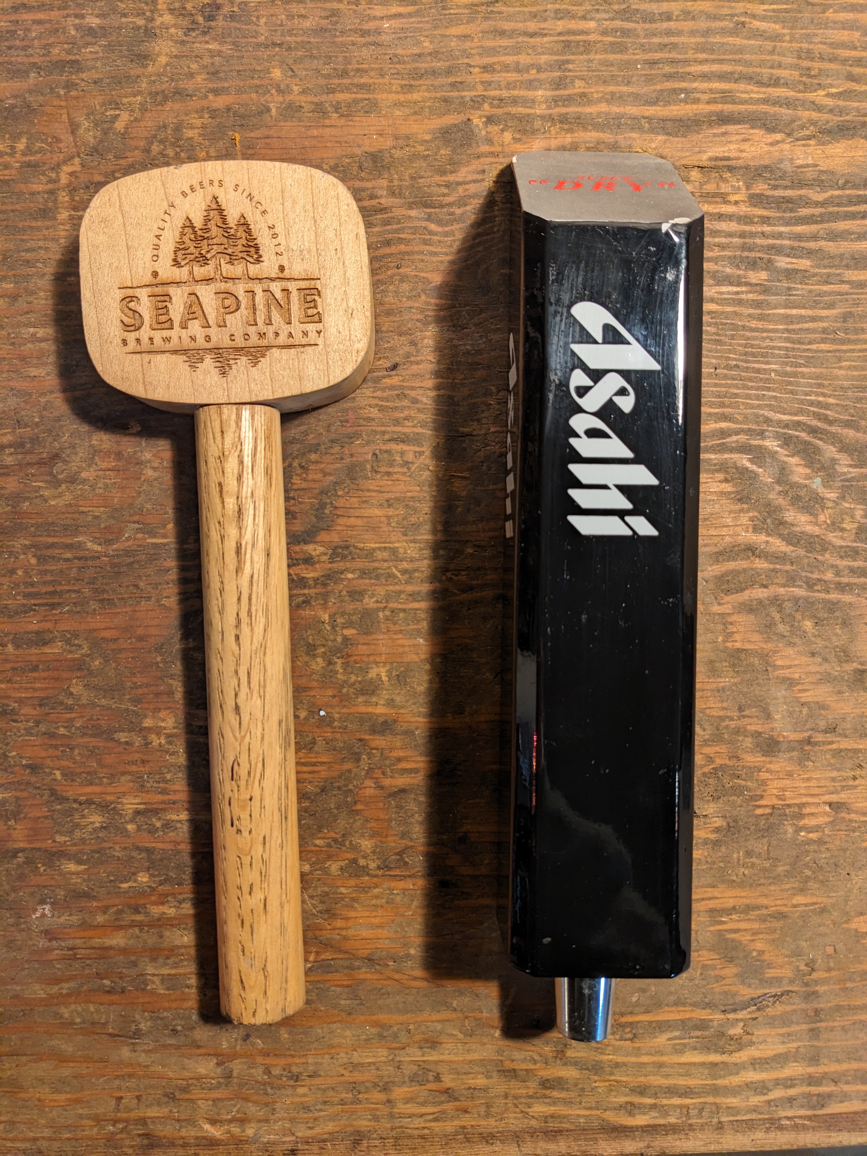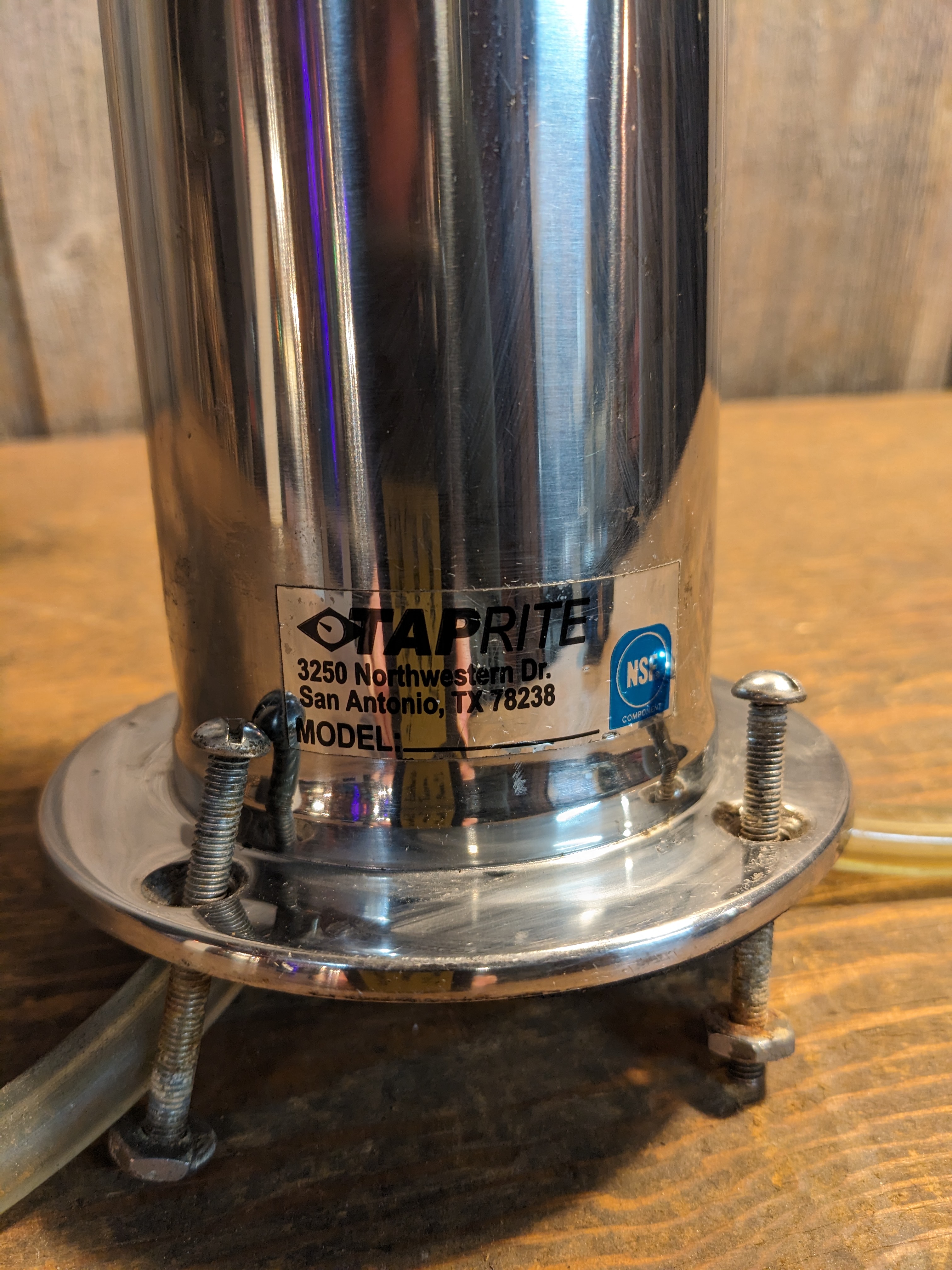 A chrome plated draft beer tower with two taps and handles. This tower seems to be in working order, though it may need some fresh tubing. Its got just a bit of wear and some small scratches. It measures roughly 8.5 x 23.5 x 7 inches.