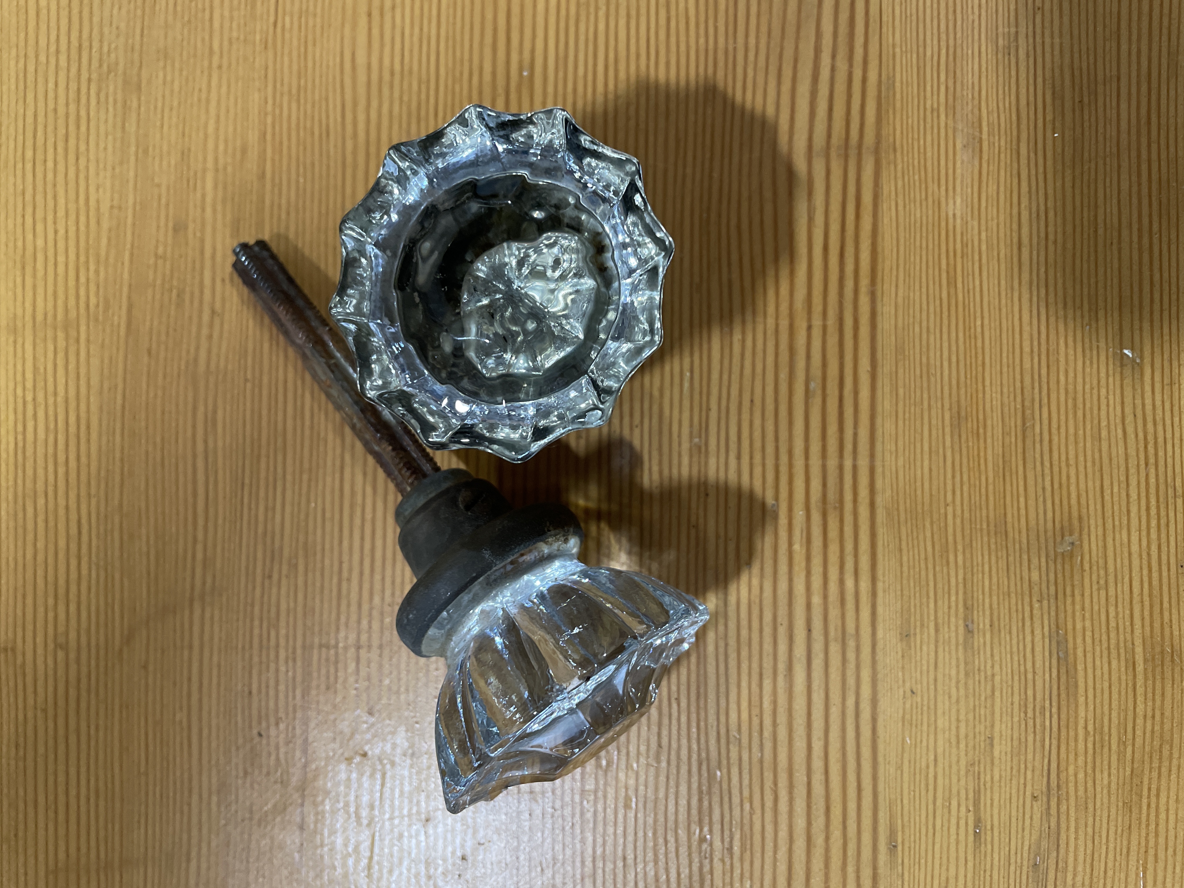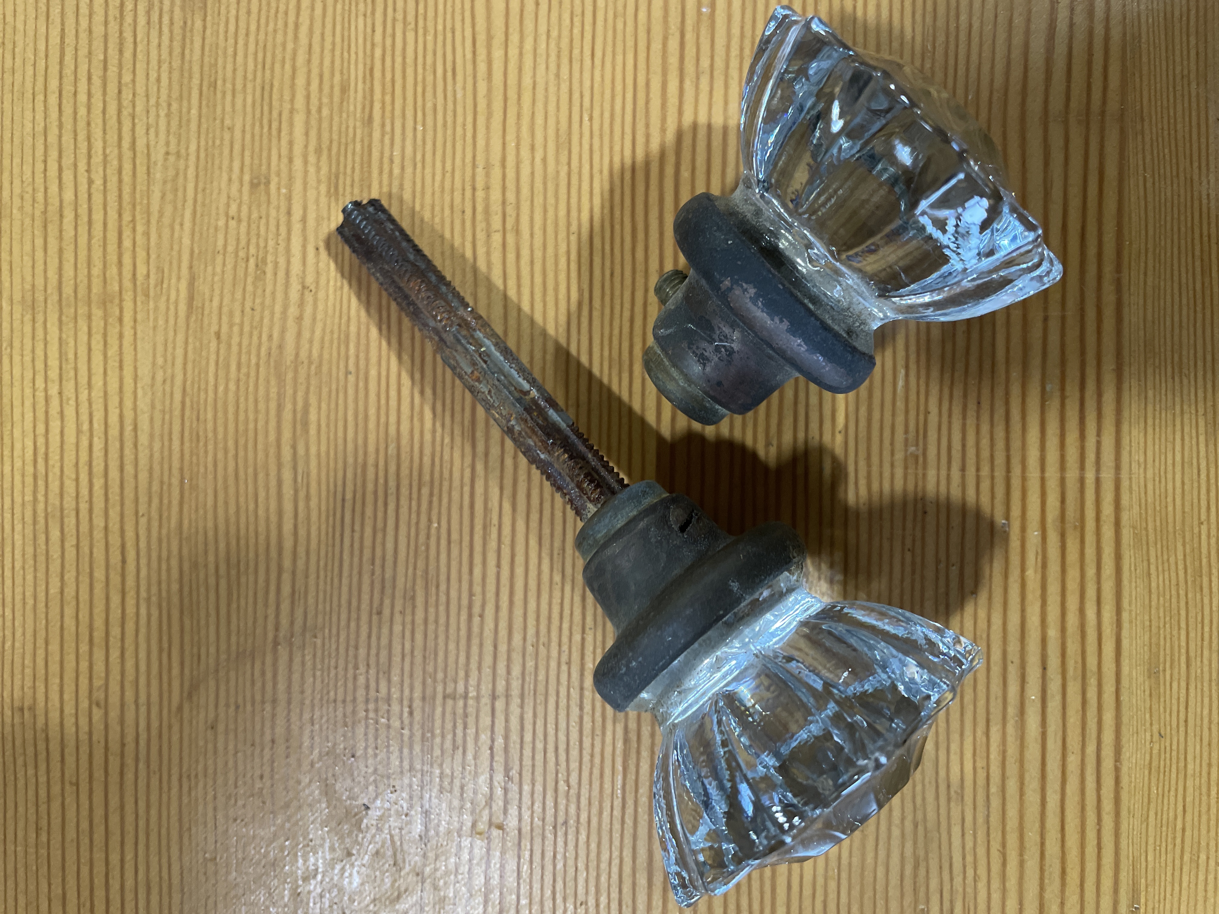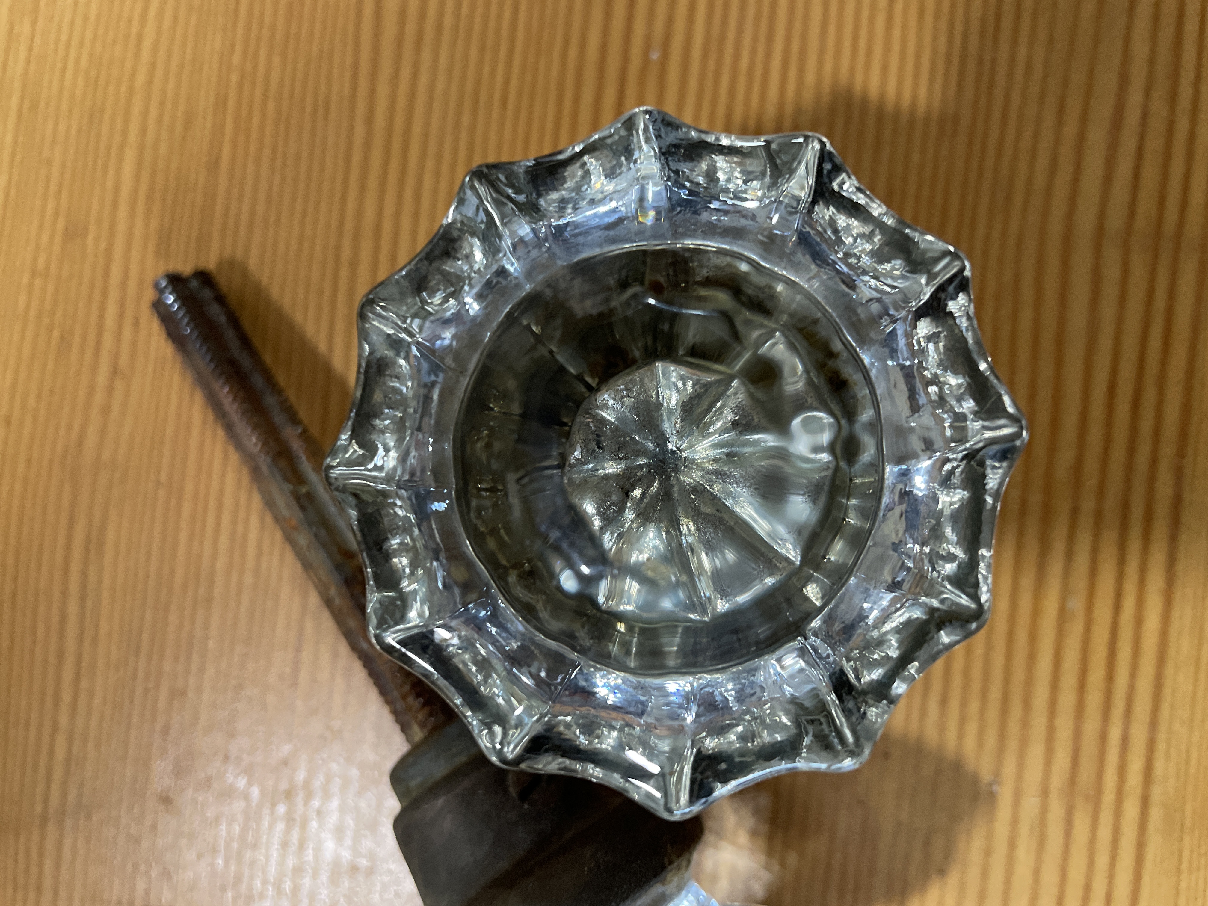 These glass knobs with rosettes are manganese which will turn purple in prolonged sun. No chips or cracks in glass. Knob is worn with use. Some rust at base and spindle. In fair condition.
