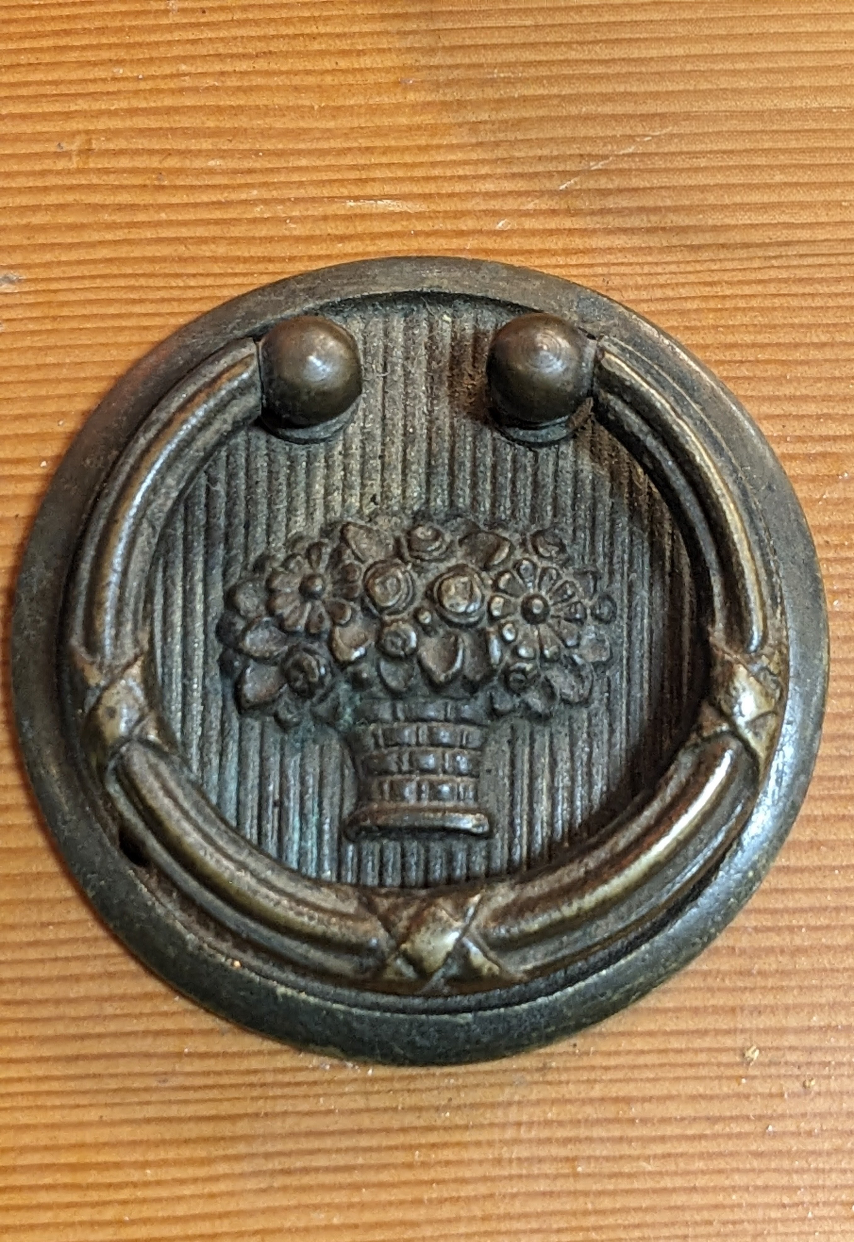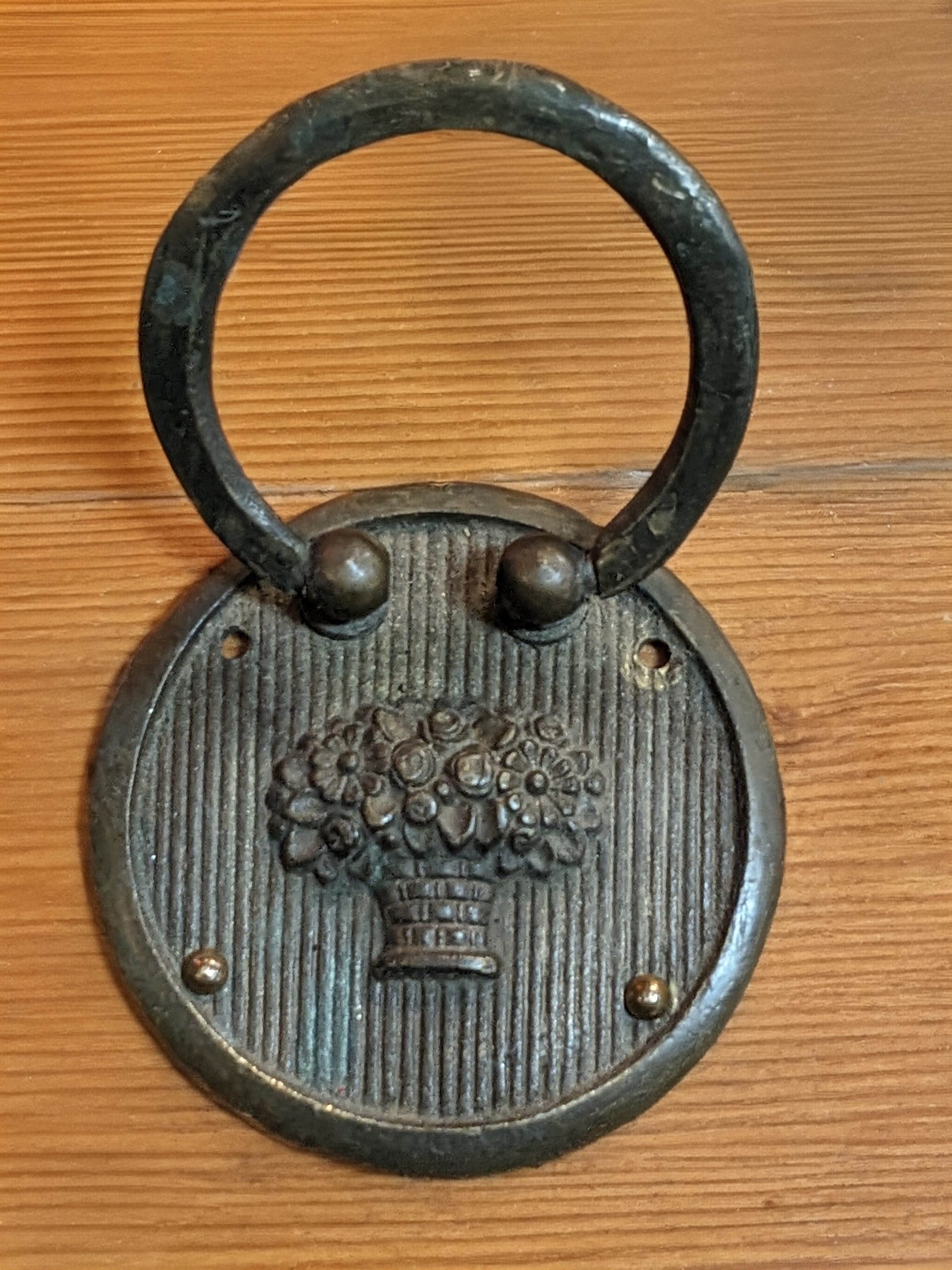 Made of brass the whole thing is cast. Circa 1900. Attached with 4 small nails or screws from the front face.