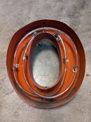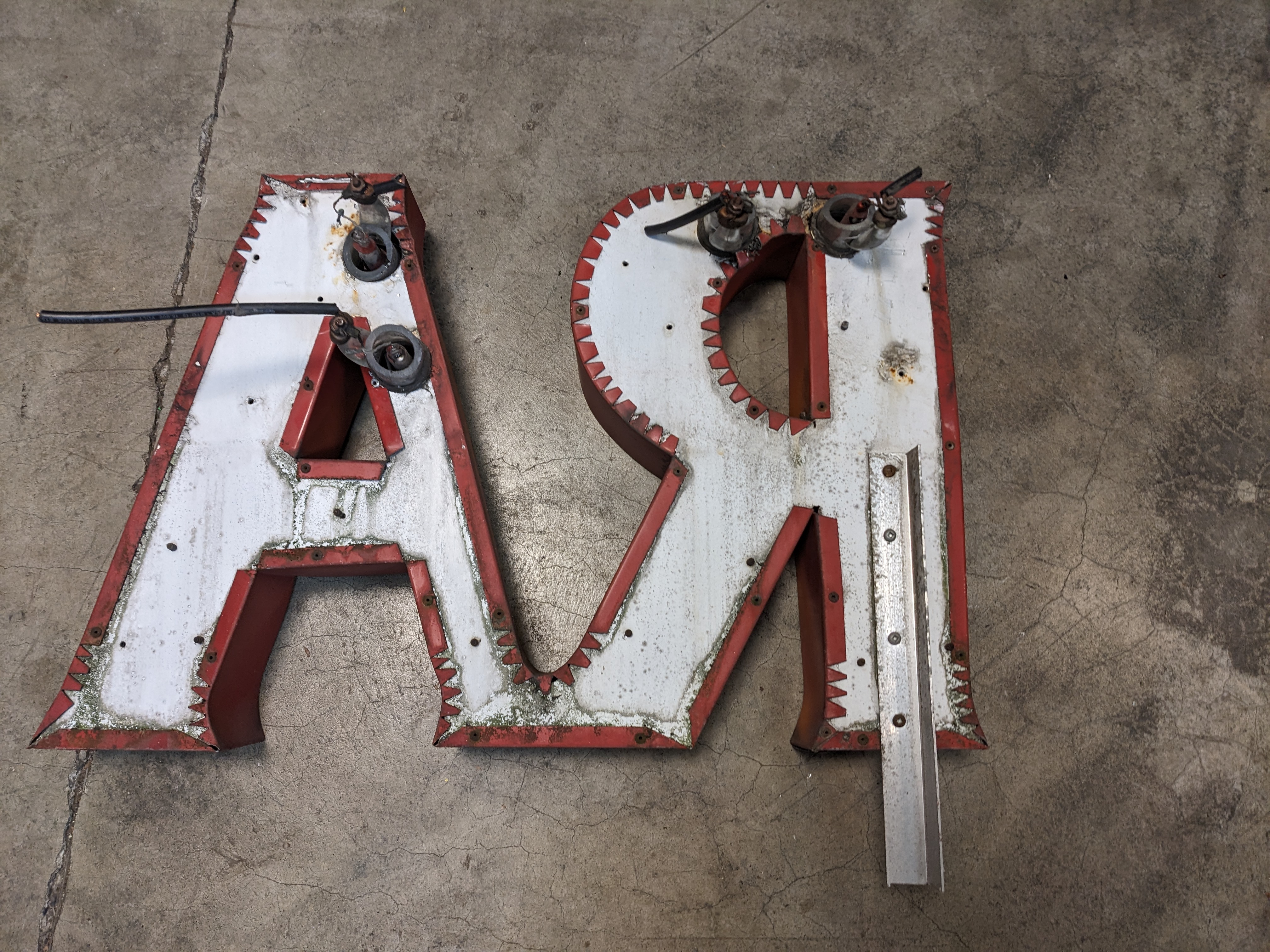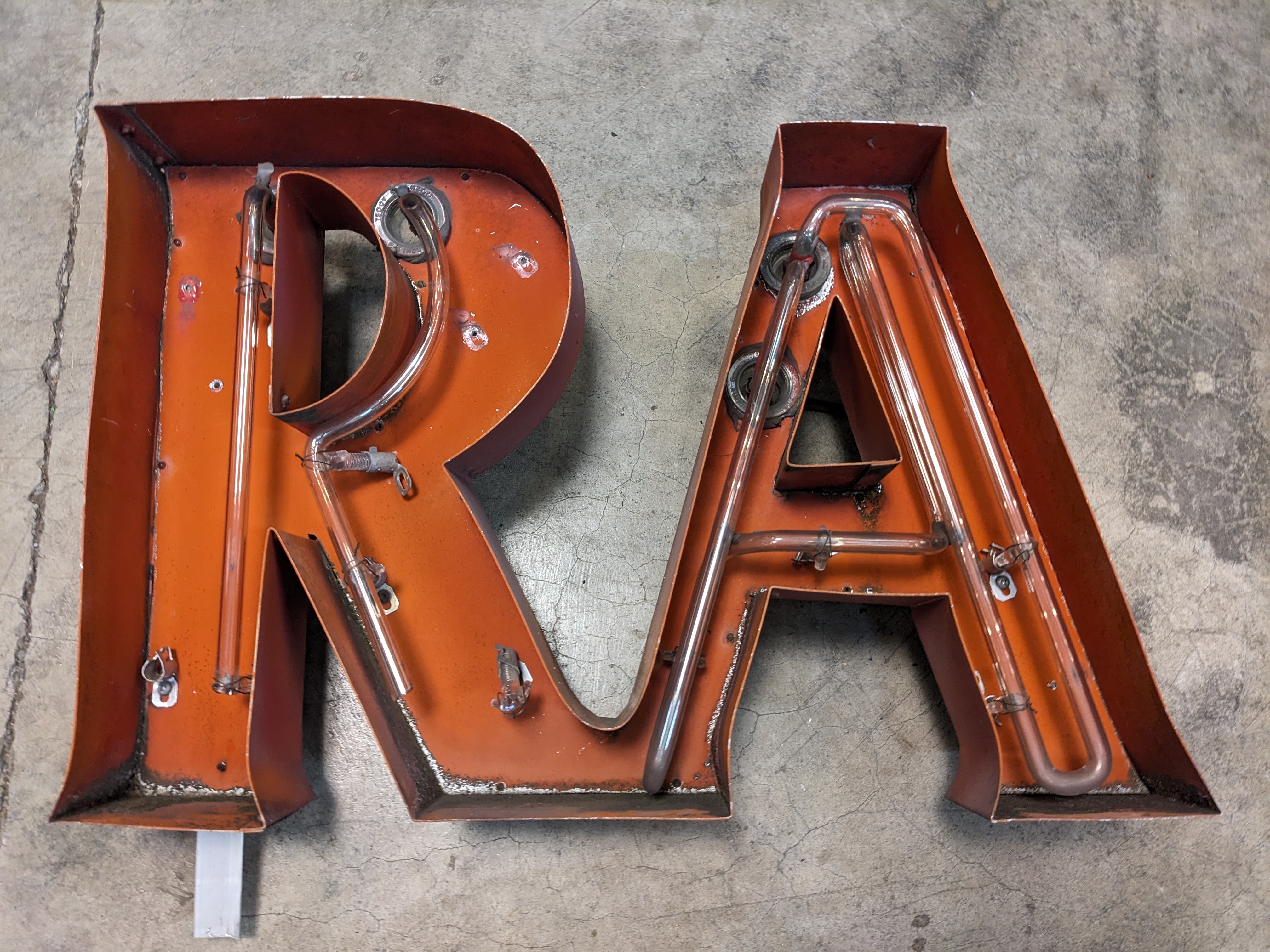This red metal channel letter set features R and A together measuring 20.25 x 15. As is.