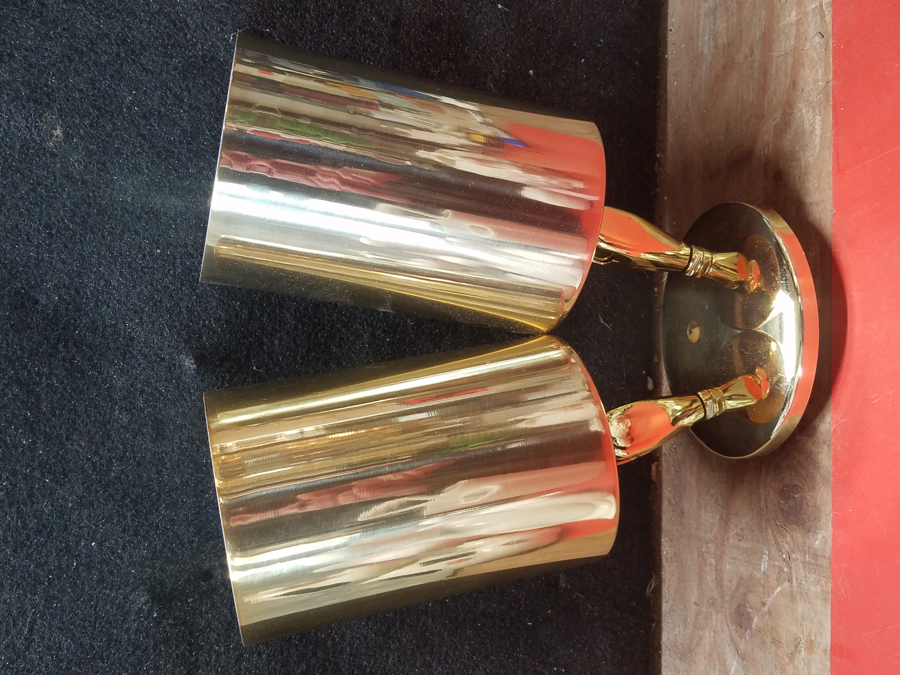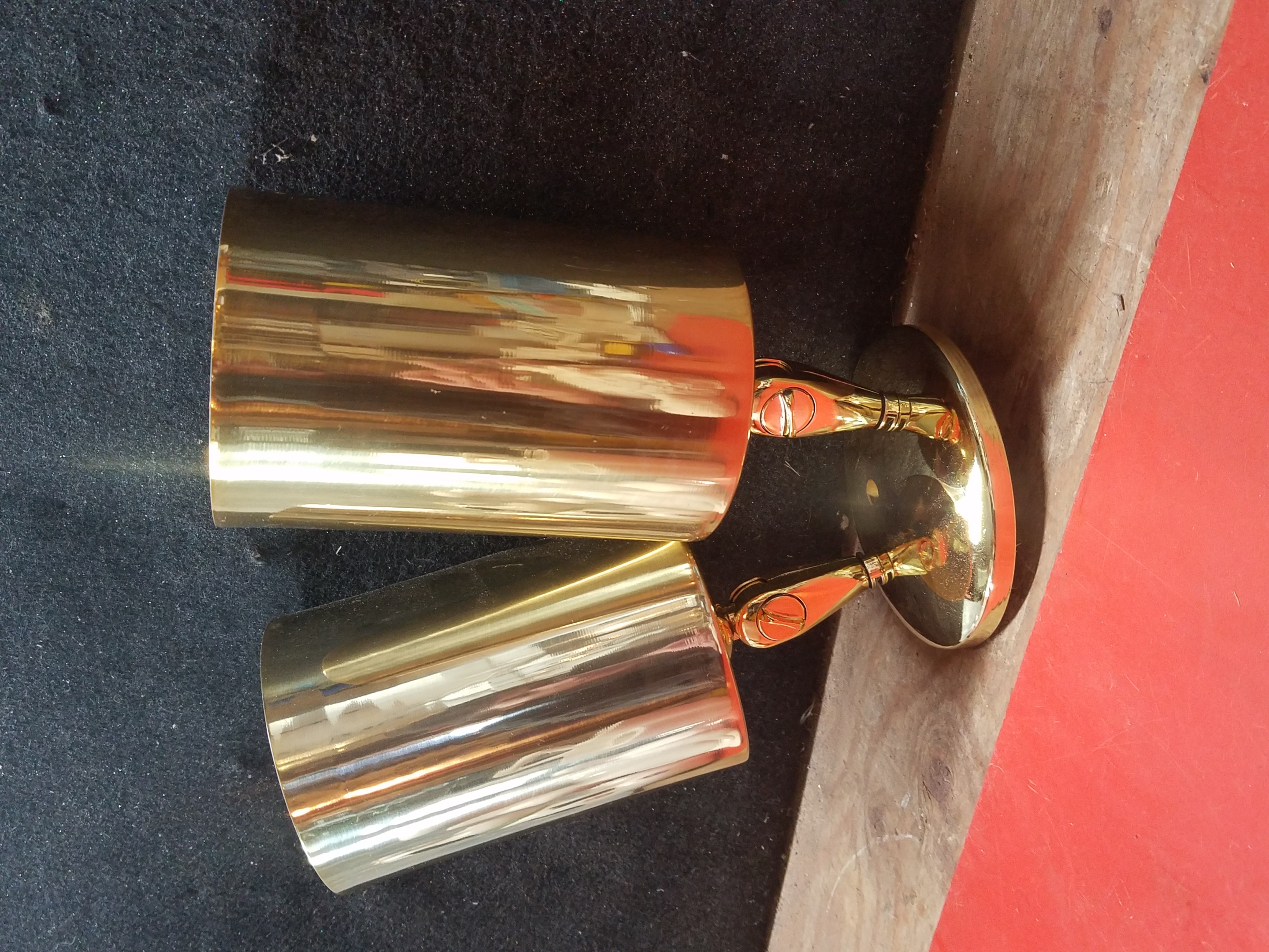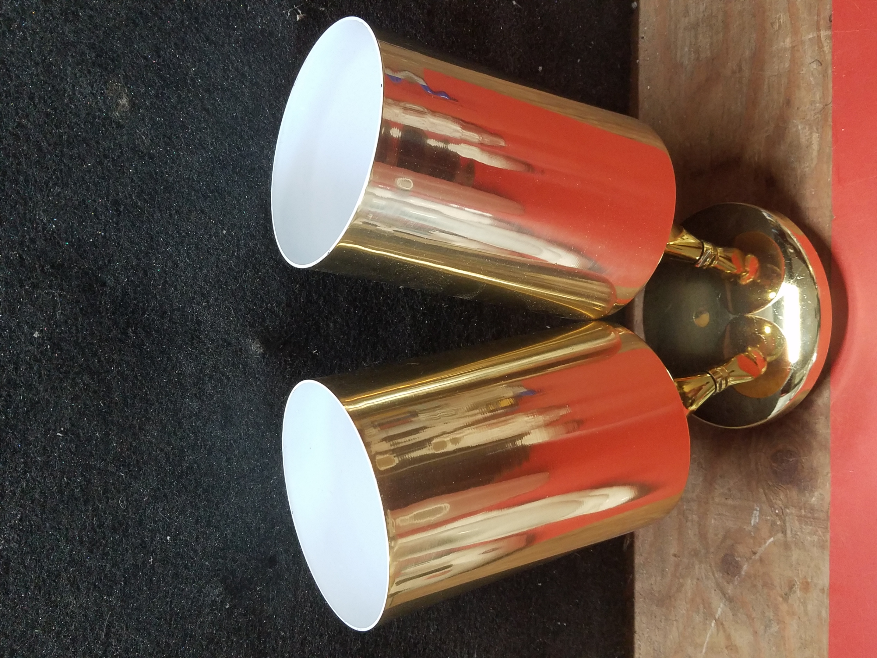 Contemporary cylindrical dual socket spotlight fixture with a lightweight aluminum mount sporting a shiny metallic gold finish. There are two dial-switches located on the arms to adjust and reposition the direction of the lights.
