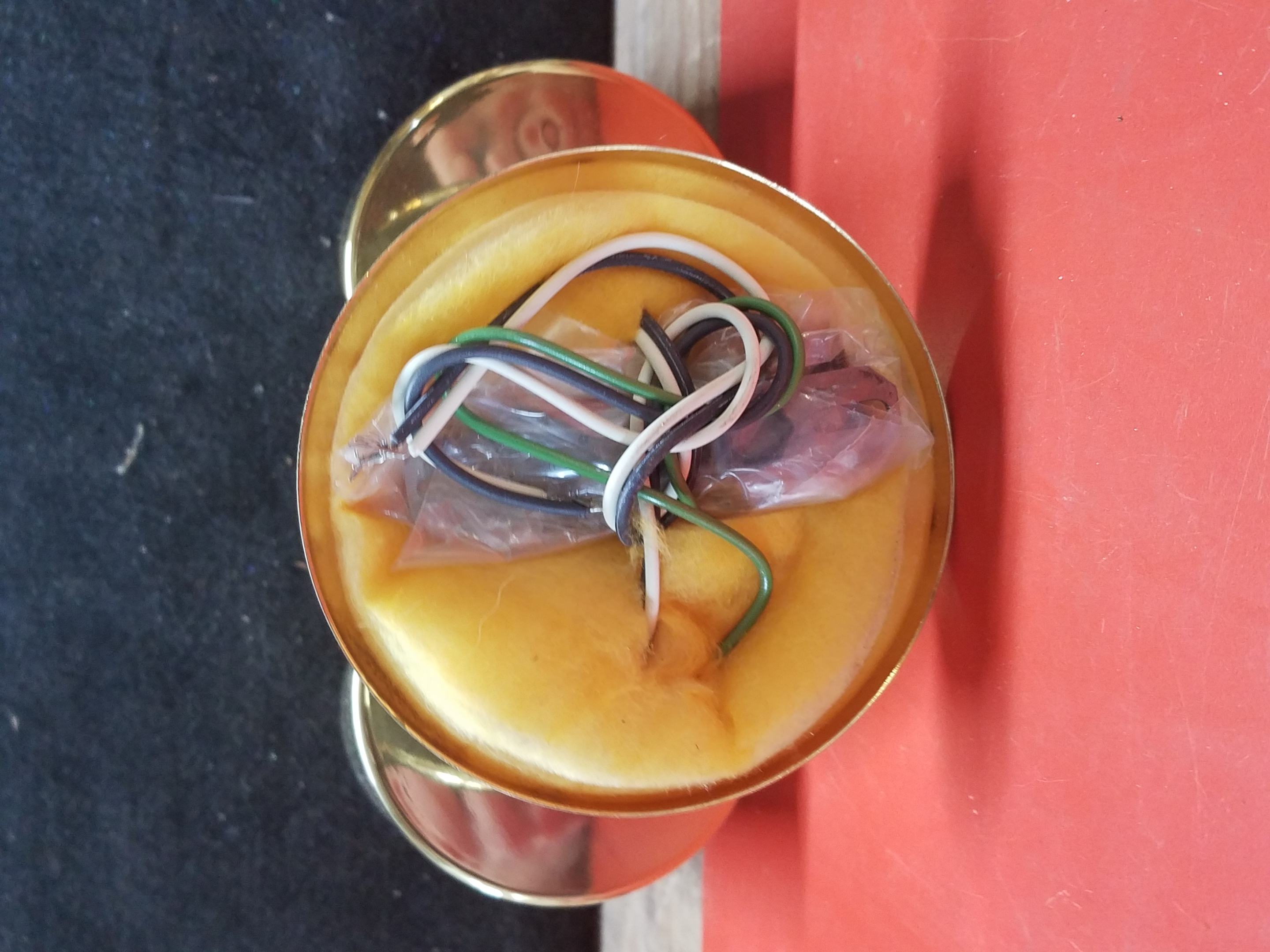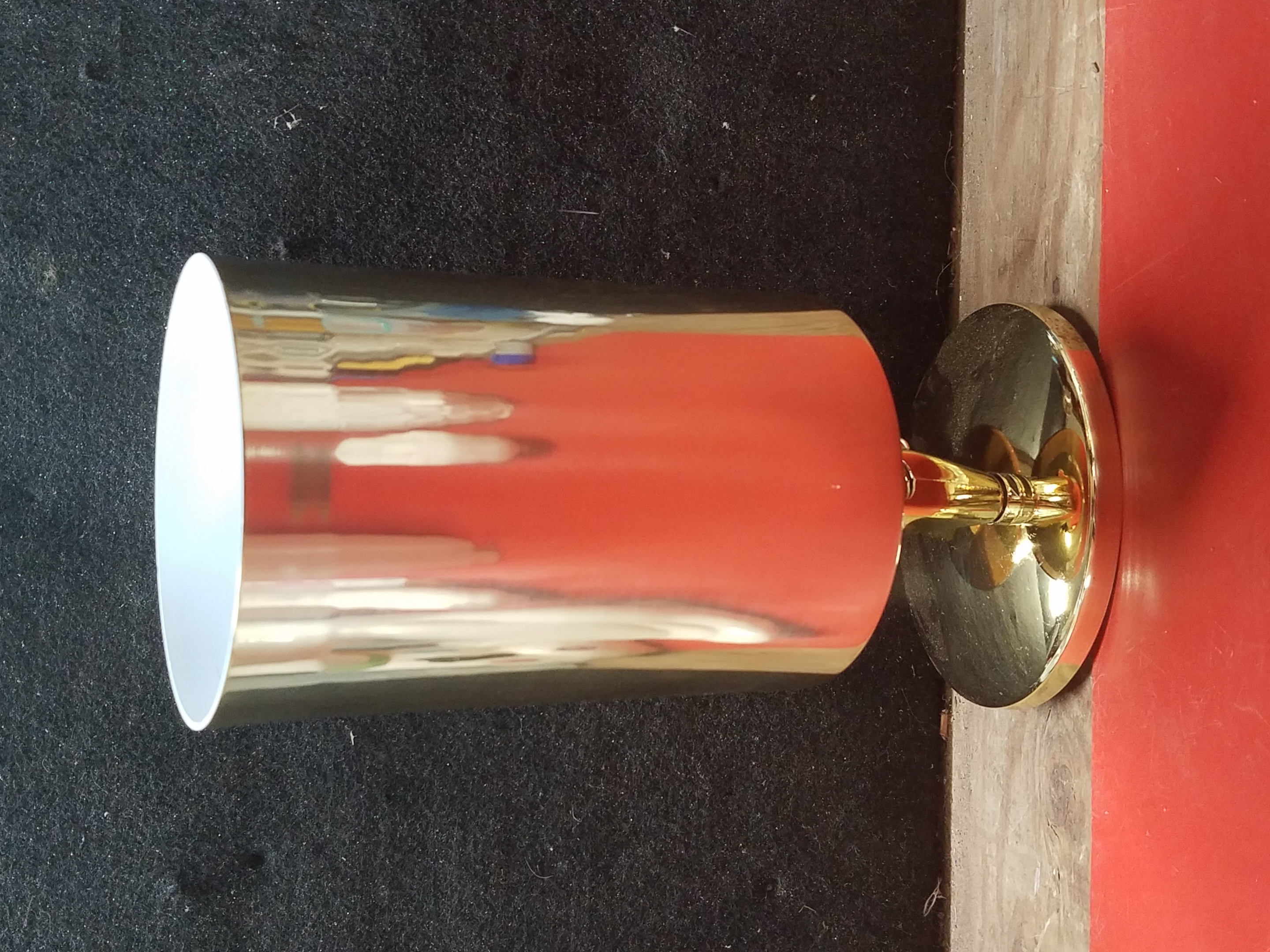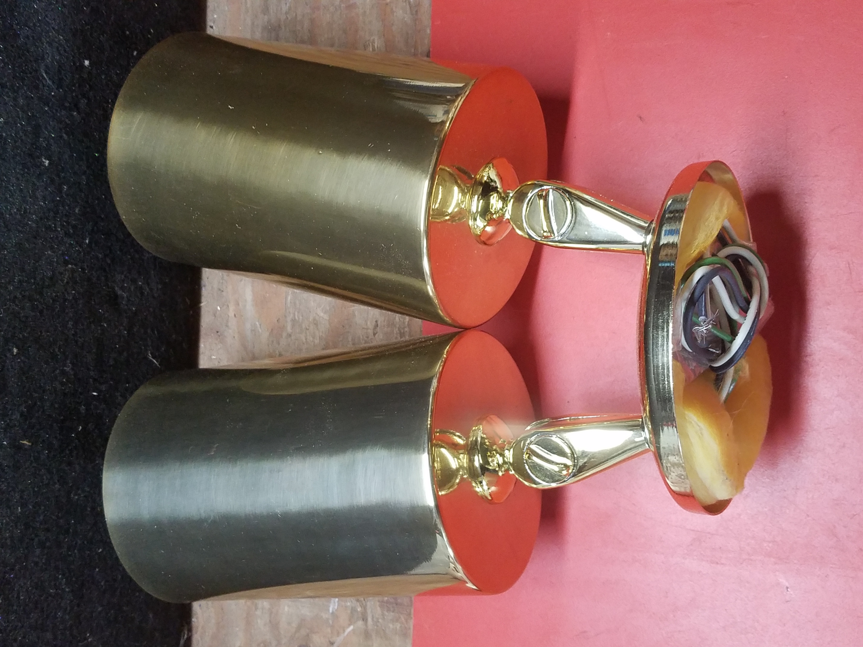 Contemporary cylindrical dual socket spotlight fixture with a lightweight aluminum mount sporting a shiny metallic gold finish. There are two dial-switches located on the arms to adjust and reposition the direction of the lights.