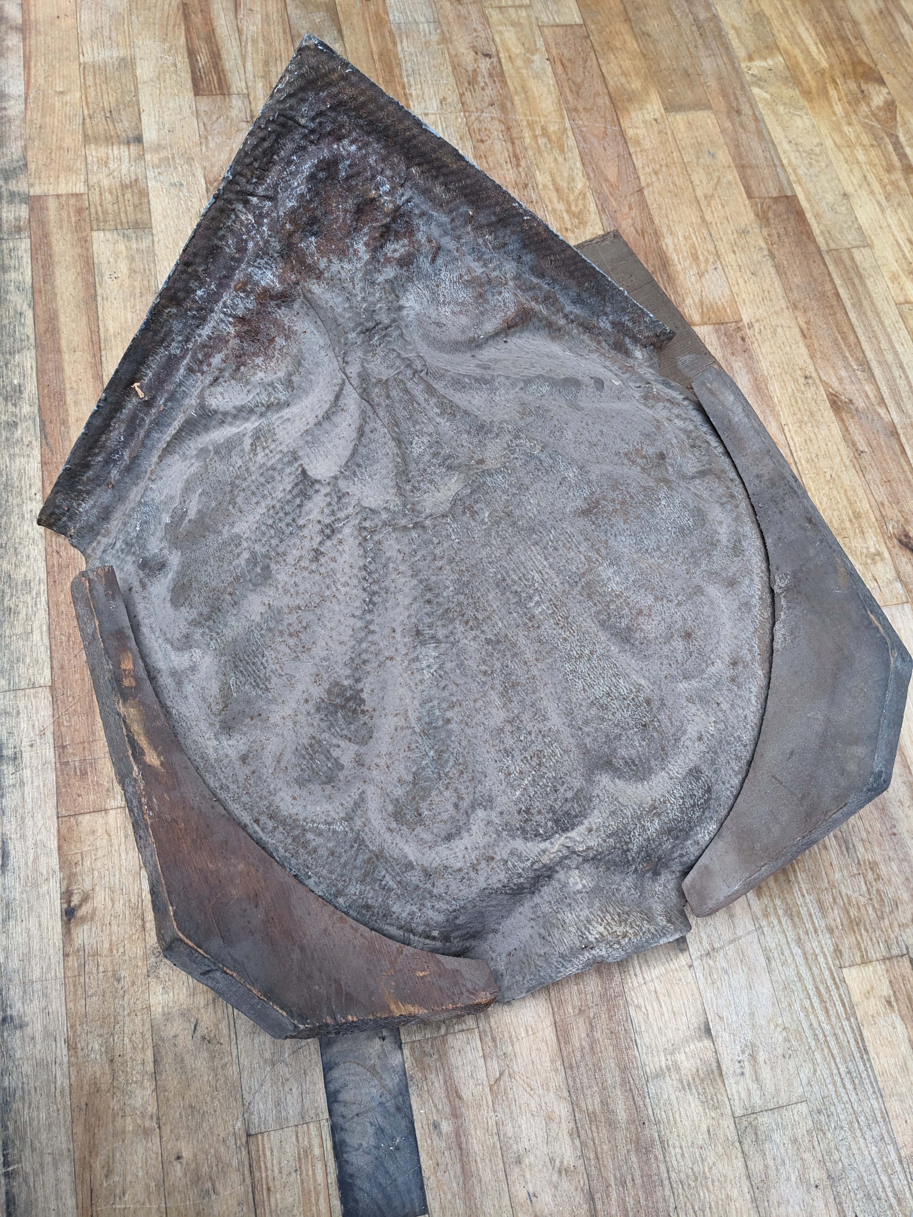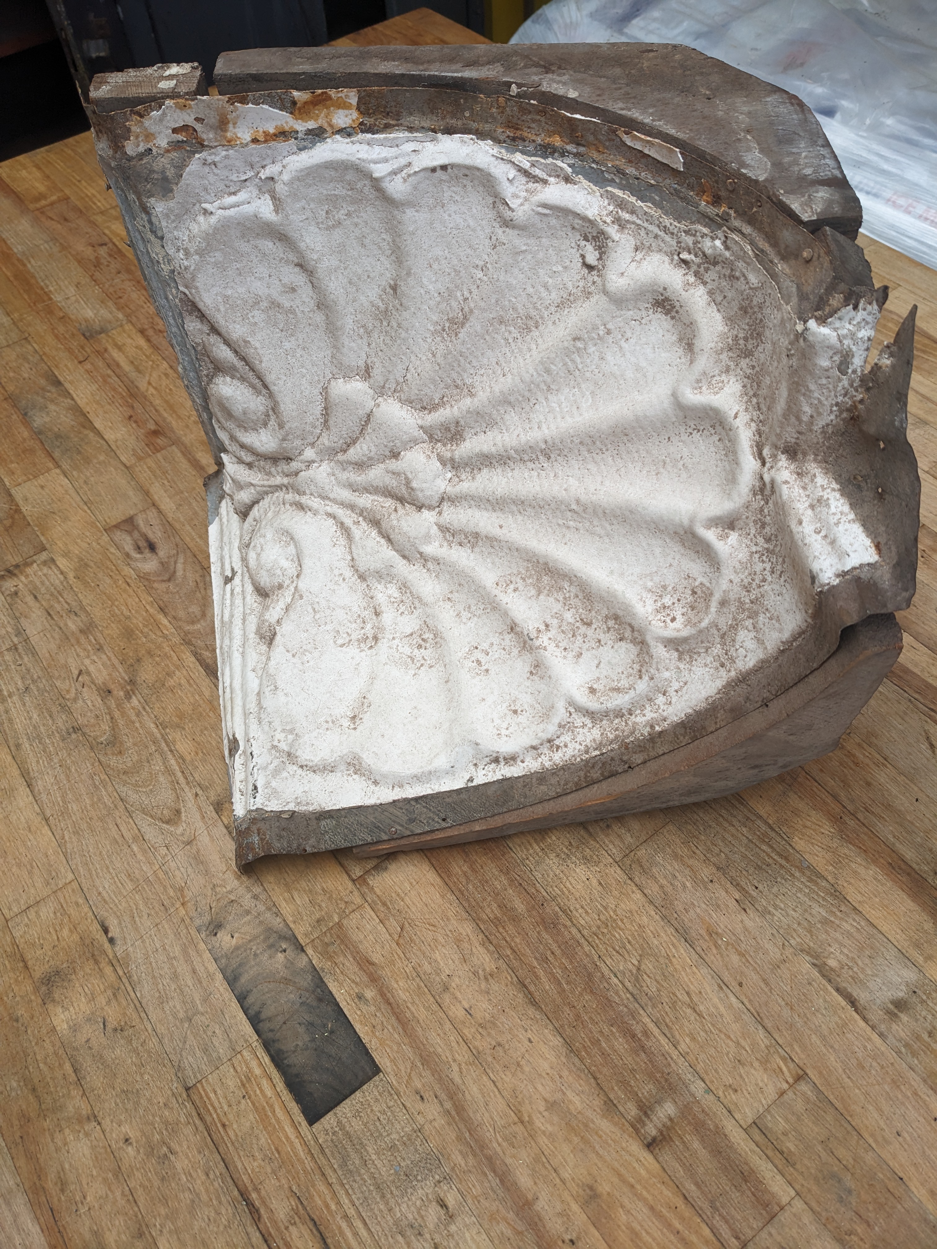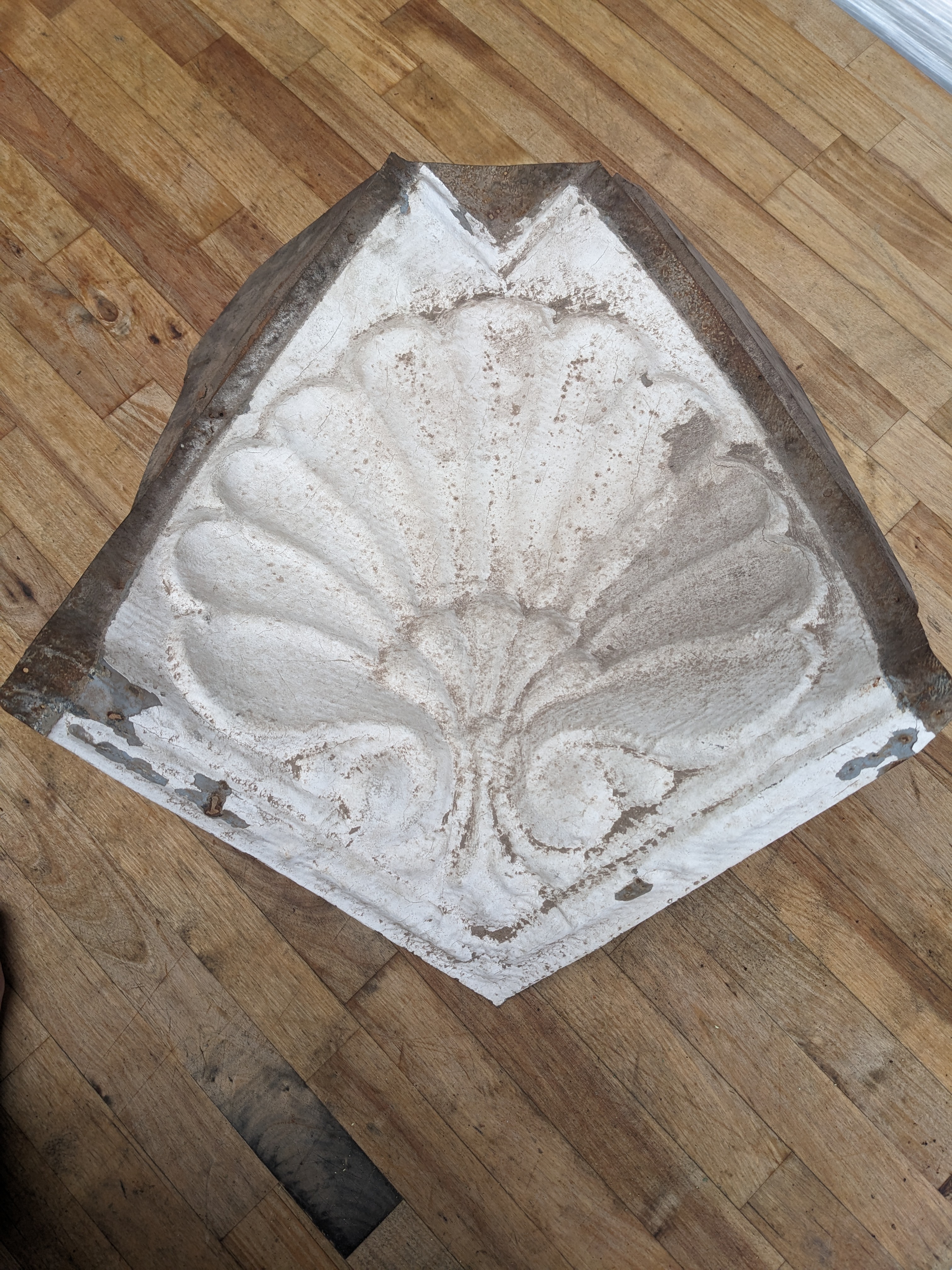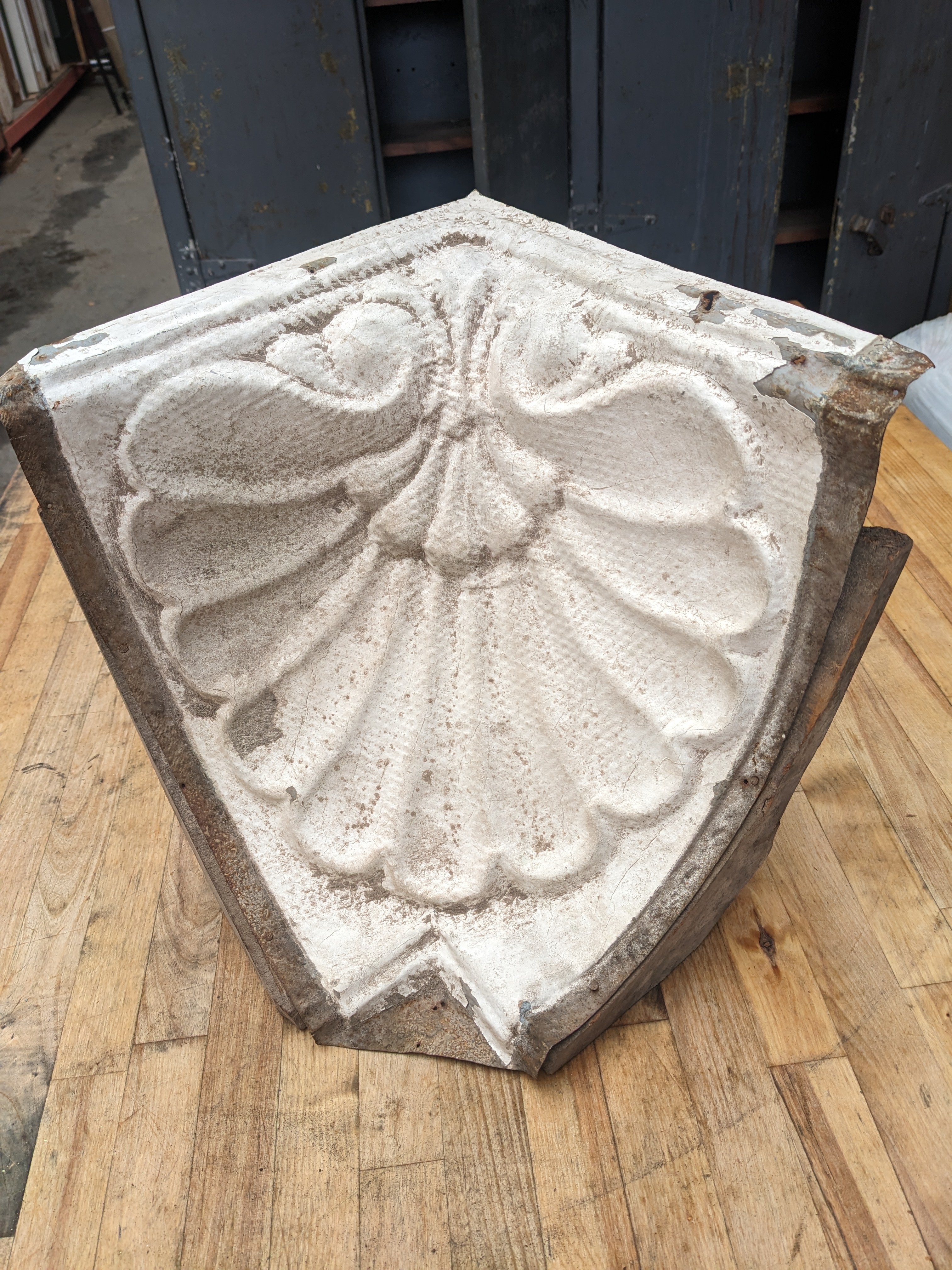 This corner tin ceiling tile measures 11.25 x 12.5 x 2. It is painted while with a shell inspired face plate design. Some of the original wood is attached but may need some refurbishing. Some rust, nail holes and discoloration is present.