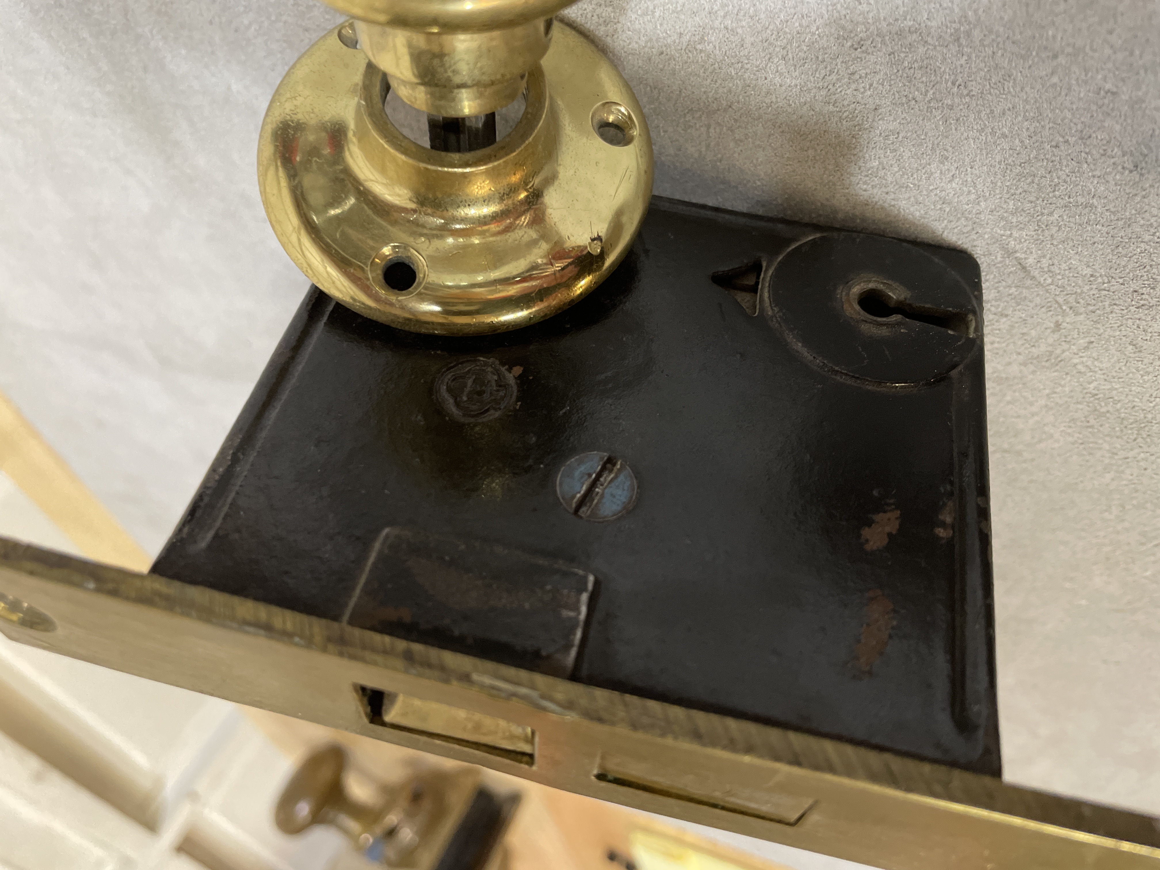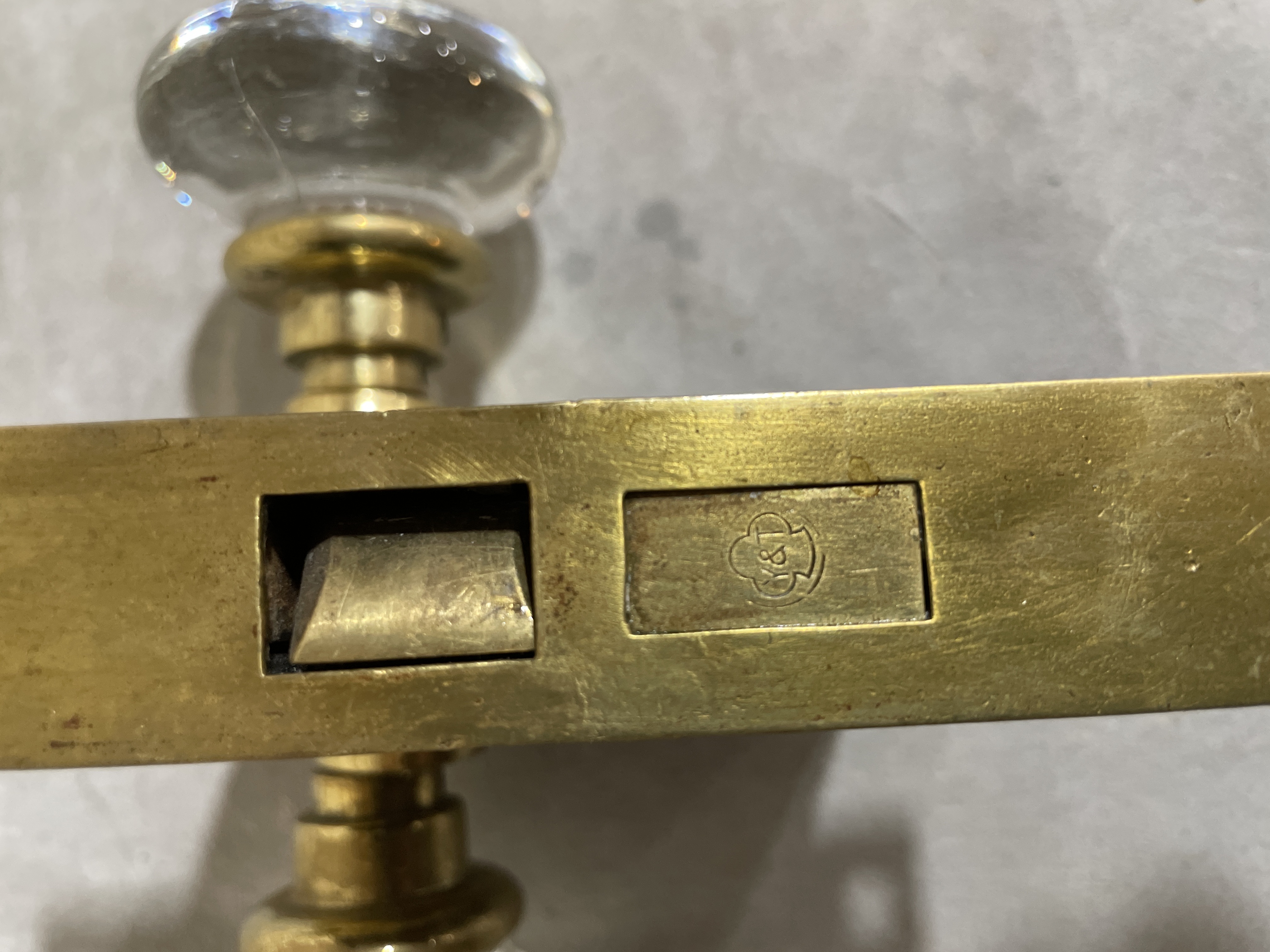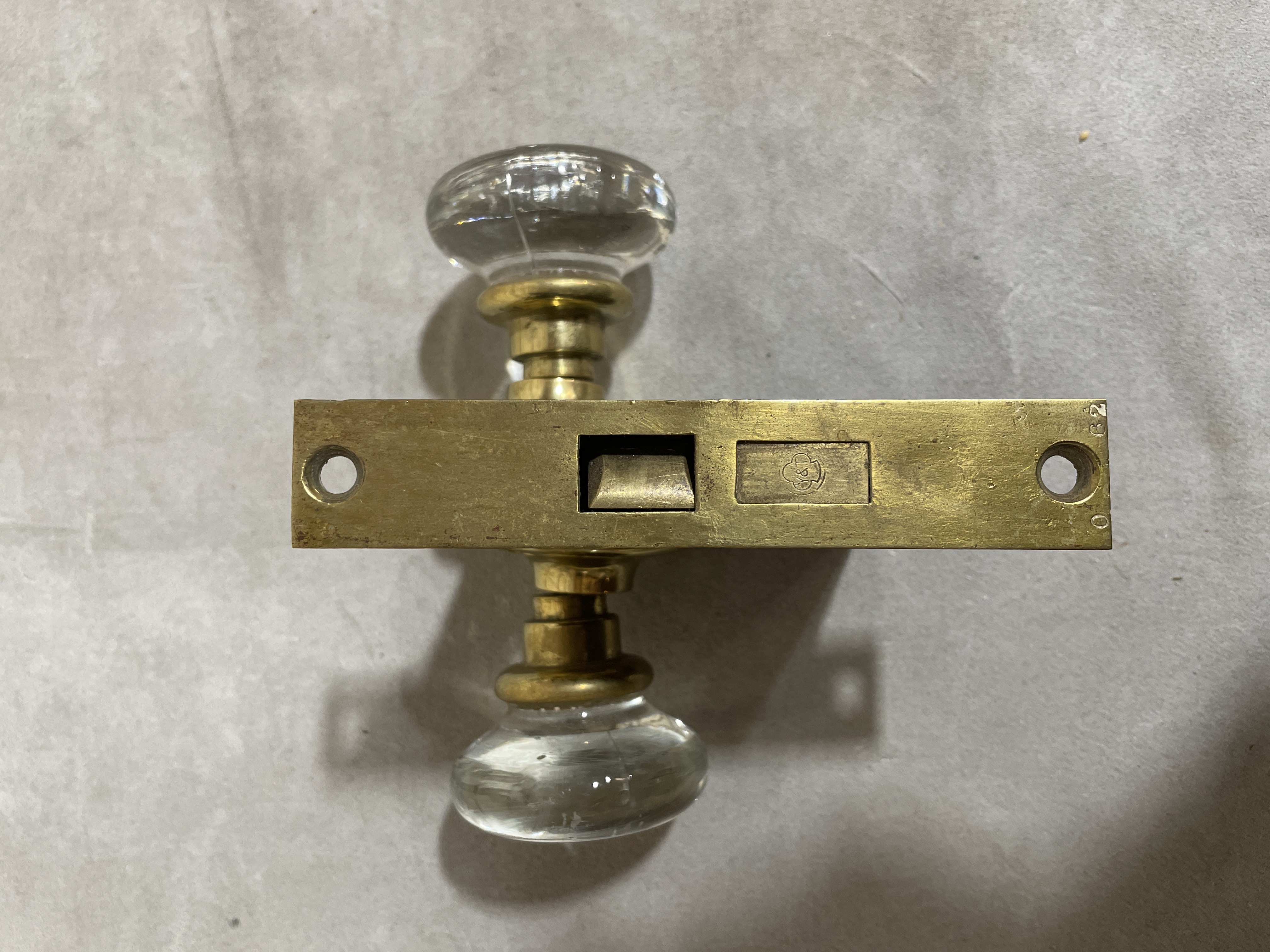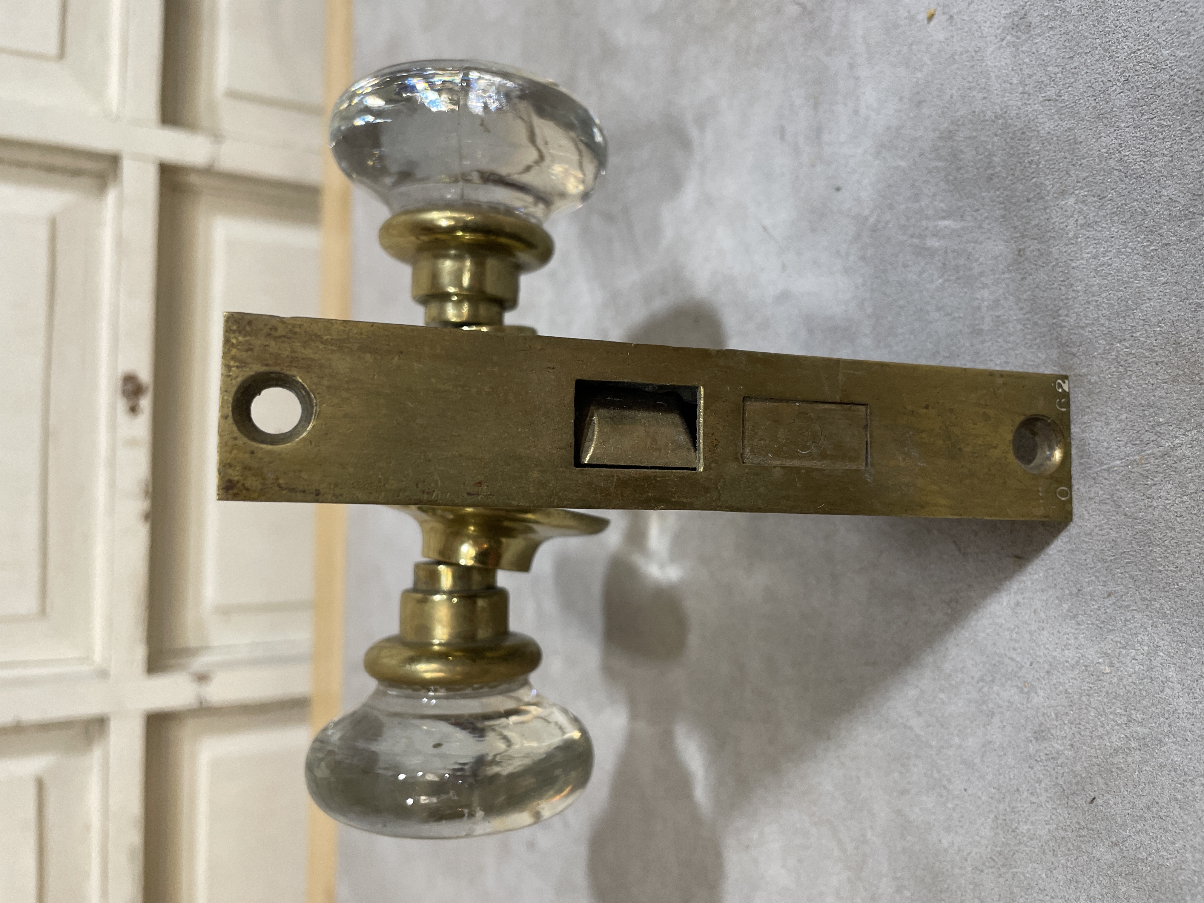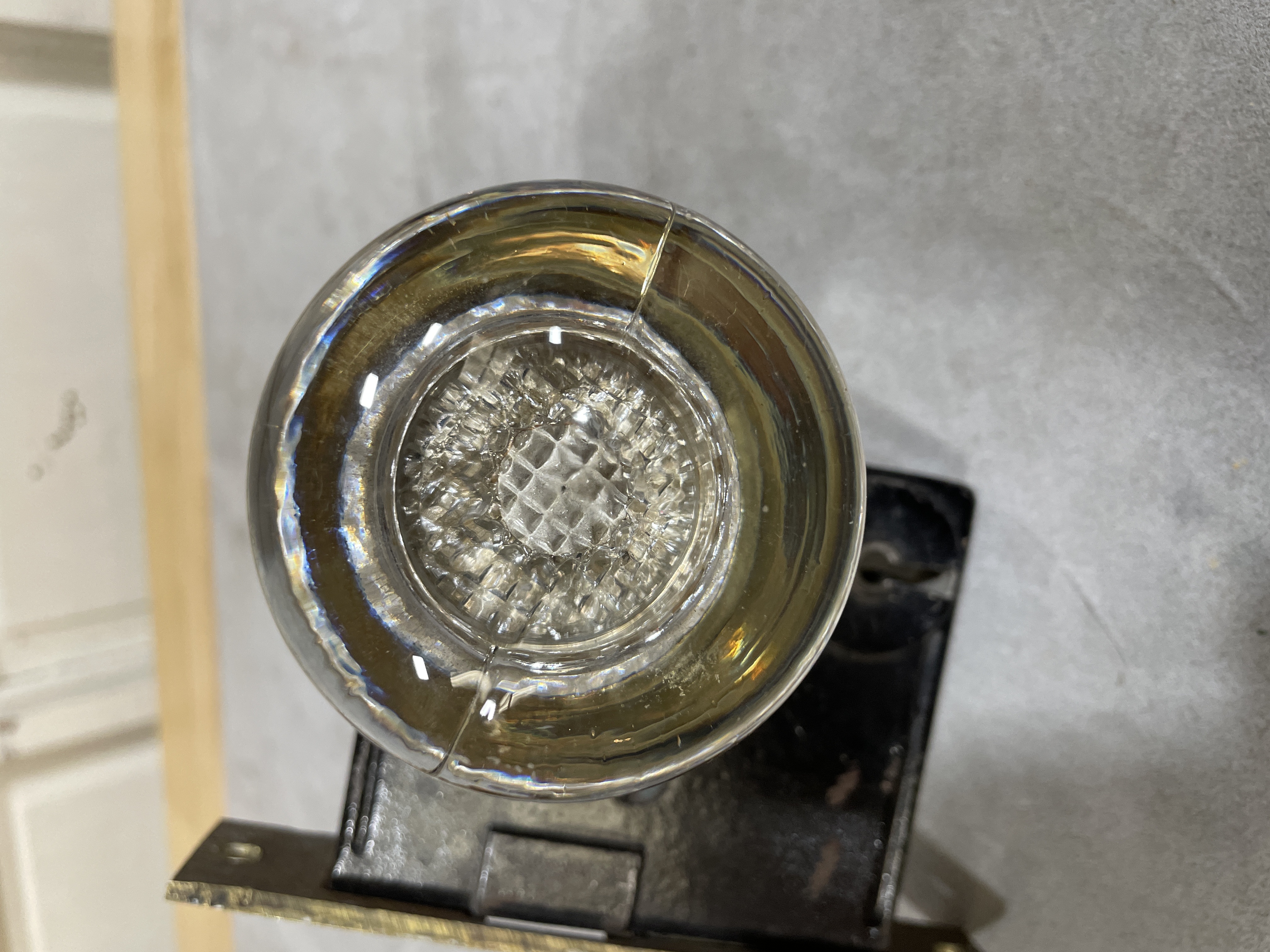Brass hardware with Manganese glass knobs. Manganese will turn purple in prolonged sun exposure. In fair condition.