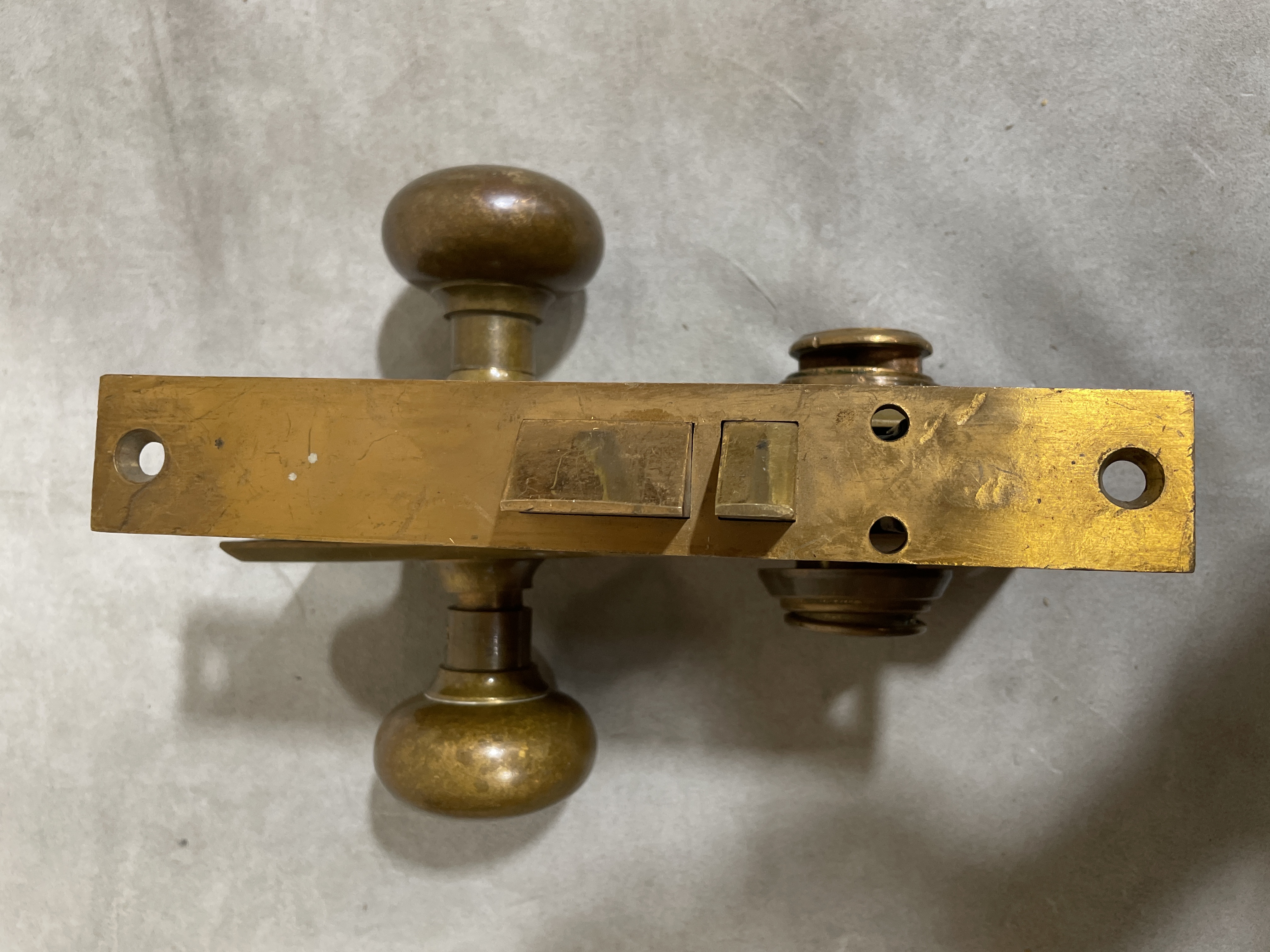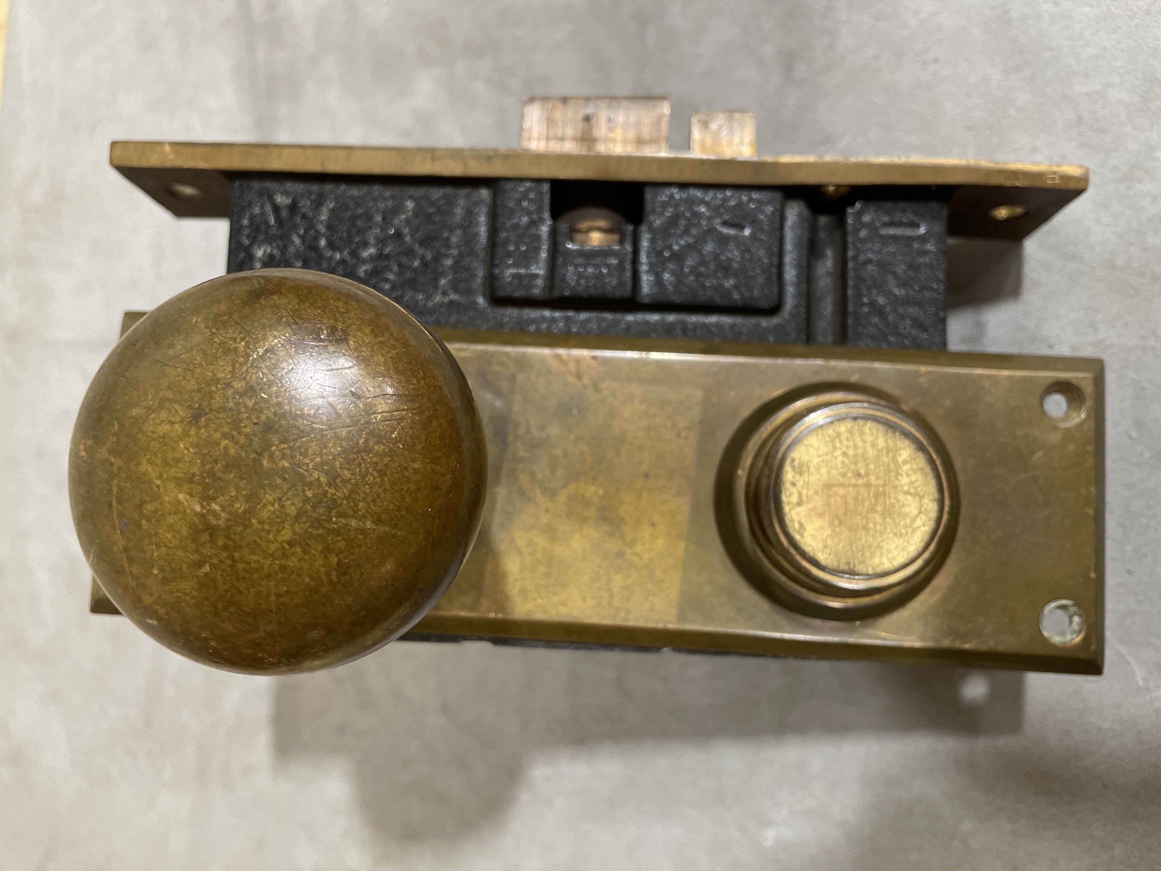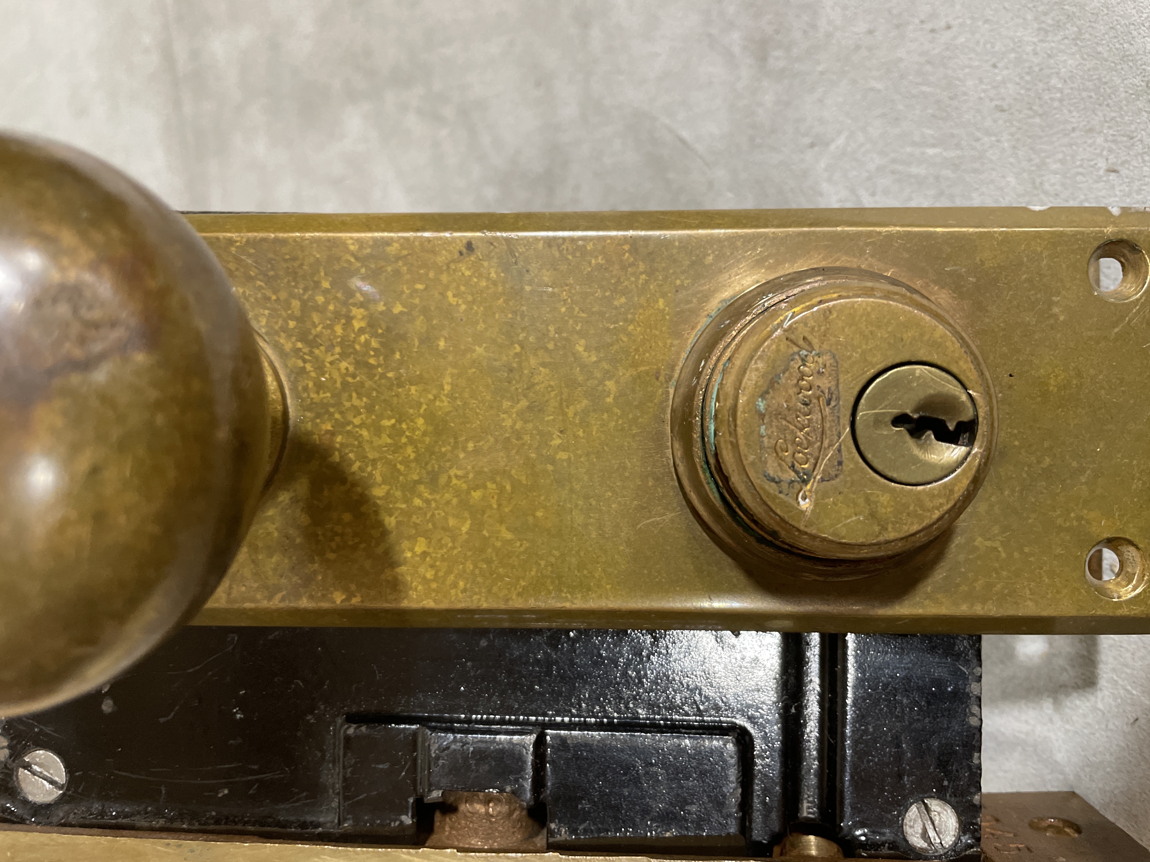 Solid brass plate and knobs. Nice patina. Shows wear and lock is scratched. In fair condition.