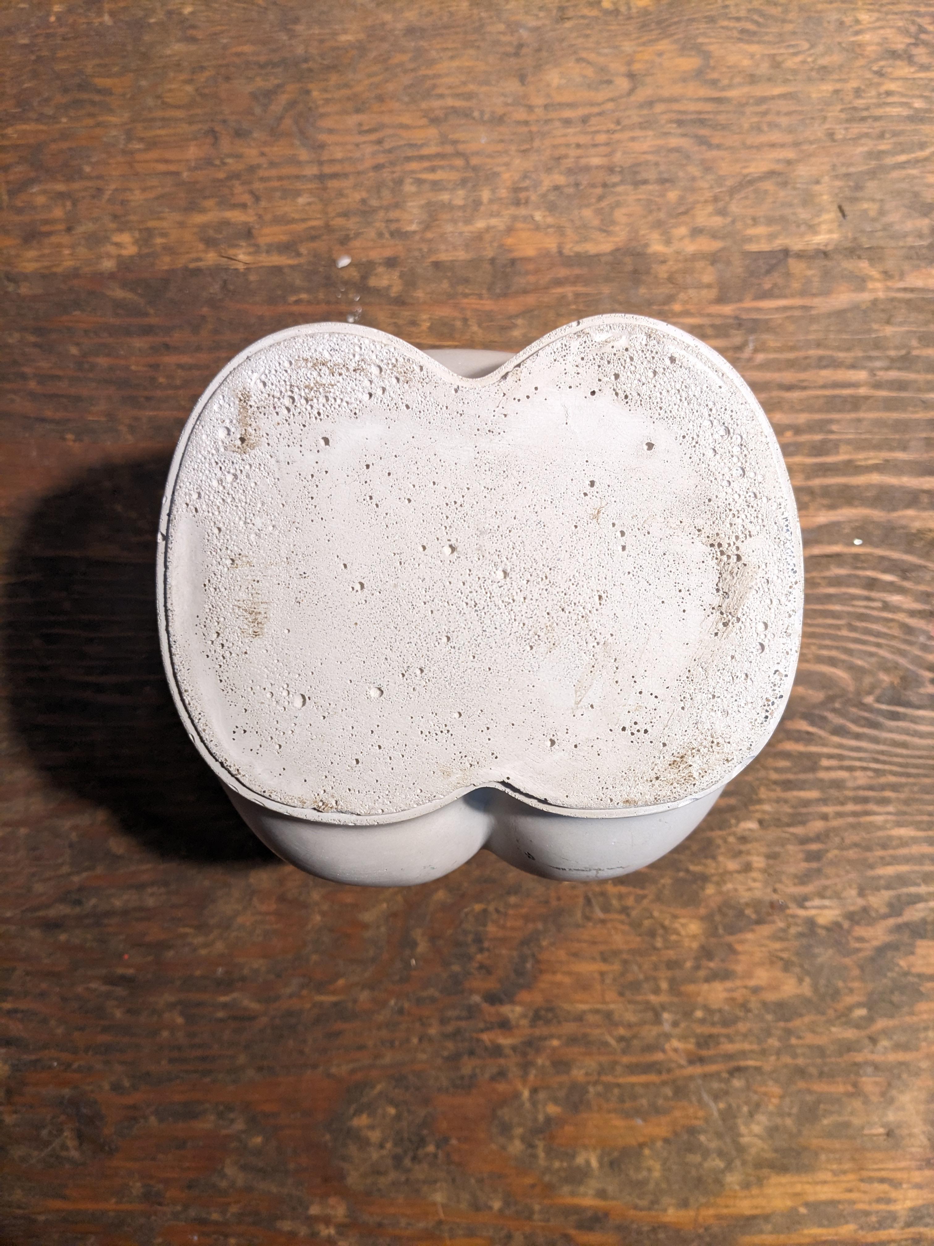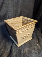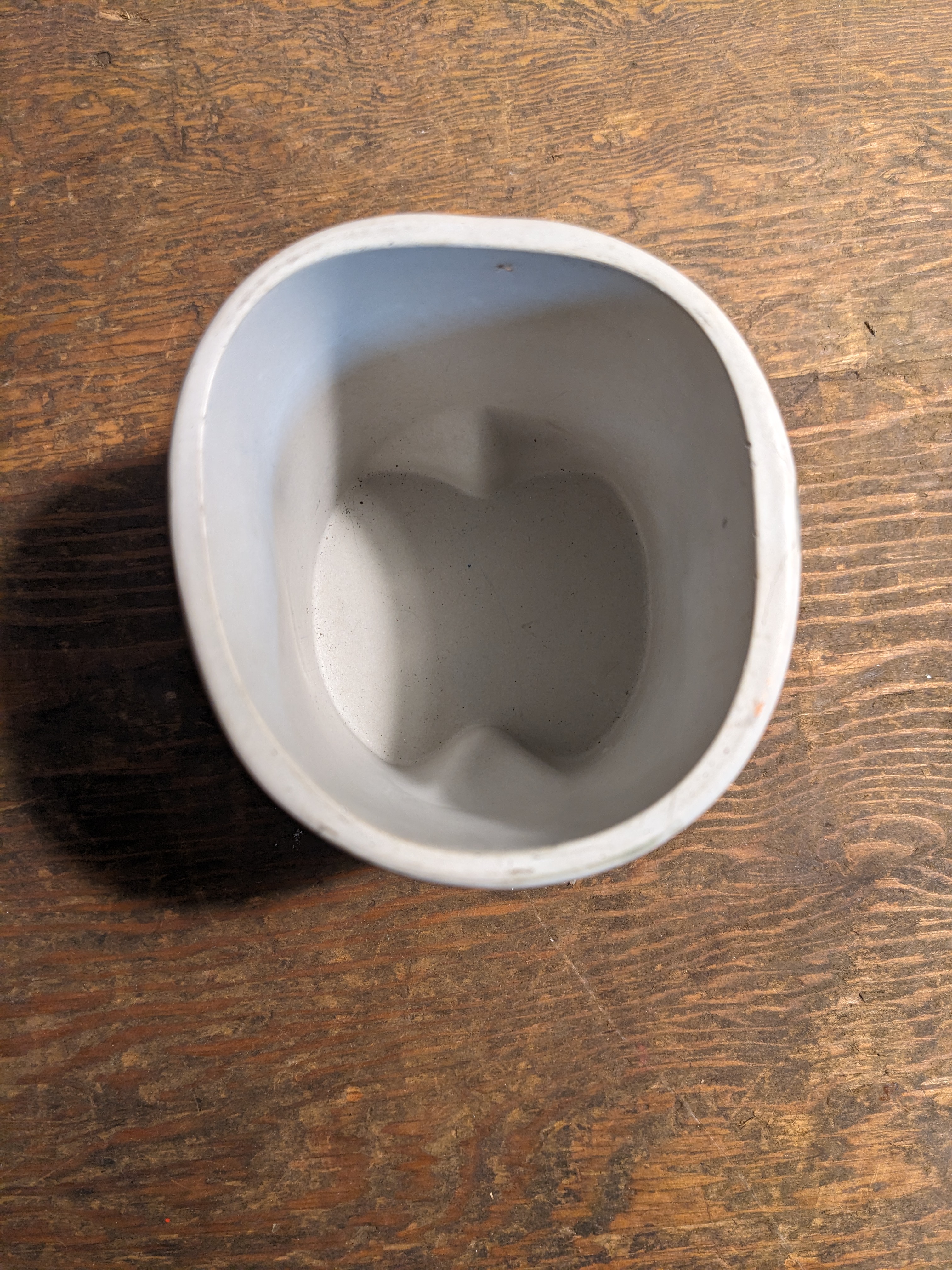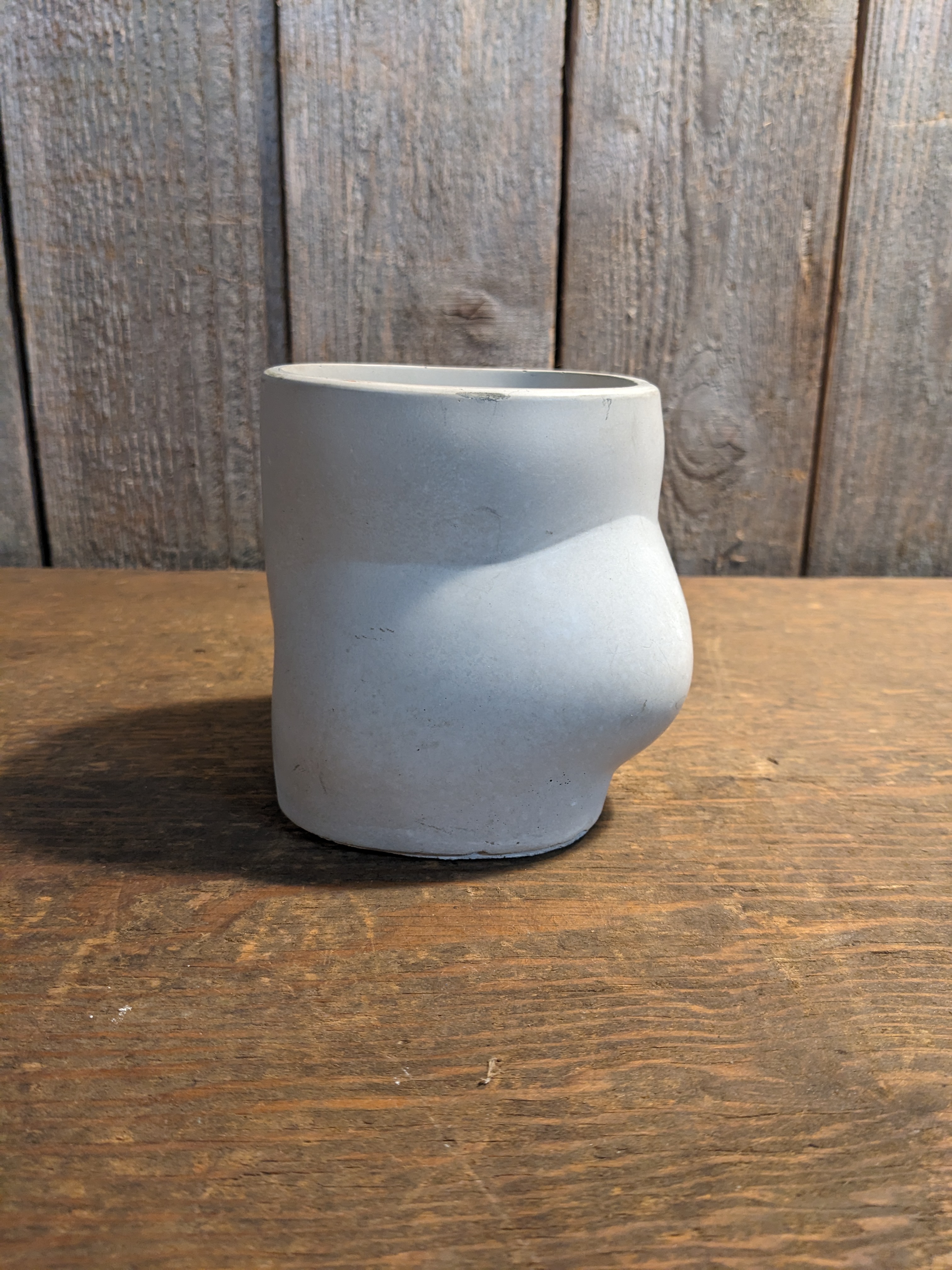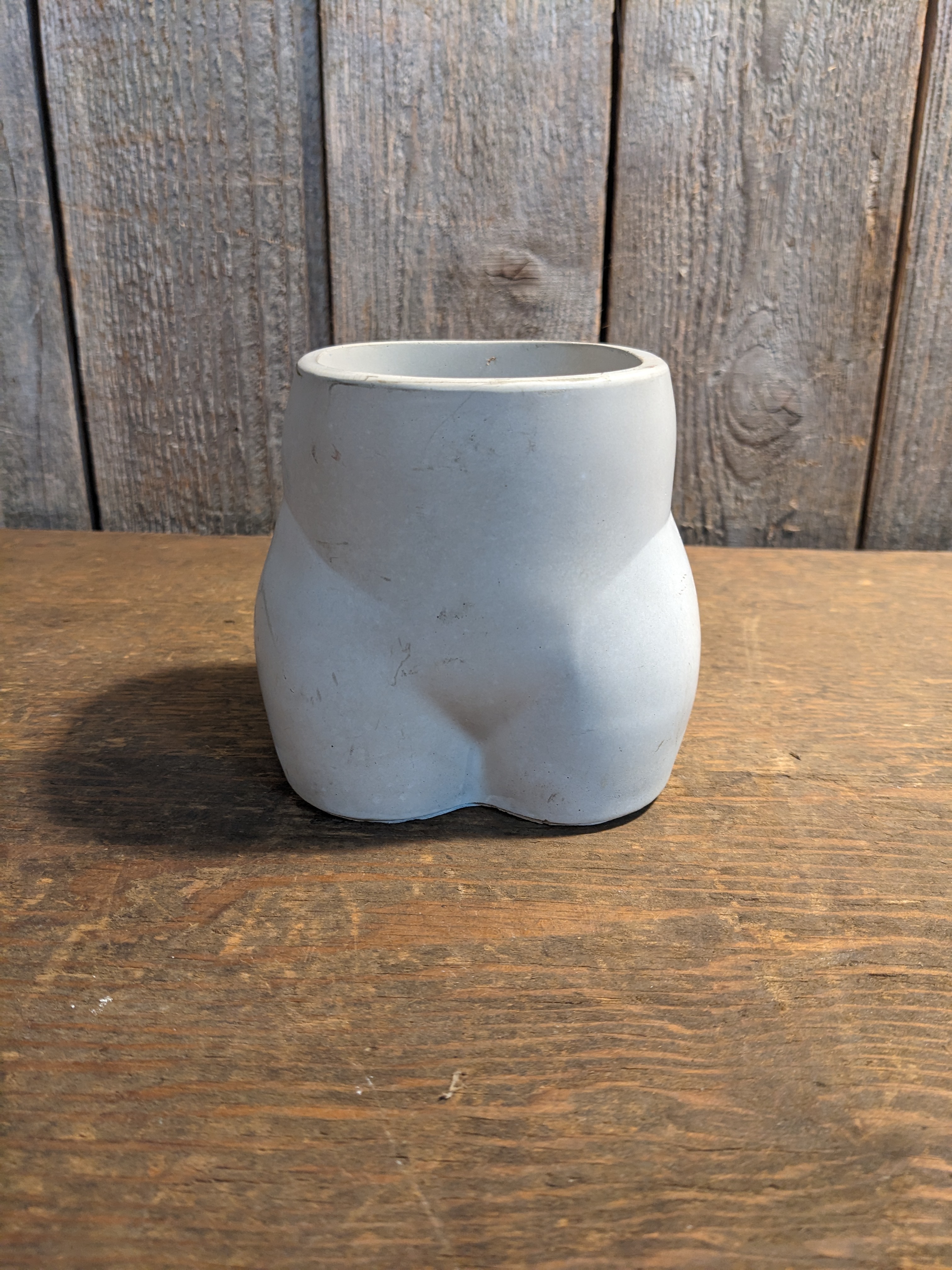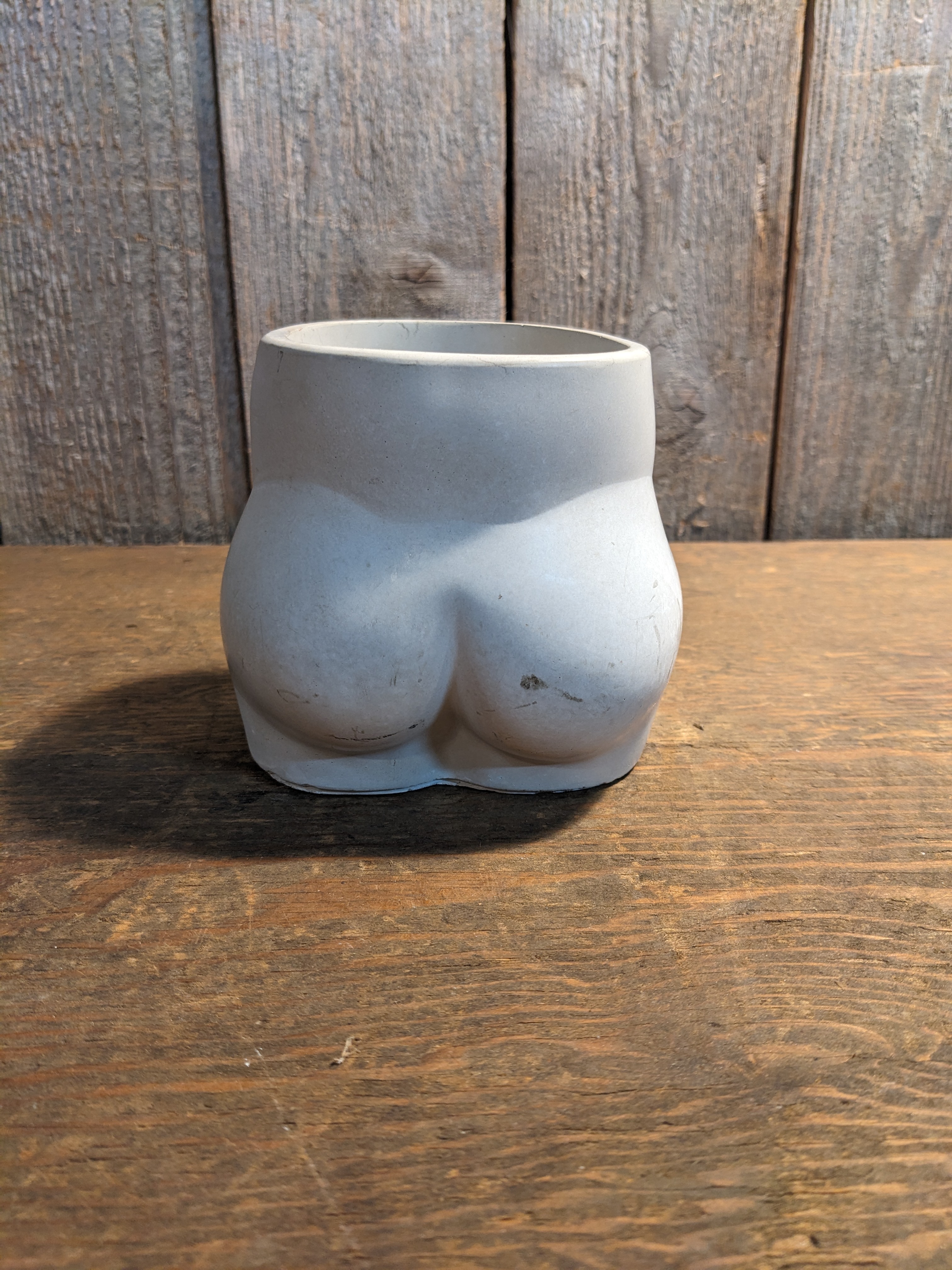 A small planter in the shape of... well. A butt. This planter is in great condition with just a bit of wear and some scuffs. It measures 4.25 x 4.125 x 4.125 inches.