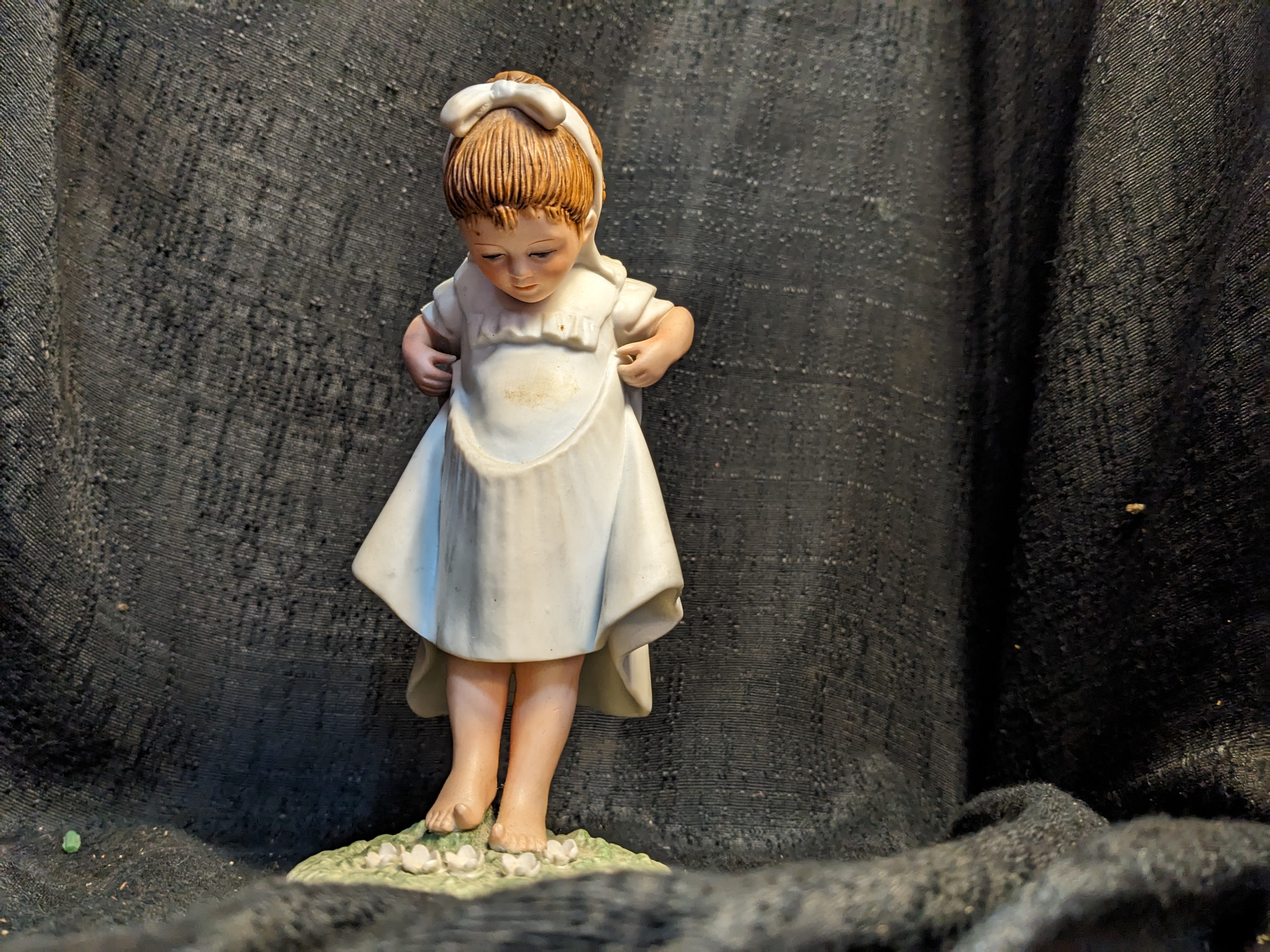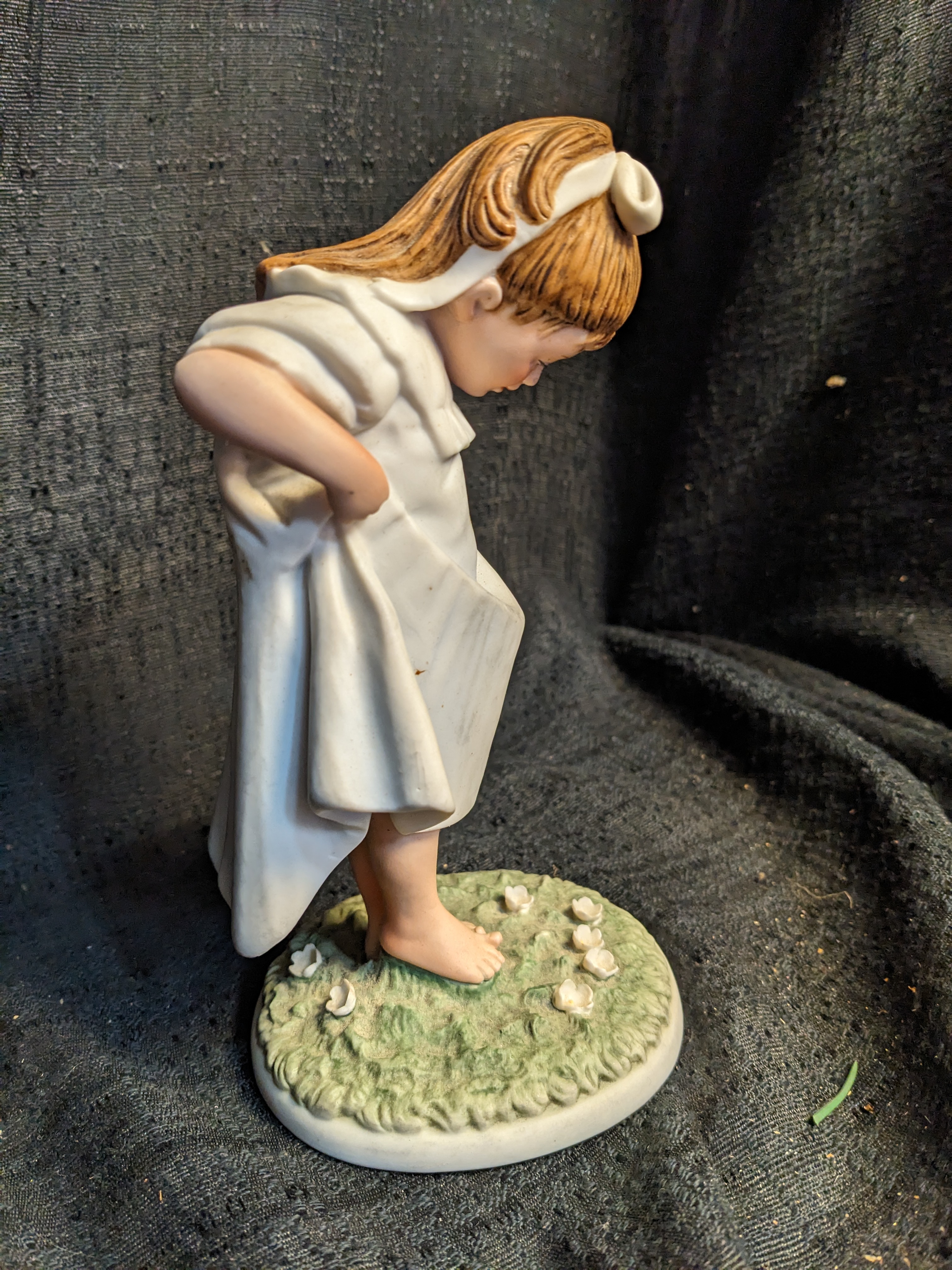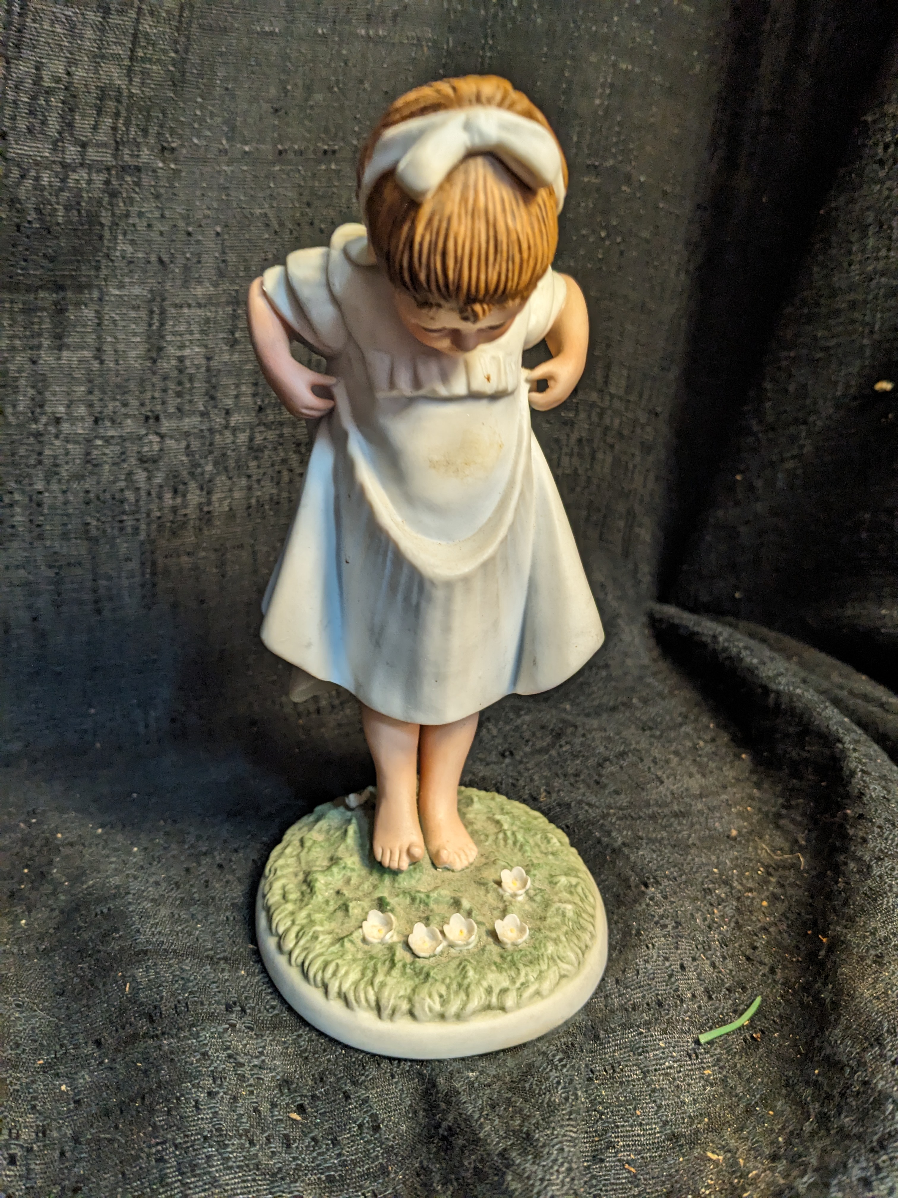 A weird and oddly delightful sculpture of a curious girl looking down at the ground, perhaps contemplating life, or a pretty caterpillar on the ground. In good condition, no chips or cracks. Halloween decor!