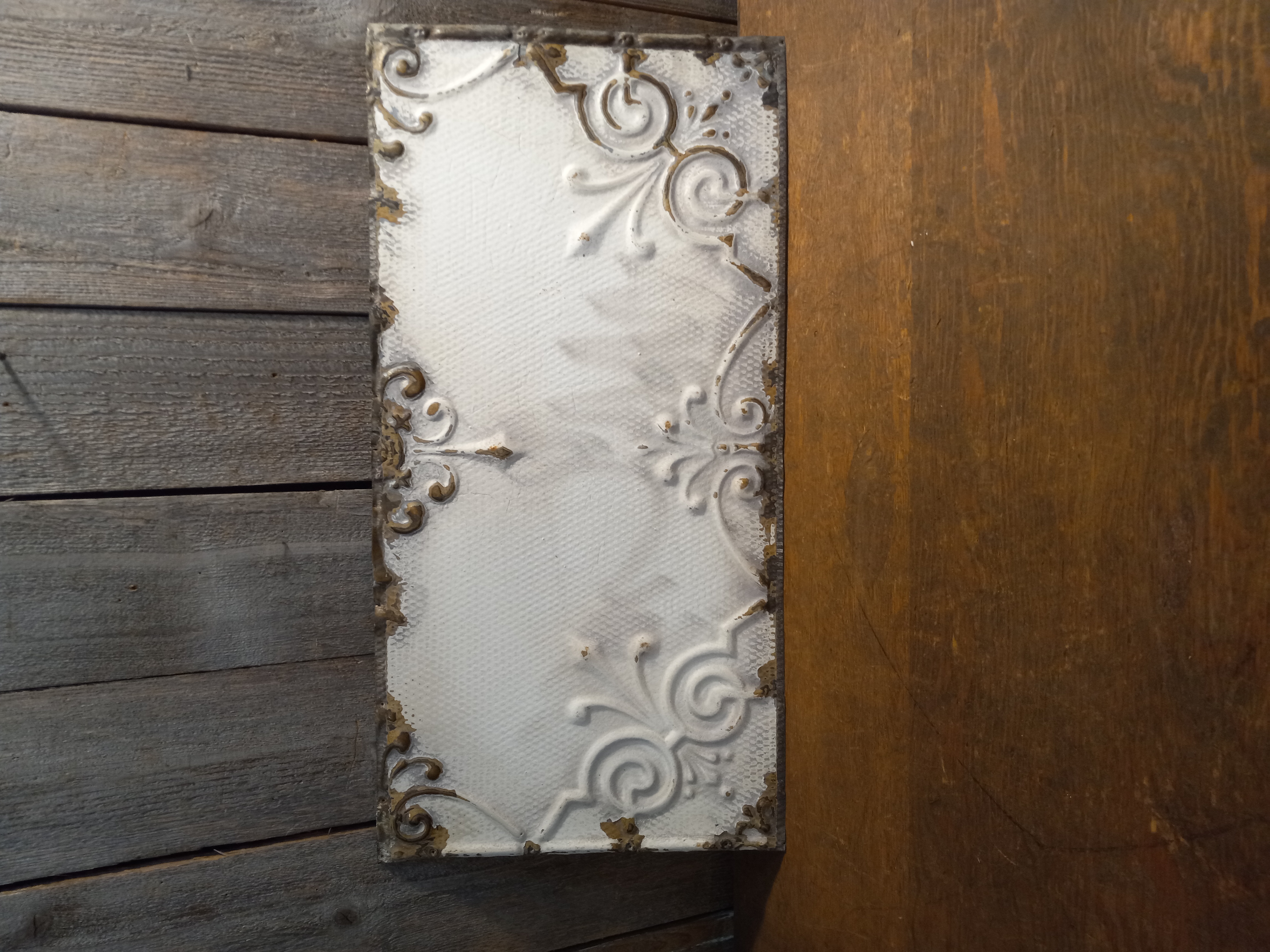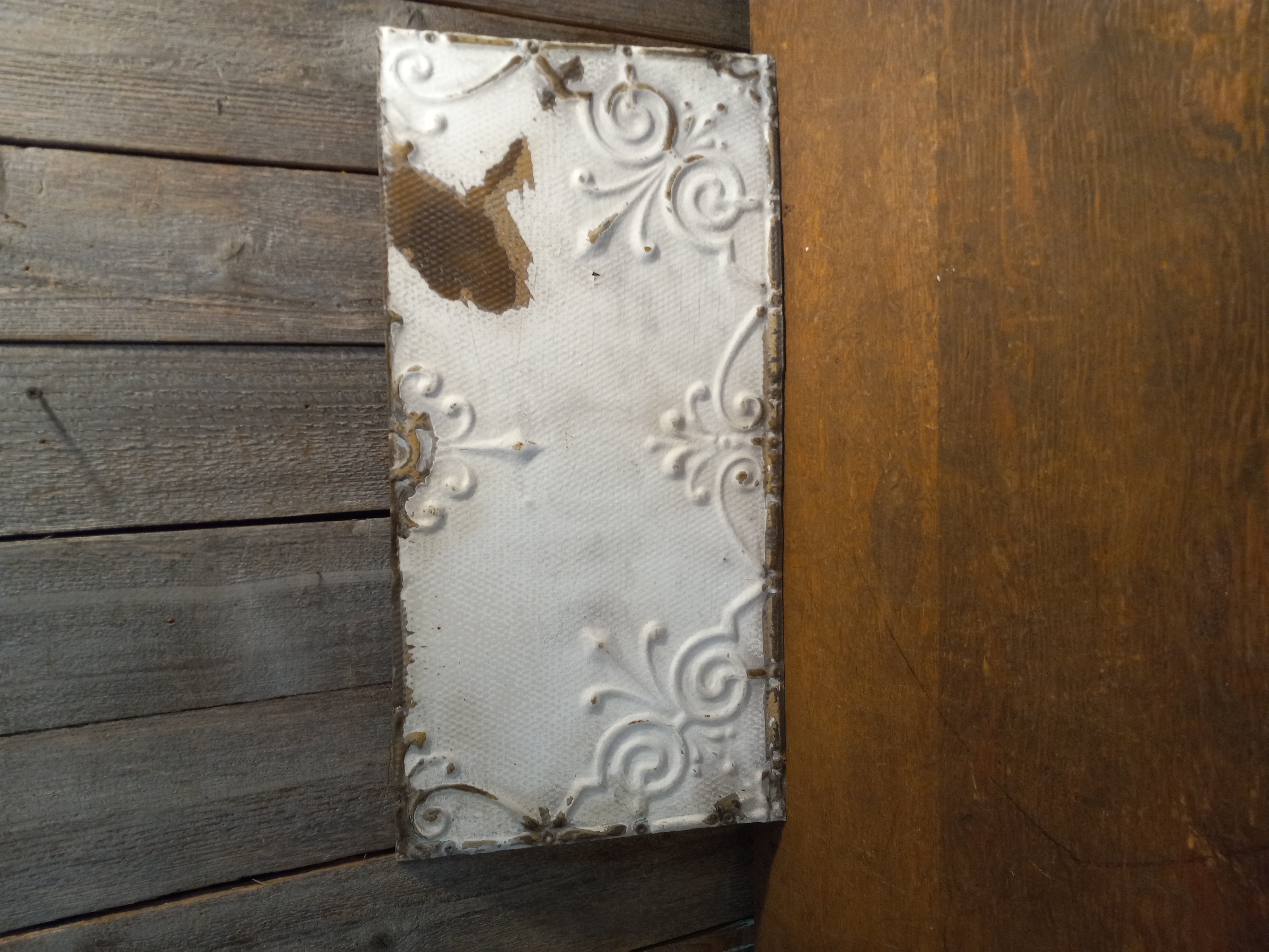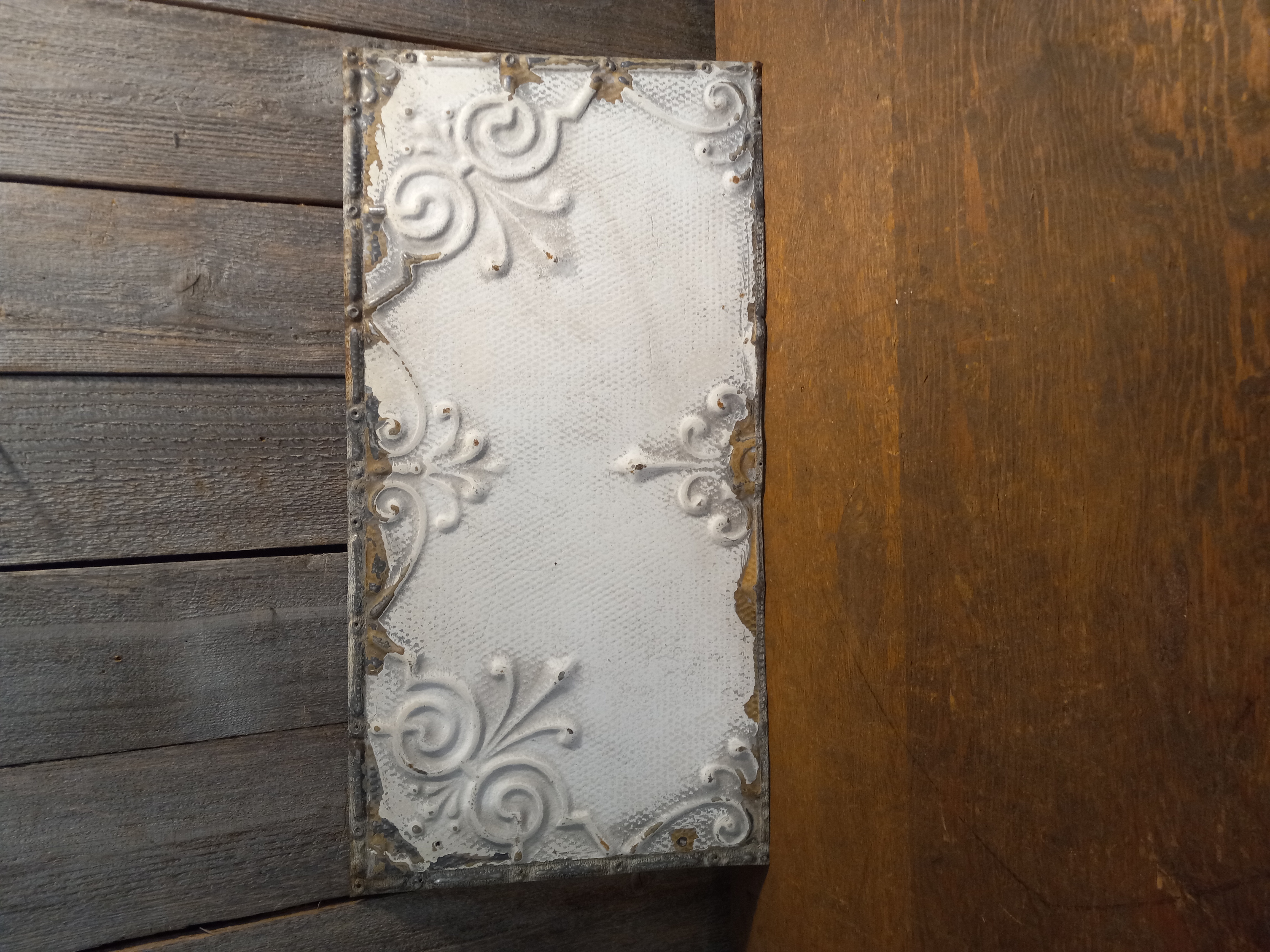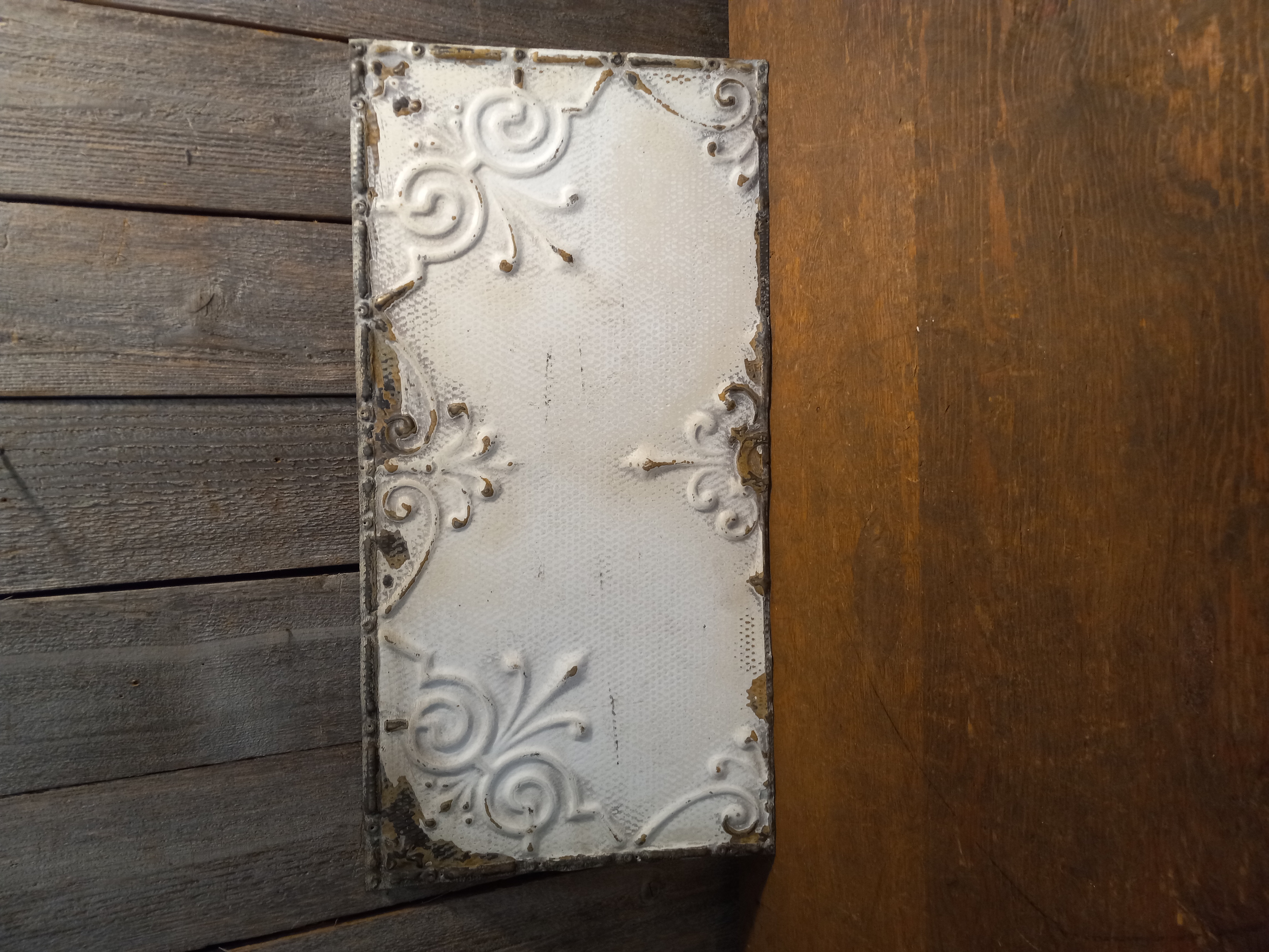 These rectangle antique tin ceiling tiles are in fair to good condition. Images may be representational. Each one has the same embossed pattern but each have their own slight wear and tear but they are in decent condition overall.