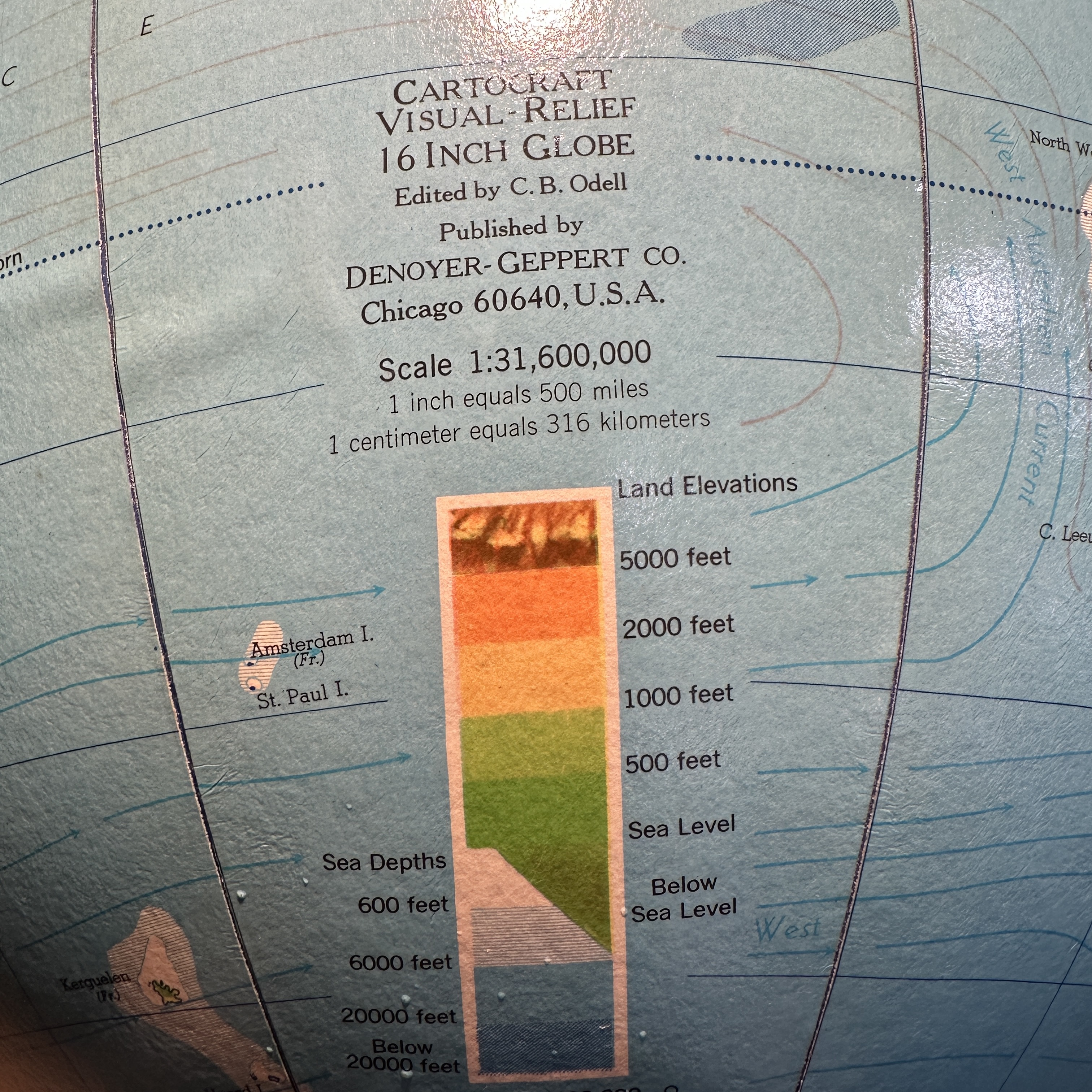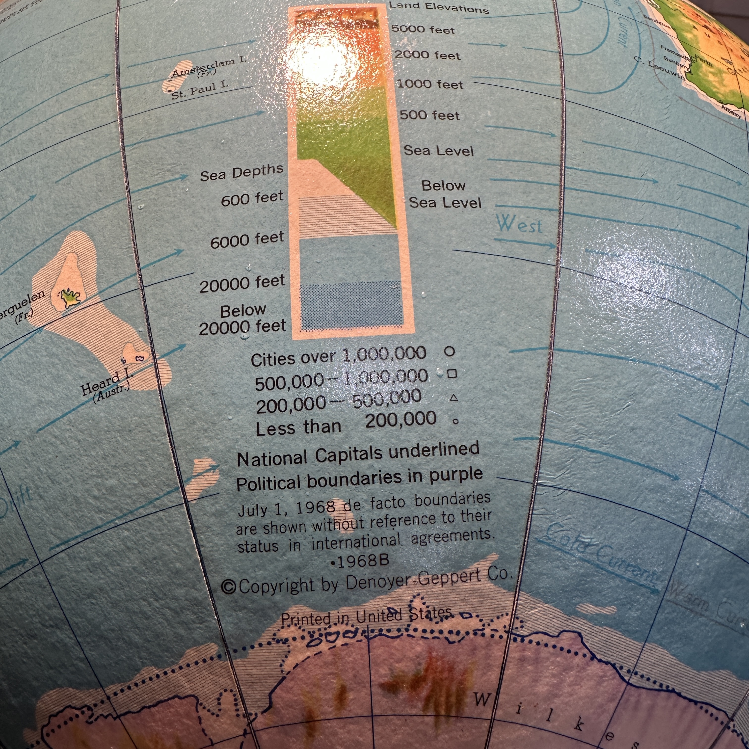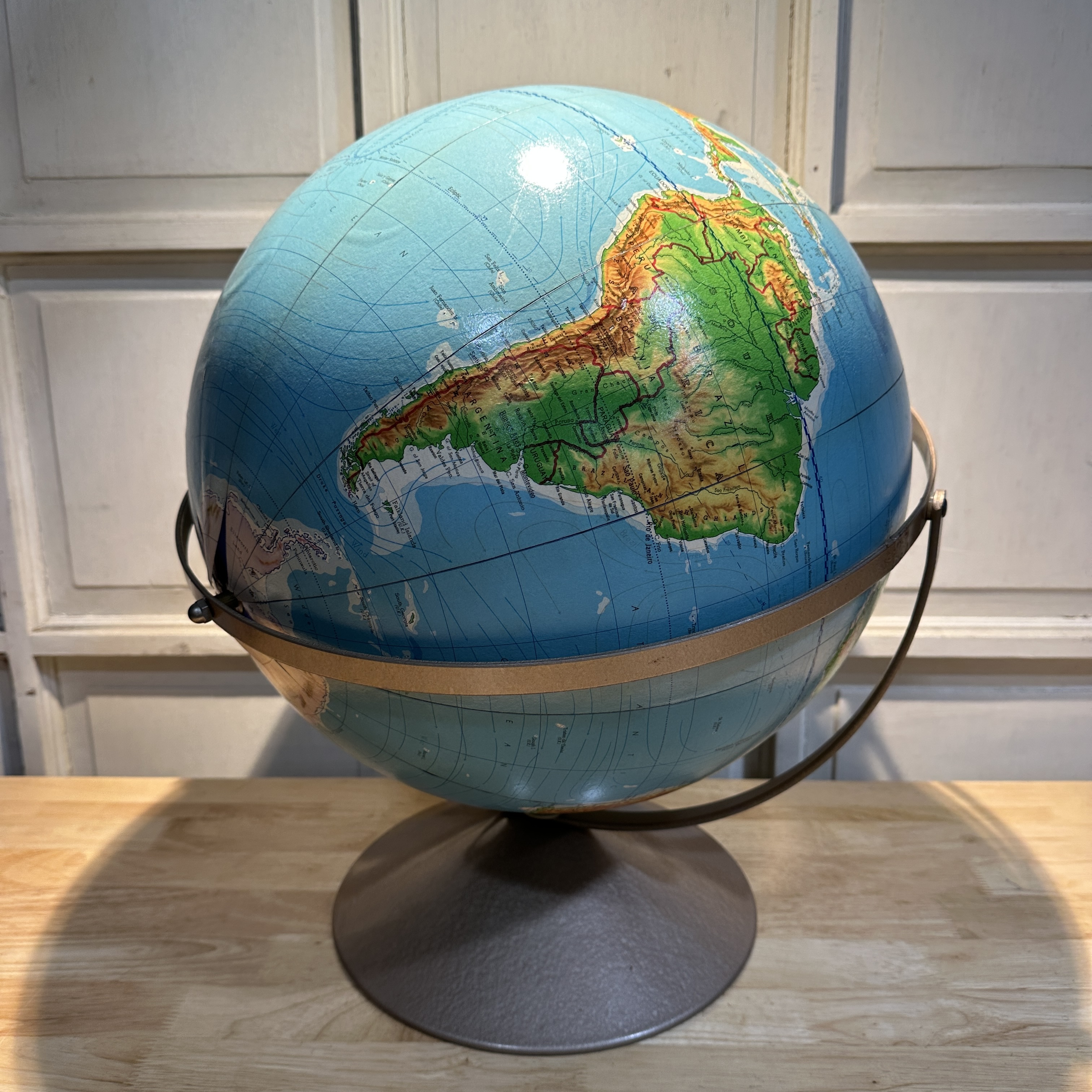 Large vintage school globe that hangs on a wall. Needs some rubber cement on some of the panels that are starting to pop up but in otherwise complete and decent condition.