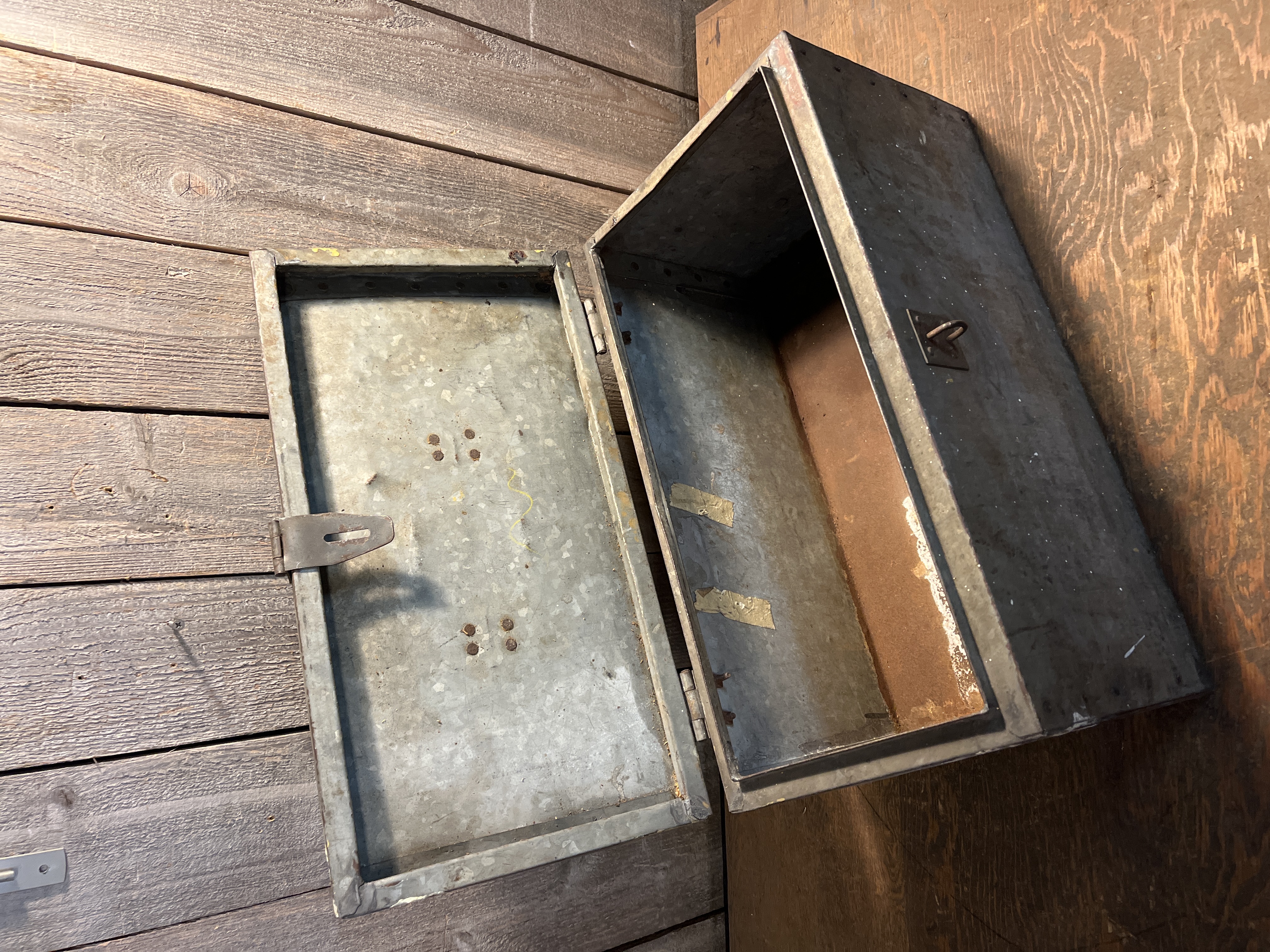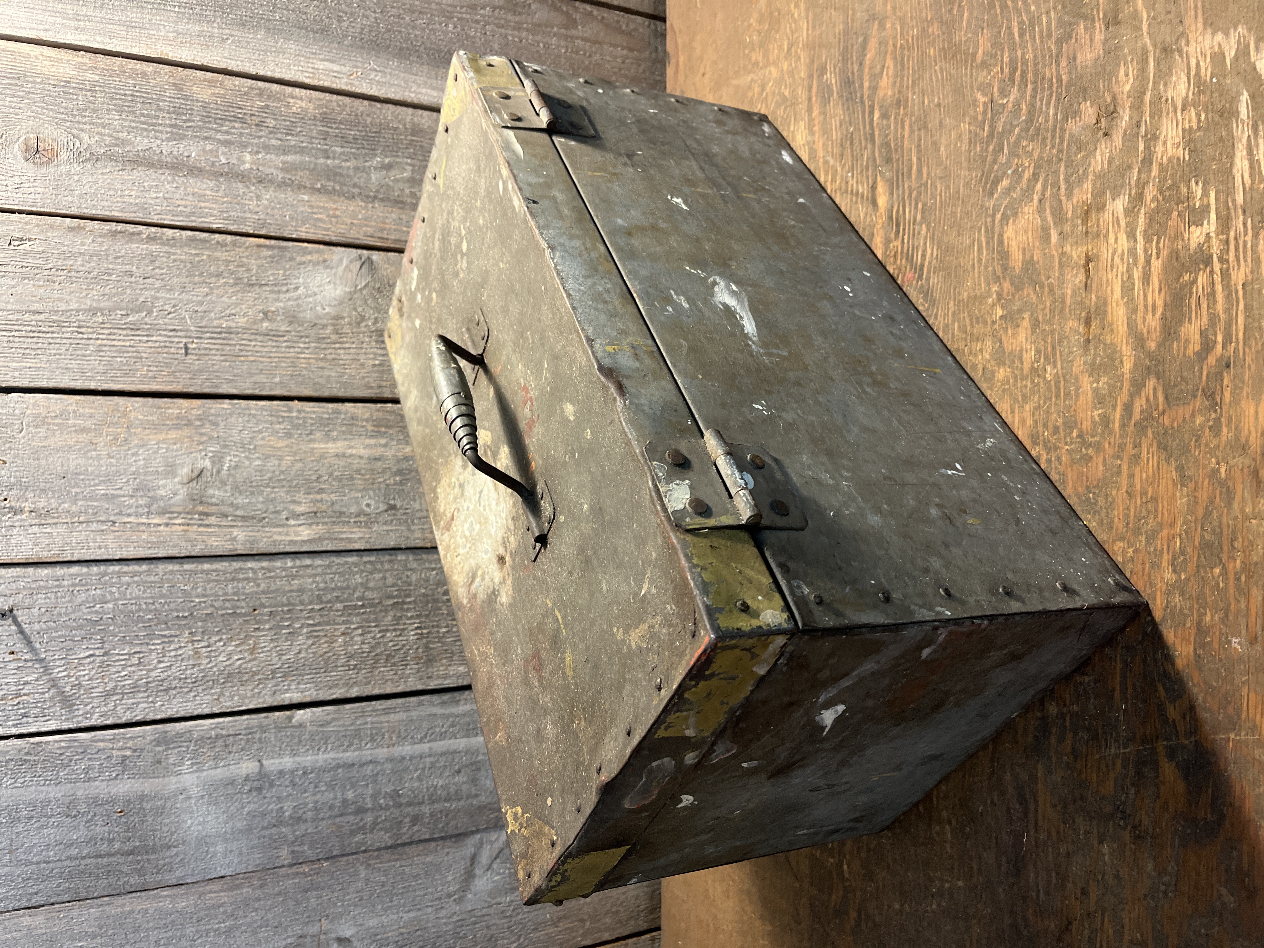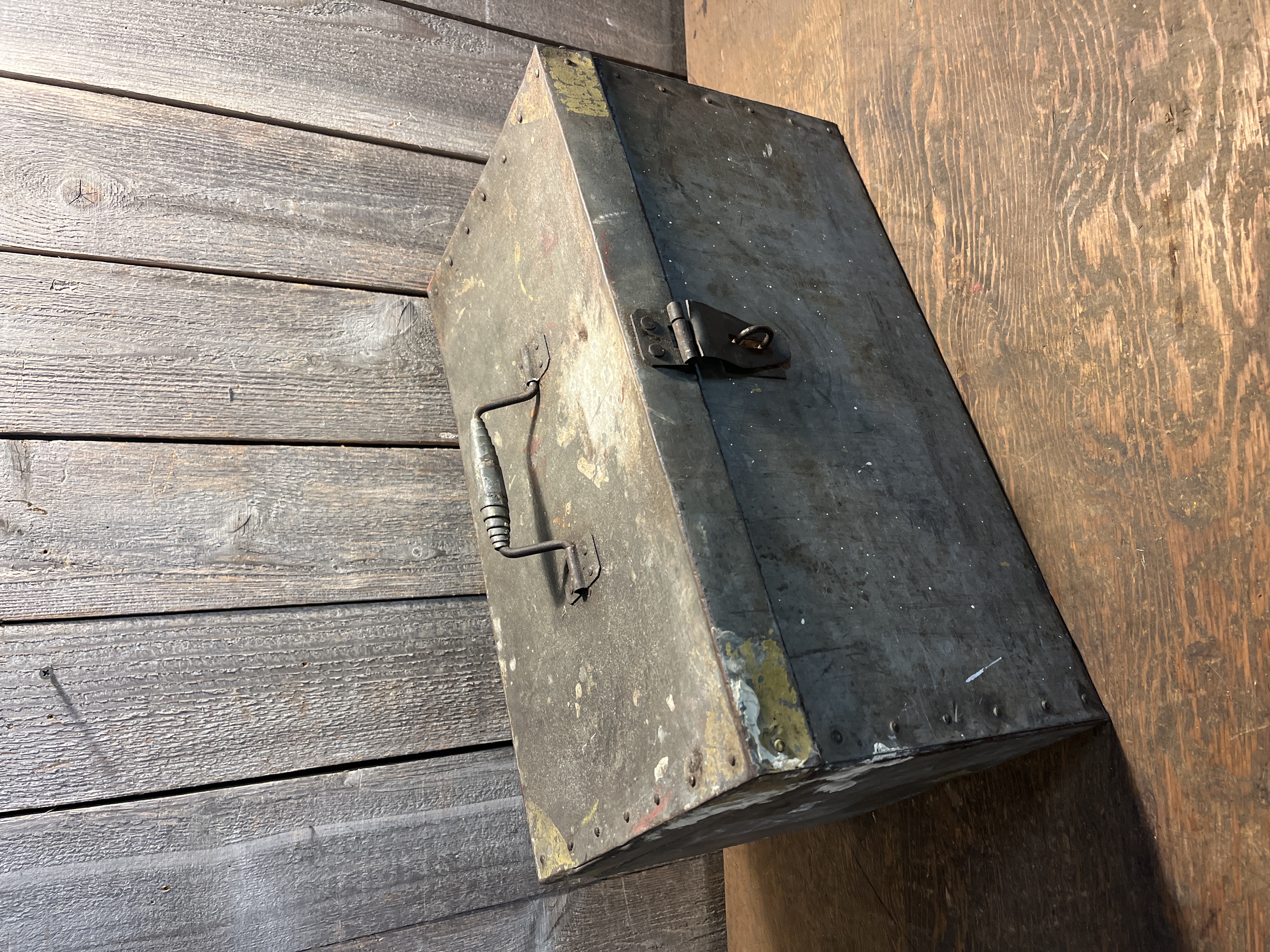 This tool box is a pretty neat old unit, it is made of galvanized steel and riveted together. Check out the handle too, a welded coil of flat steel that surprisingly feels good in the hand. It is fairly clean all things considered. It may have started life as a box for holding a power tool. It really has a great look to it overall with no major issues. Measures 19 x 10.25 x 10 inches.