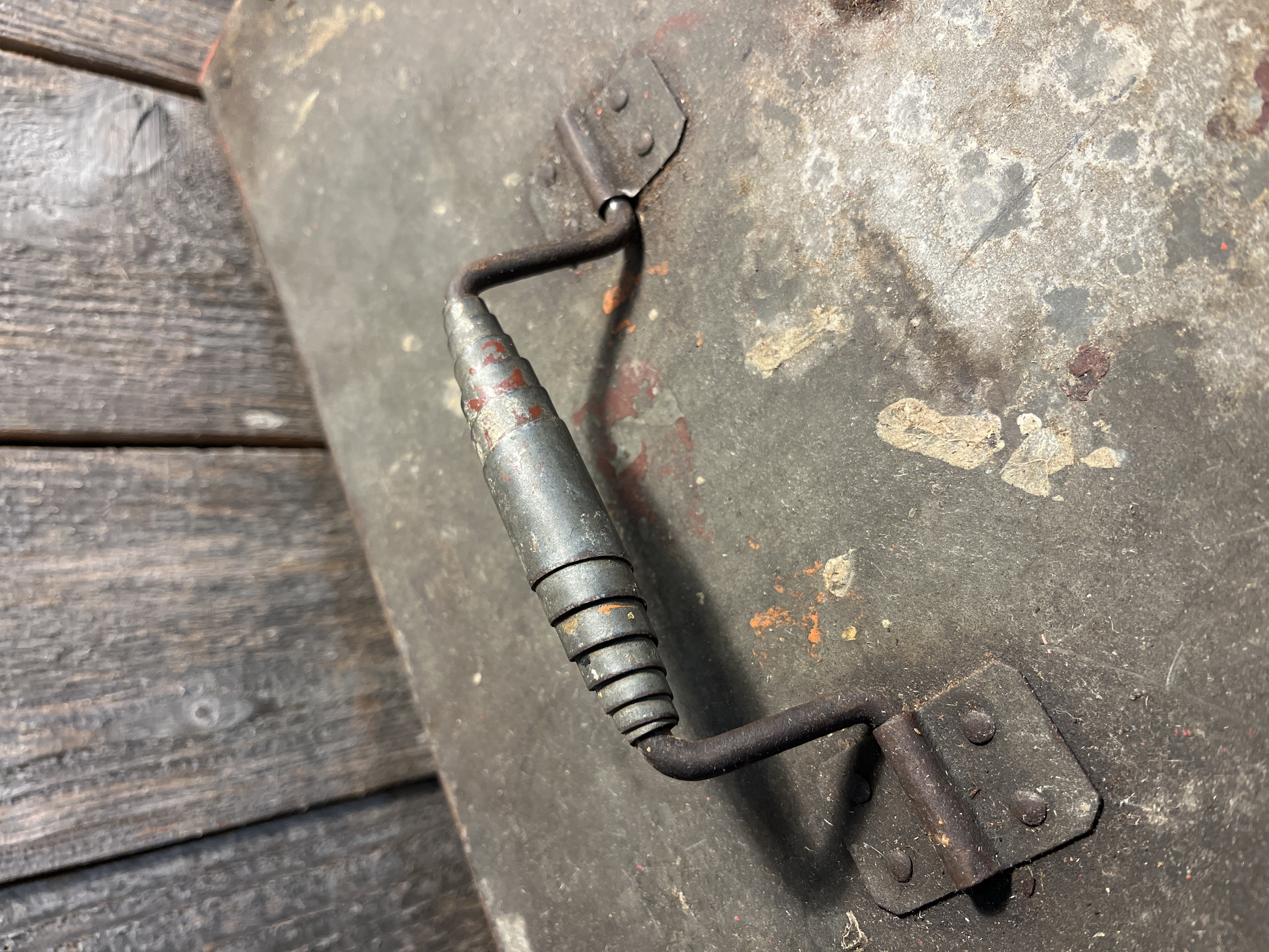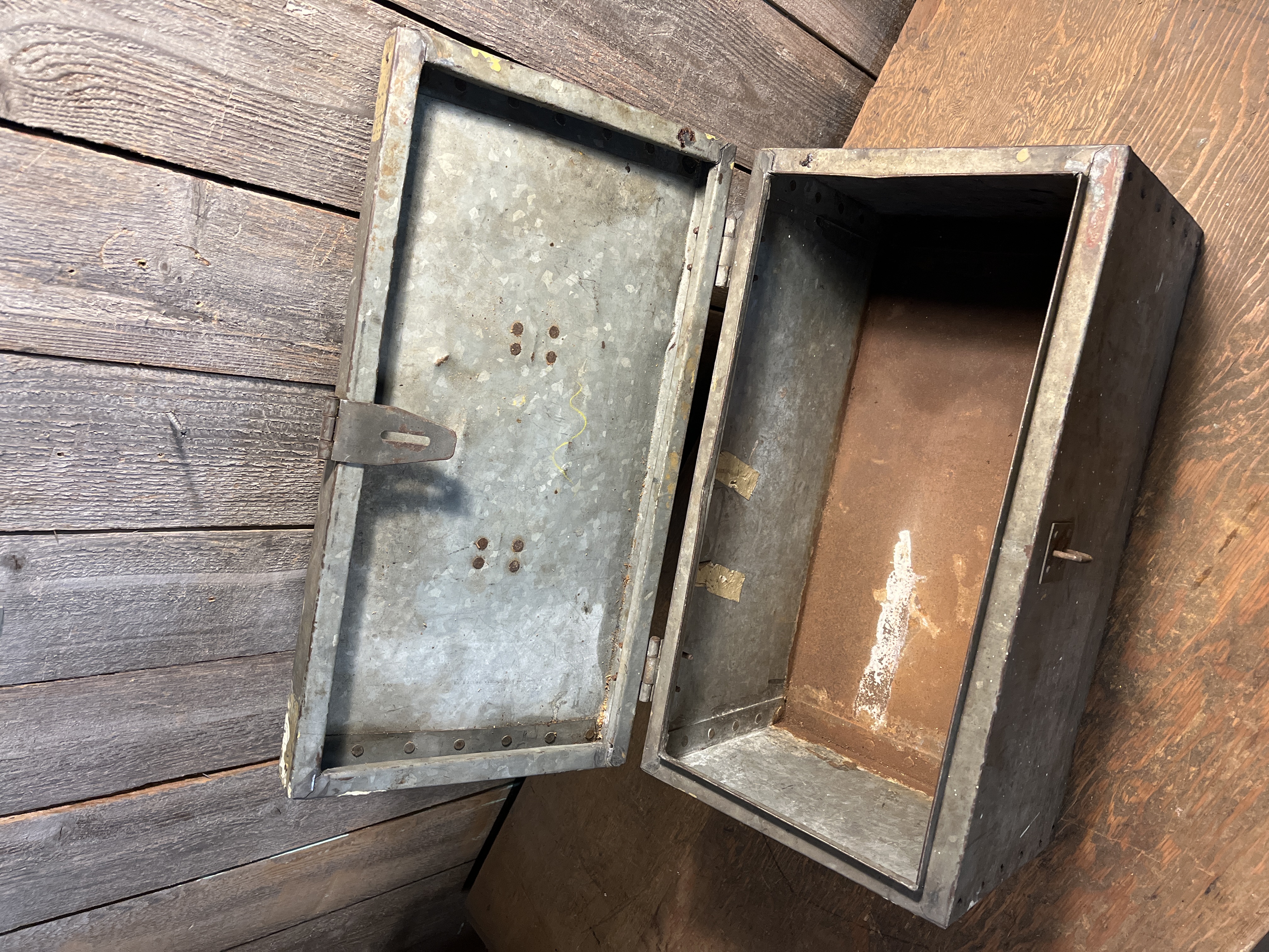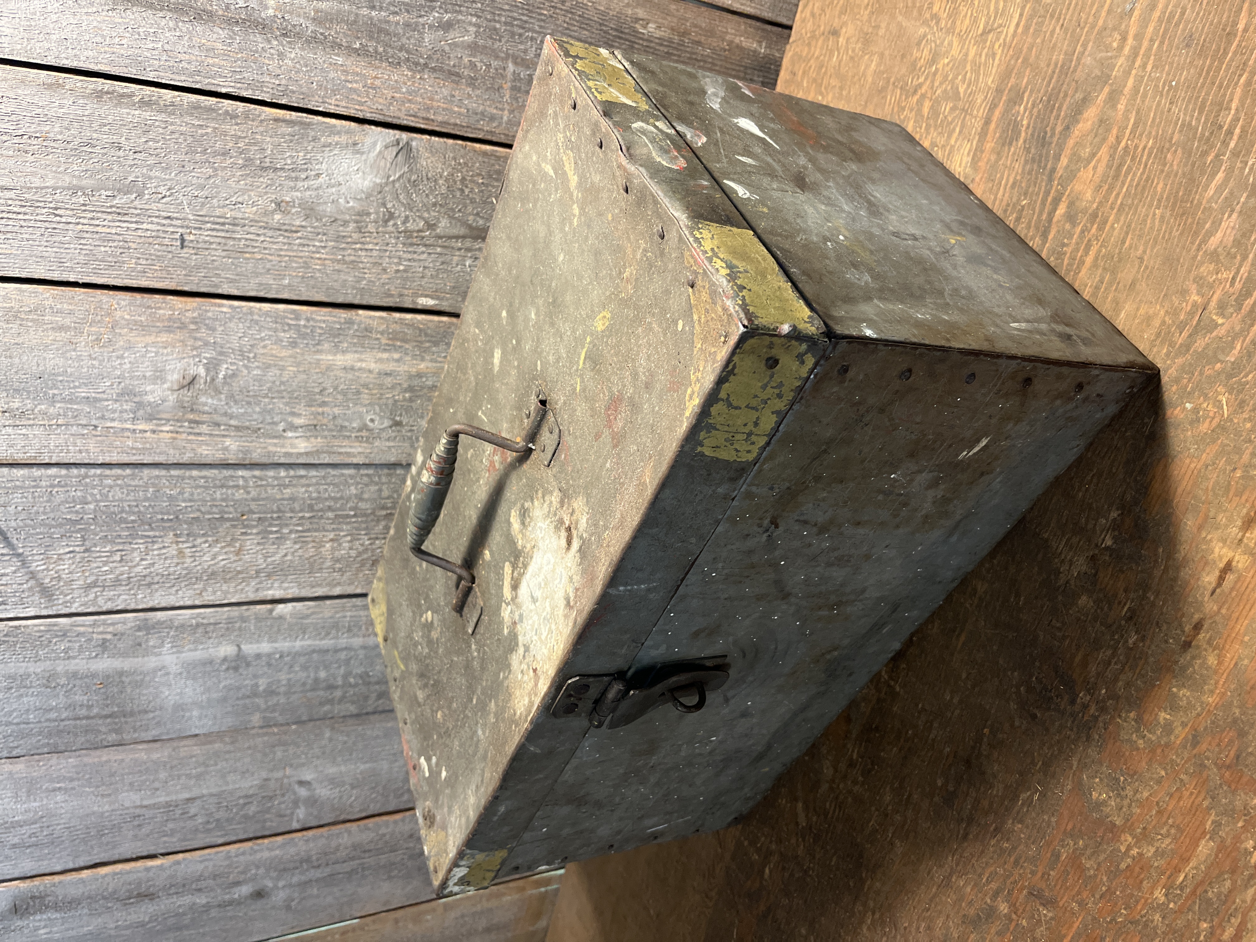This tool box is a pretty neat old unit, it is made of galvanized steel and riveted together. Check out the handle too, a welded coil of flat steel that surprisingly feels good in the hand. It is fairly clean all things considered. It may have started life as a box for holding a power tool. It really has a great look to it overall with no major issues. Measures 19 x 10.25 x 10 inches.