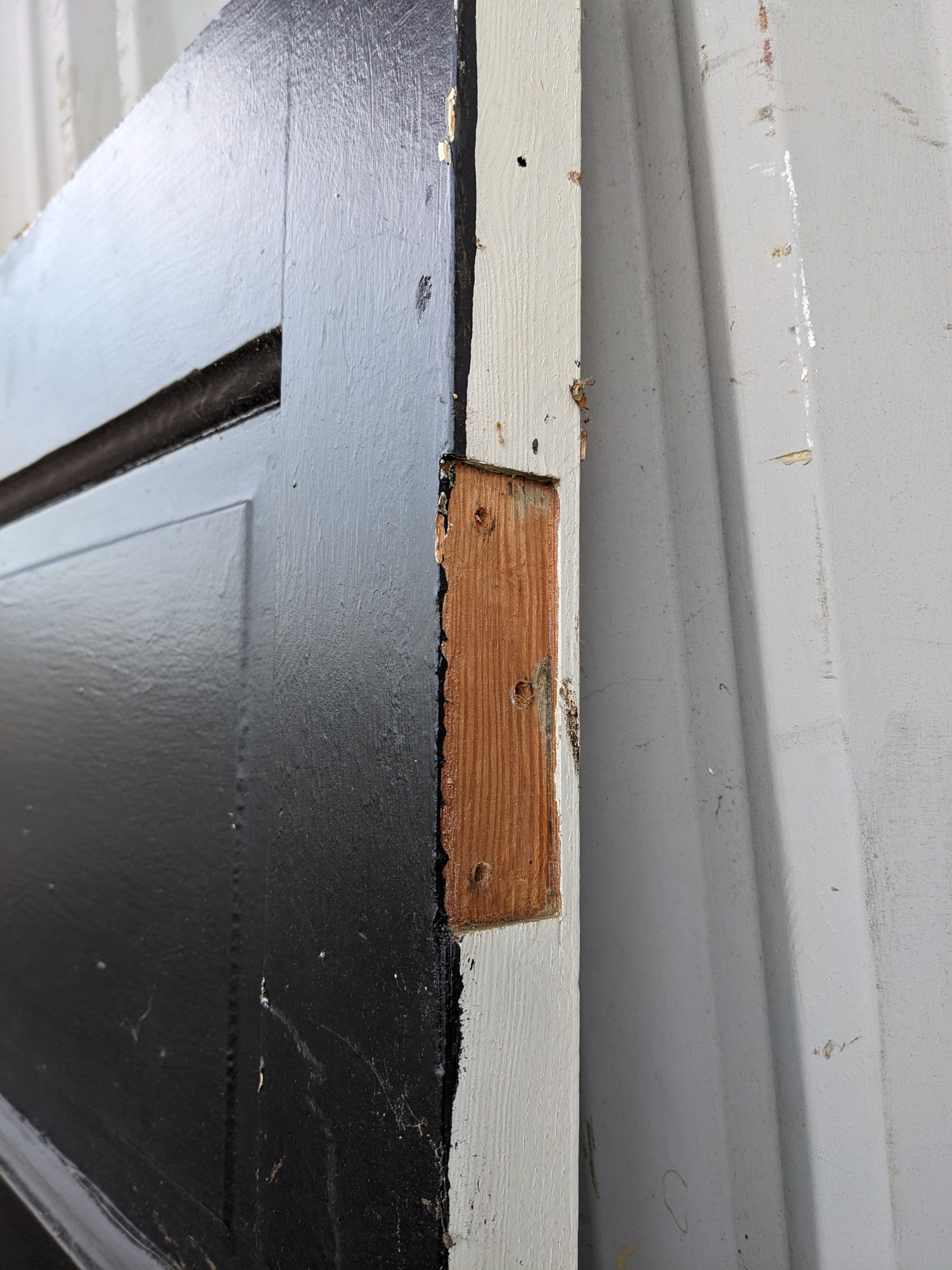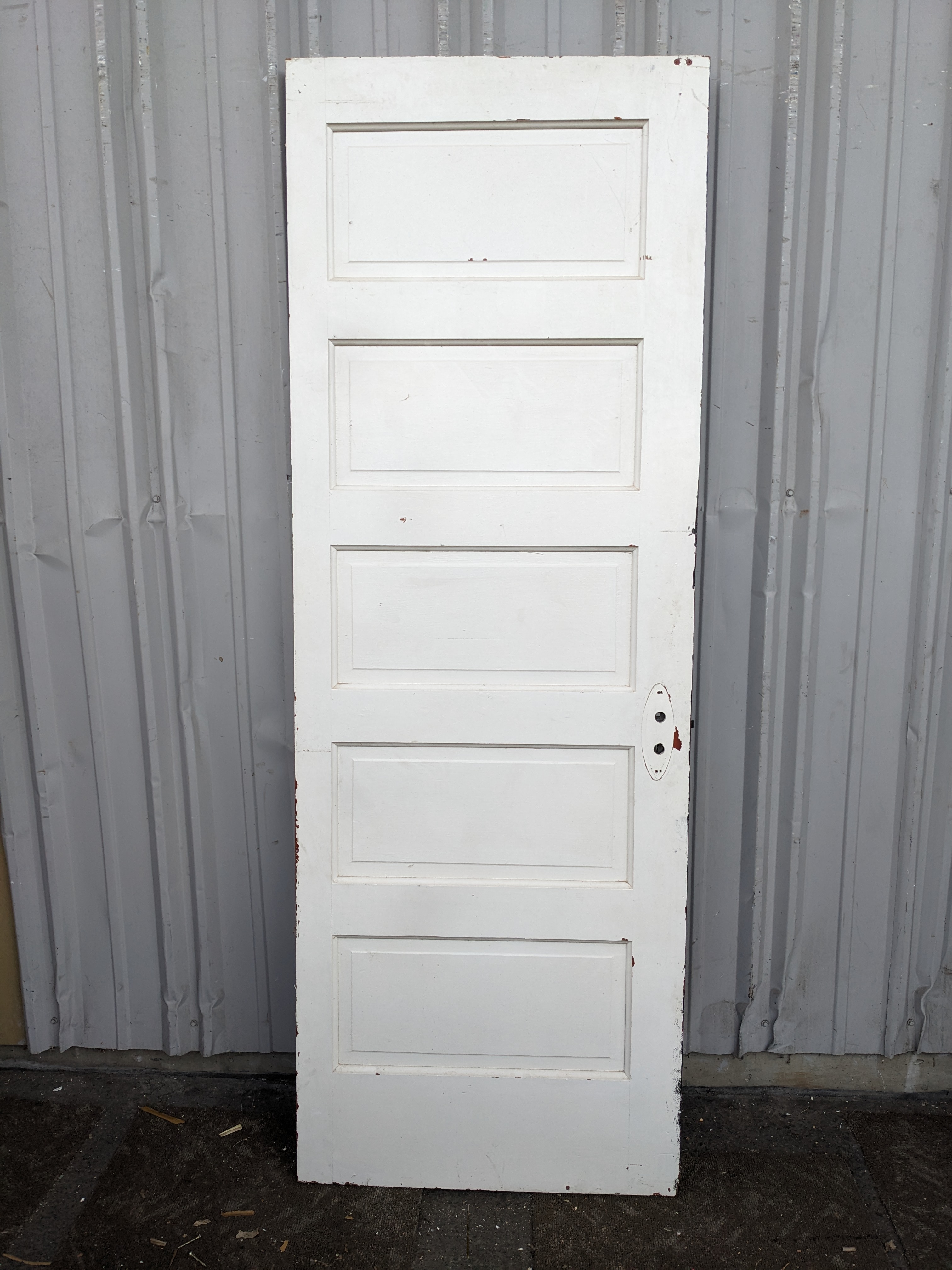A solid wood five panel interior door in good condition. The paint job seems thorough and even, but has dinged and scratched in some areas, but these minor damages don't seem to extend to the wood underneath.