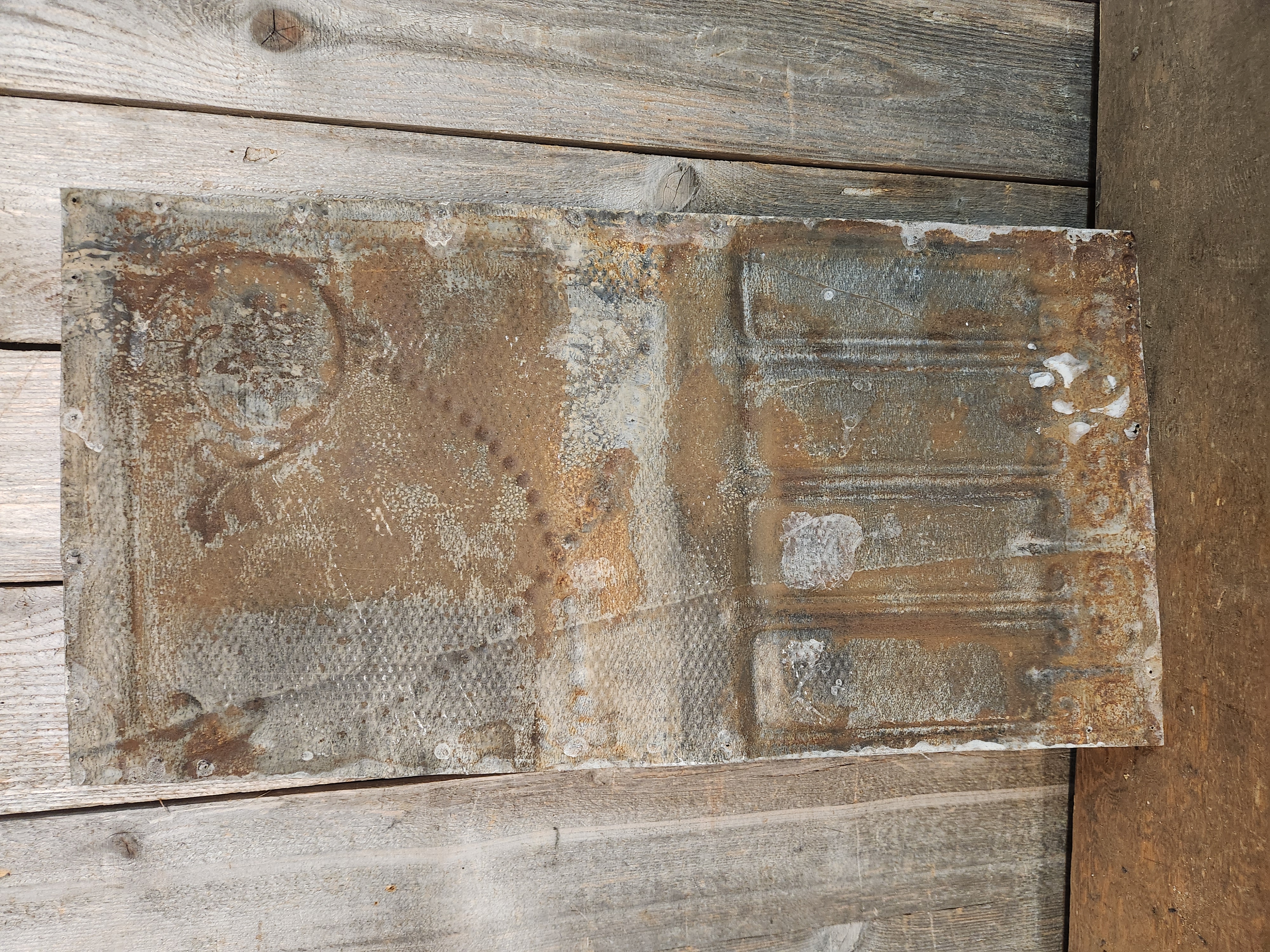 A rectangle tin ceiling tile in fair condition. Images may be representational. It has a lovely embossed pattern and some slight wear and tear but it's in decent condition overall. It measures 12.125 x 24.5 inches.