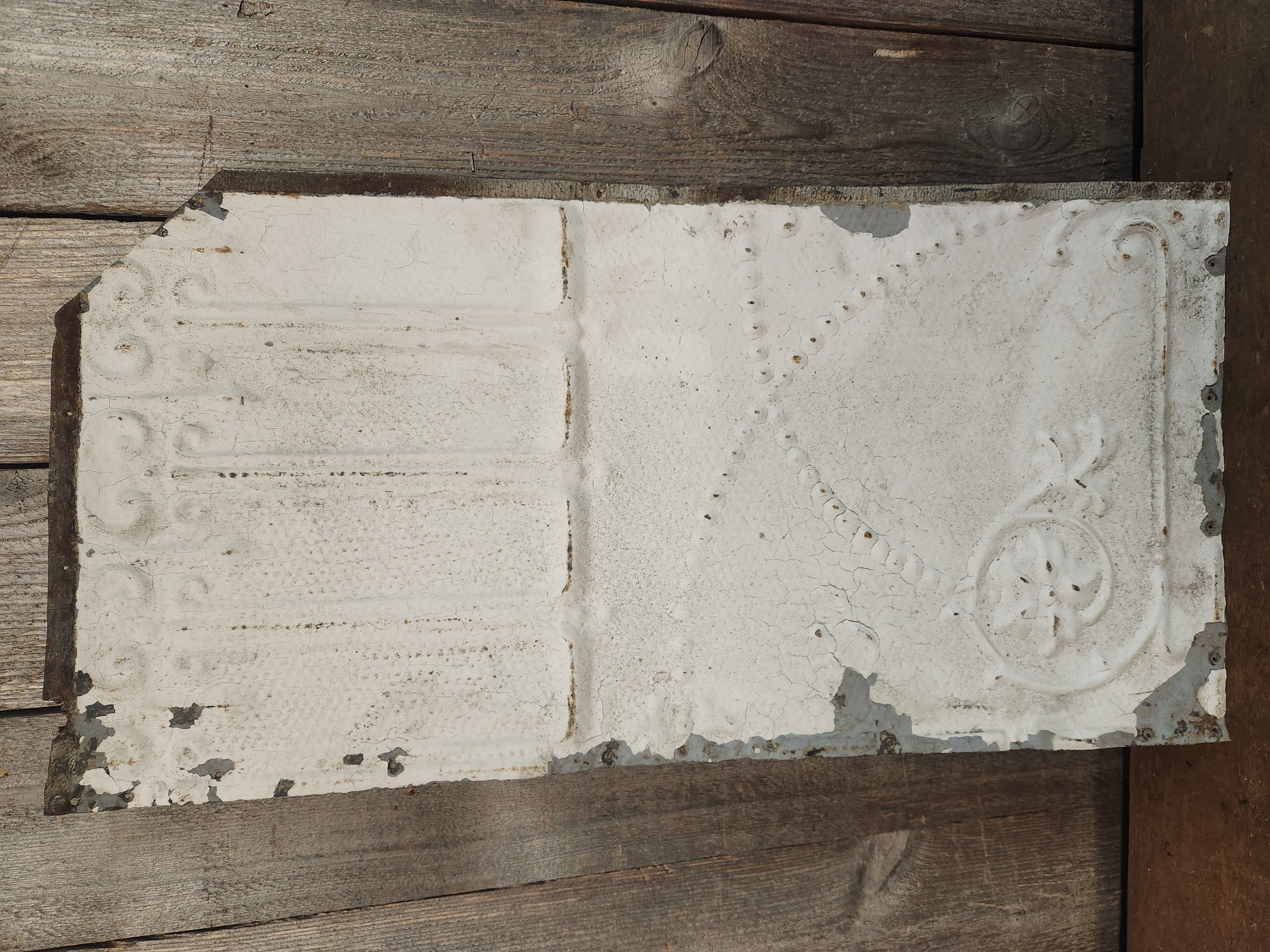 A square tin ceiling tile in fair condition. Images may be representational. It has a lovely embossed pattern and some slight wear and tear but it's in decent condition overall. It has a cut off corner. It measures 12.125 x 24.5.