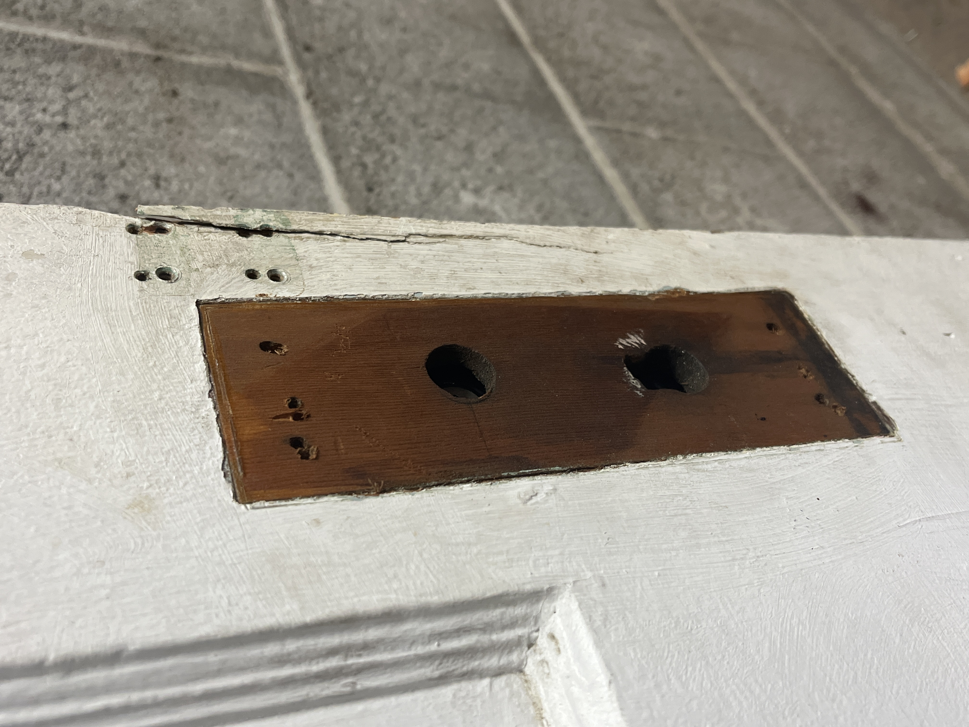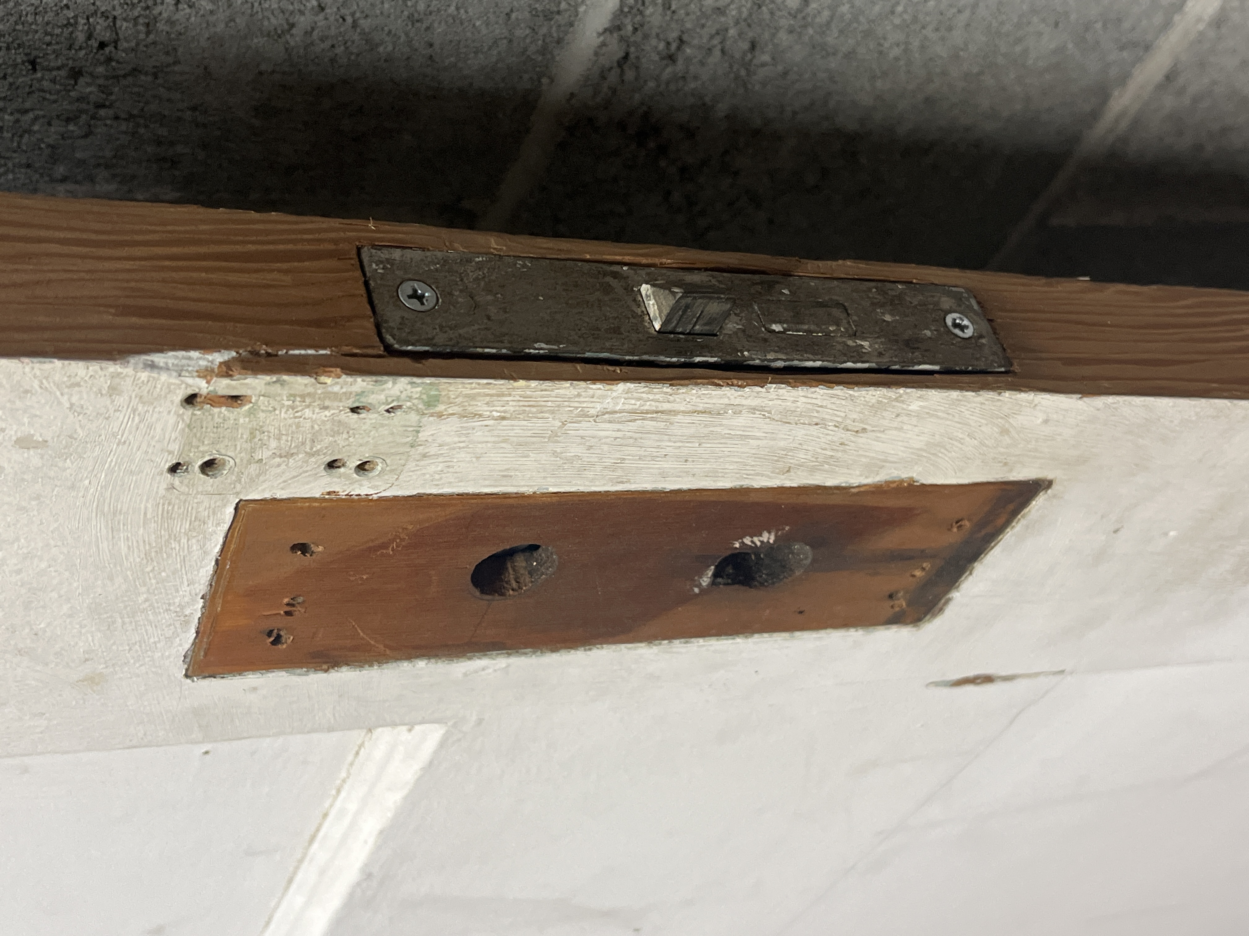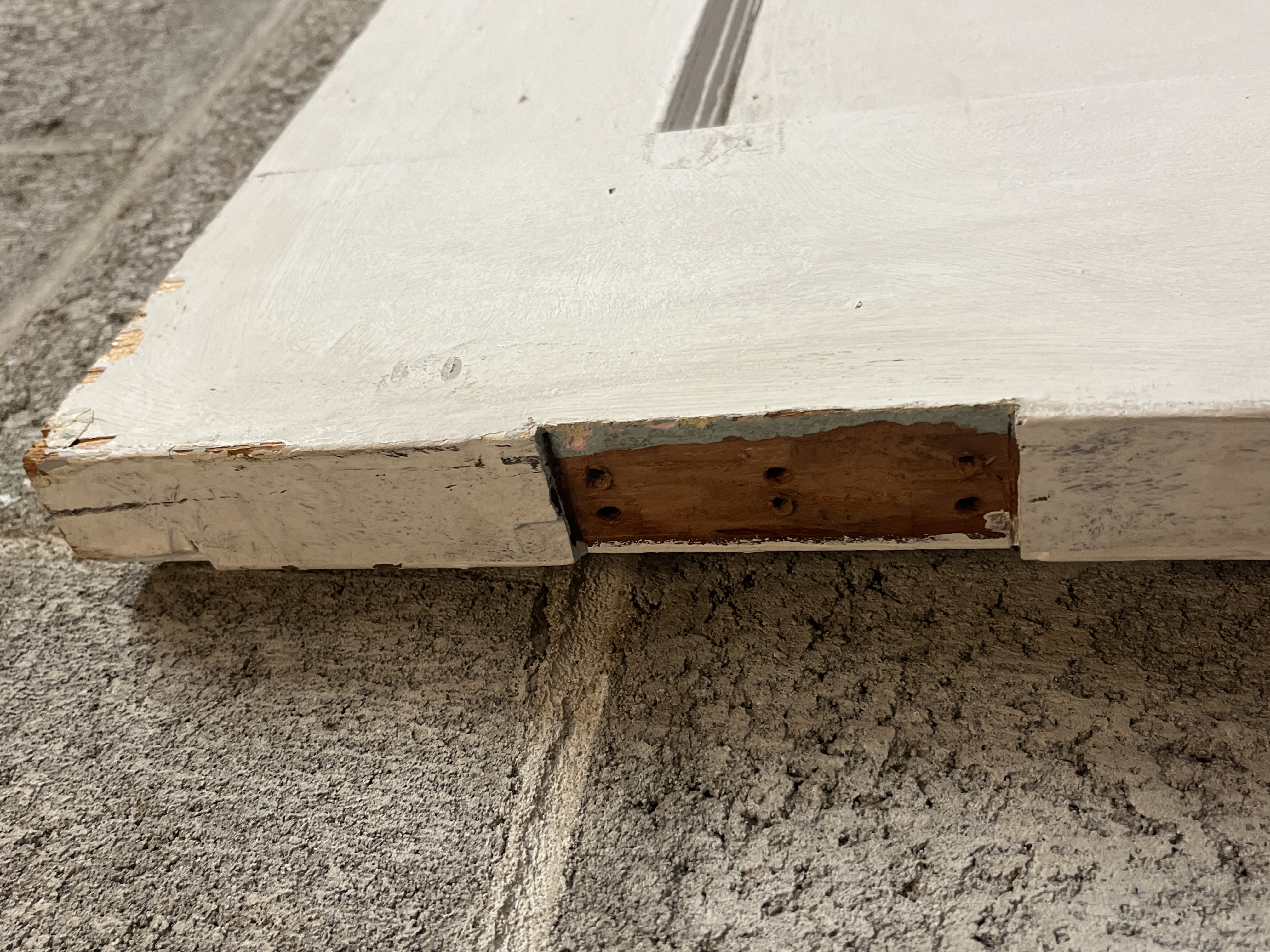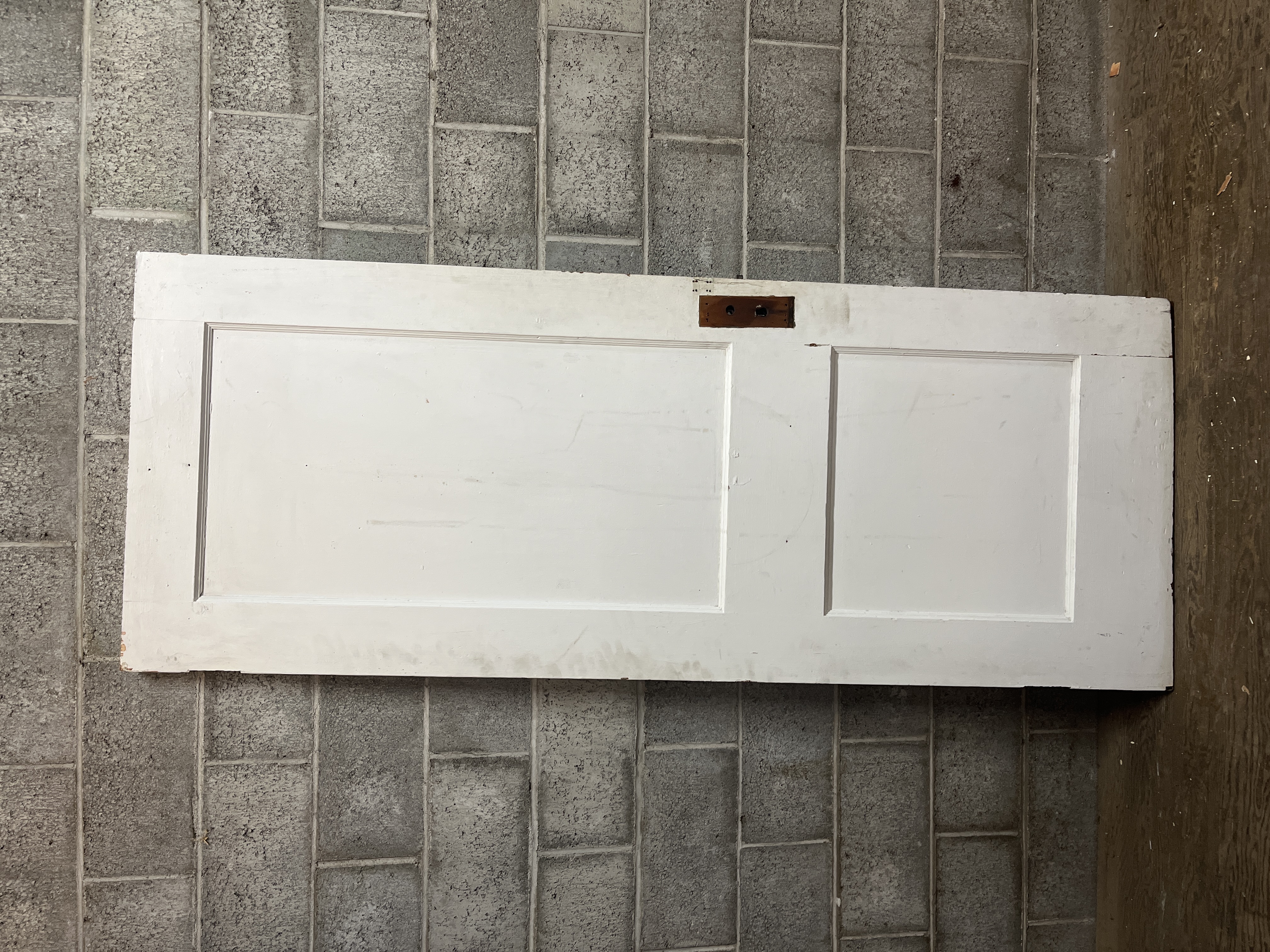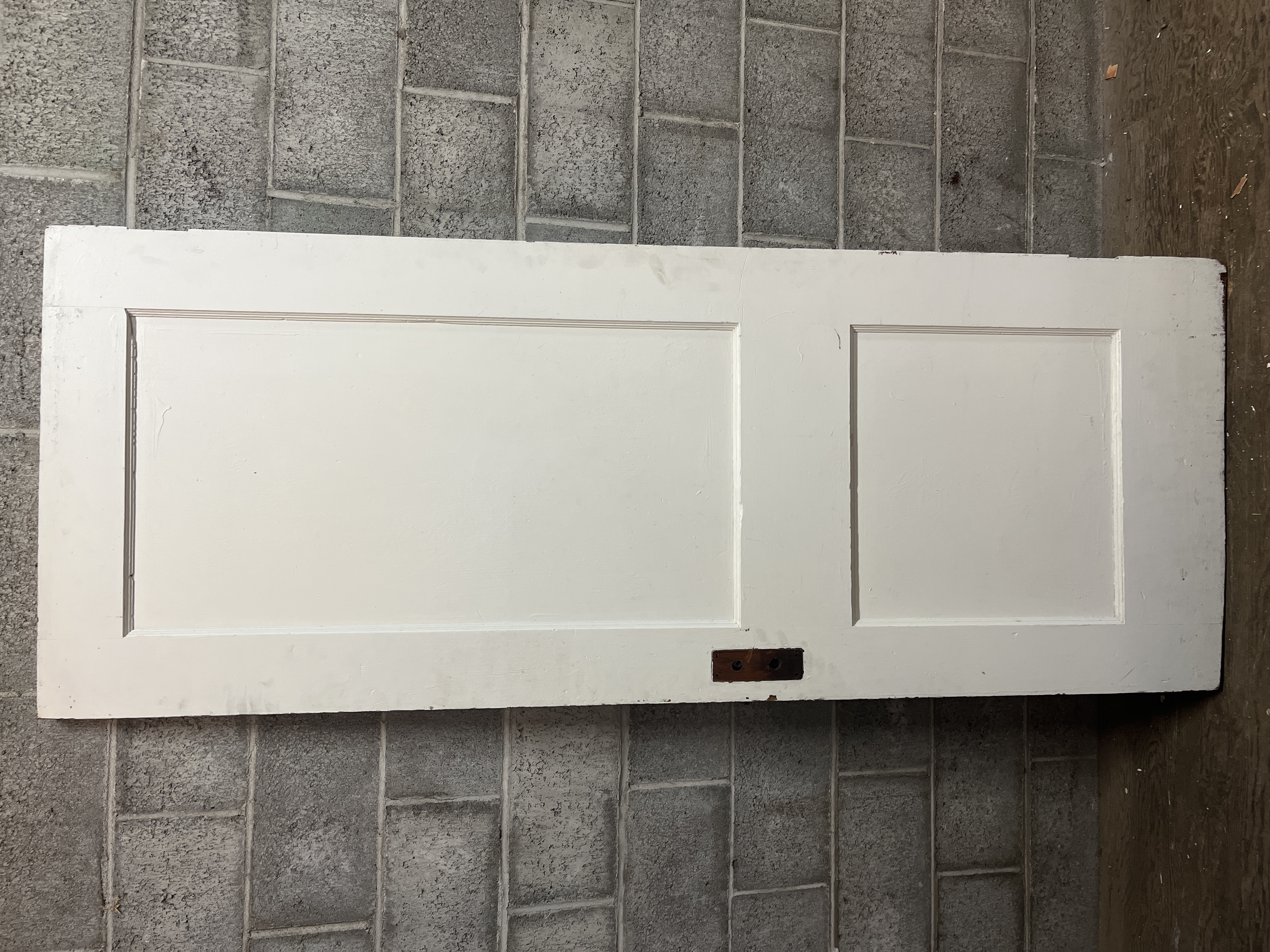 A vintage 2 panel door that has lived a number of lives. The hinge cuts have been relieved to accept either swing. The door was trimmed in width and the cut is straight. The door height has also been trimmed but the cut is a little crooked. The panels are tight and the door is solid. It will need some filler for a crack near the mortise box which is still installed. The door measures 29.75 x 76.5 x 1.25 inches.