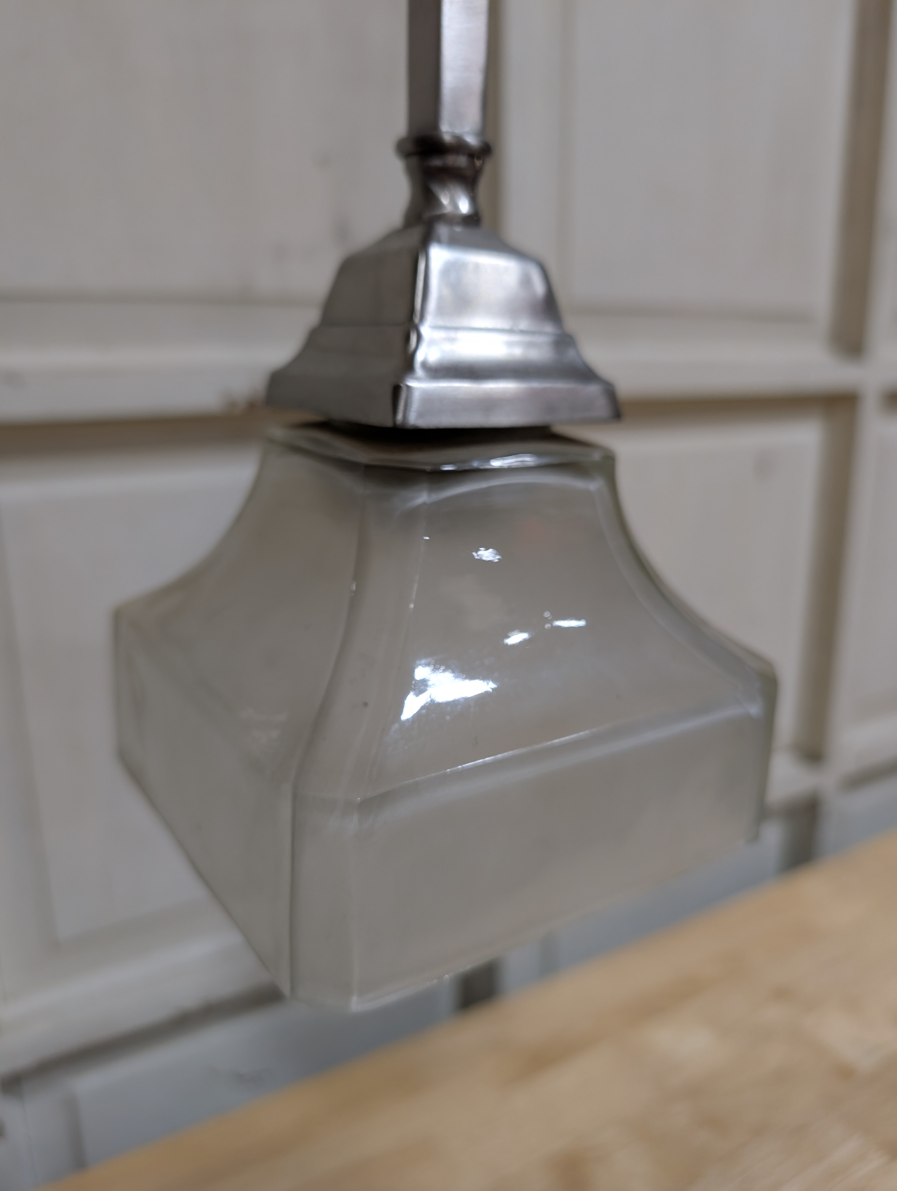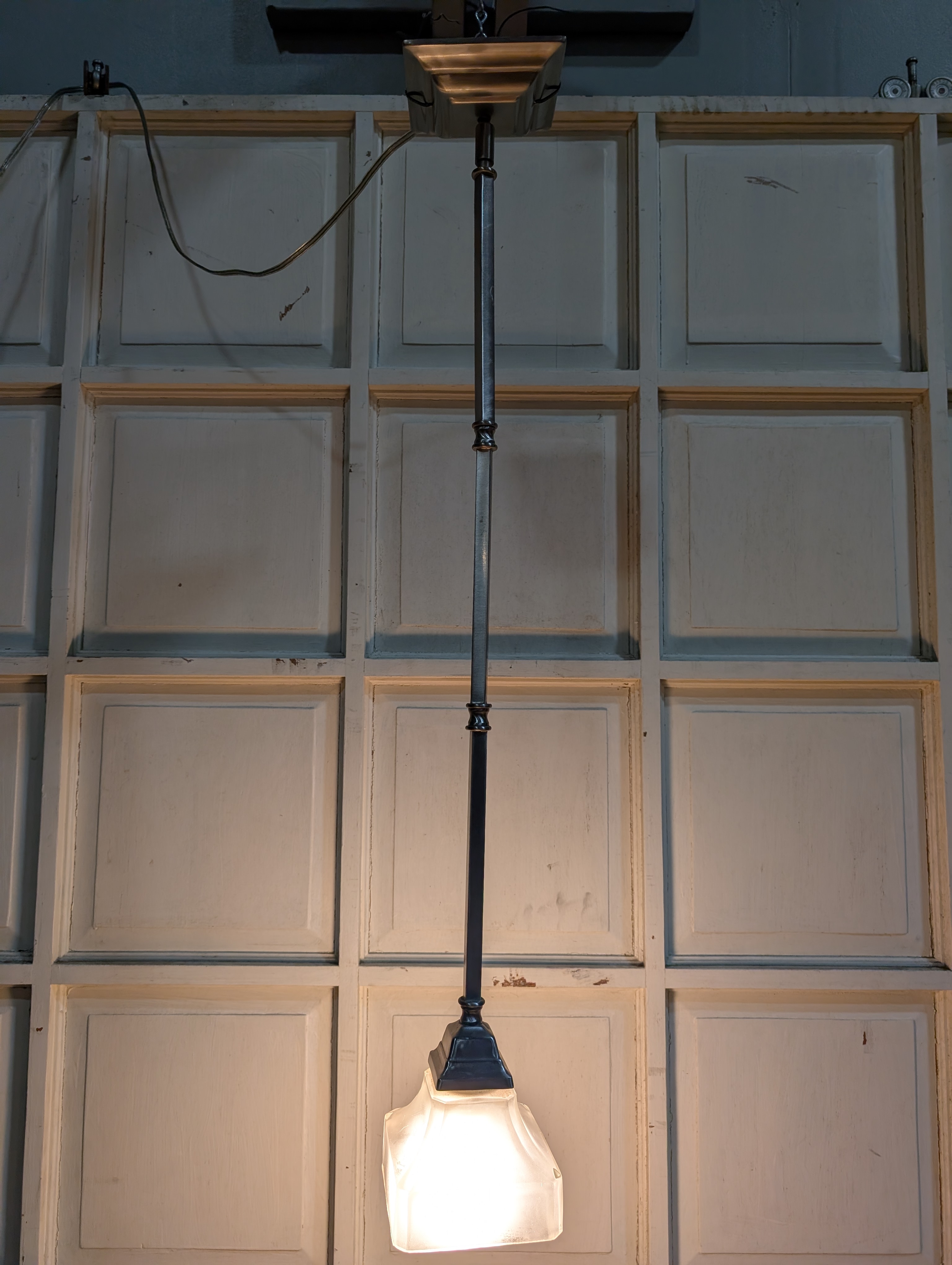 Contemporary long pole pendant light made by Pasquale Miranda Feiss. Has one small chip on the inside lip of the glass shade.