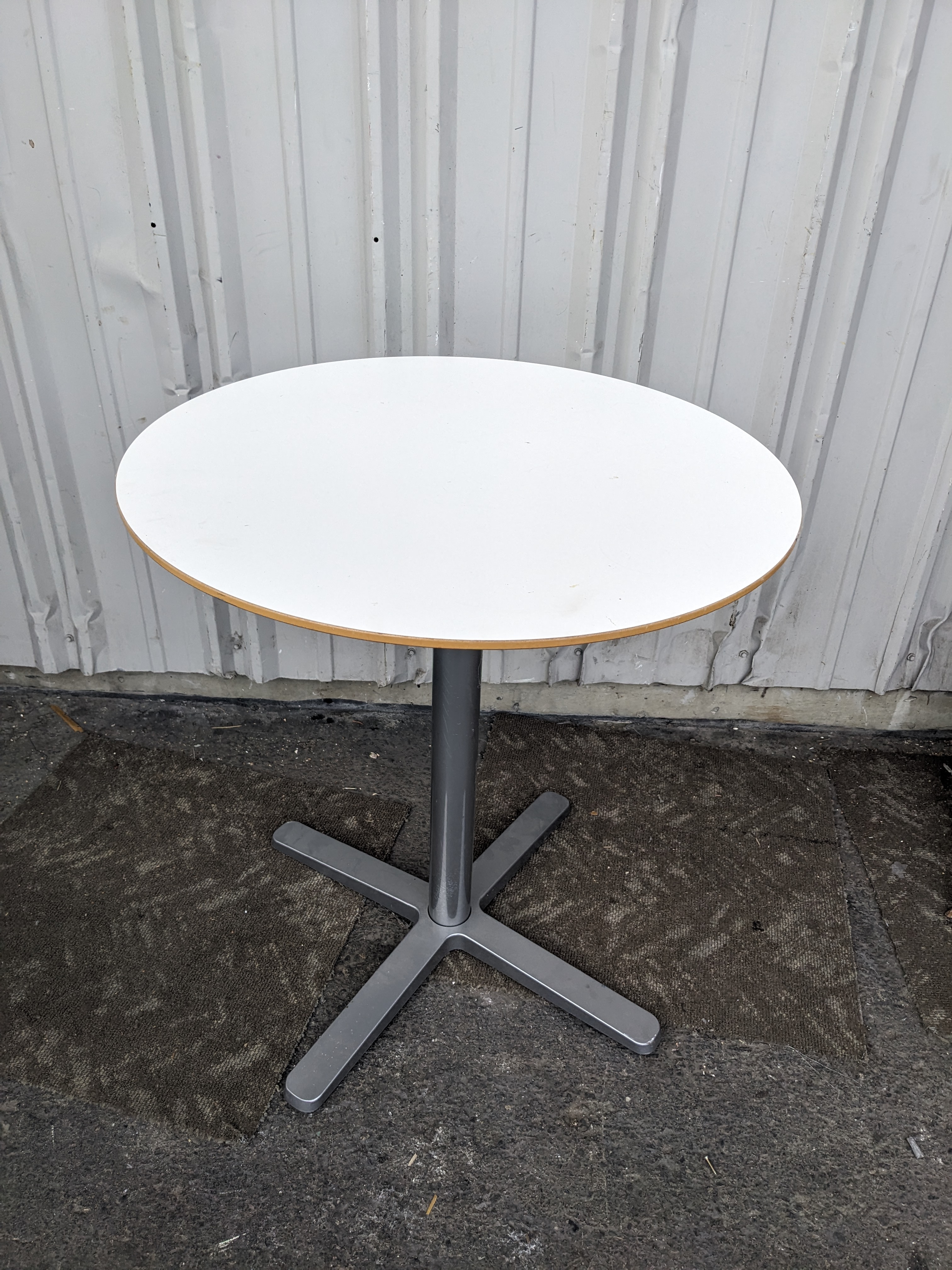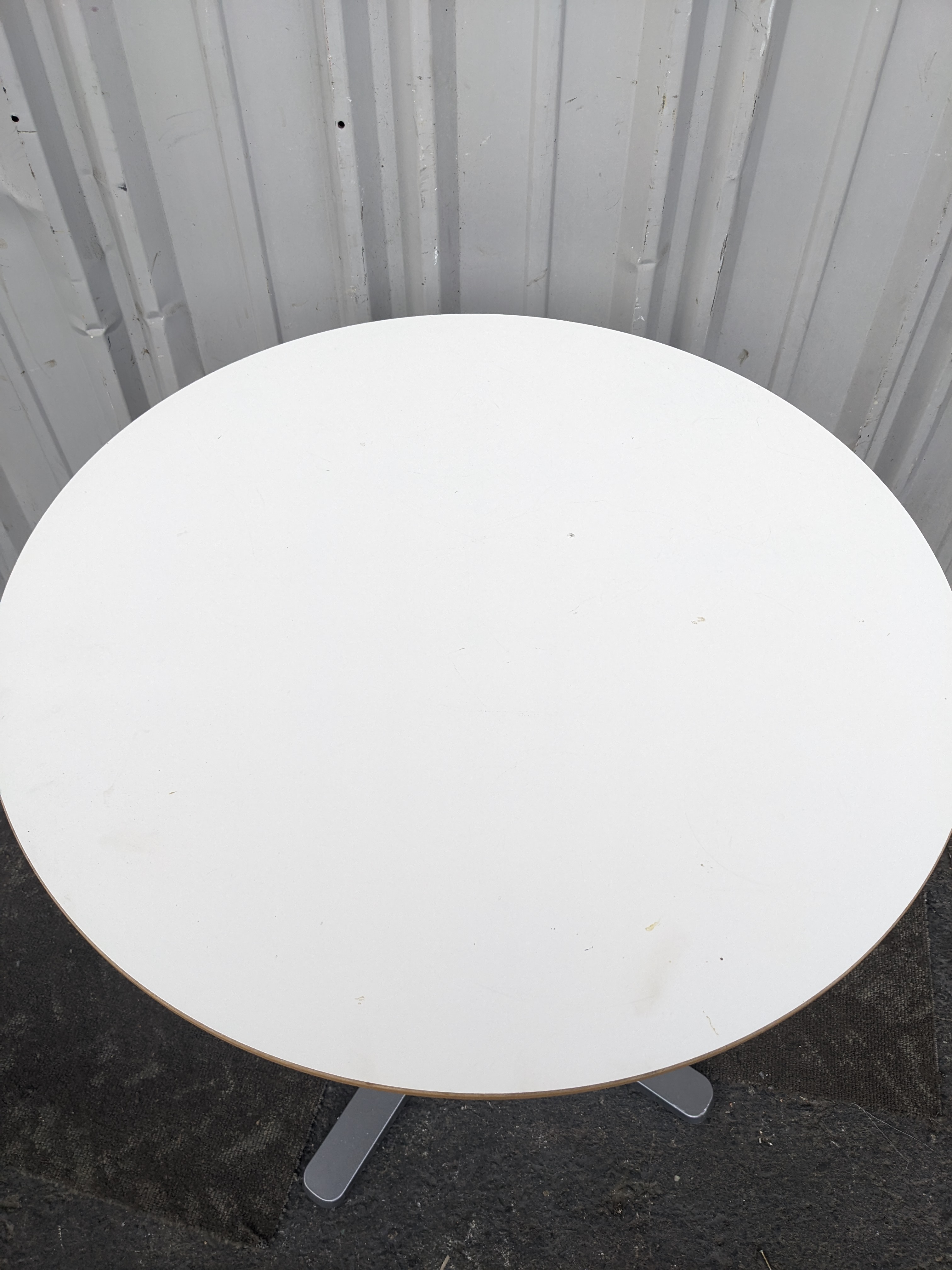 This round cafe or dinning table with a white melamine tabletop and metal pedestal base gives off the cozy modern home style. It's condition varies with the marks on the table top. It could definitely use some sprucing and cleaning.