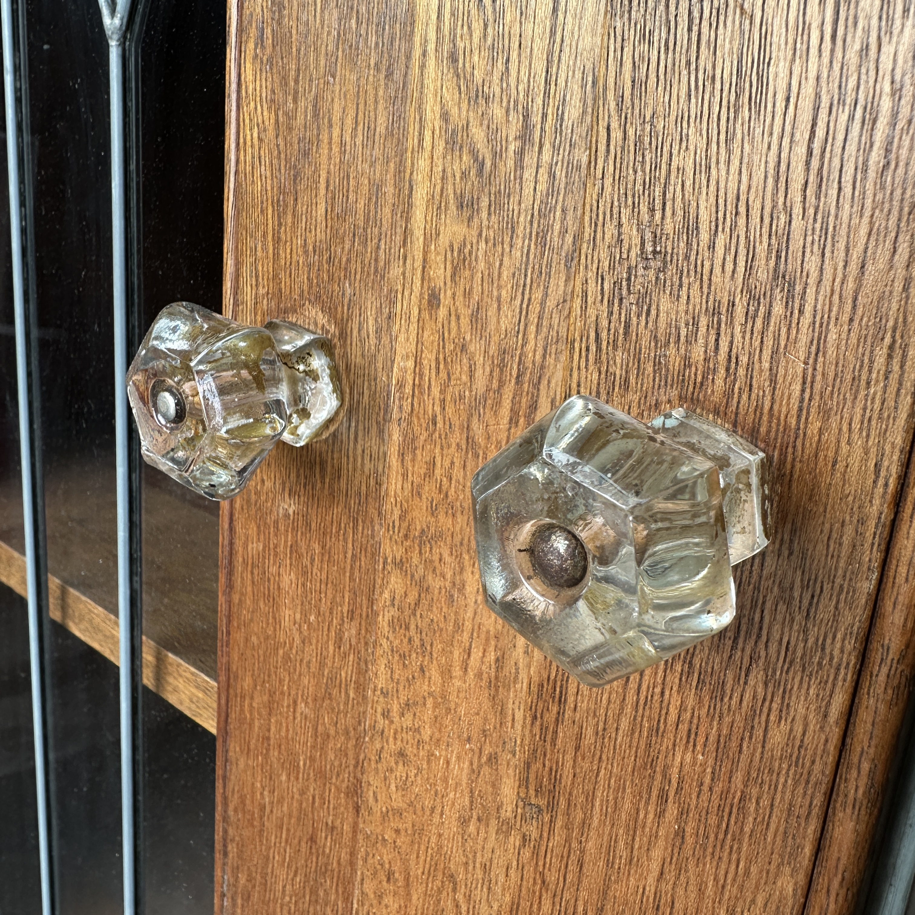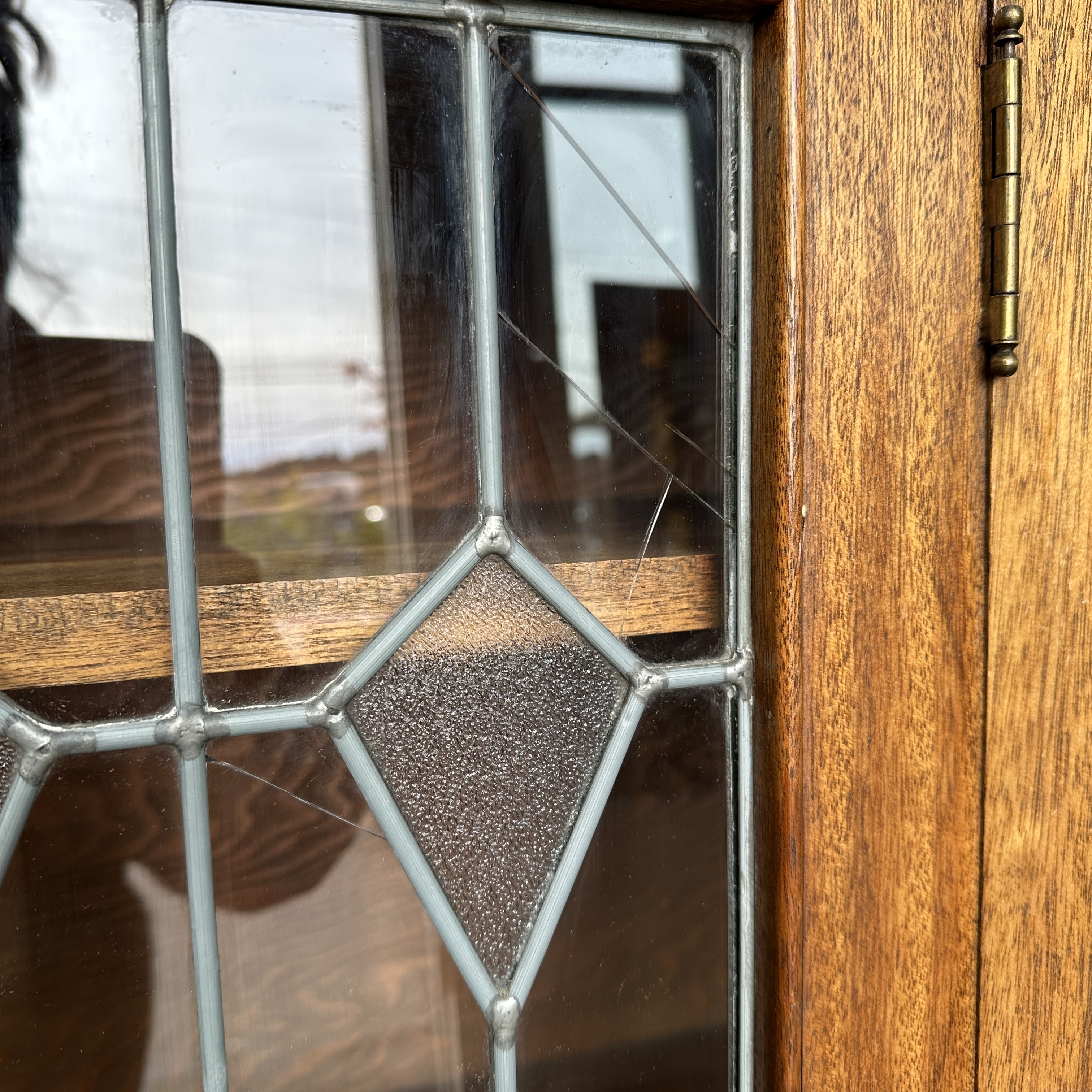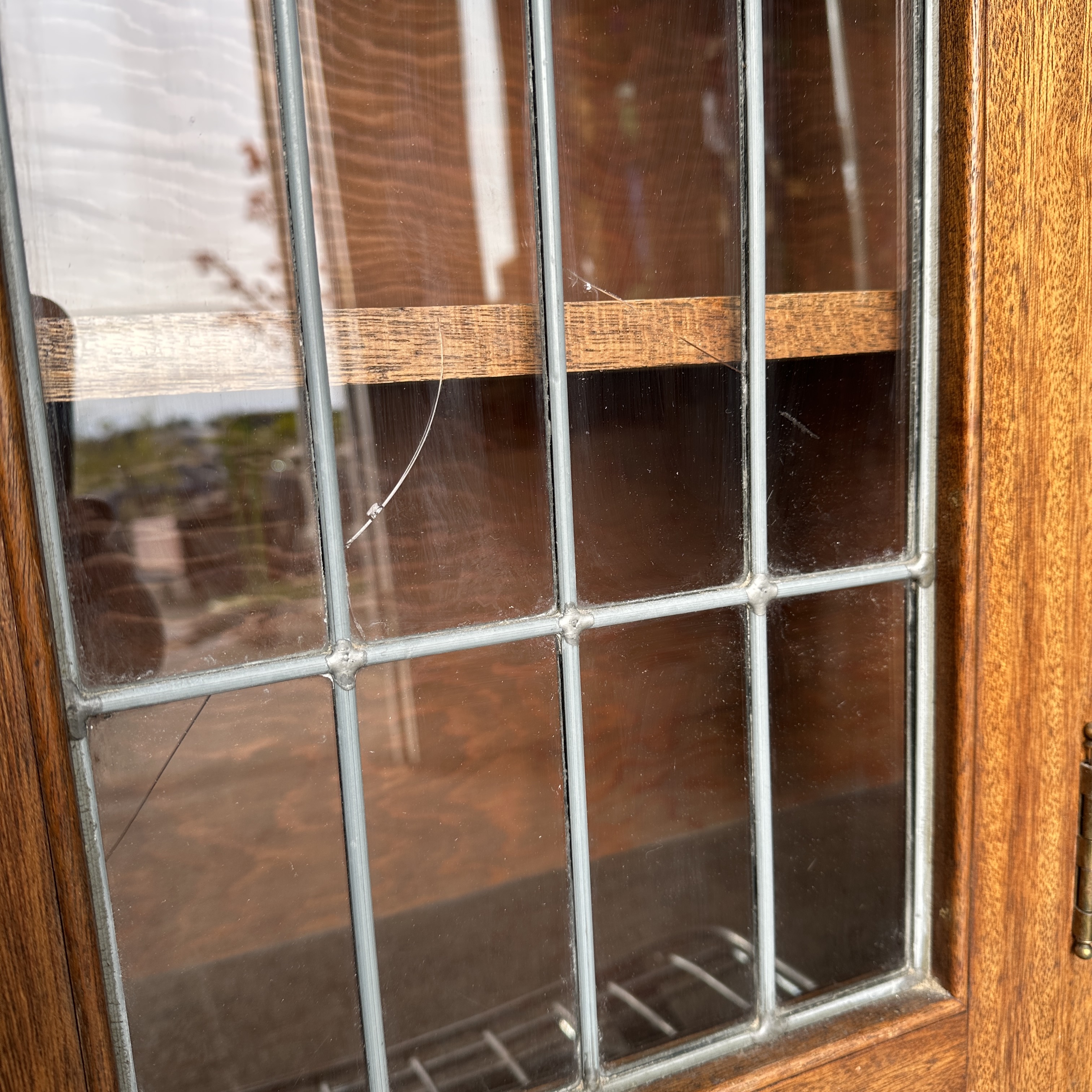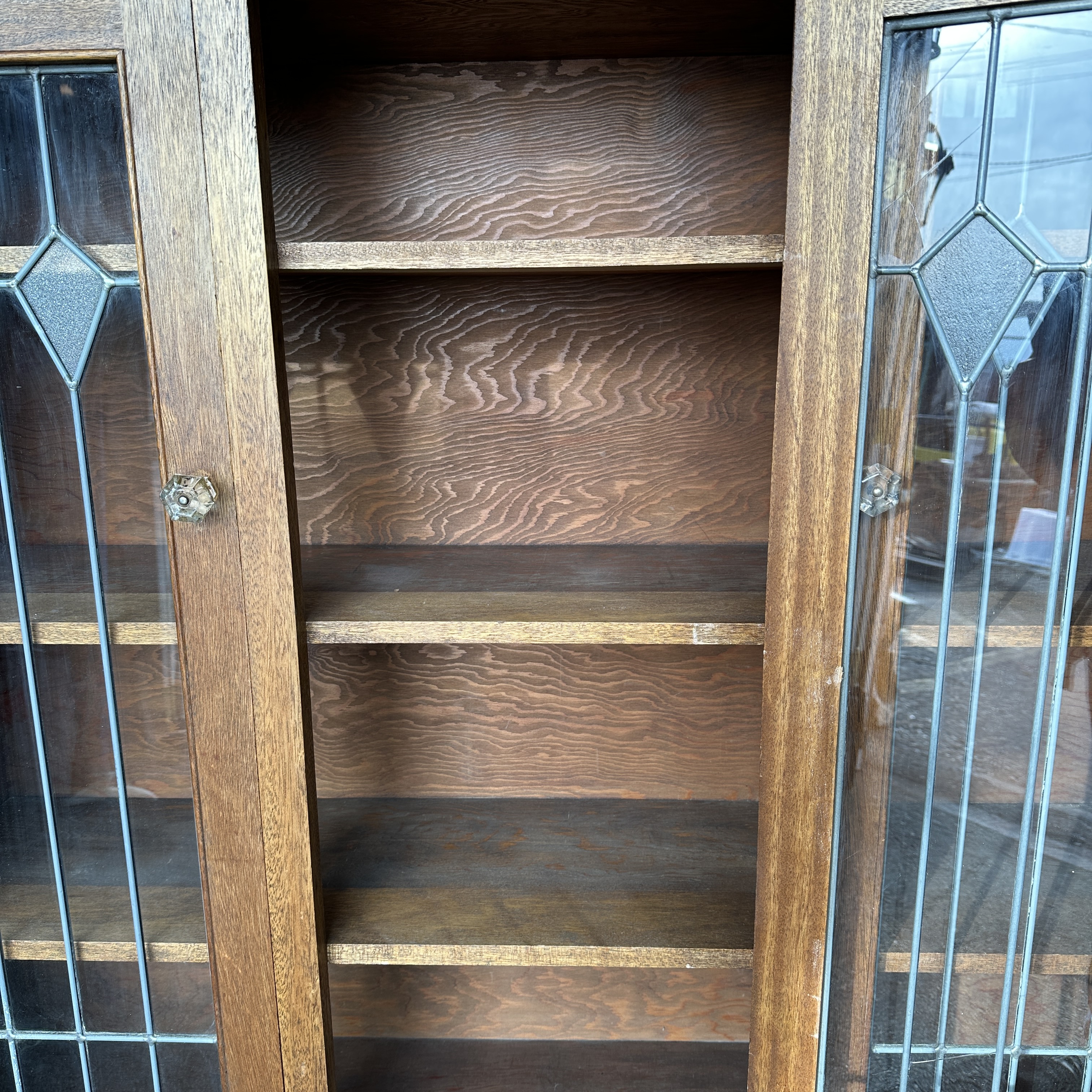 Beautiful unpainted mahogany bookshelf with leaded glass doors, original glass knobs, brass hinges, and three adjustable shelves inside.