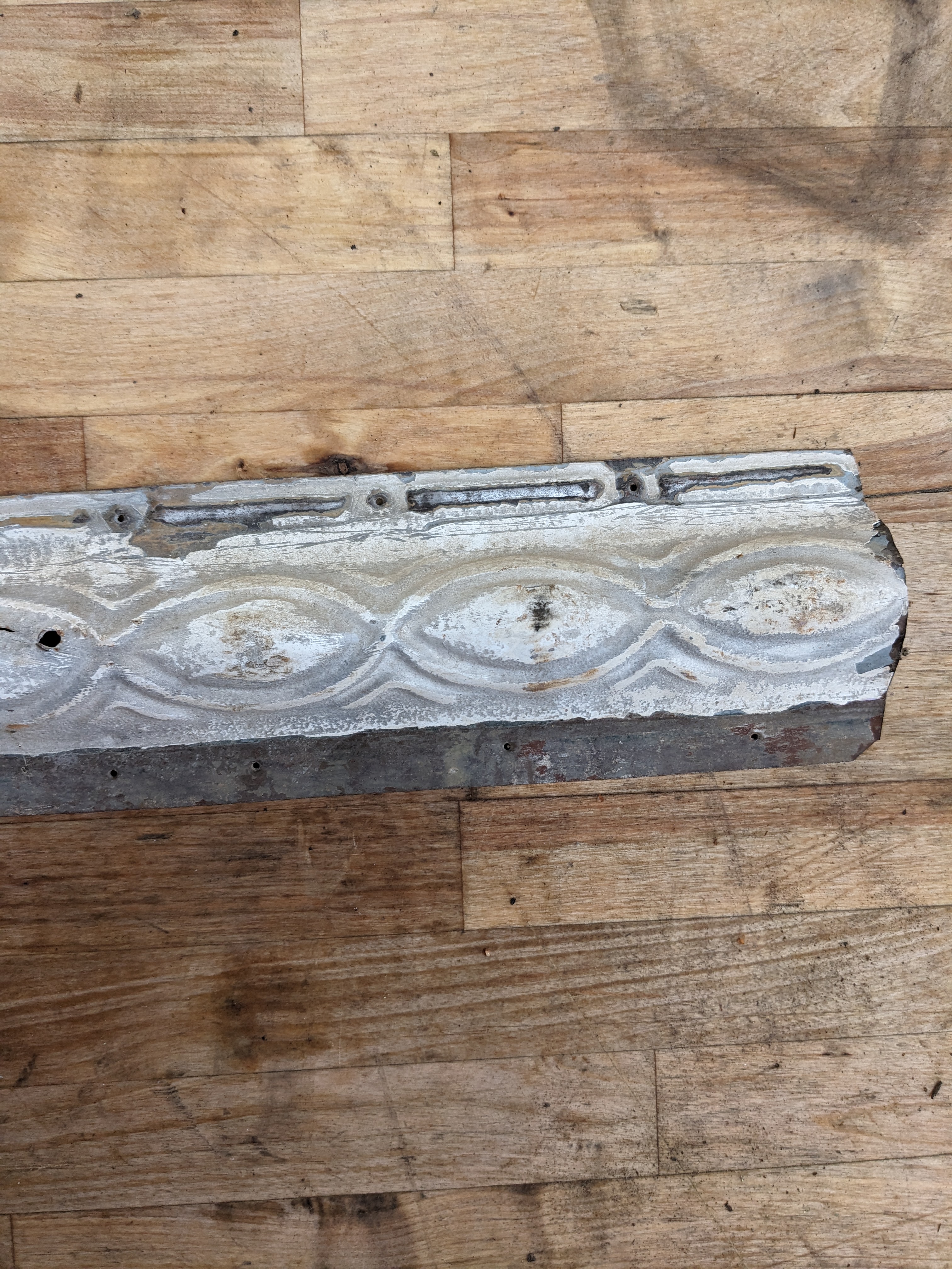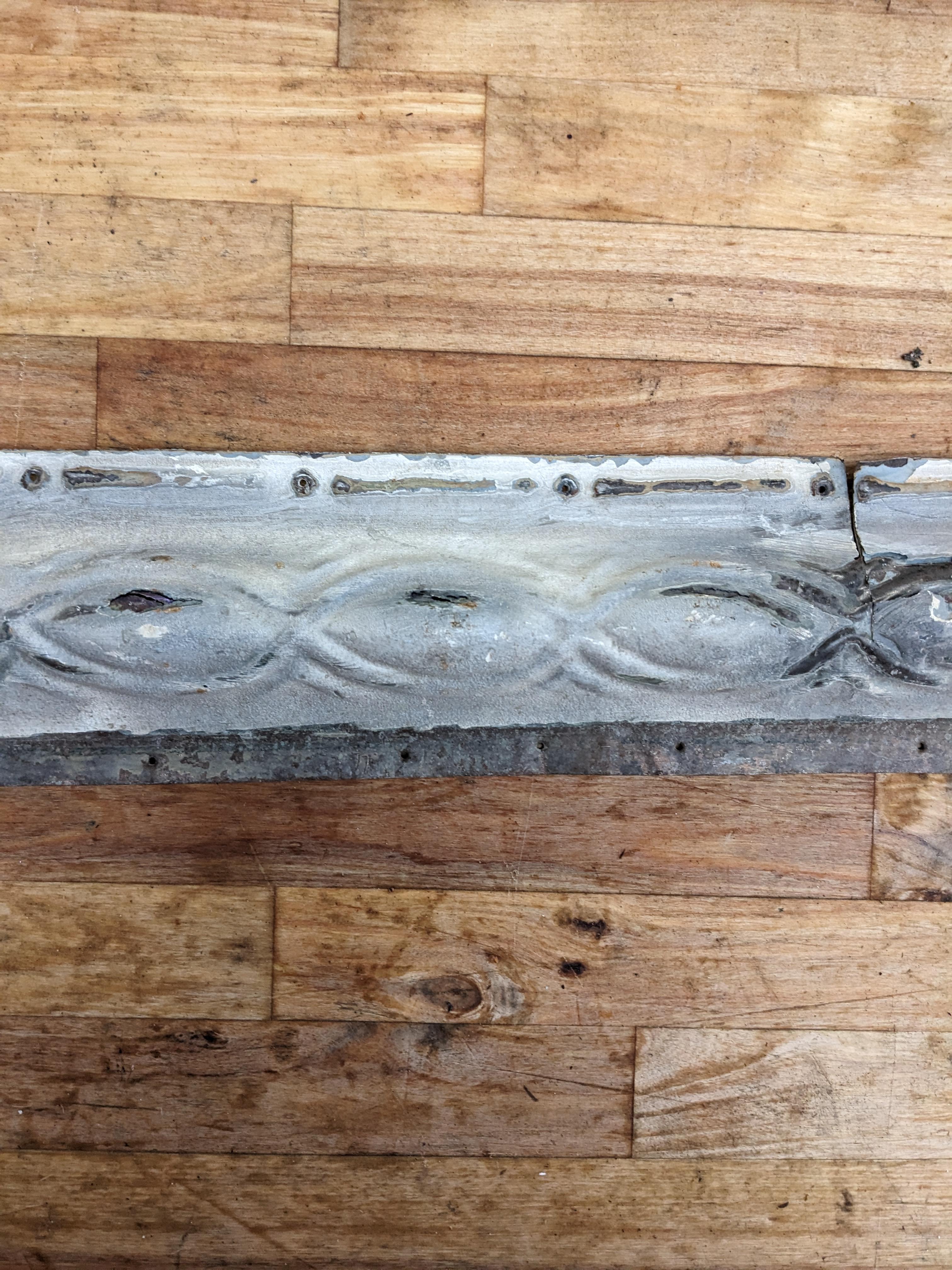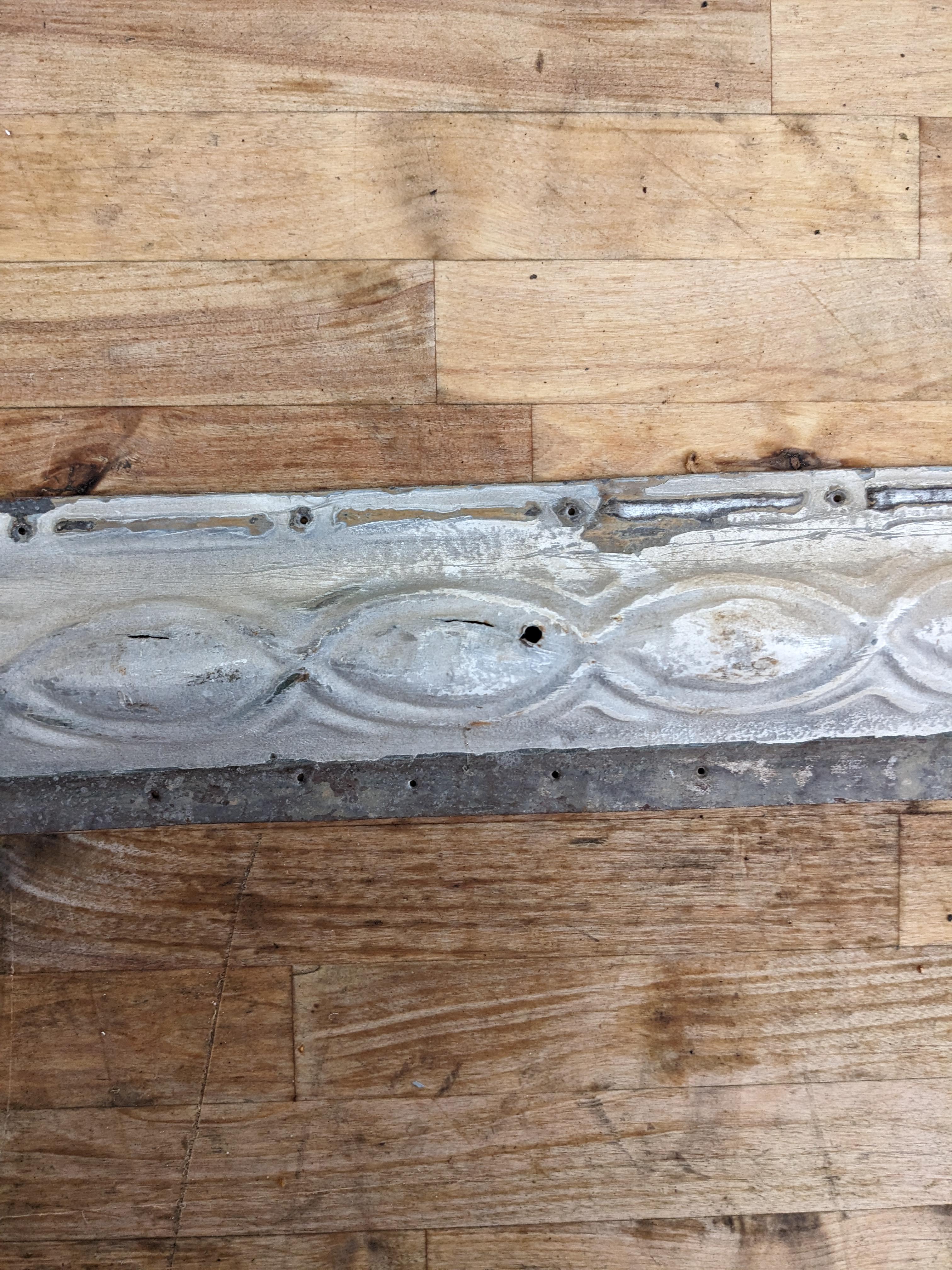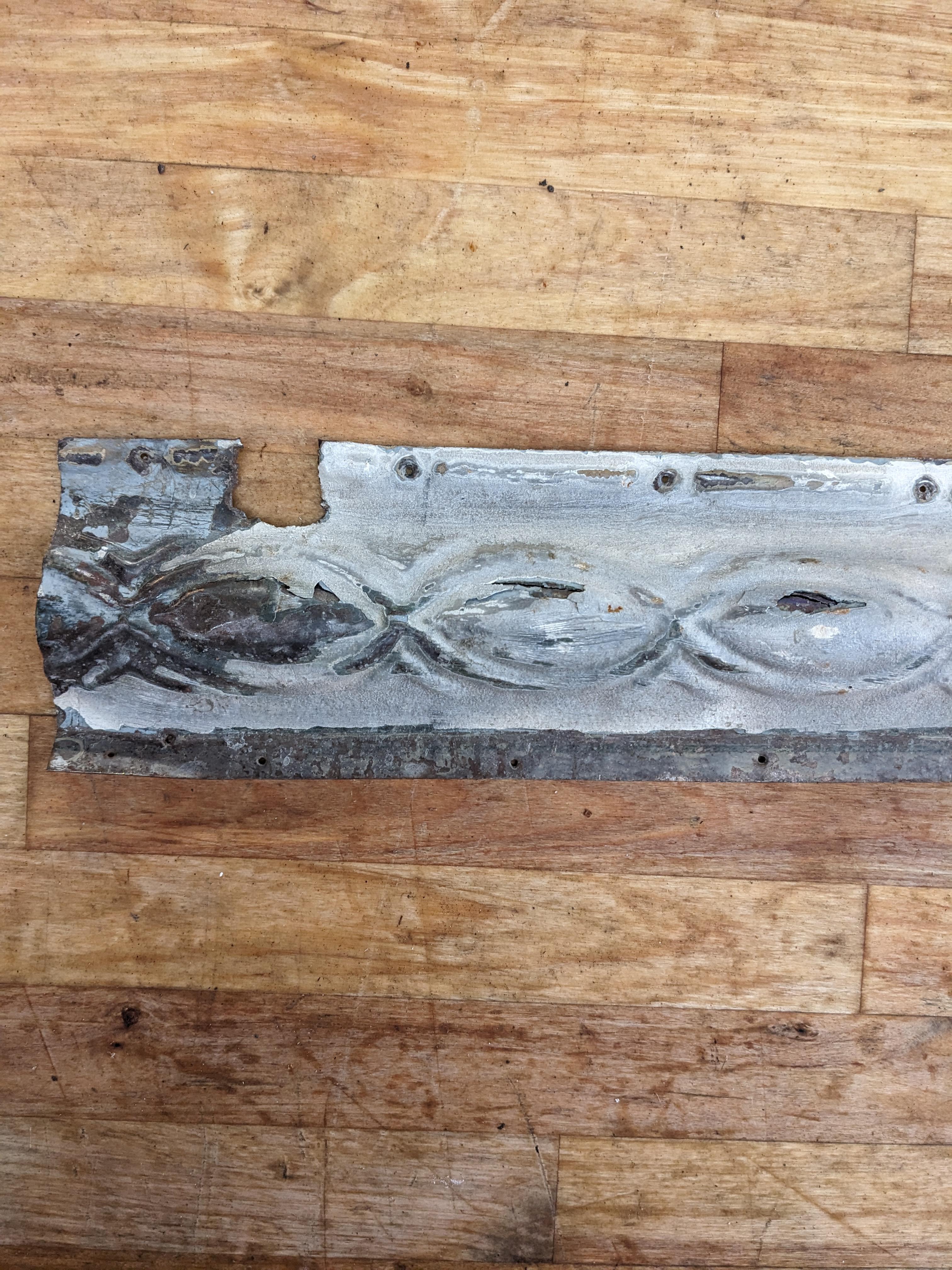 This antique ceiling tile is painted white with a unique Victorian style pattern. The paint is missing and worn down in a few areas, there is a cut in the material and a small square cutout (which has been factored into the price). Some nail holes are present from previous installation.
