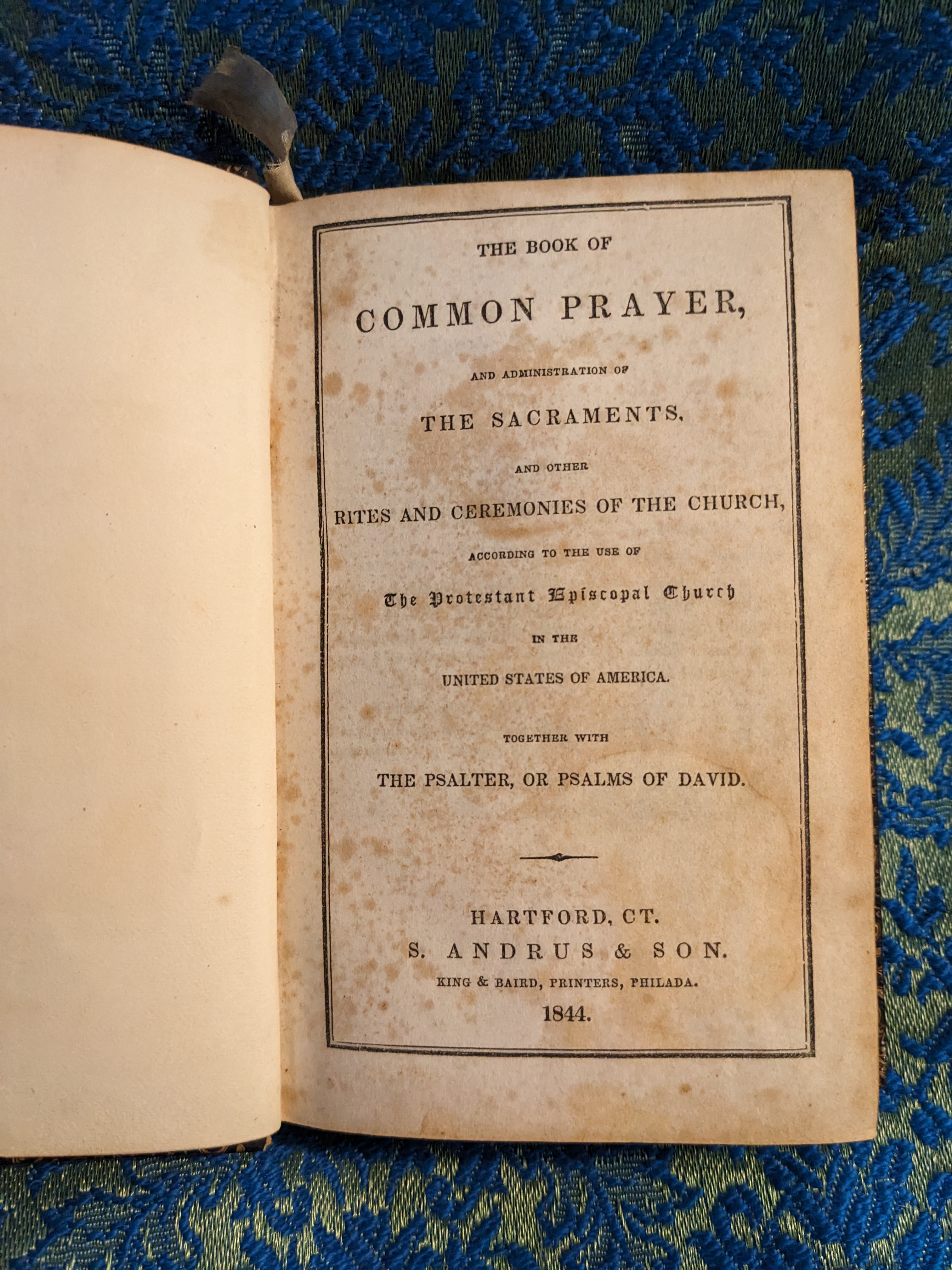 This Antique Common Prayer book according to the use of The Protestant Episcopal Church was printed in the United States in 1844. It's beautifully bound and intact. The pages show signs of aging and the edges are gilded.