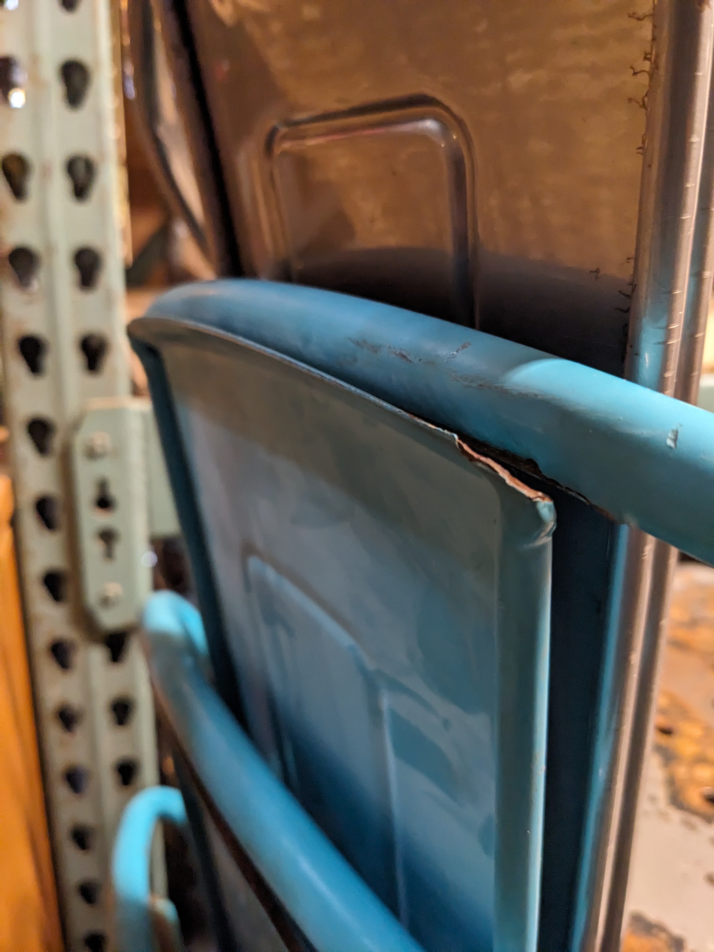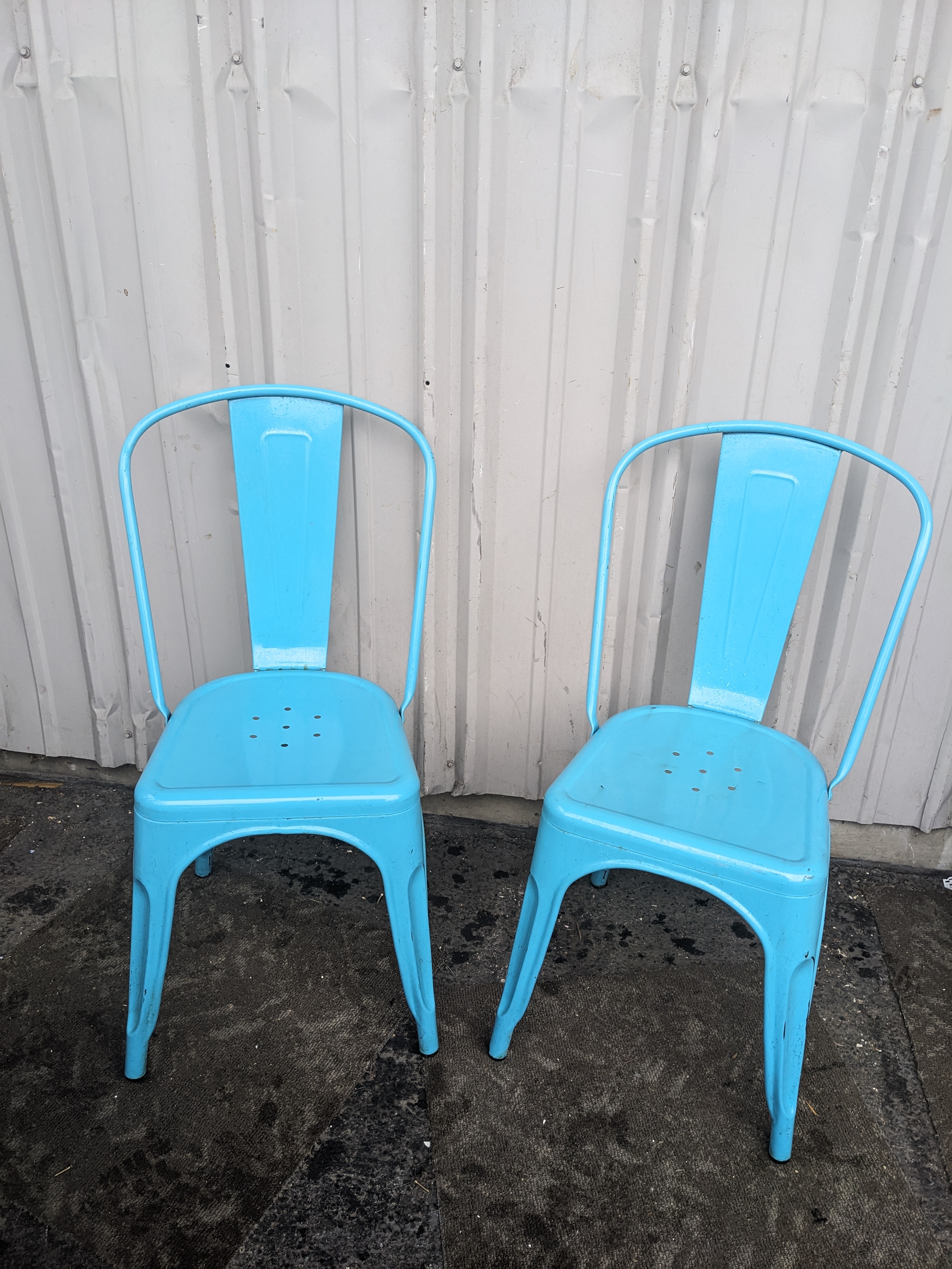 This cute blue chair is good for a variety of uses, a cozy bistro, new restaurant, or maybe even a dinner party. Sturdy and stackable, in good condition with the exception that the back piece of the chair is a little unsteady but it still makes a good chair. It looks like the welds on the back panels have broken--see pictures.